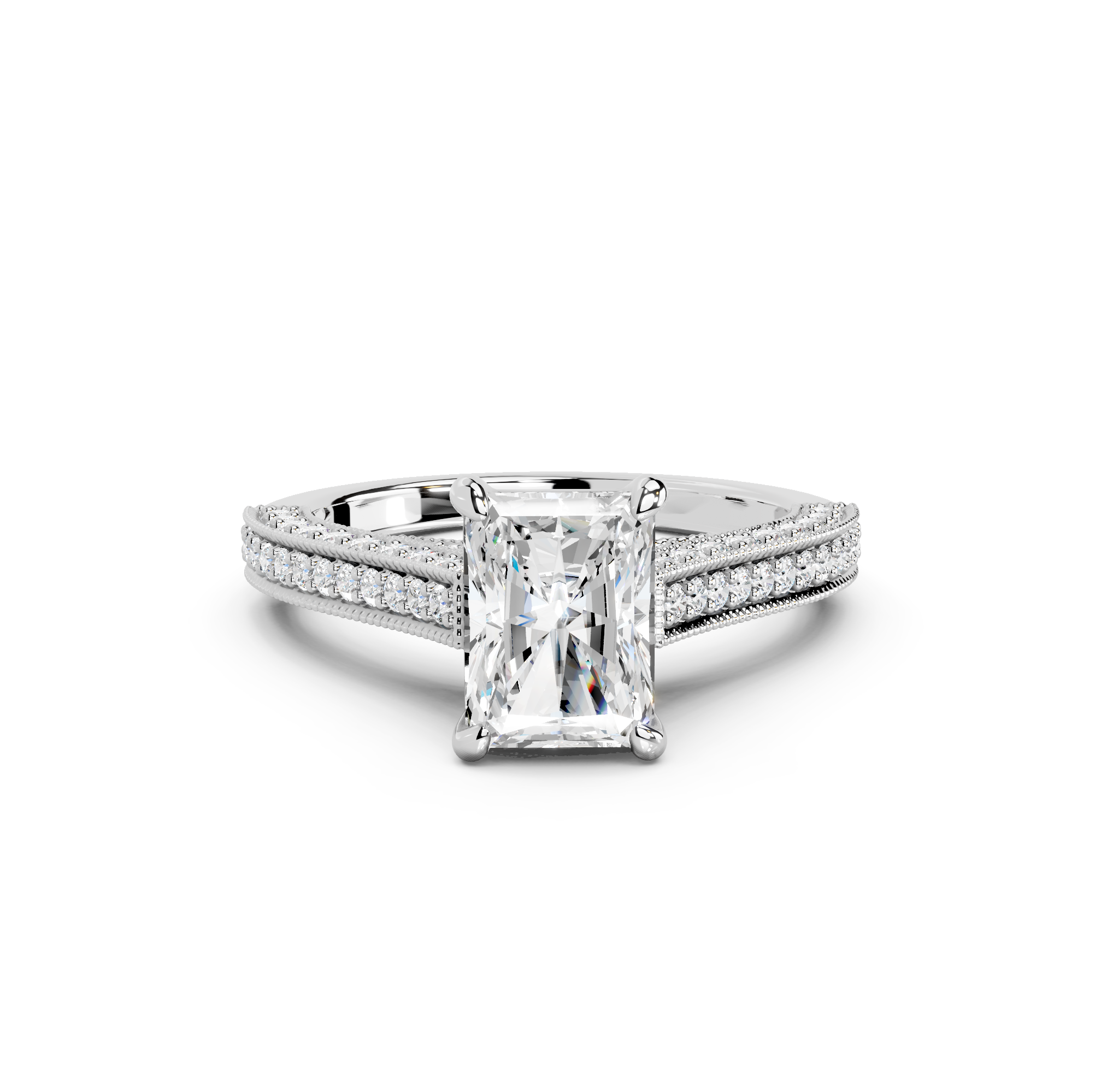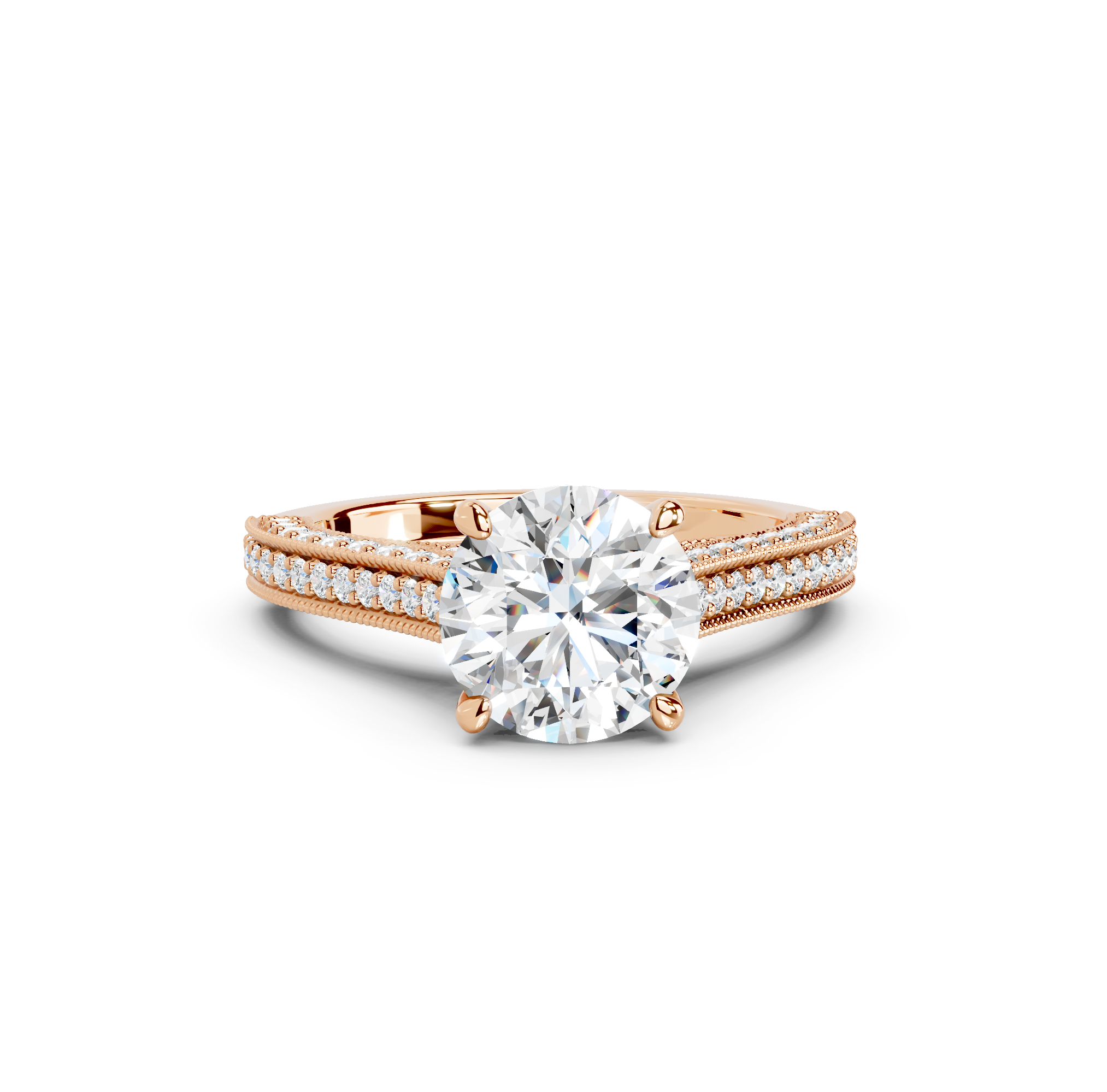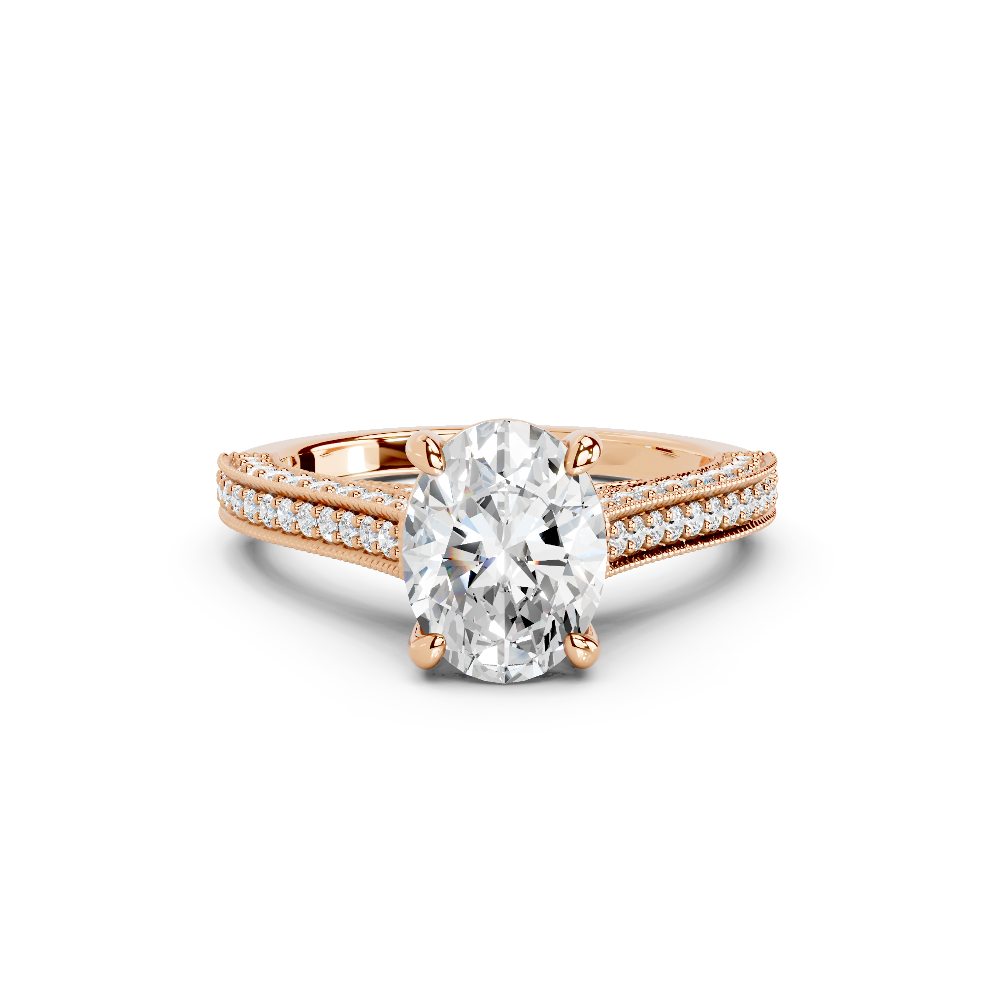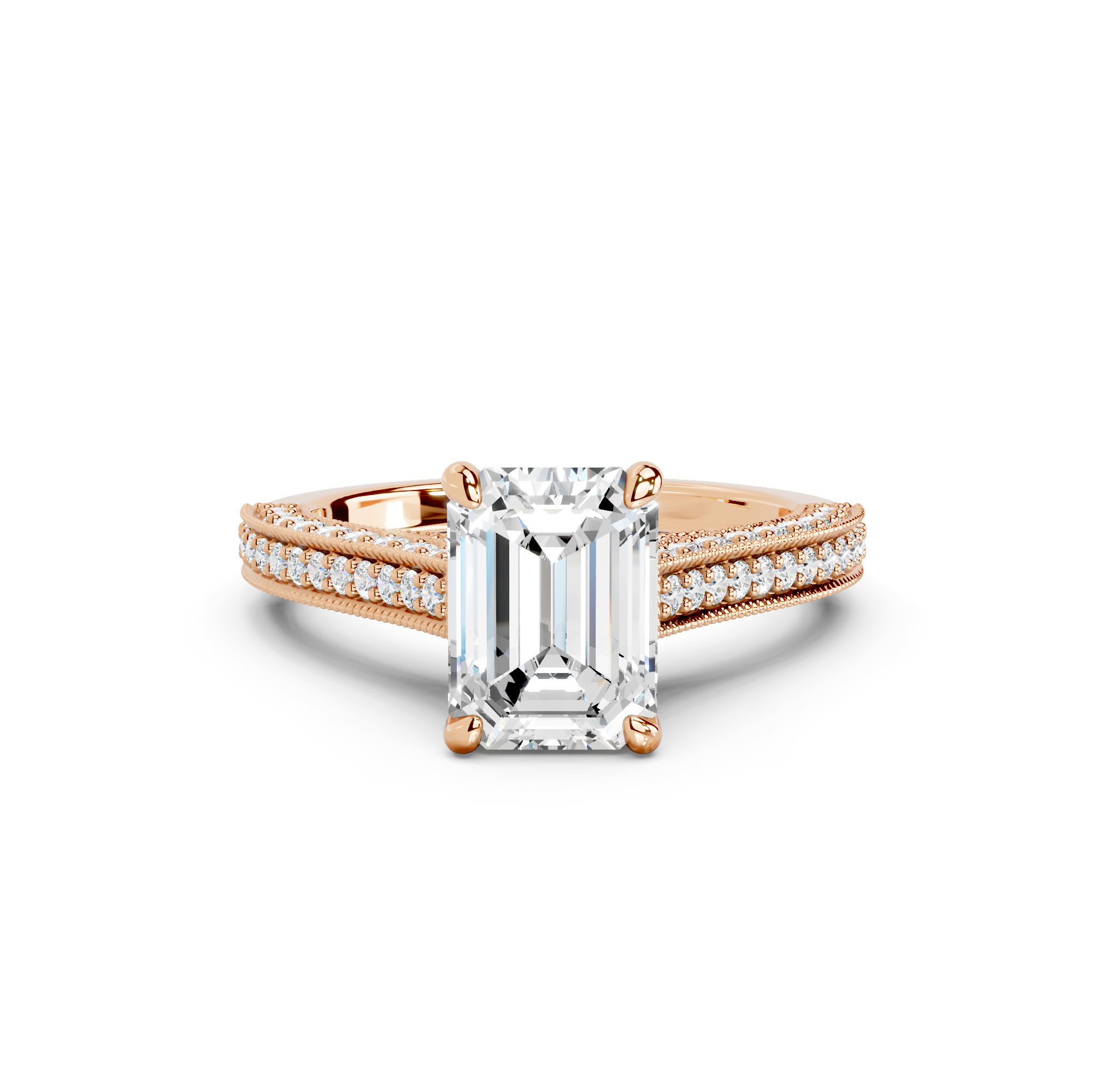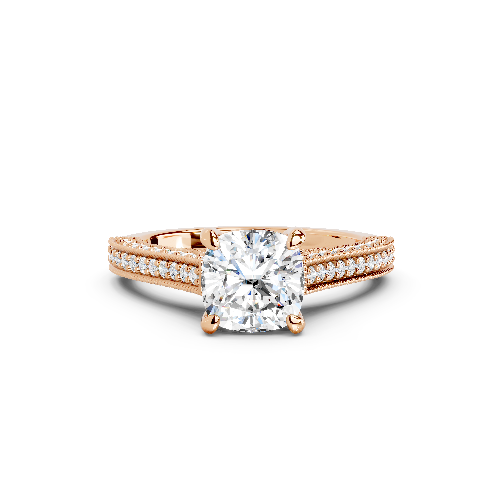 Celebrate your unique love story with our micro pavé milgrain cathedral engagement ring, a sophisticated statement piece. The micro pavé half band gracefully rises with the elegant cathedral setting, leading the eye to the stunning center stone. Each shimmering row of micro pavé diamonds is then bordered by ornate milgrain. This creates a finely beaded detail that gives the ring vintage character.