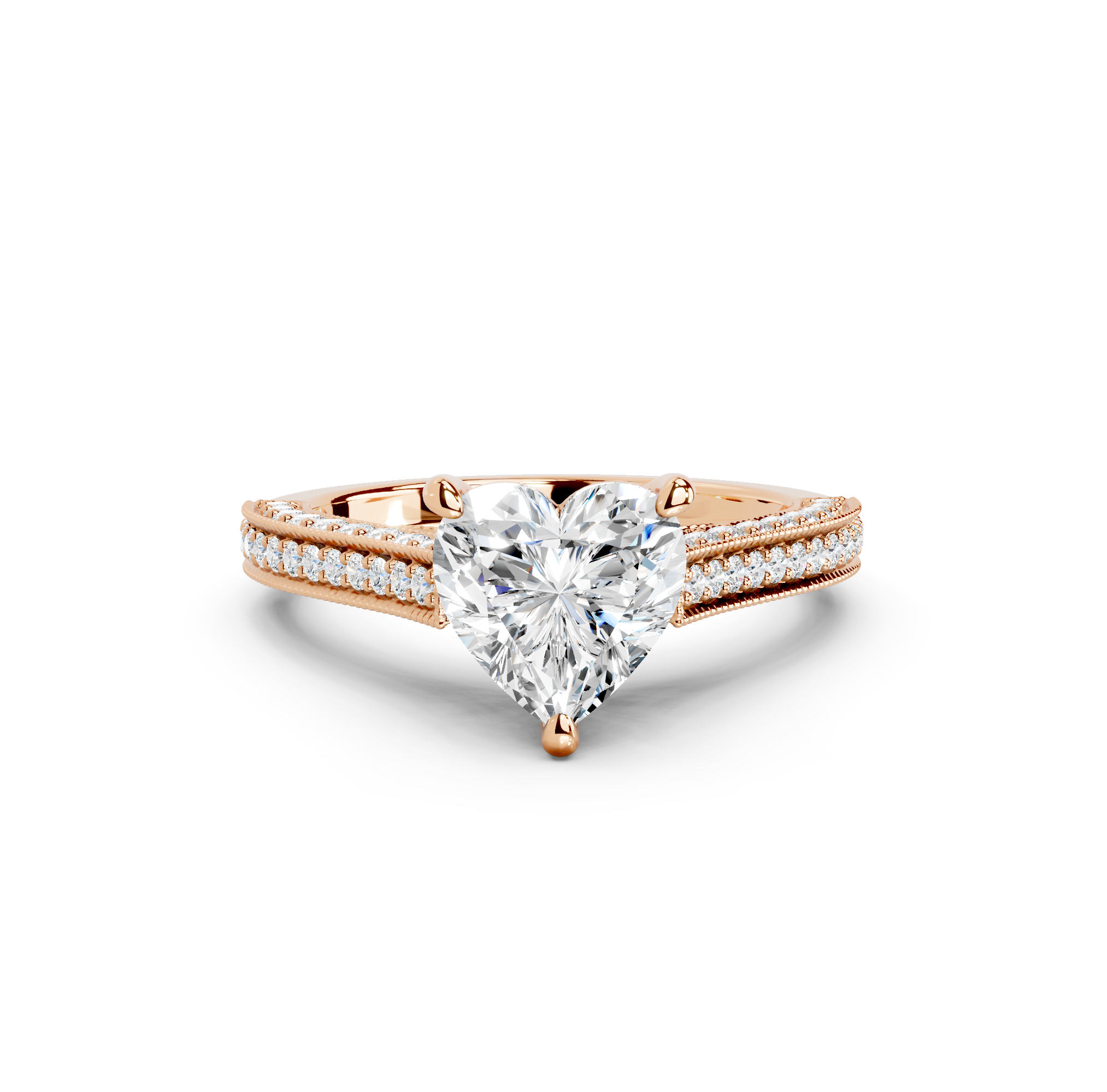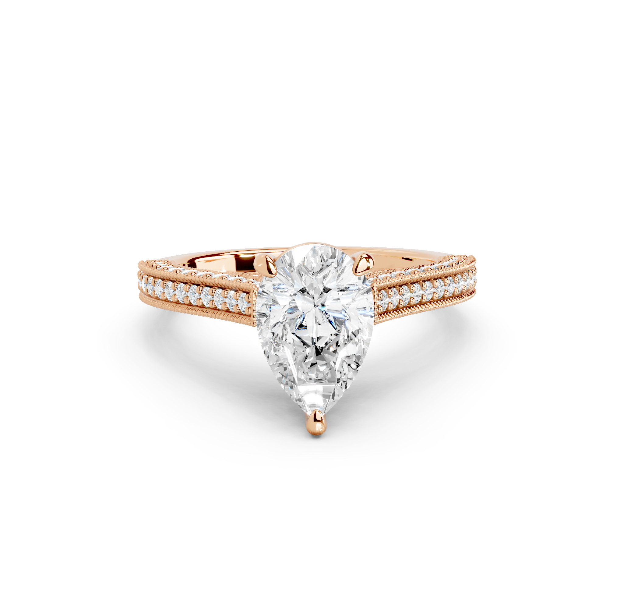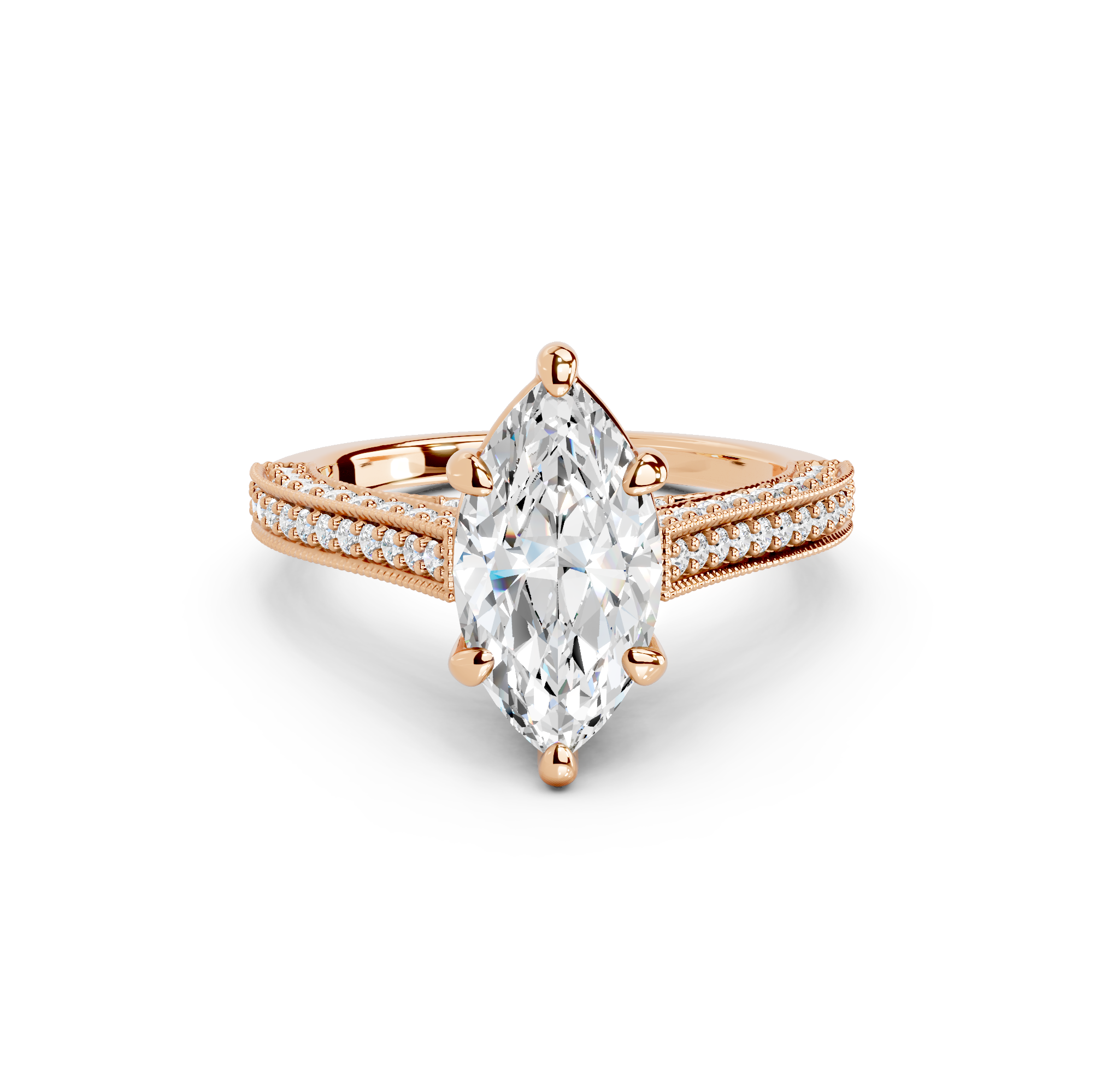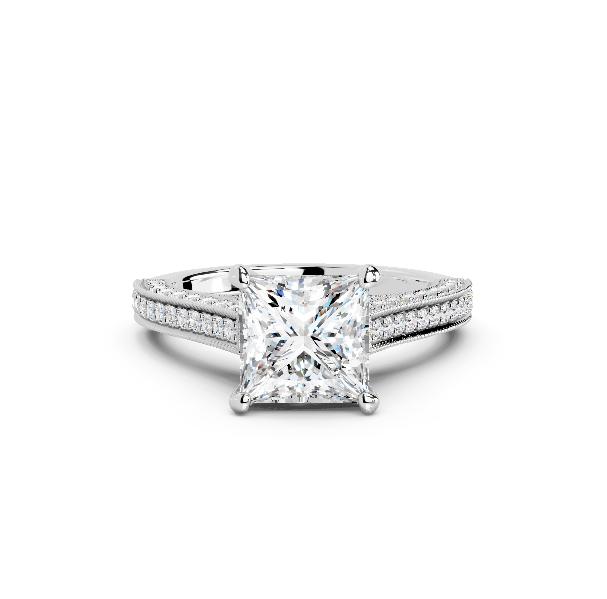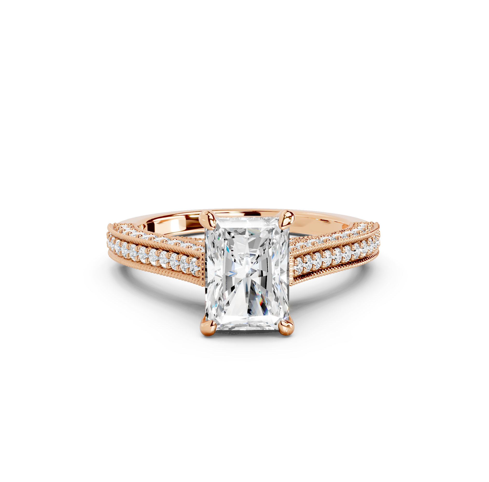 Celebrate your unique love story with our micro pavé milgrain cathedral engagement ring, a sophisticated statement piece. The micro pavé half band gracefully rises with the elegant cathedral setting, leading the eye to the stunning center stone. Each shimmering row of micro pavé diamonds is then bordered by ornate milgrain. This creates a finely beaded detail that gives the ring vintage character.