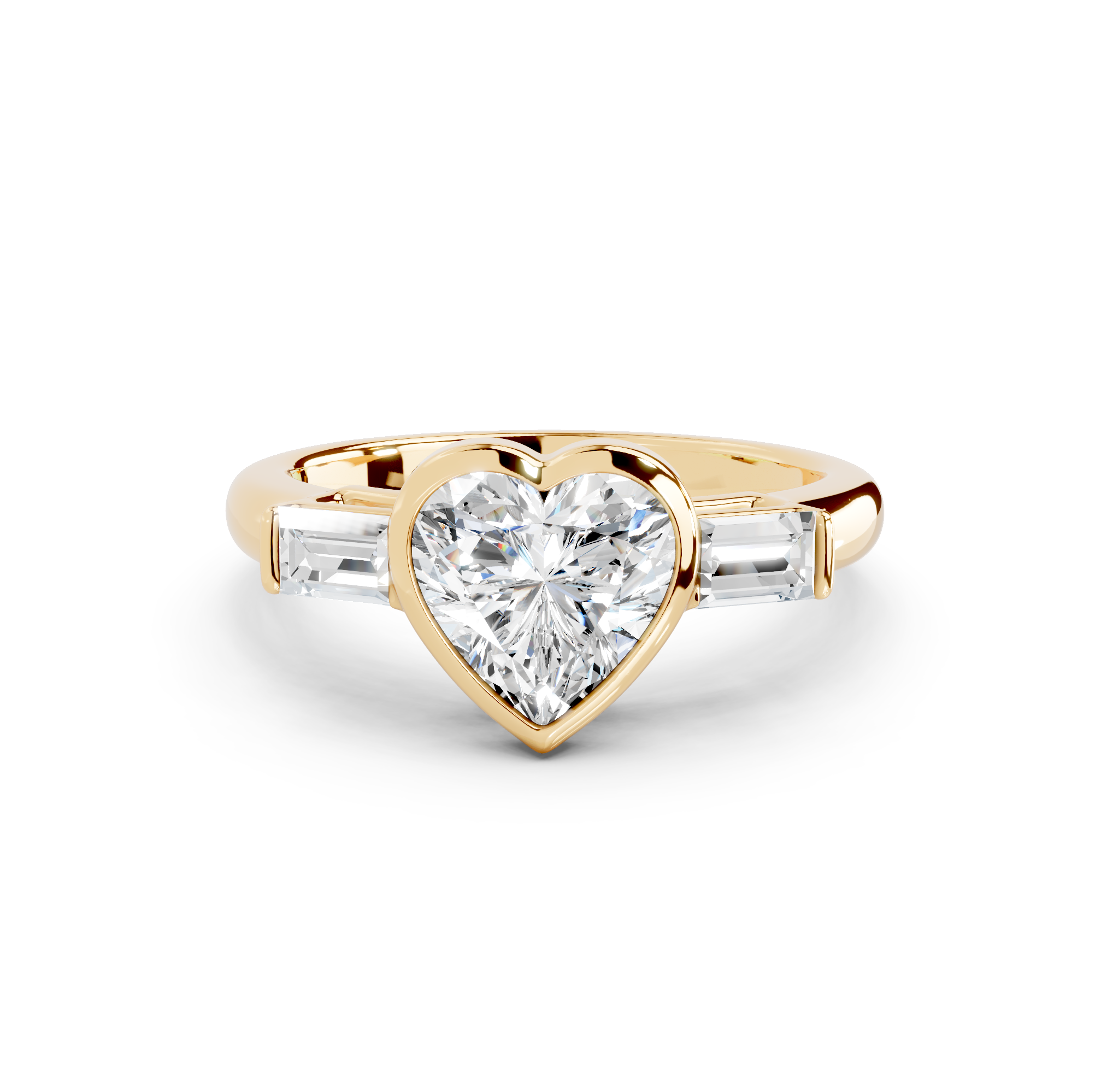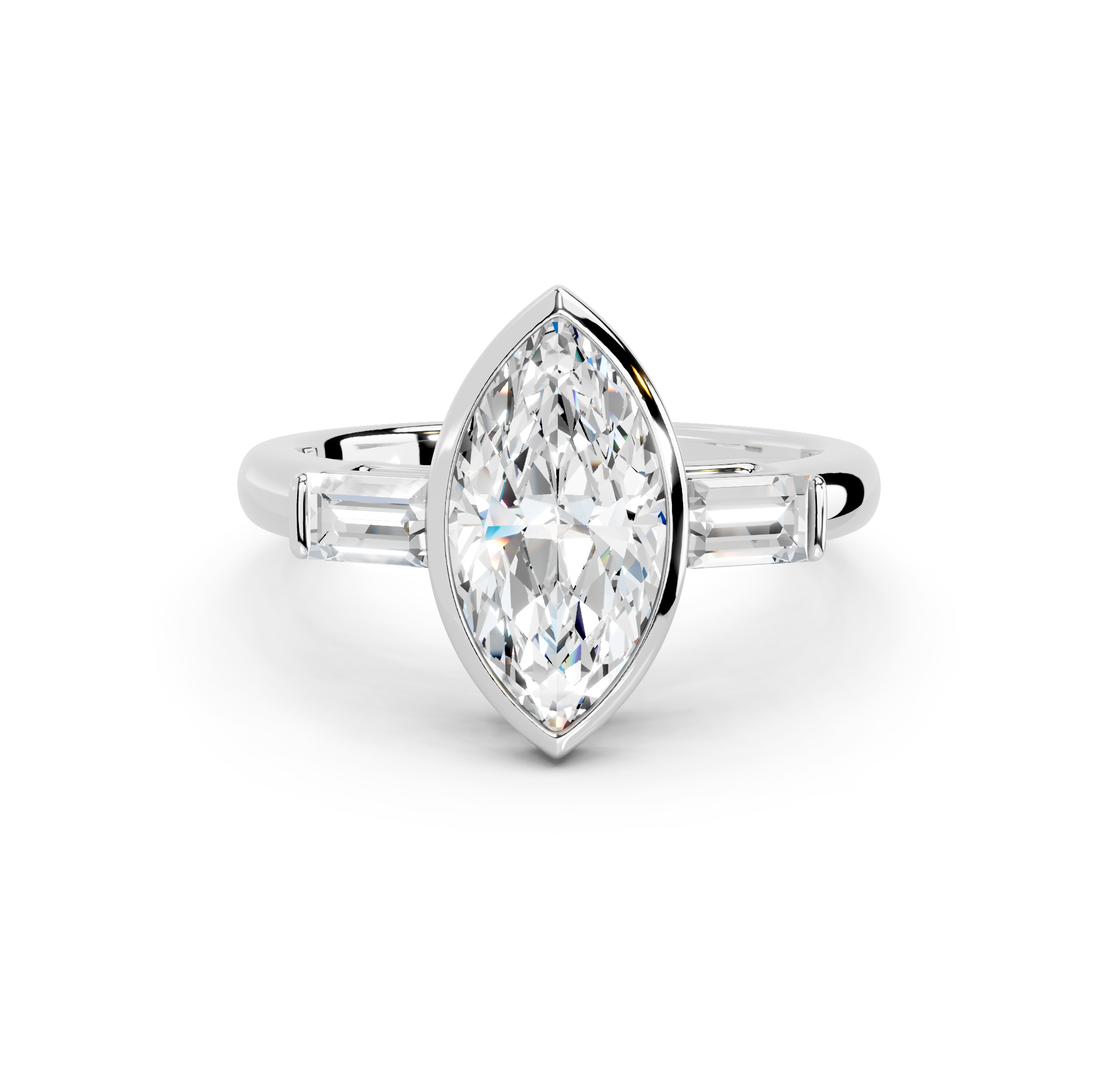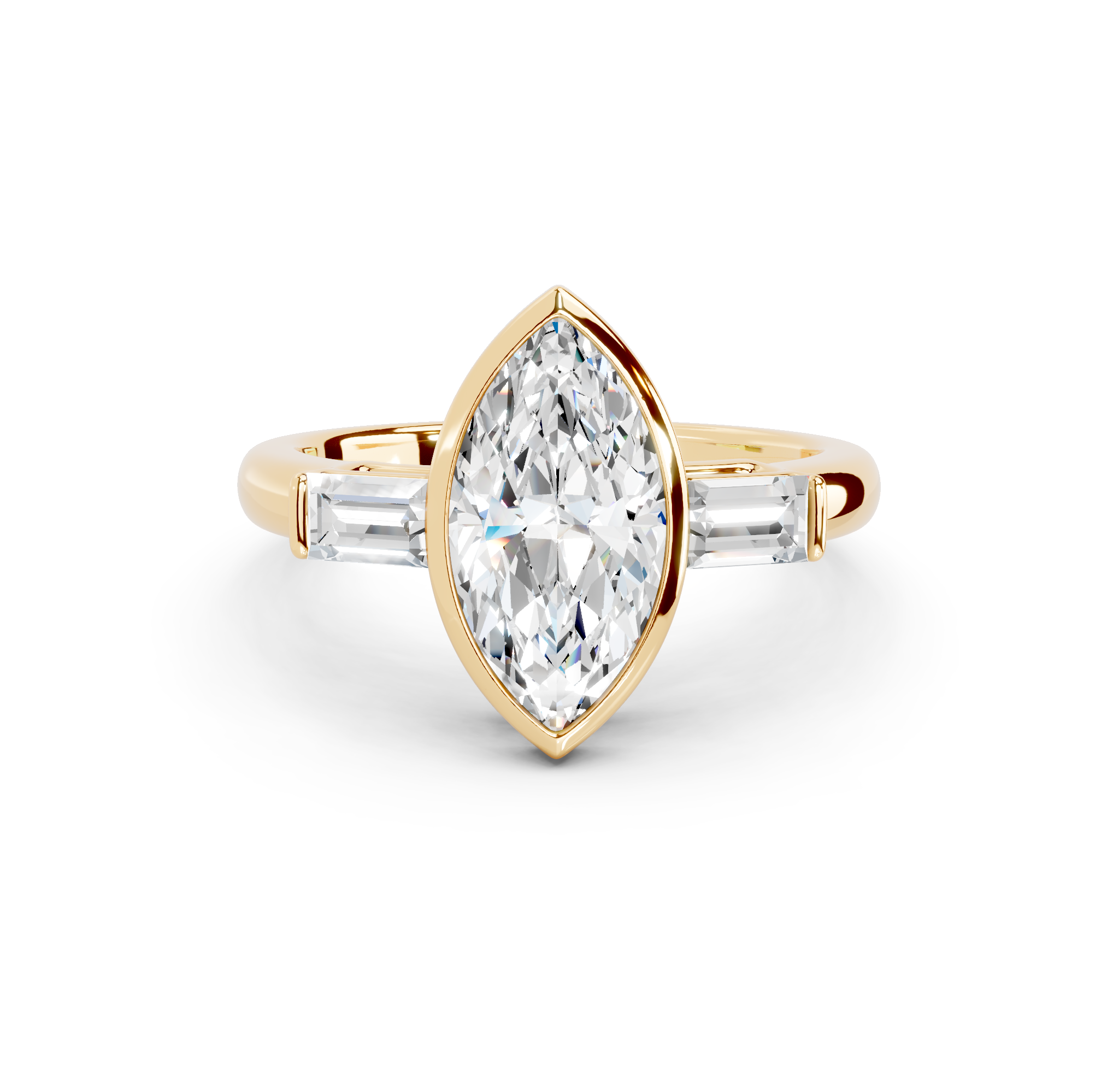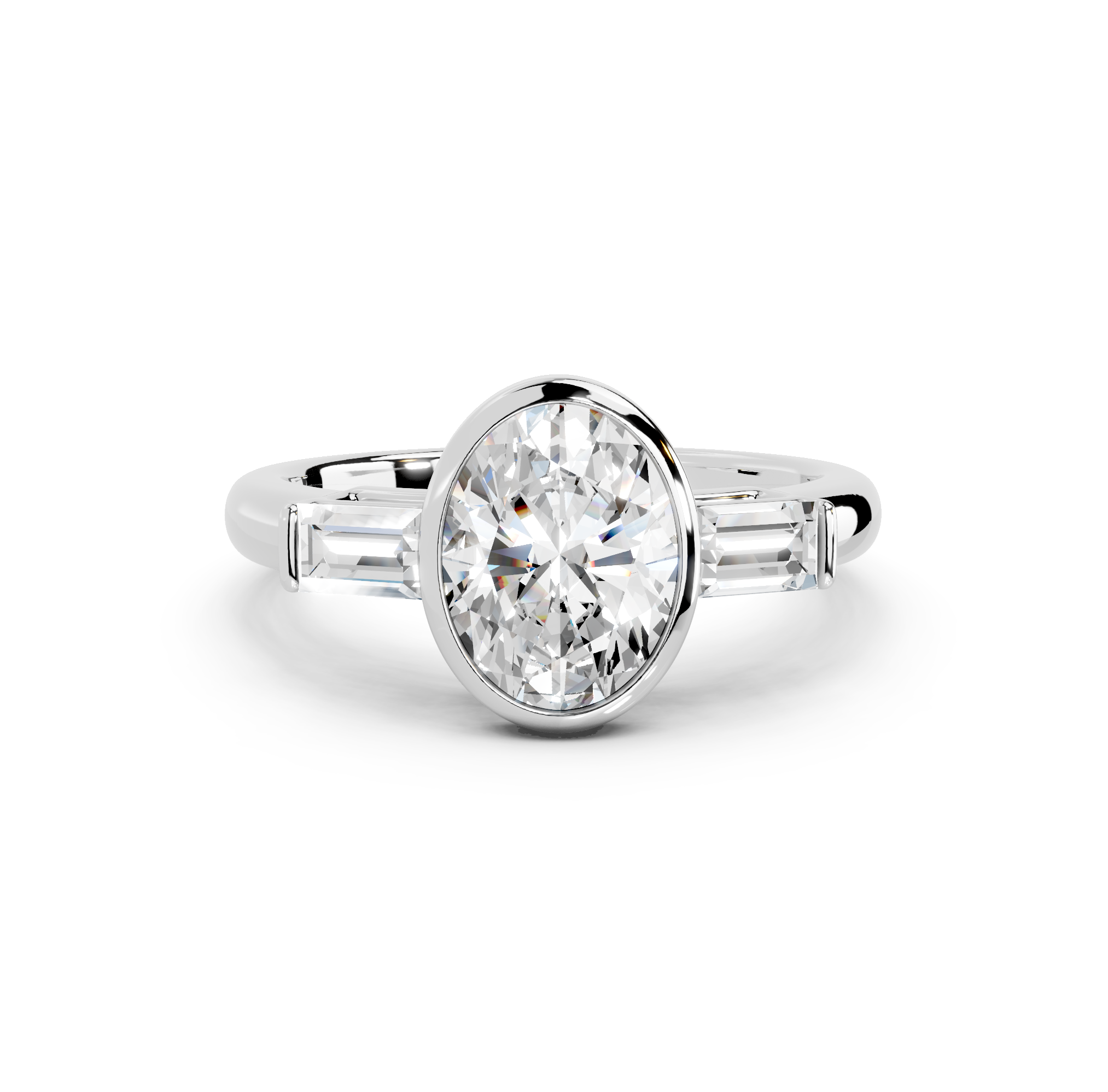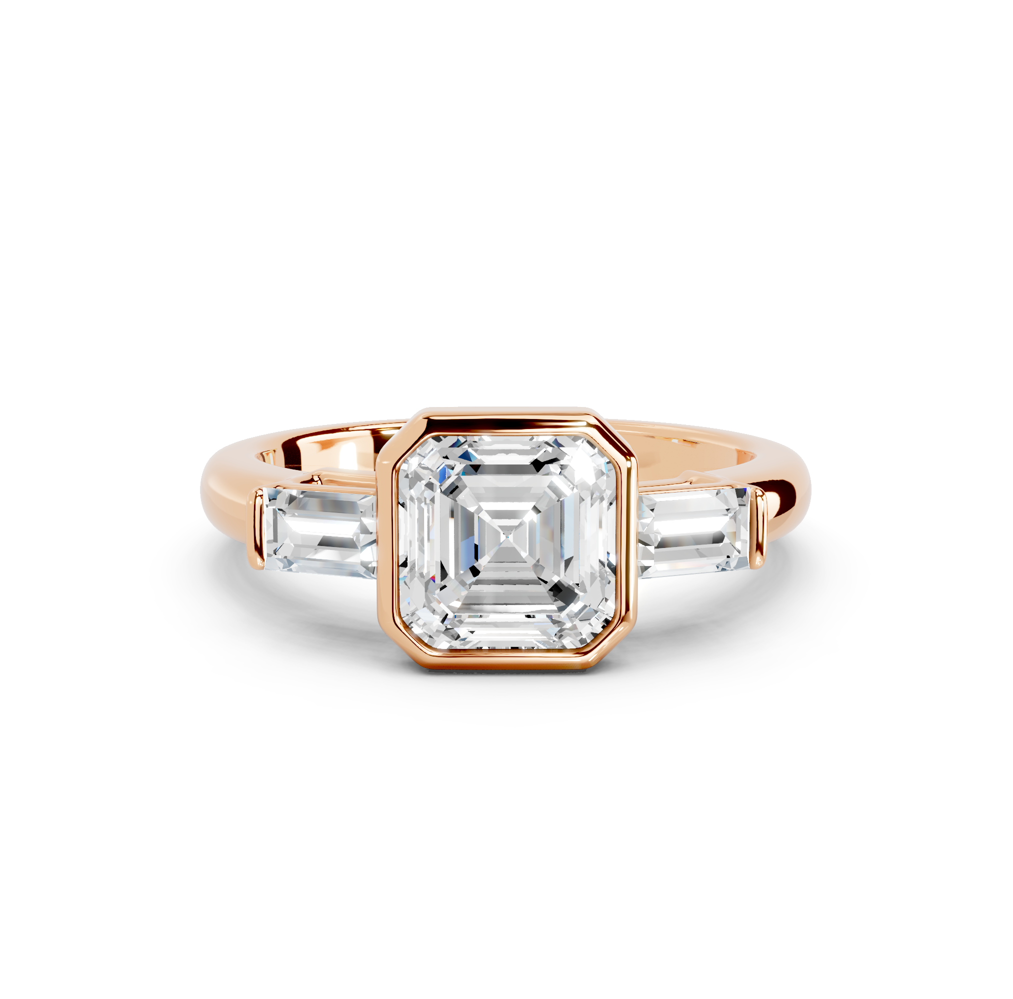 The Aletta is a sophisticated three stone baguette cut bezel basket engagement ring that perfectly balances modern and timeless design.