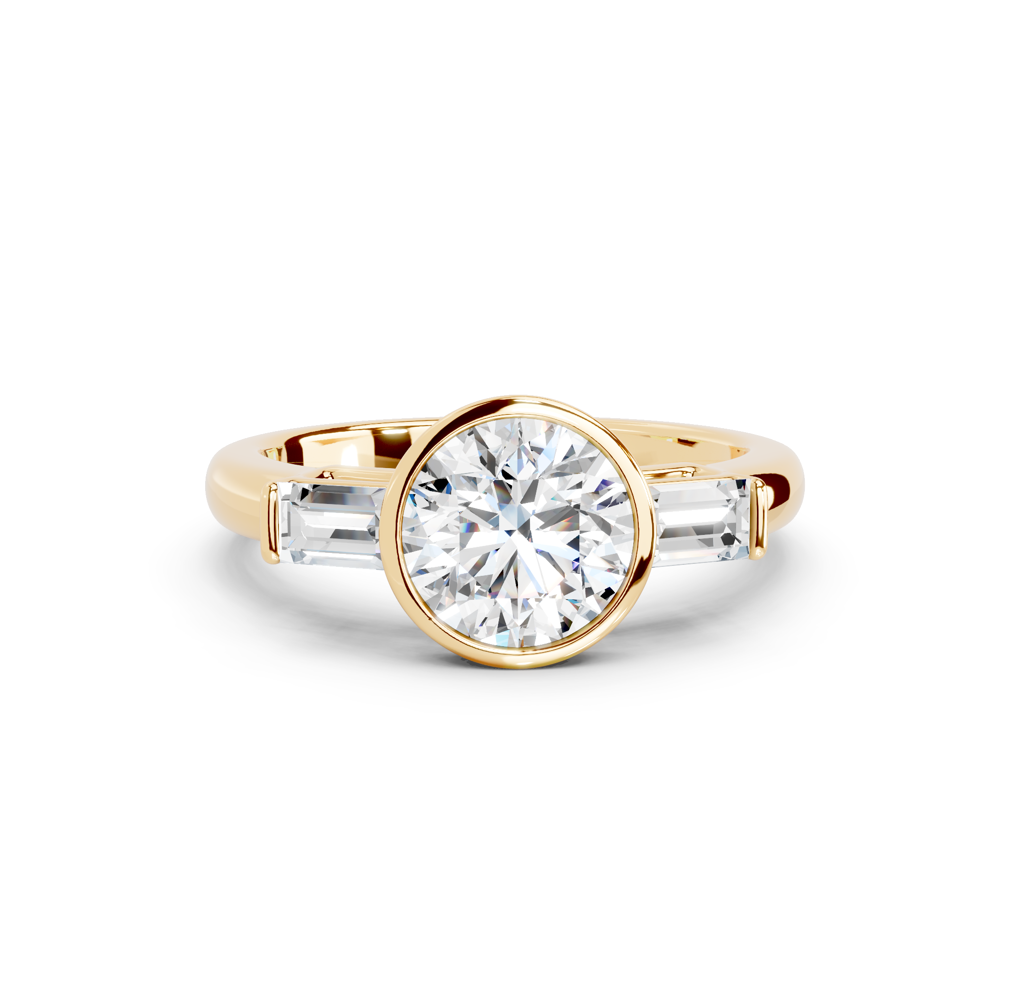 The center diamond, beautifully framed in a sleek bezel setting, is both protected and stylish with its clean lines. Two crisp baguette-cut side stones flank the center, creating a stunning contrast that draws the eye to the center diamond. The three-stone design symbolizes your journey together–past, present, and future–while the mixed setting styles give the ring unique character.