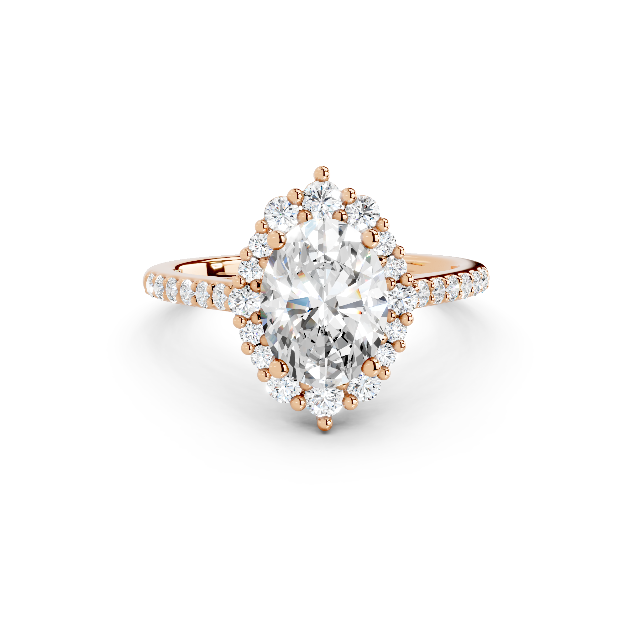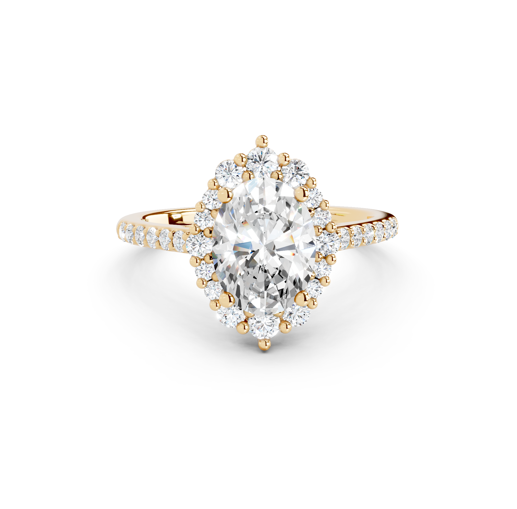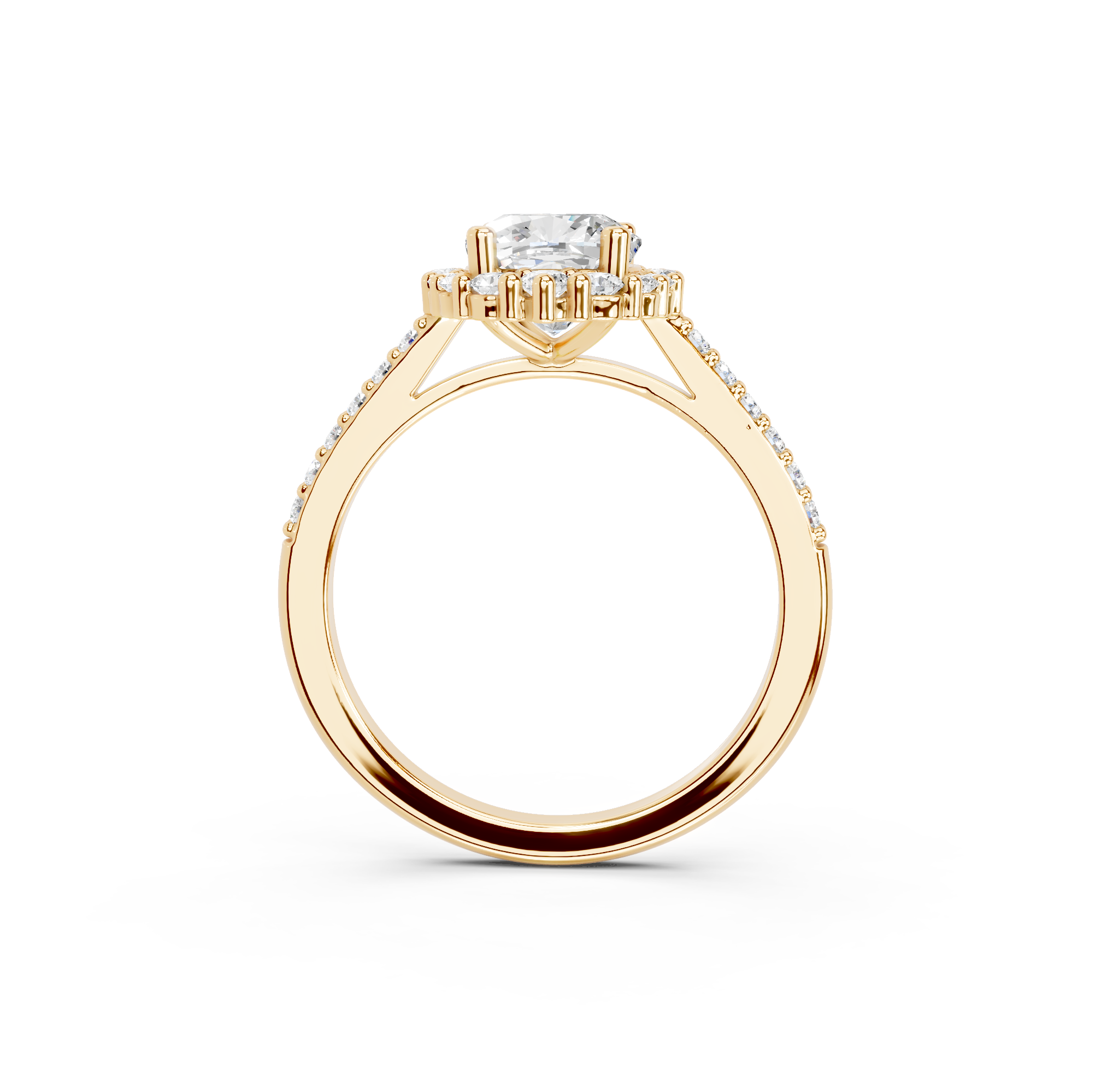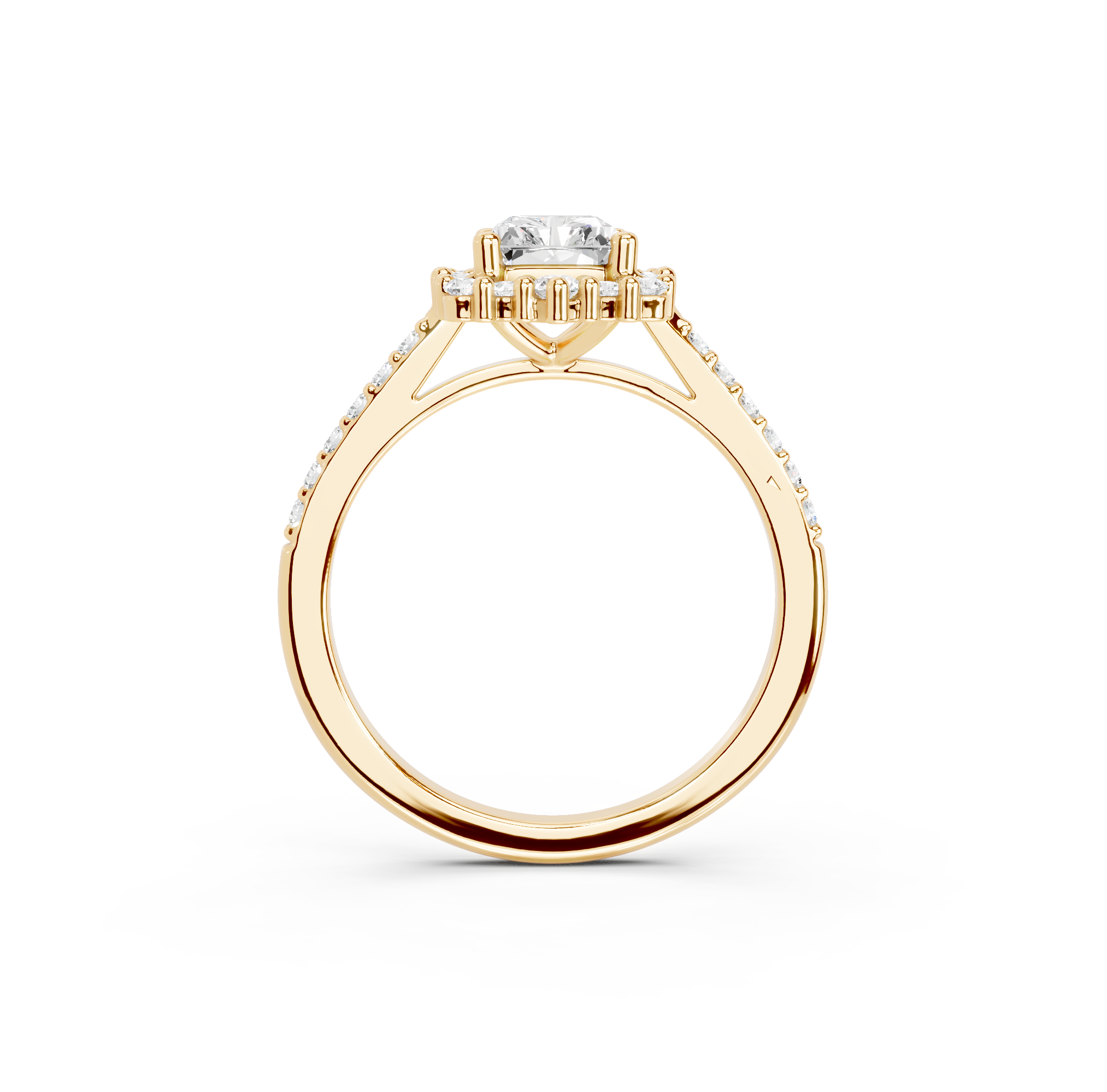 Round-cut diamonds create a stunning marquise-shaped halo that frames the center stone, amplifying its brilliance. The cathedral setting gracefully rises to cradle both halo and center stone, while delicate pavé diamonds along the band sparkle from every angle.