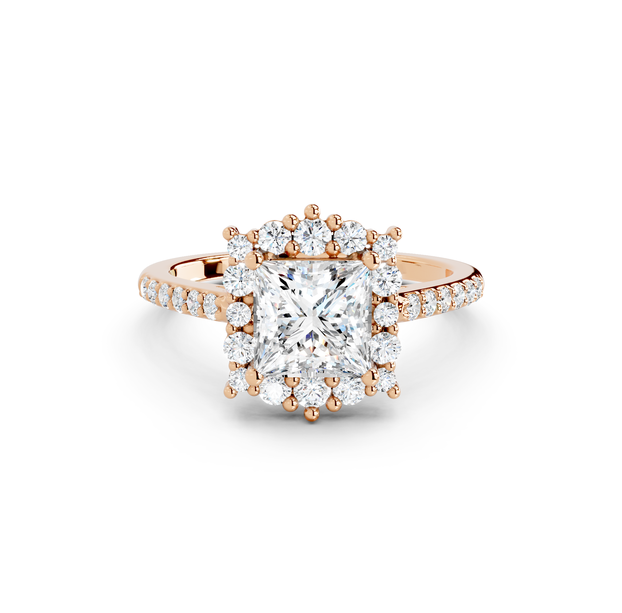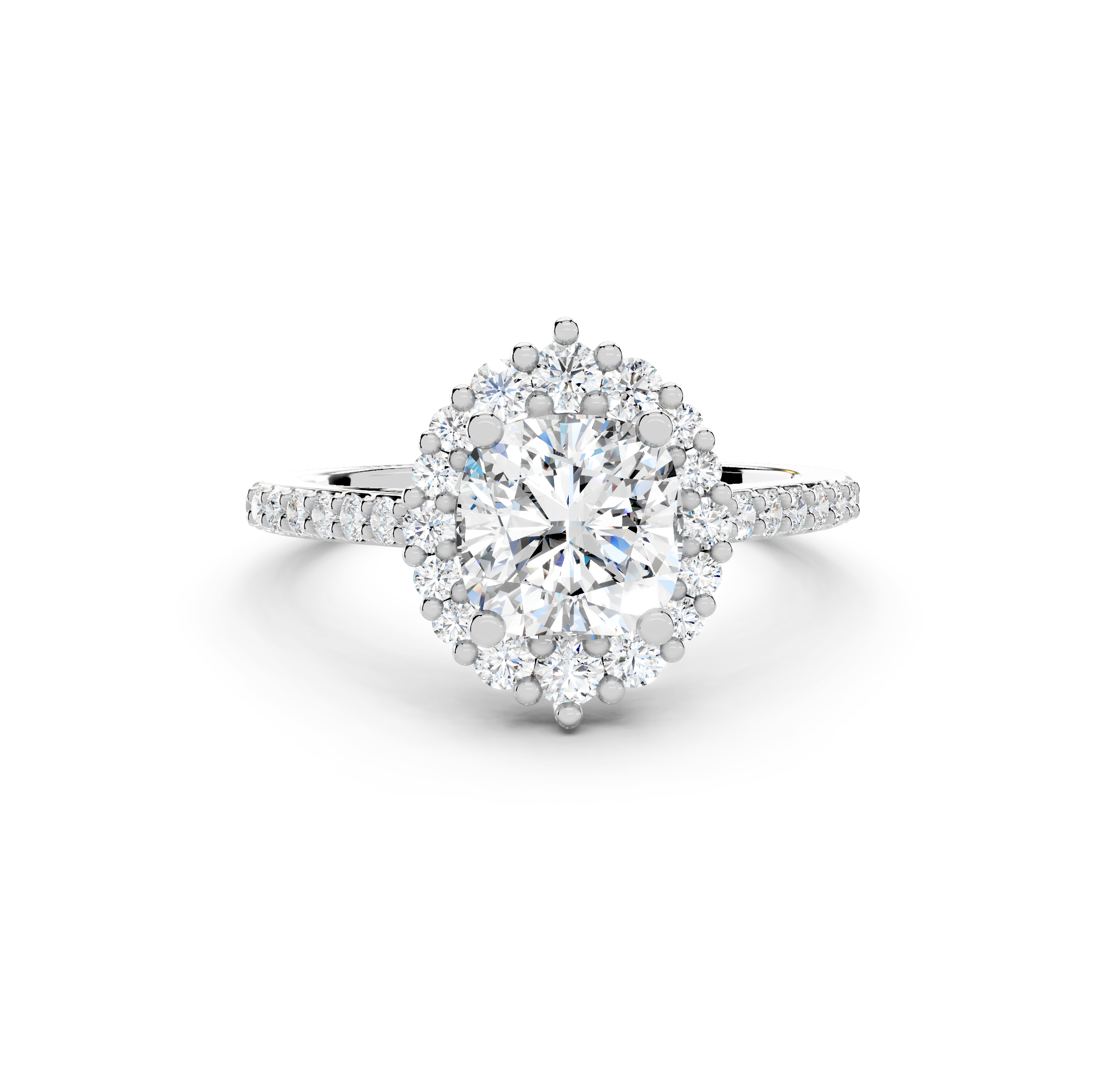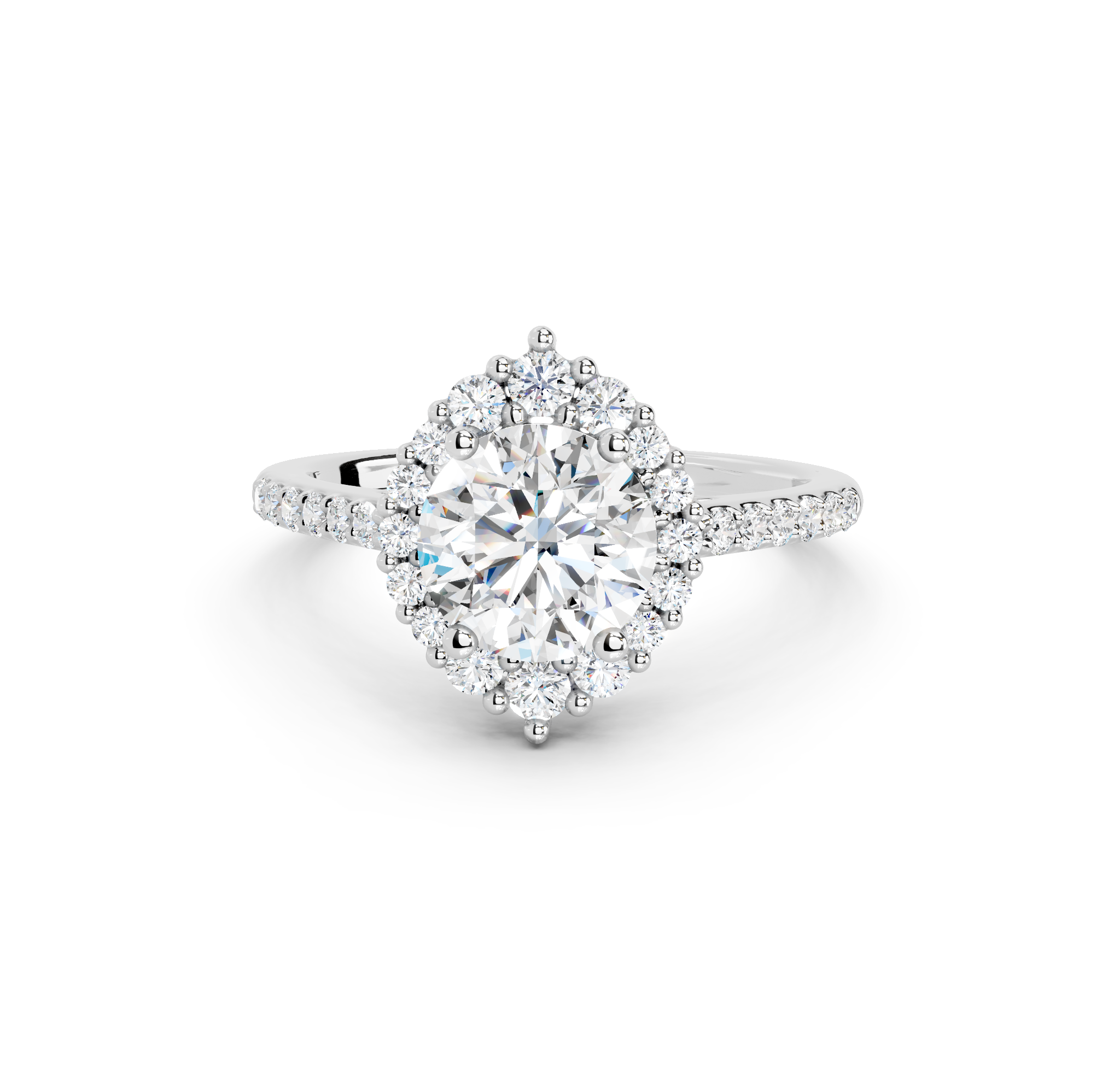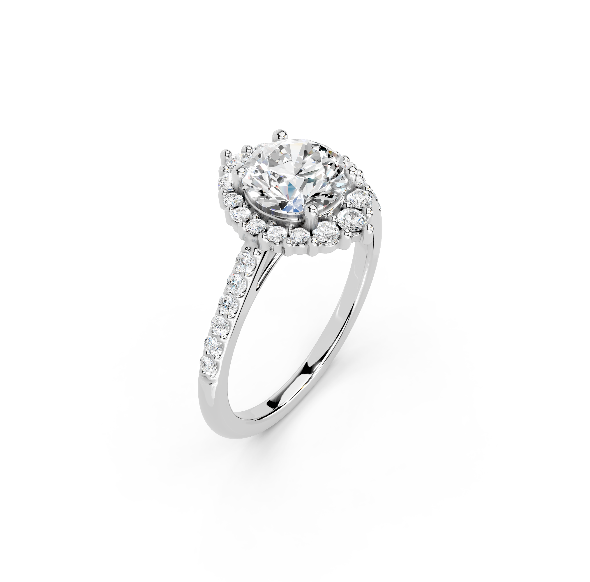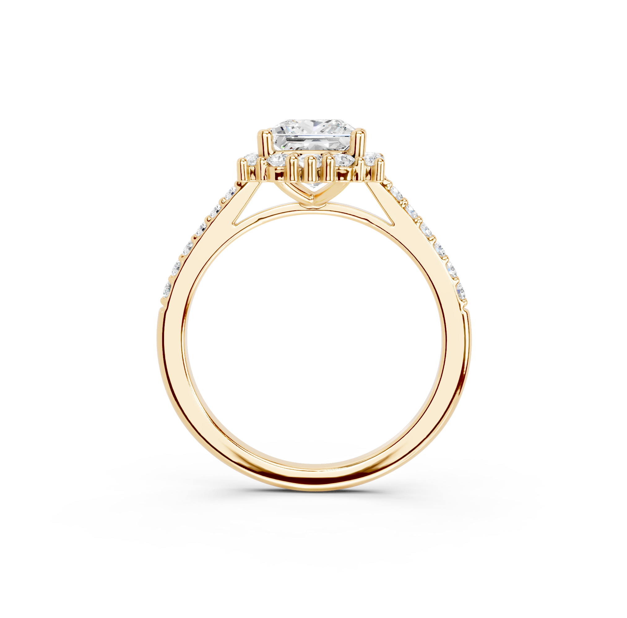 Round-cut diamonds create a stunning marquise-shaped halo that frames the center stone, amplifying its brilliance. The cathedral setting gracefully rises to cradle both halo and center stone, while delicate pavé diamonds along the band sparkle from every angle.