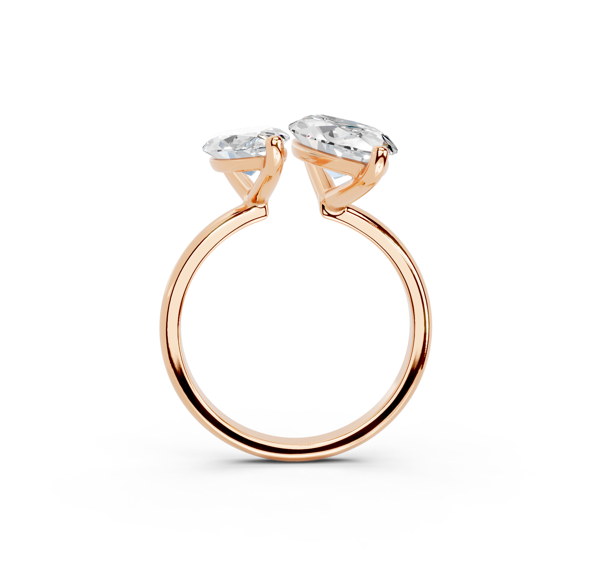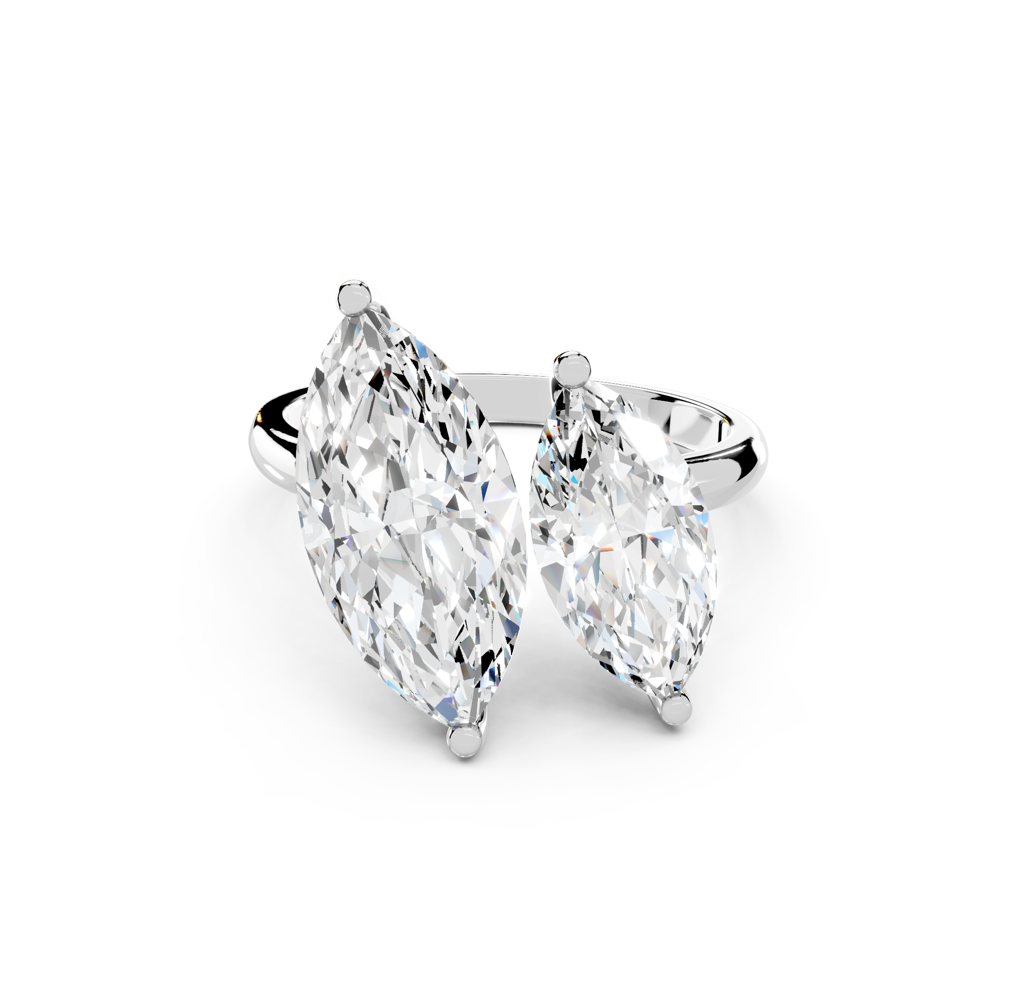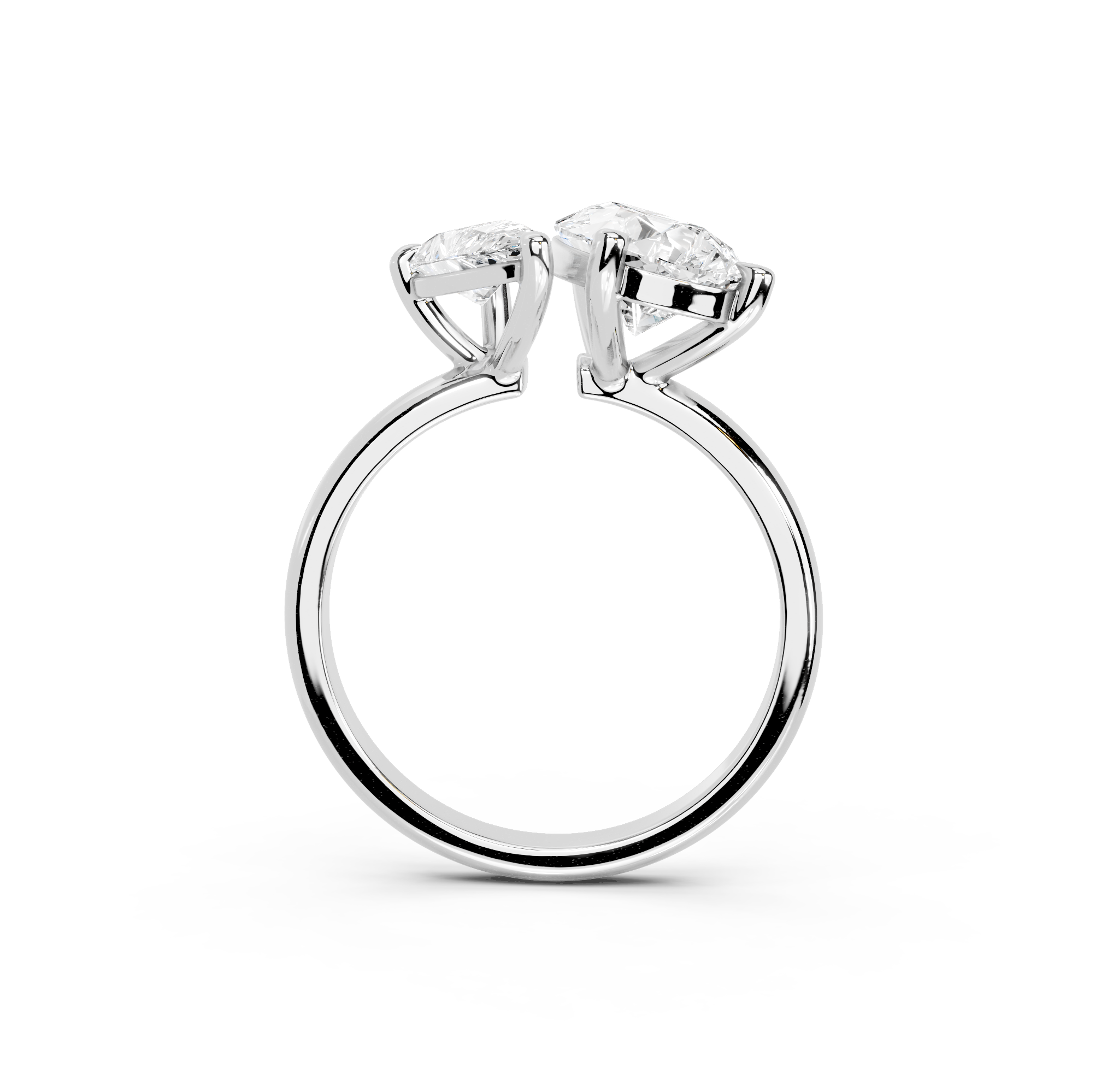 Her charm comes from the two dazzling diamonds, placed close together like lovers. The open style of the simple, sleek band symbolizes the coming together of two souls.