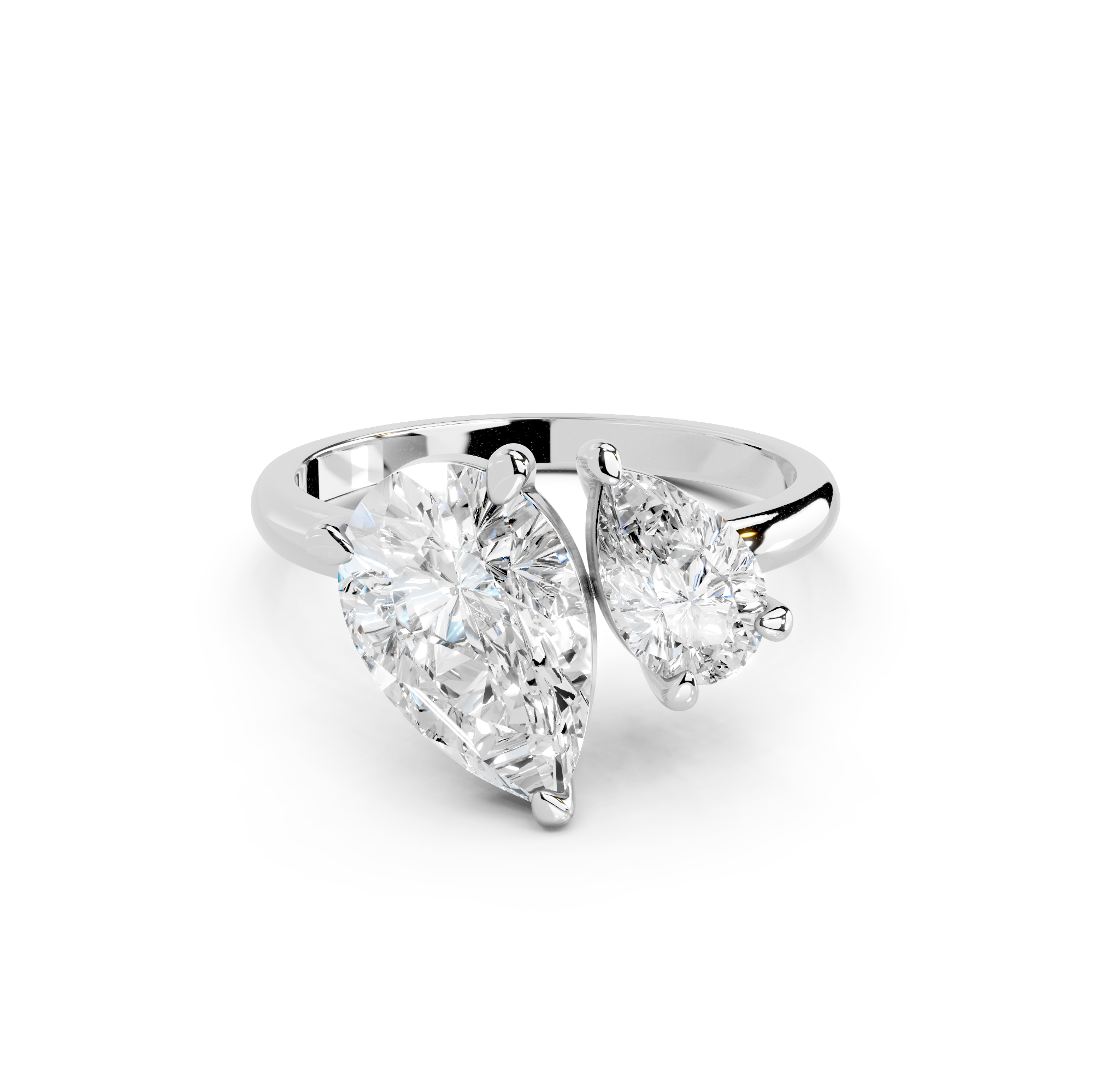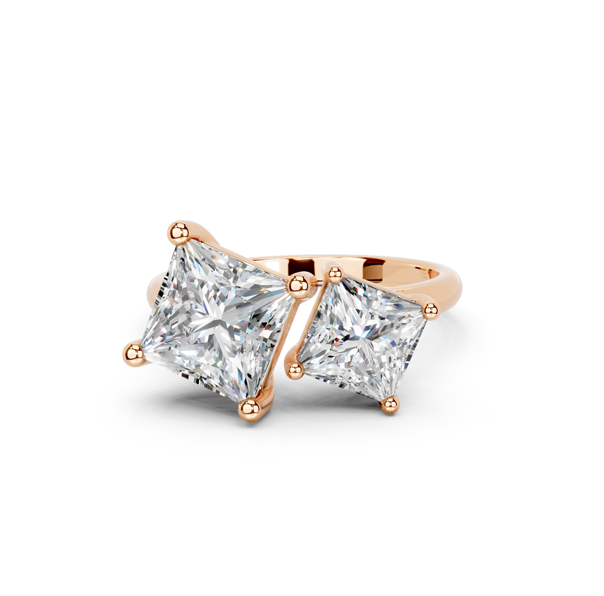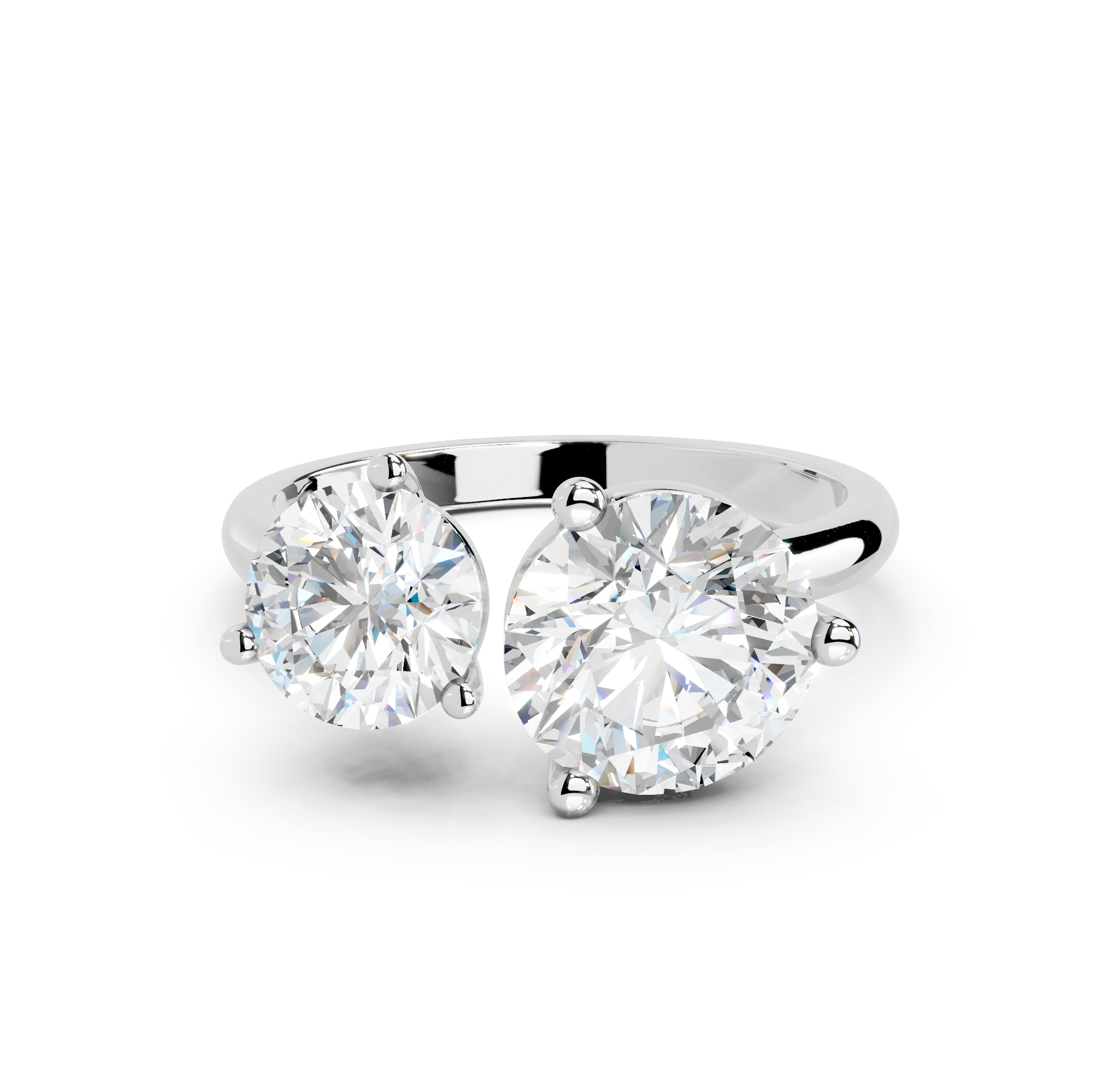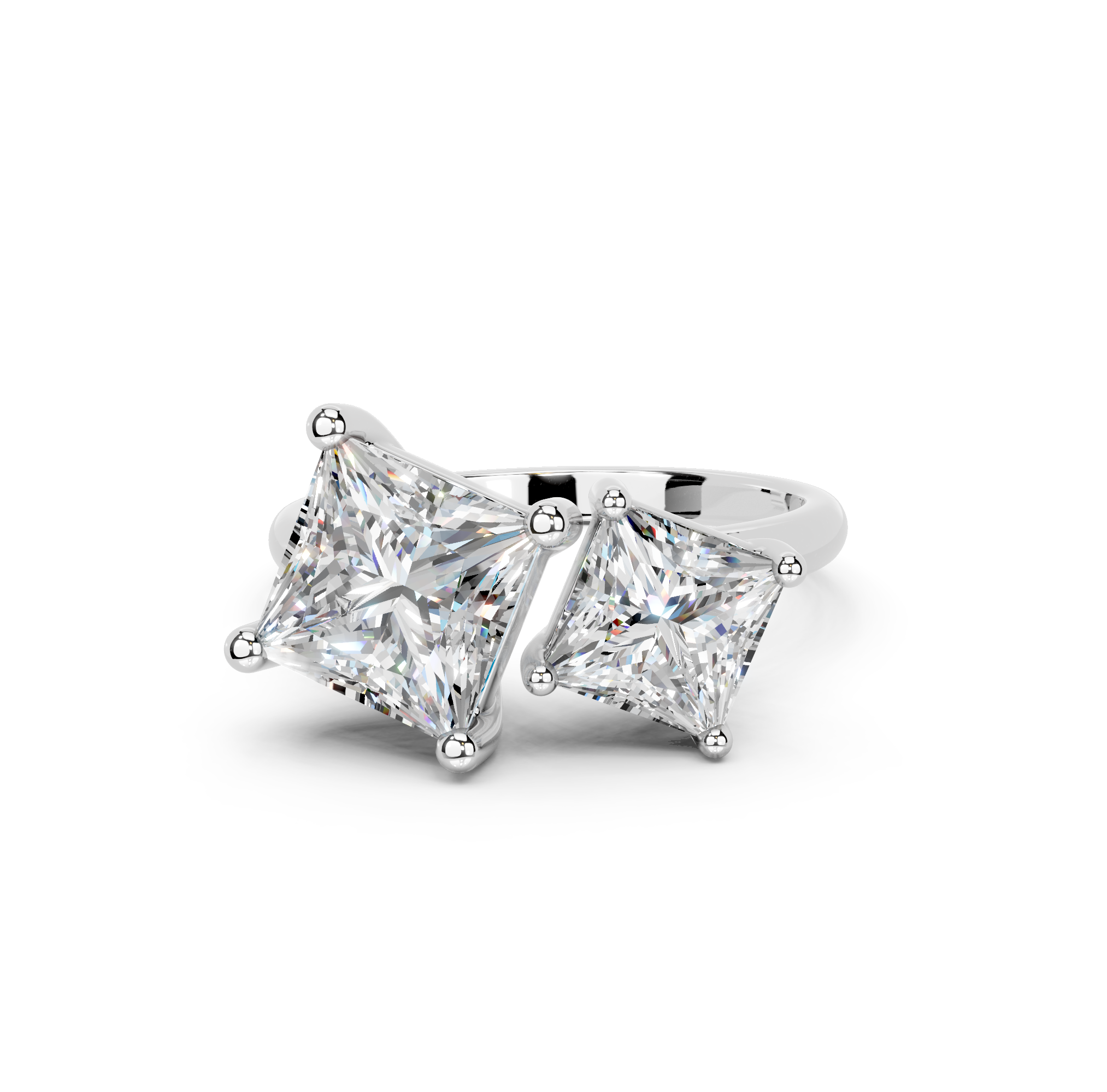 Her charm comes from the two dazzling diamonds, placed close together like lovers. The open style of the simple, sleek band symbolizes the coming together of two souls.
