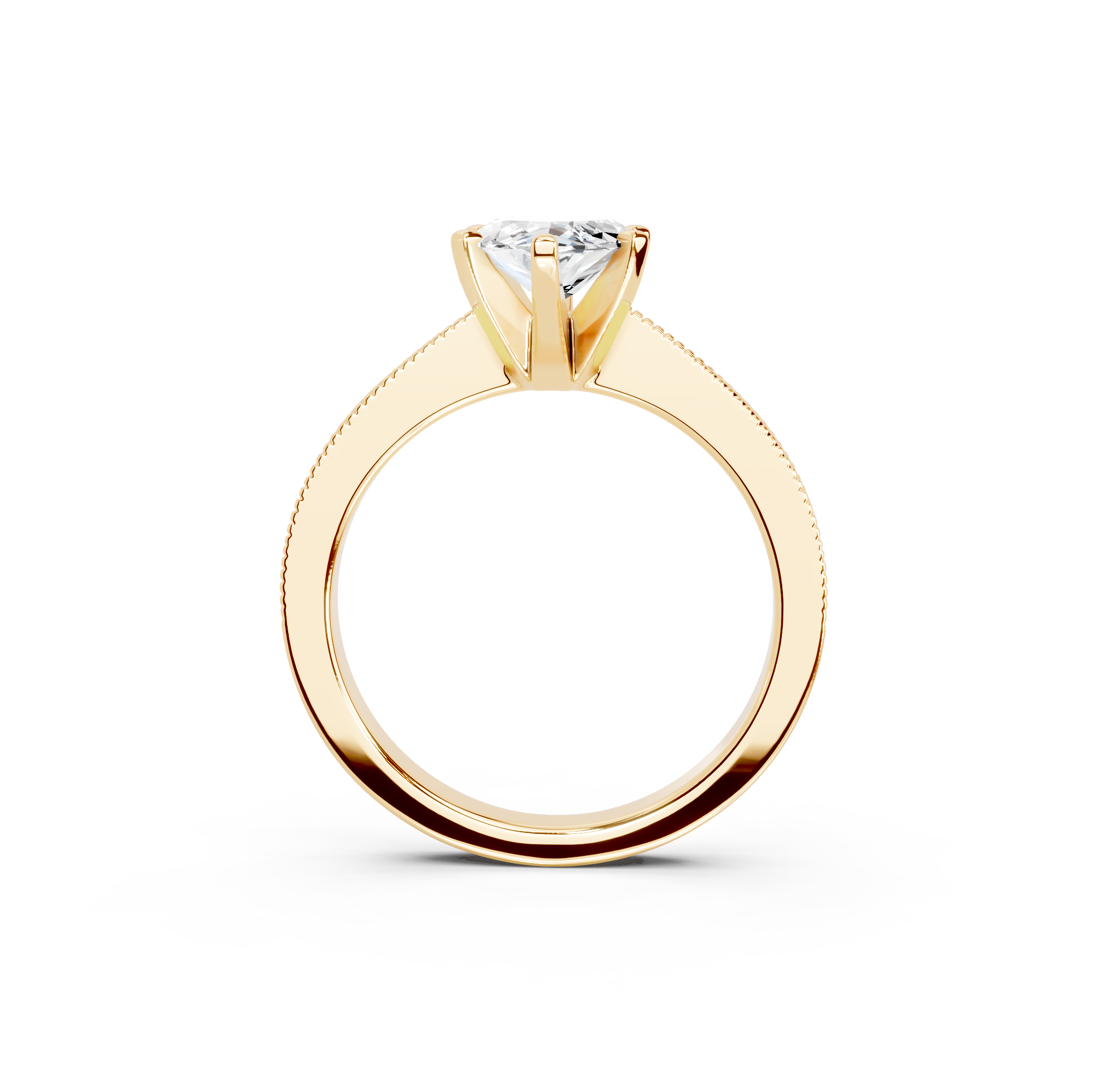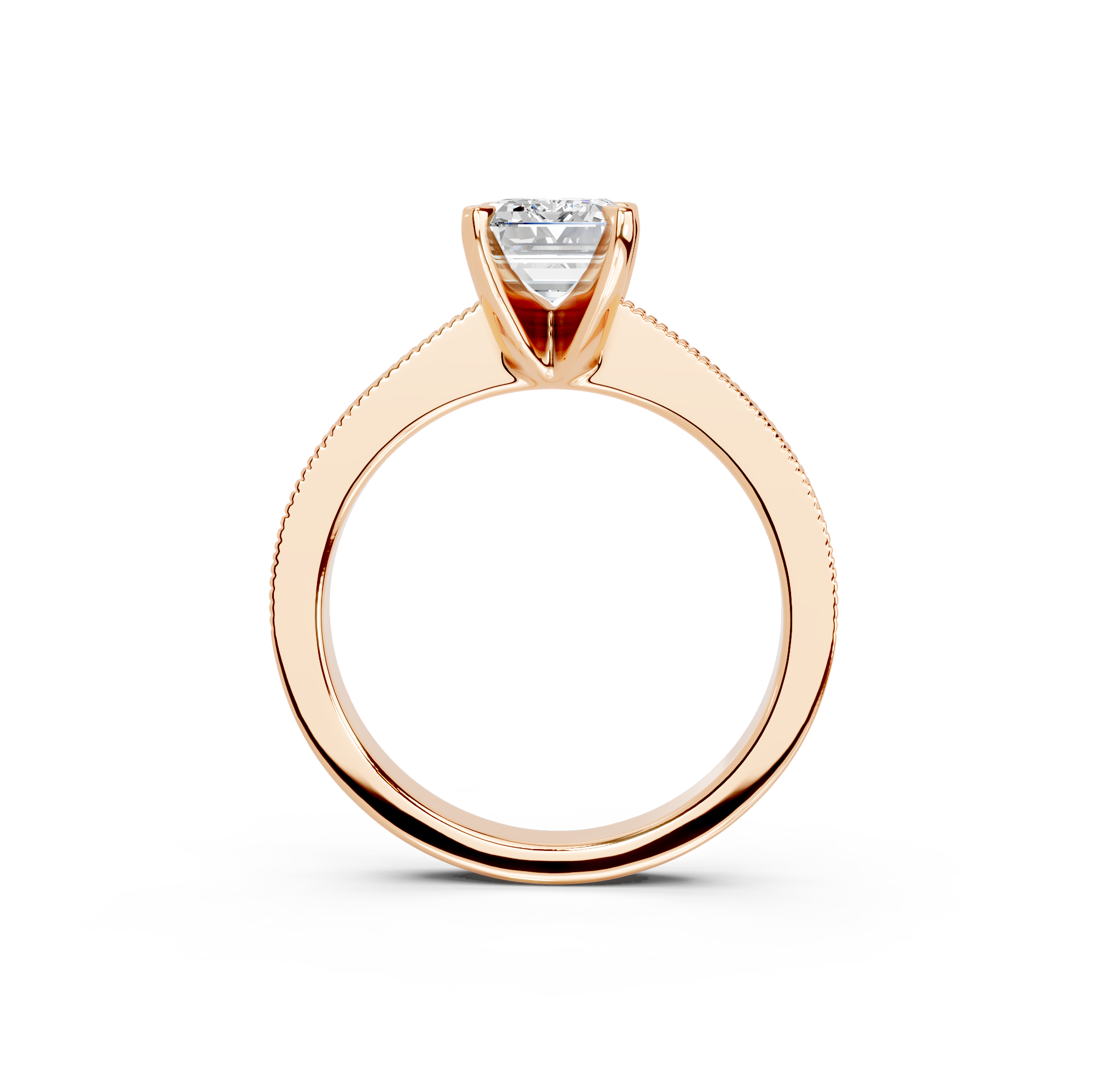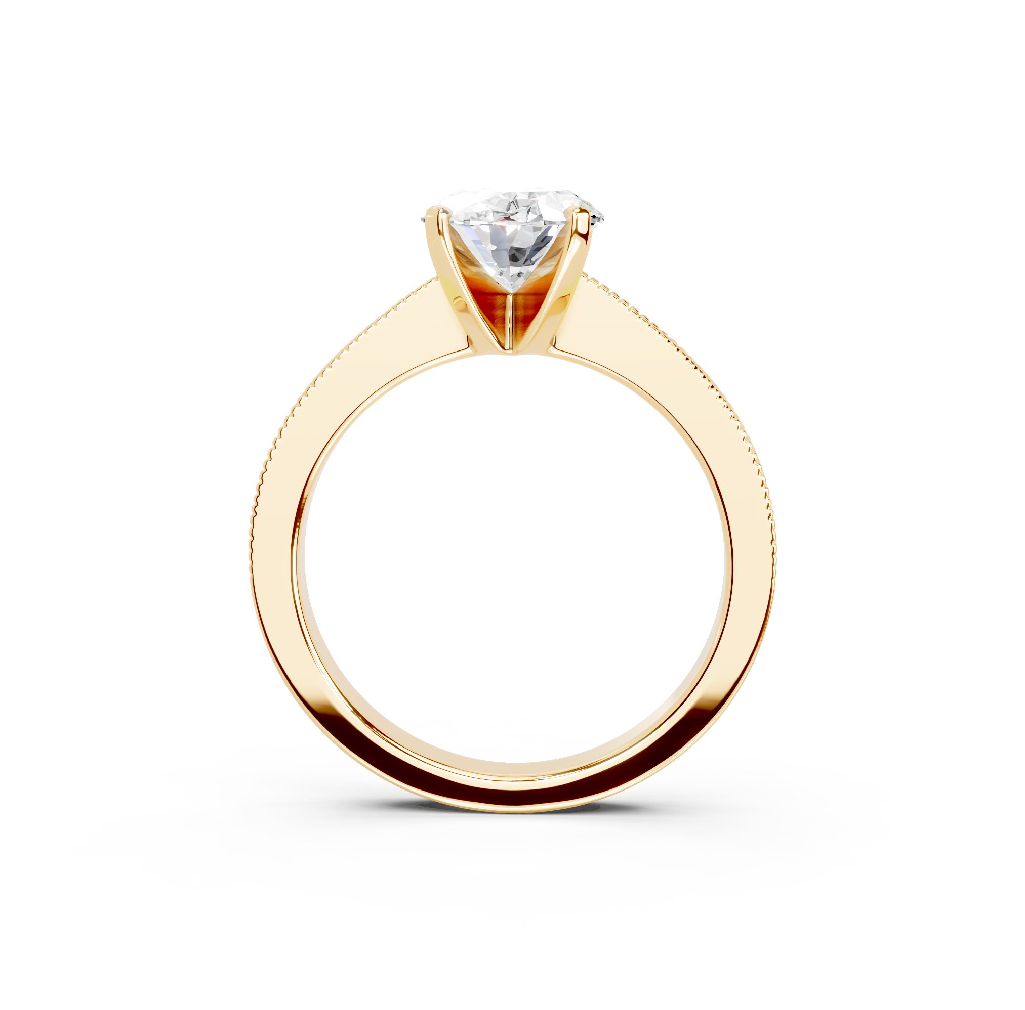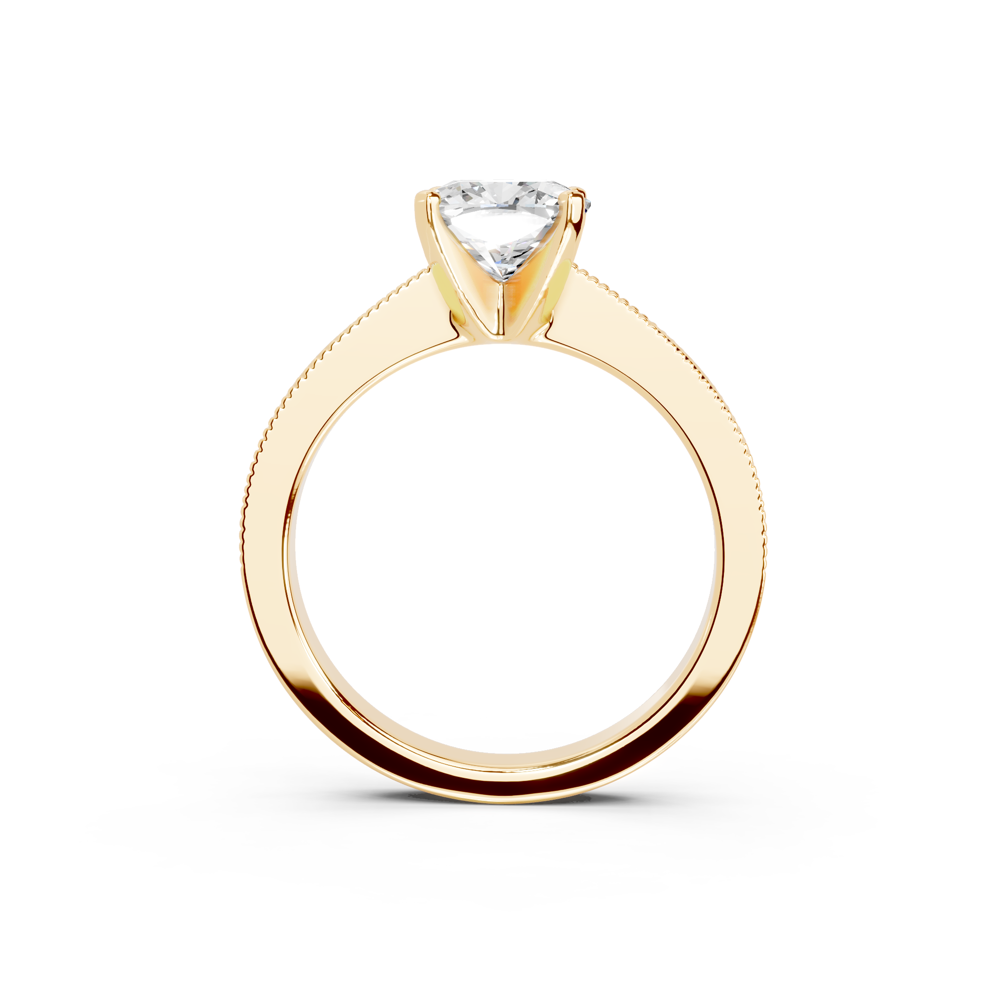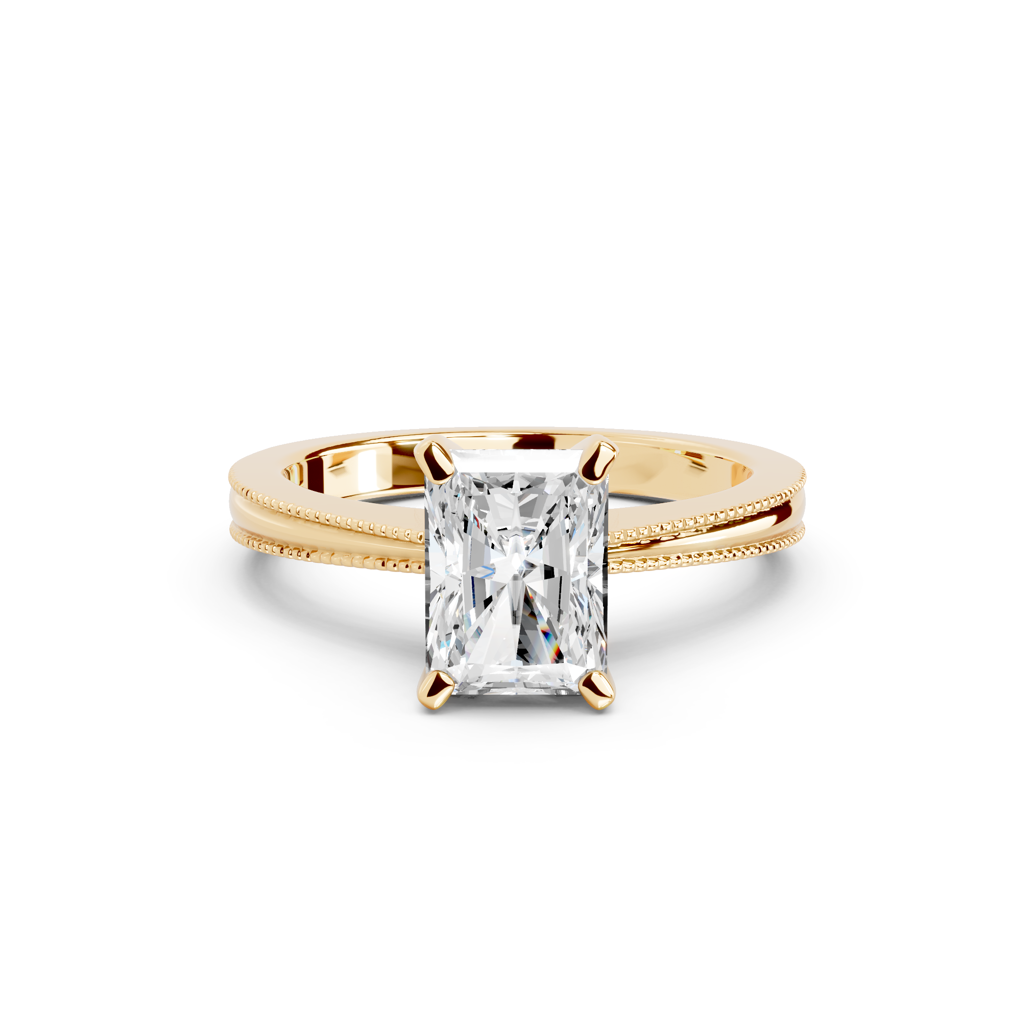 This solitaire milgrain tapered solitaire engagement ring puts a slight twist on a timeless classic. The minimalist design allows your center stone to shine, drawing the eye with its tapered band. The milgrain detailing on the band adds a lovely a delicate beaded edge that brings vintage charm and refined texture without overwhelming the diamond's brilliance. It's subtle sophistication, designed for forever.