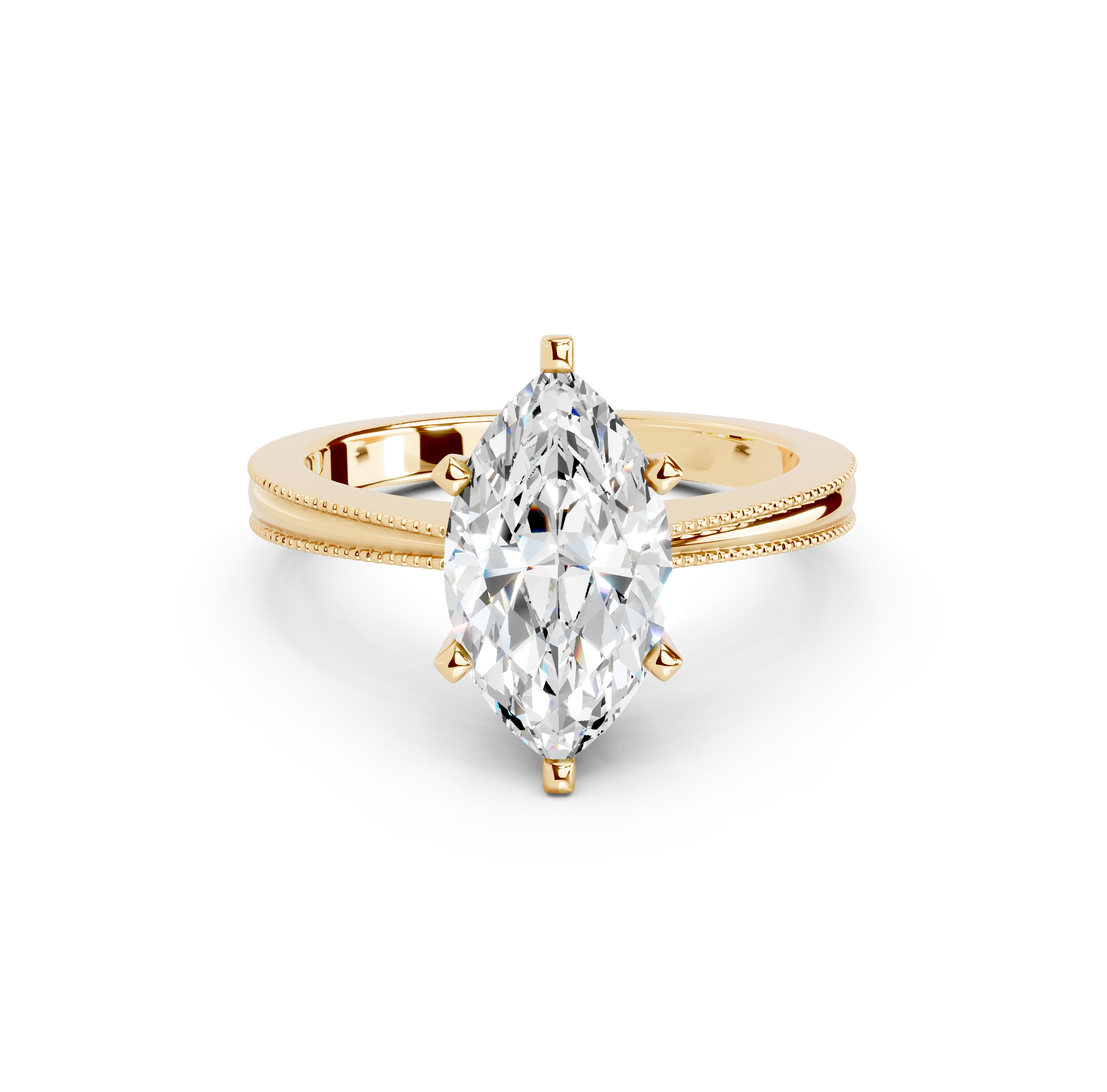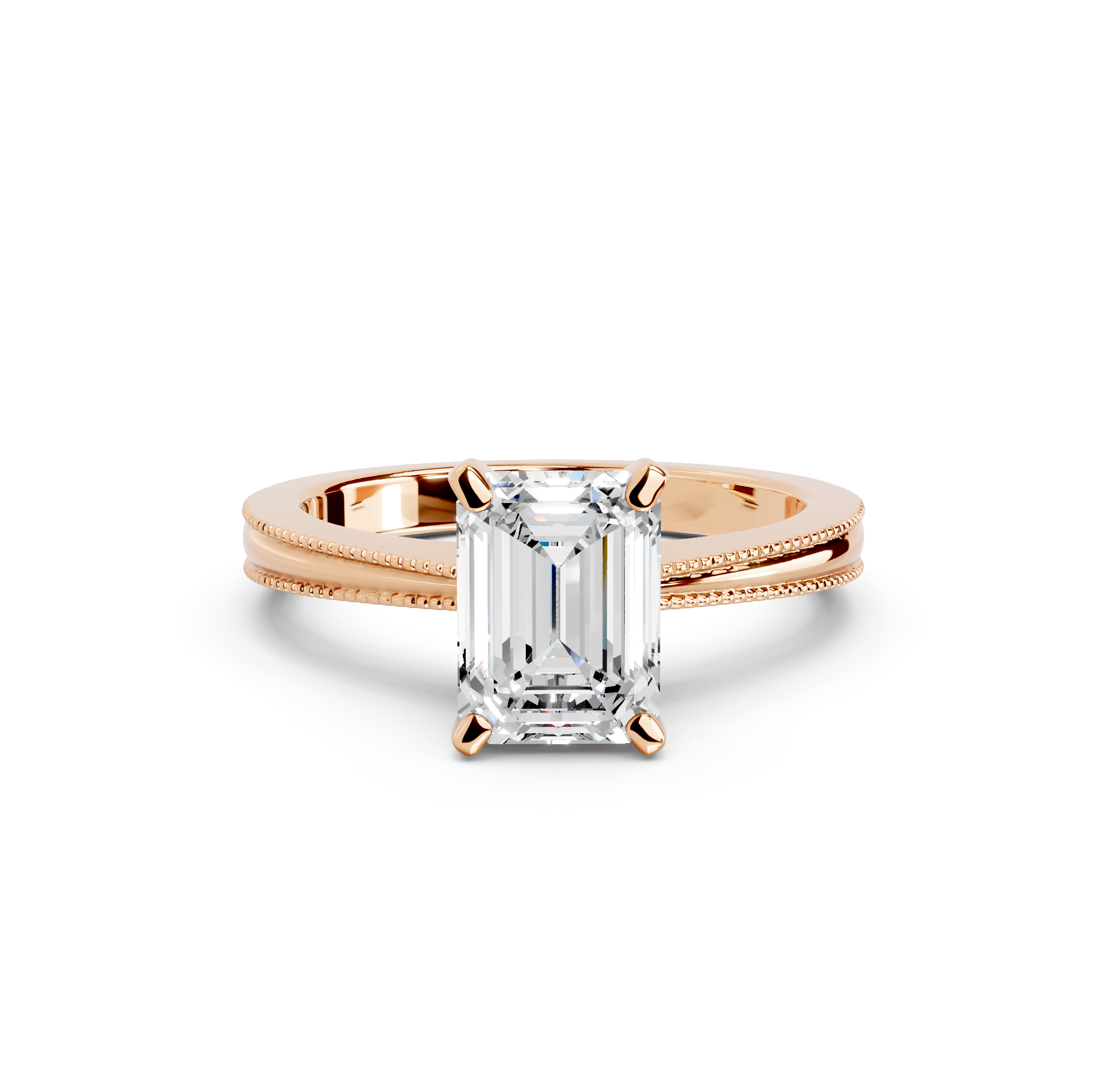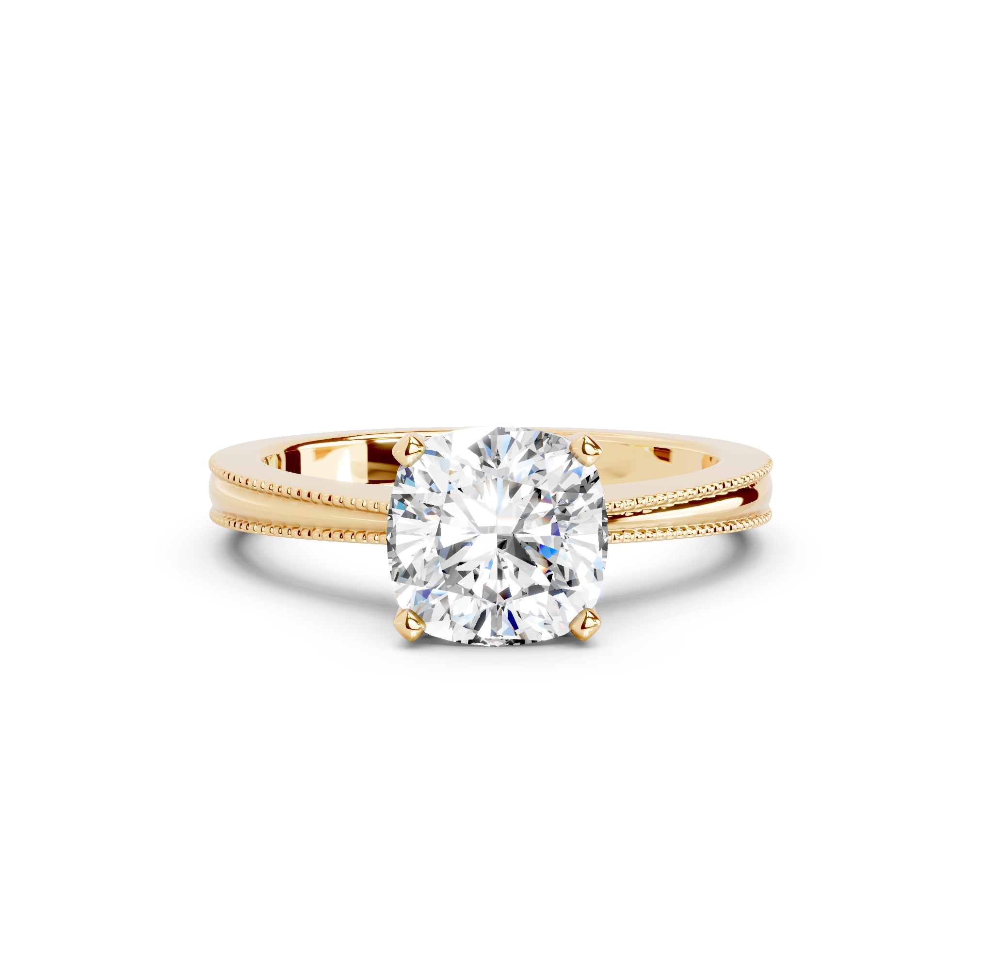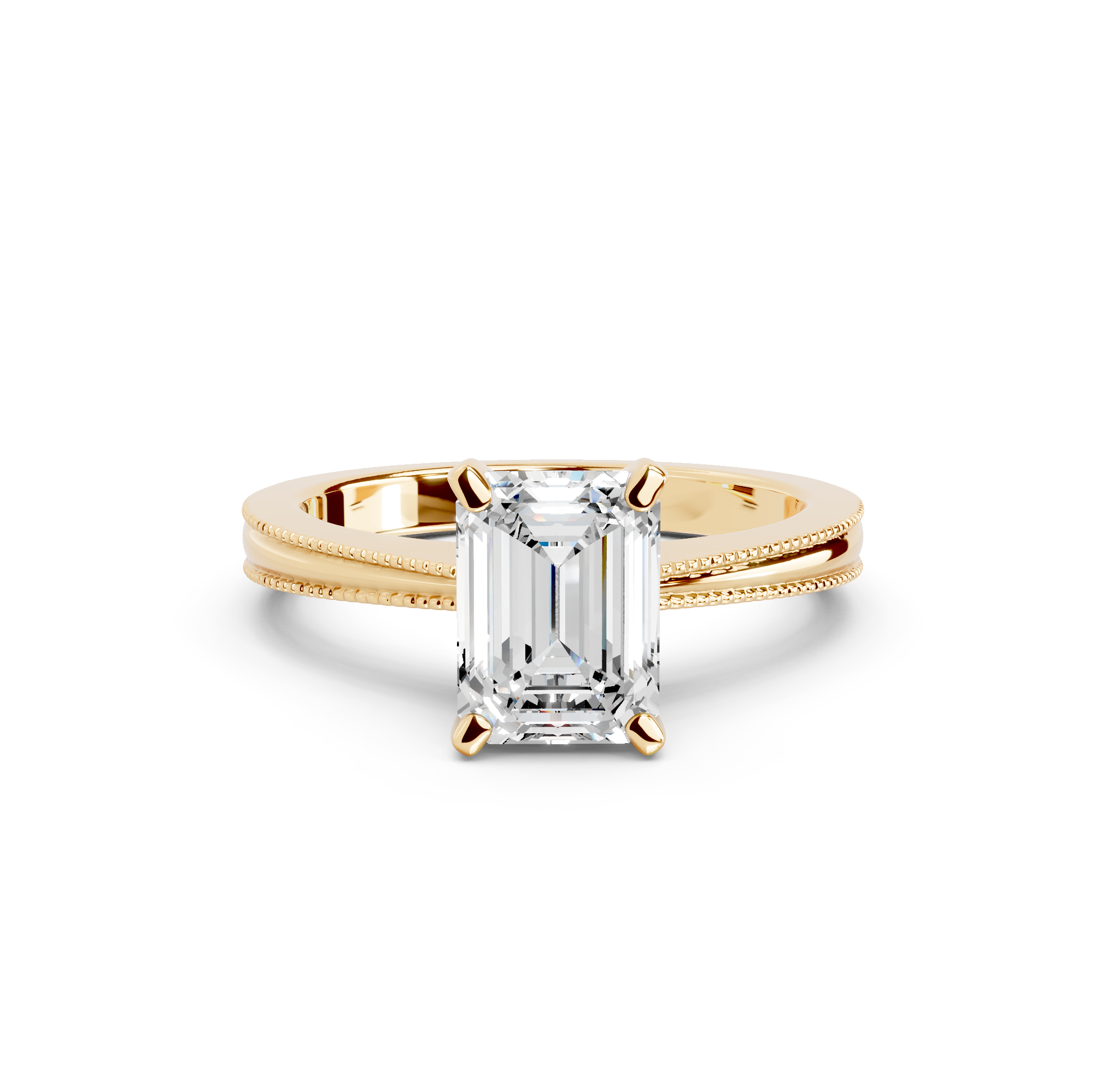 This solitaire milgrain tapered solitaire engagement ring puts a slight twist on a timeless classic. The minimalist design allows your center stone to shine, drawing the eye with its tapered band. The milgrain detailing on the band adds a lovely a delicate beaded edge that brings vintage charm and refined texture without overwhelming the diamond's brilliance. It's subtle sophistication, designed for forever.