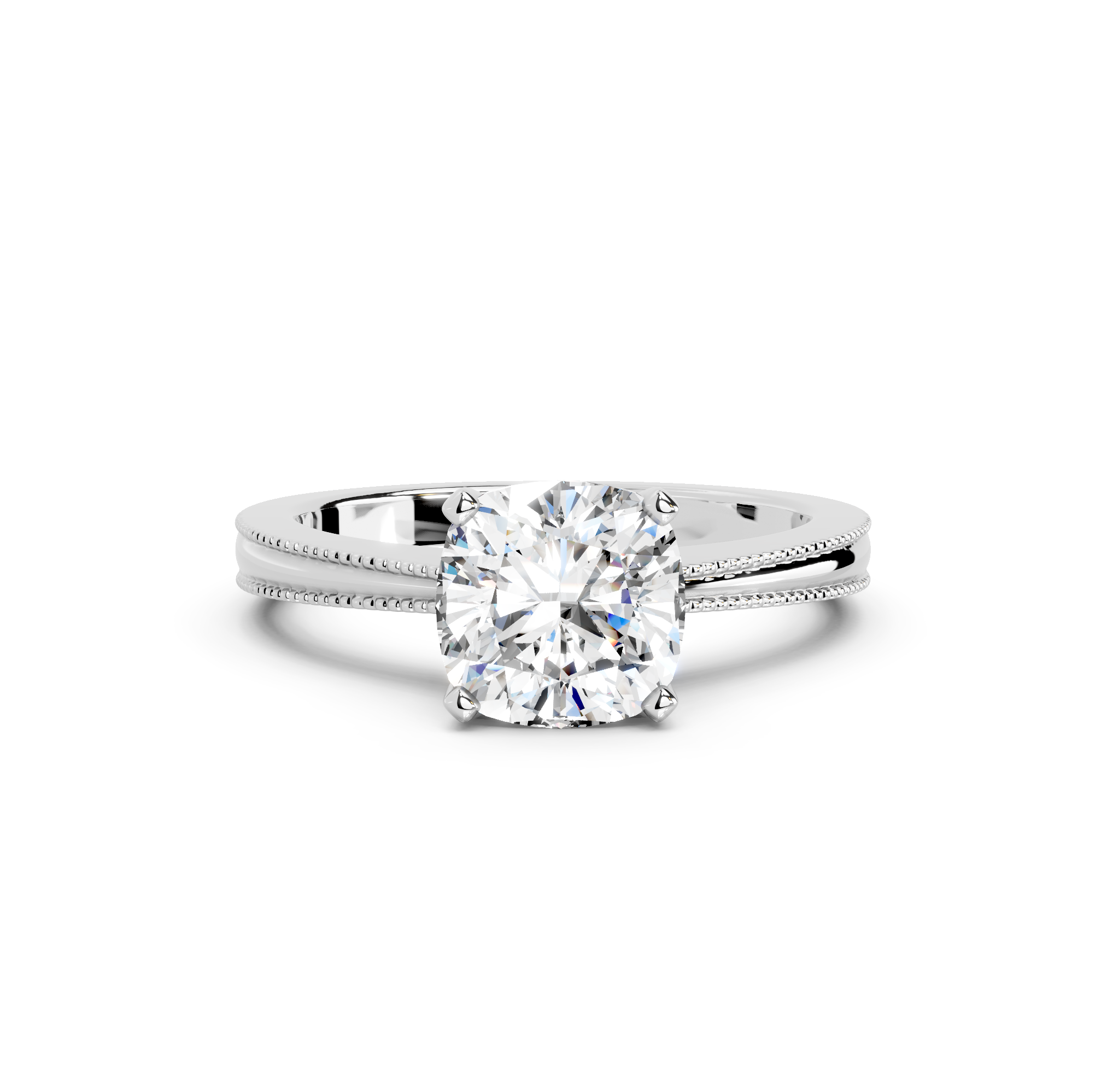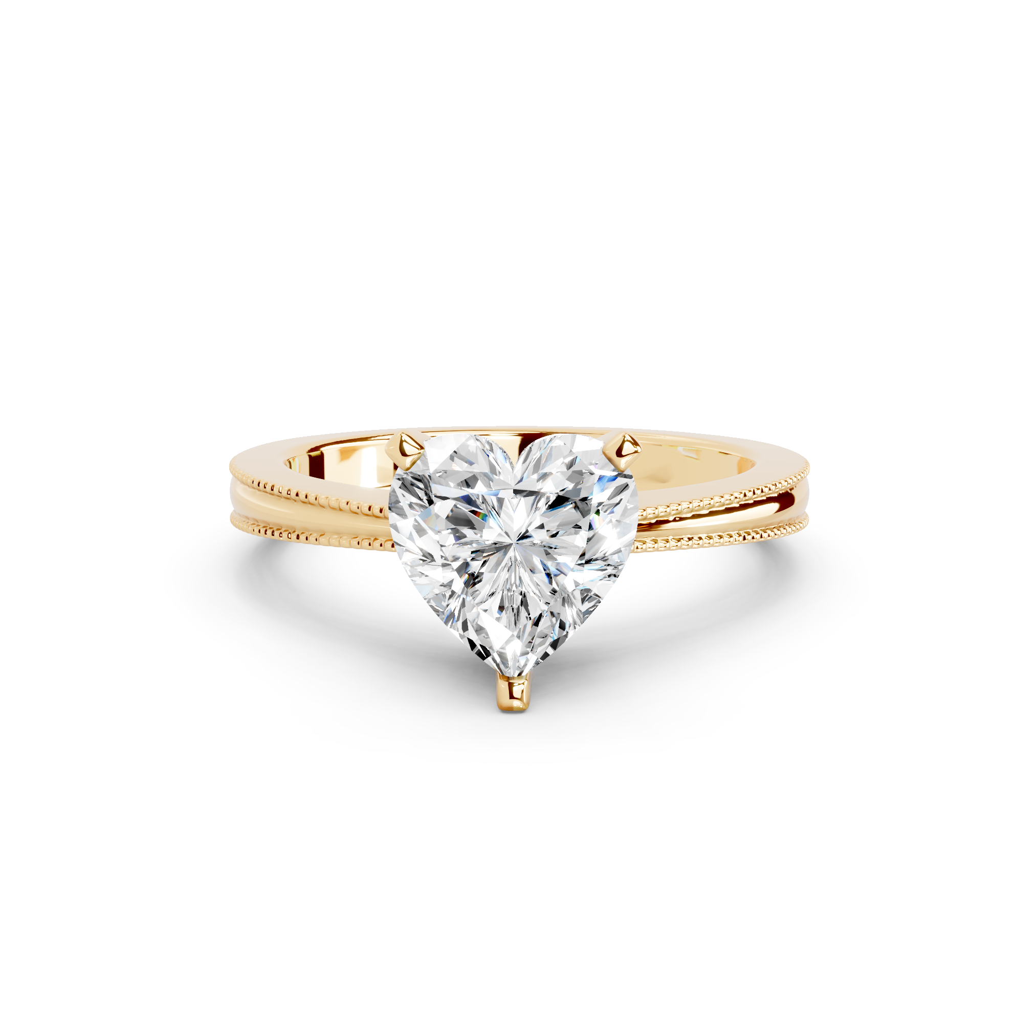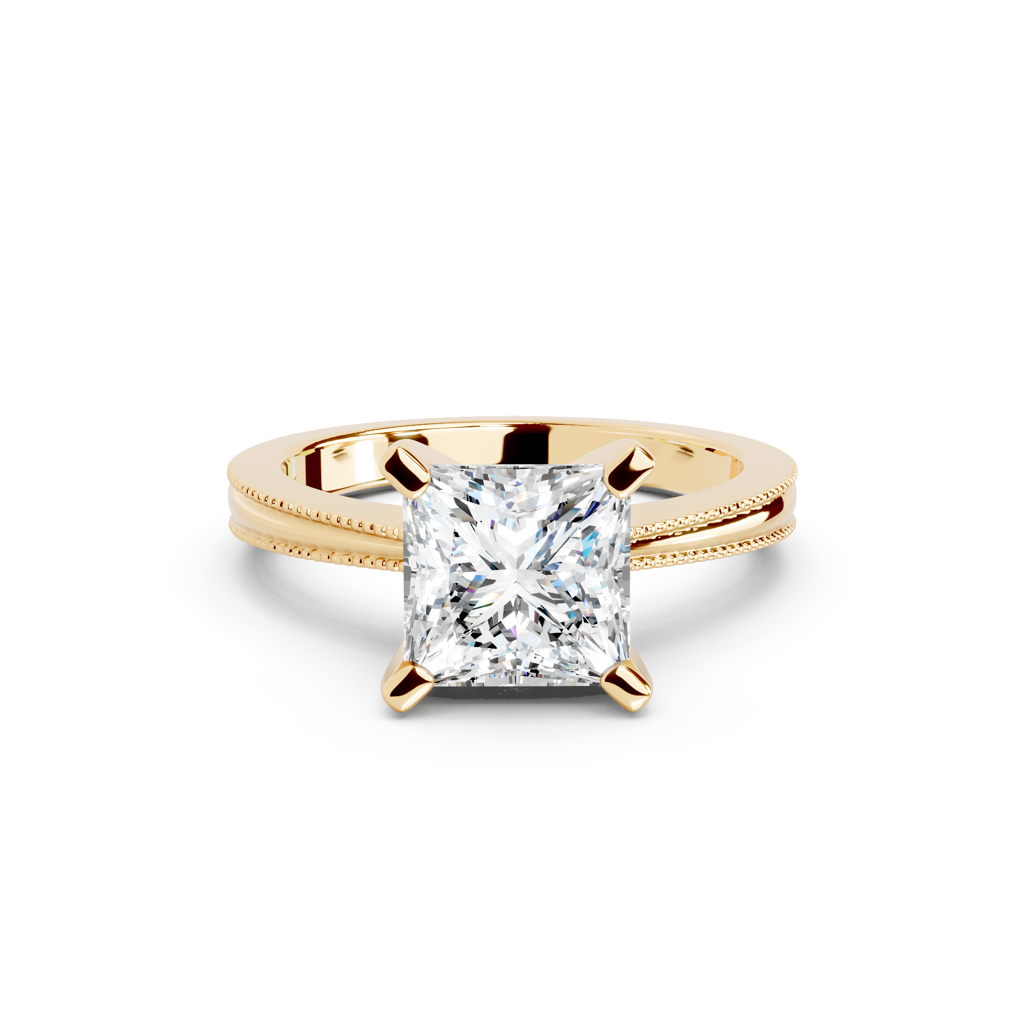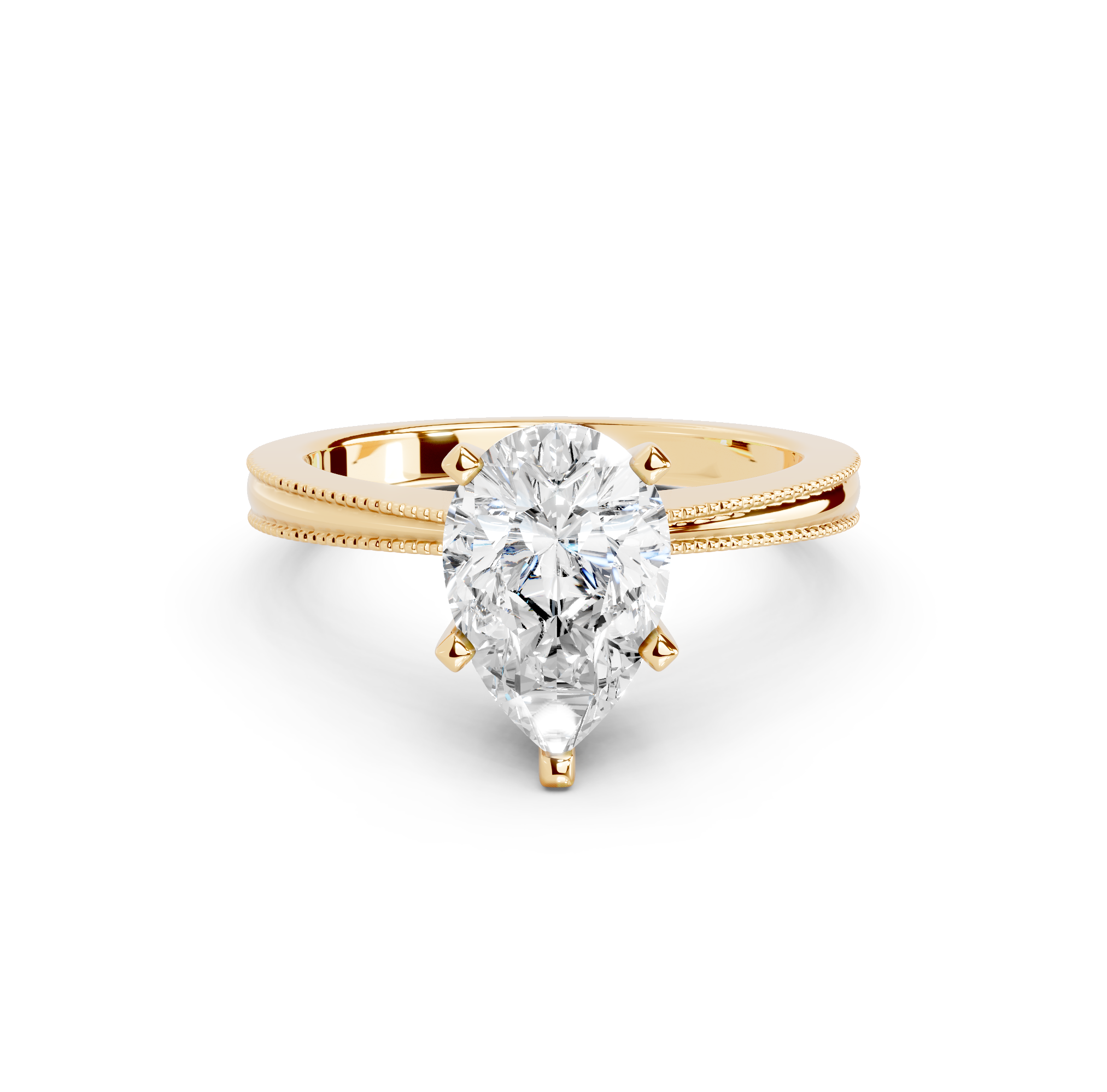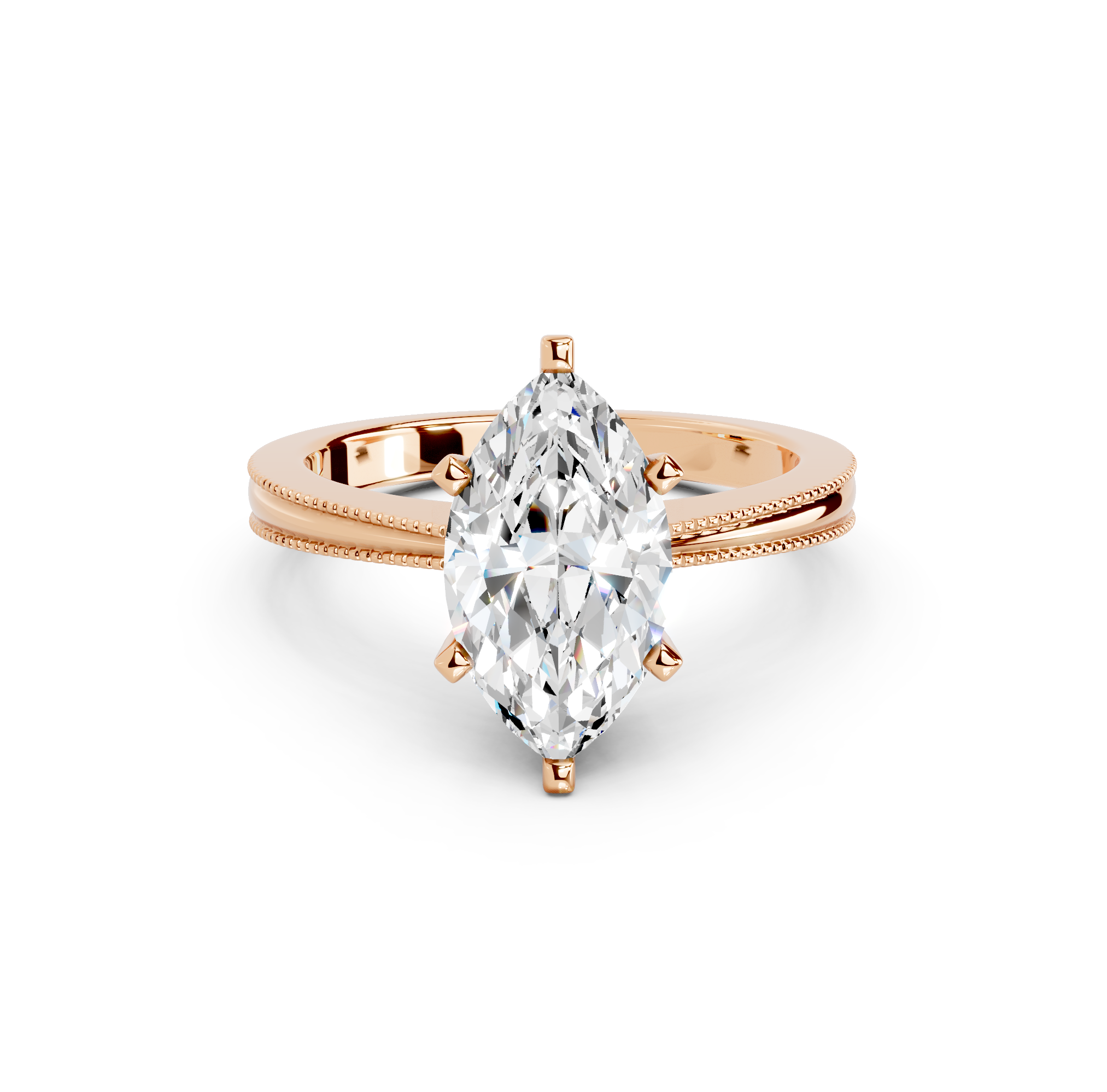 This solitaire milgrain tapered solitaire engagement ring puts a slight twist on a timeless classic. The minimalist design allows your center stone to shine, drawing the eye with its tapered band. The milgrain detailing on the band adds a lovely a delicate beaded edge that brings vintage charm and refined texture without overwhelming the diamond's brilliance. It's subtle sophistication, designed for forever.