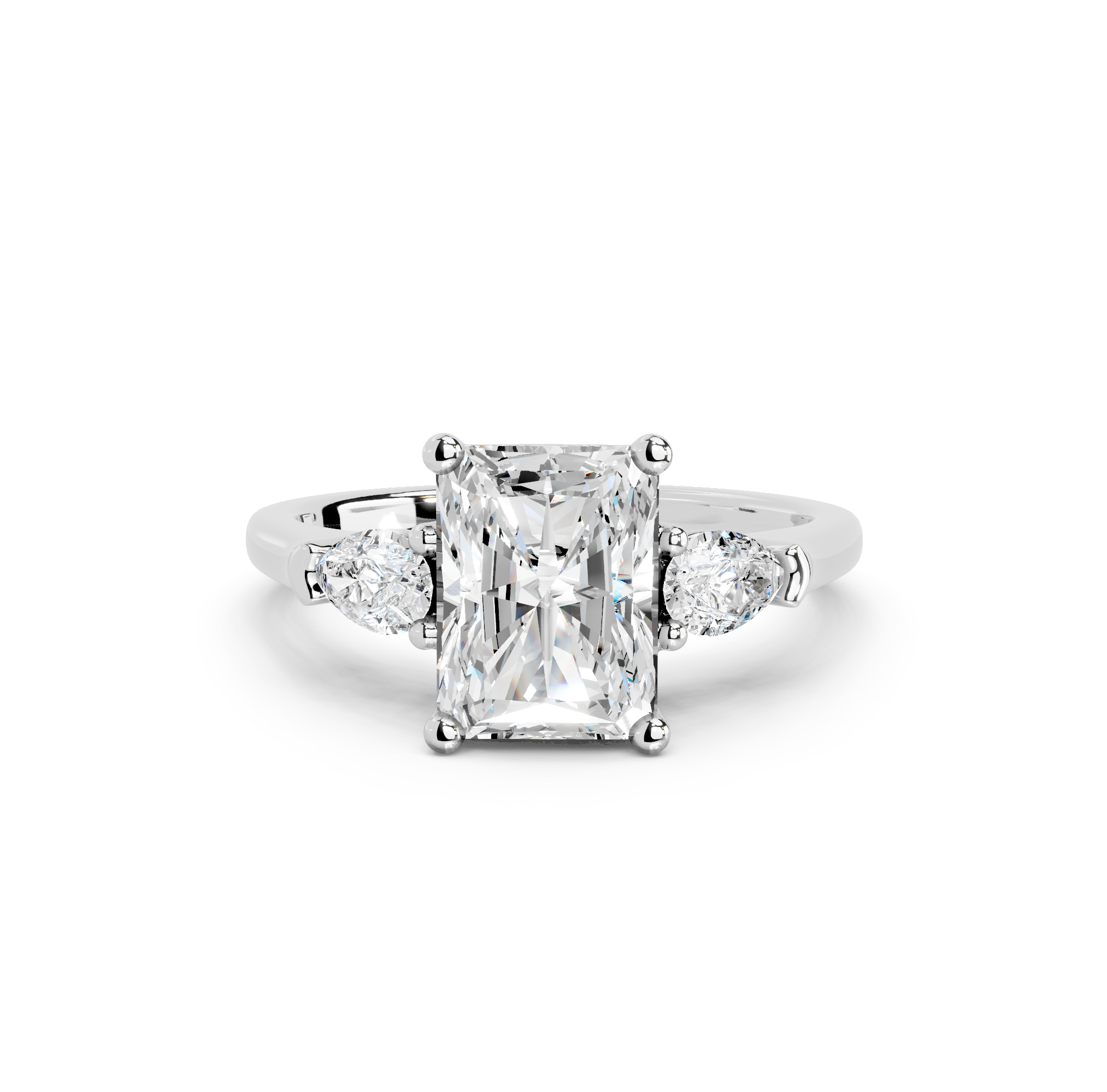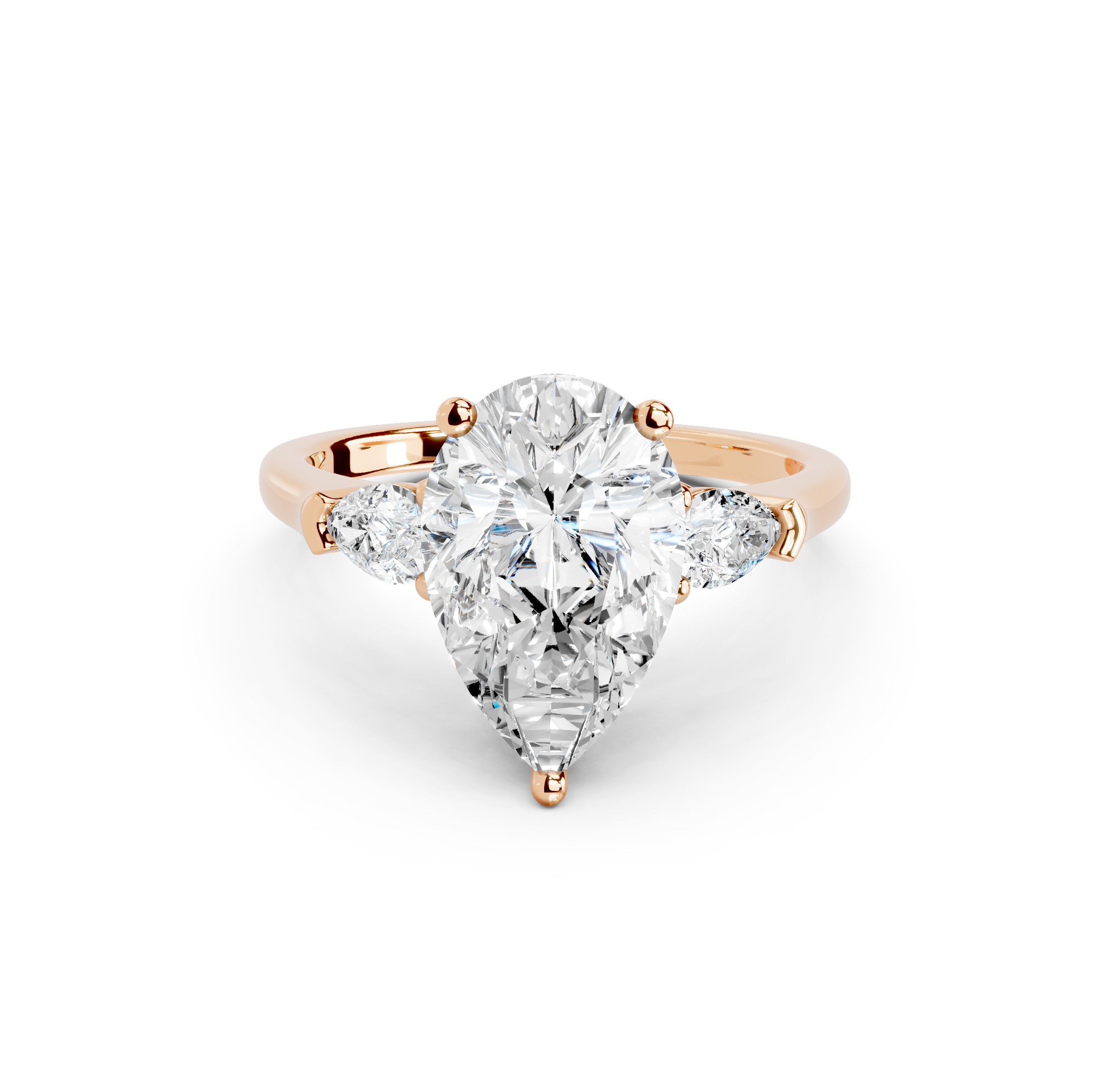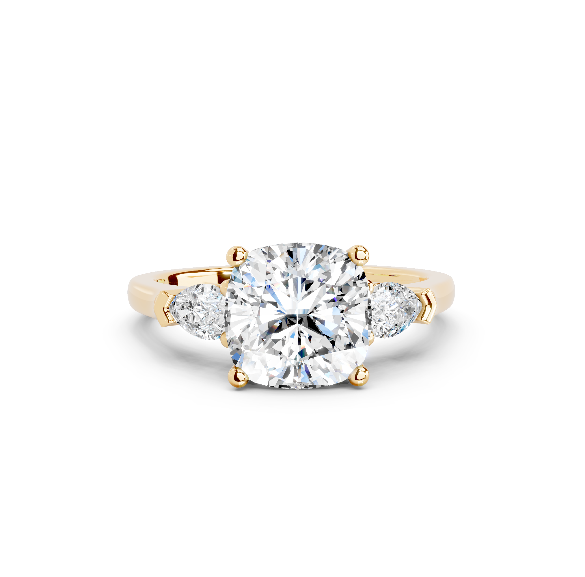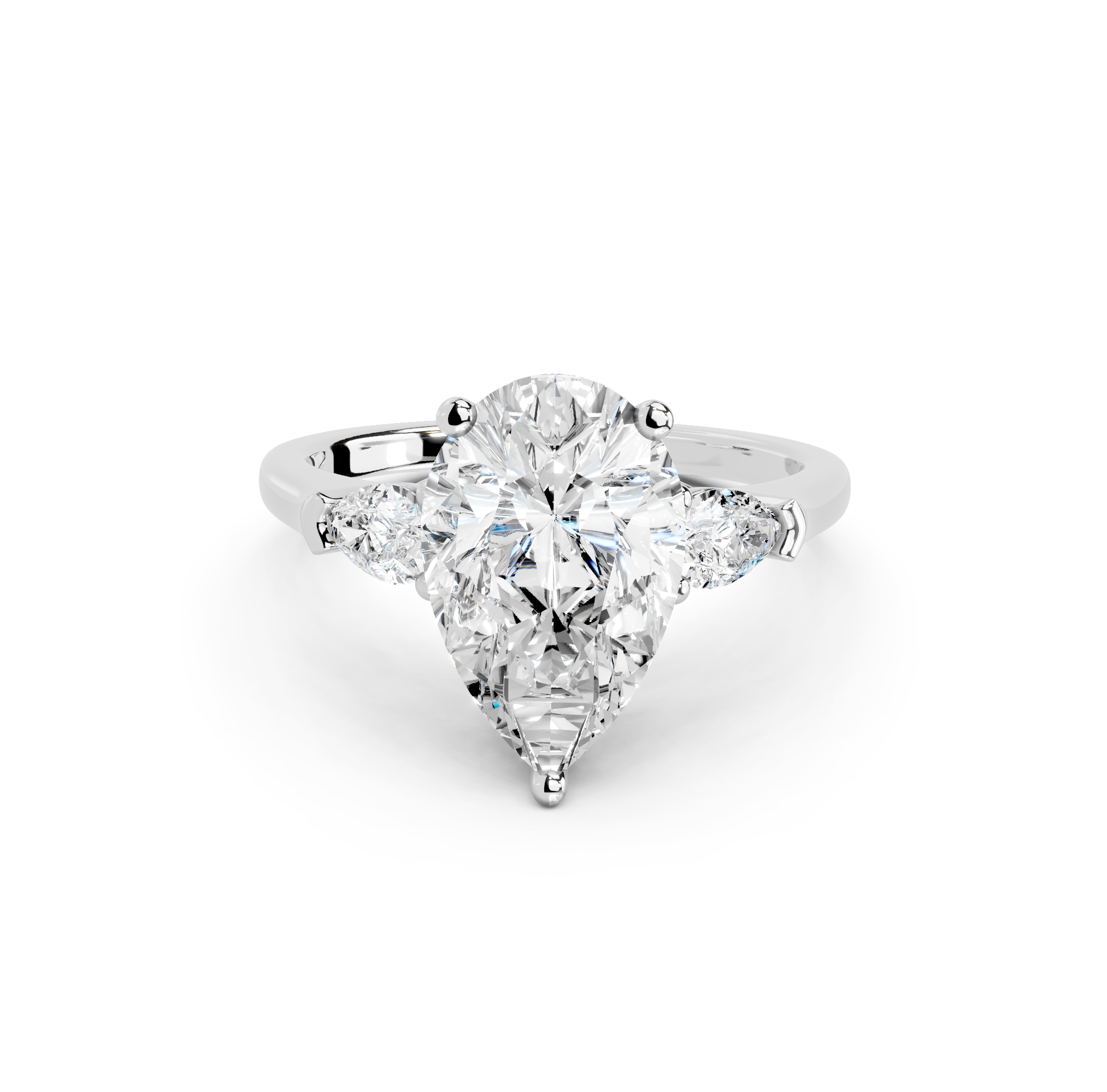 This three stone cathedral engagement ring has a center diamond flanked by two pear-cut side stones that create a symmetrical design. The cathedral setting elevates all three diamonds above the band, allowing light to shine from beneath. The raised mounting makes the ring feel larger and more exquisite.