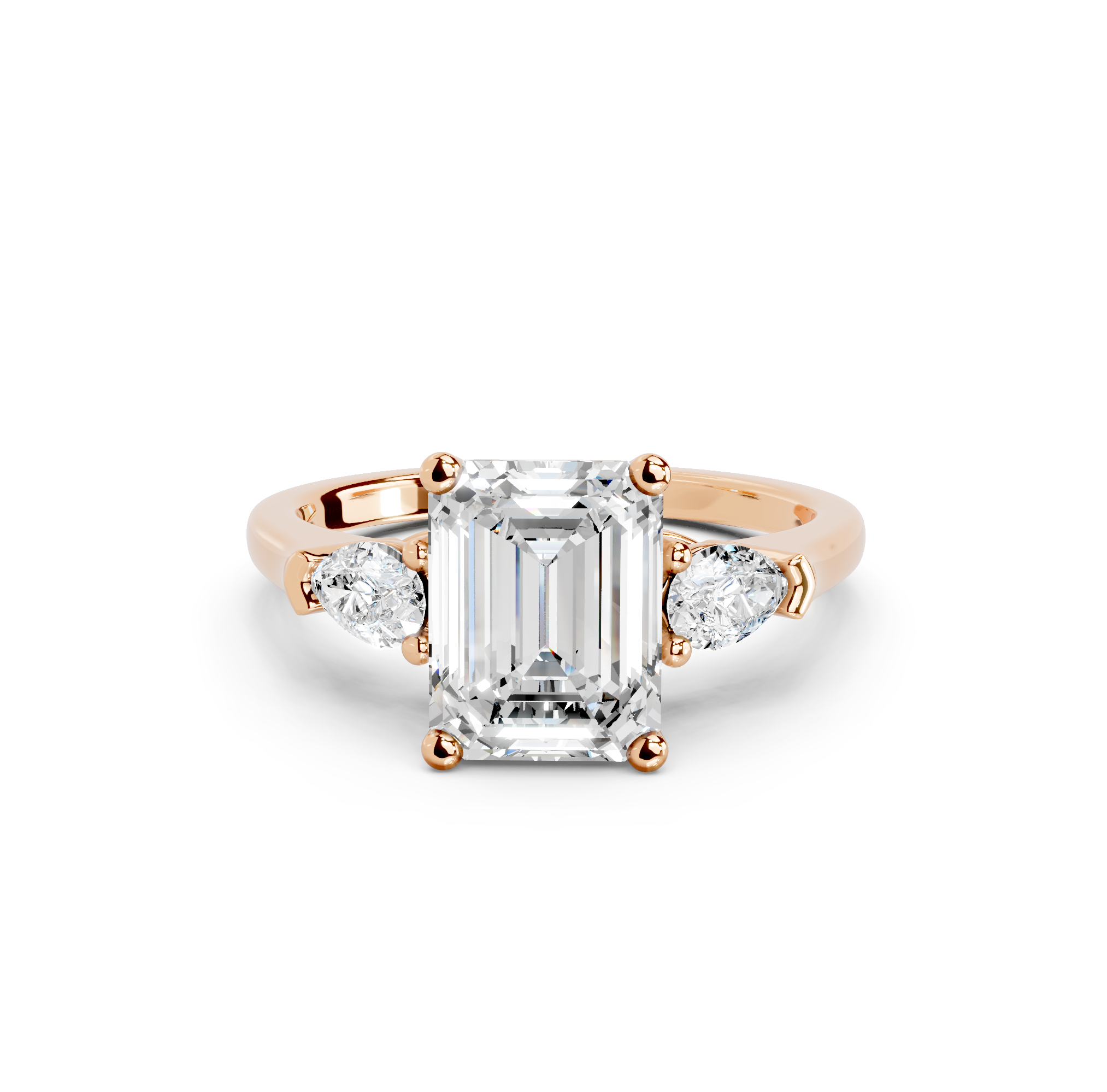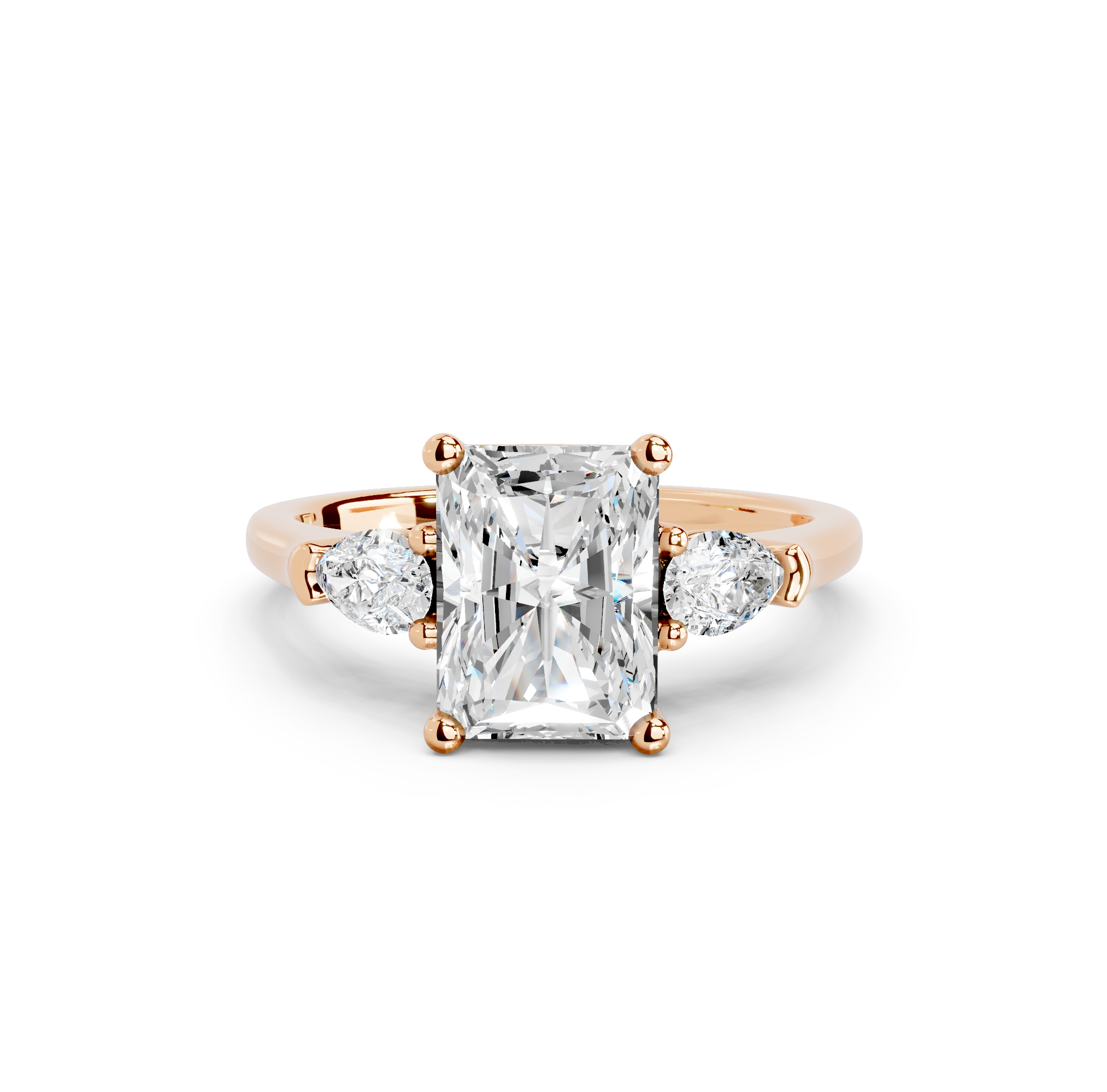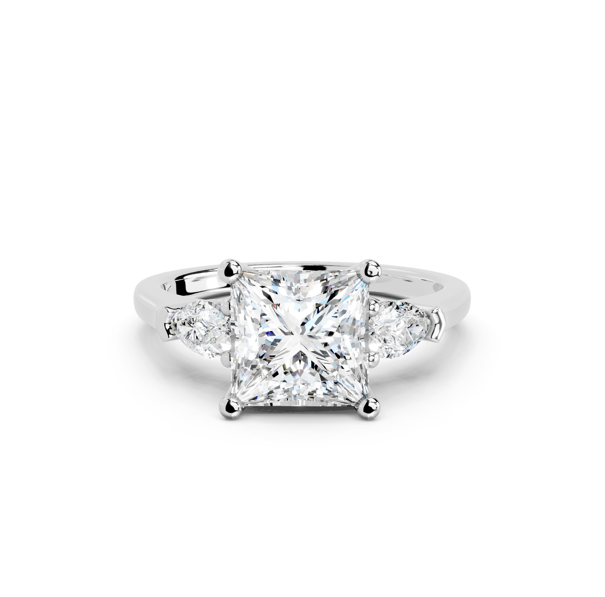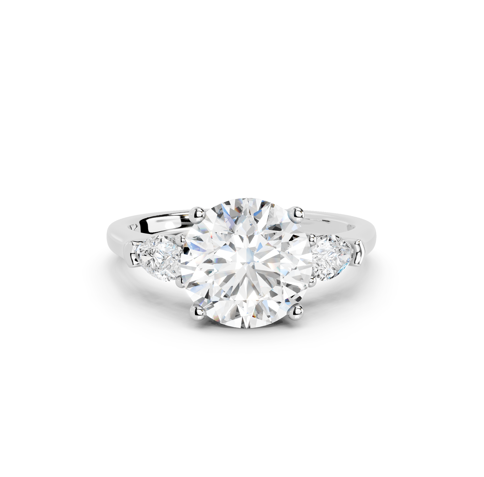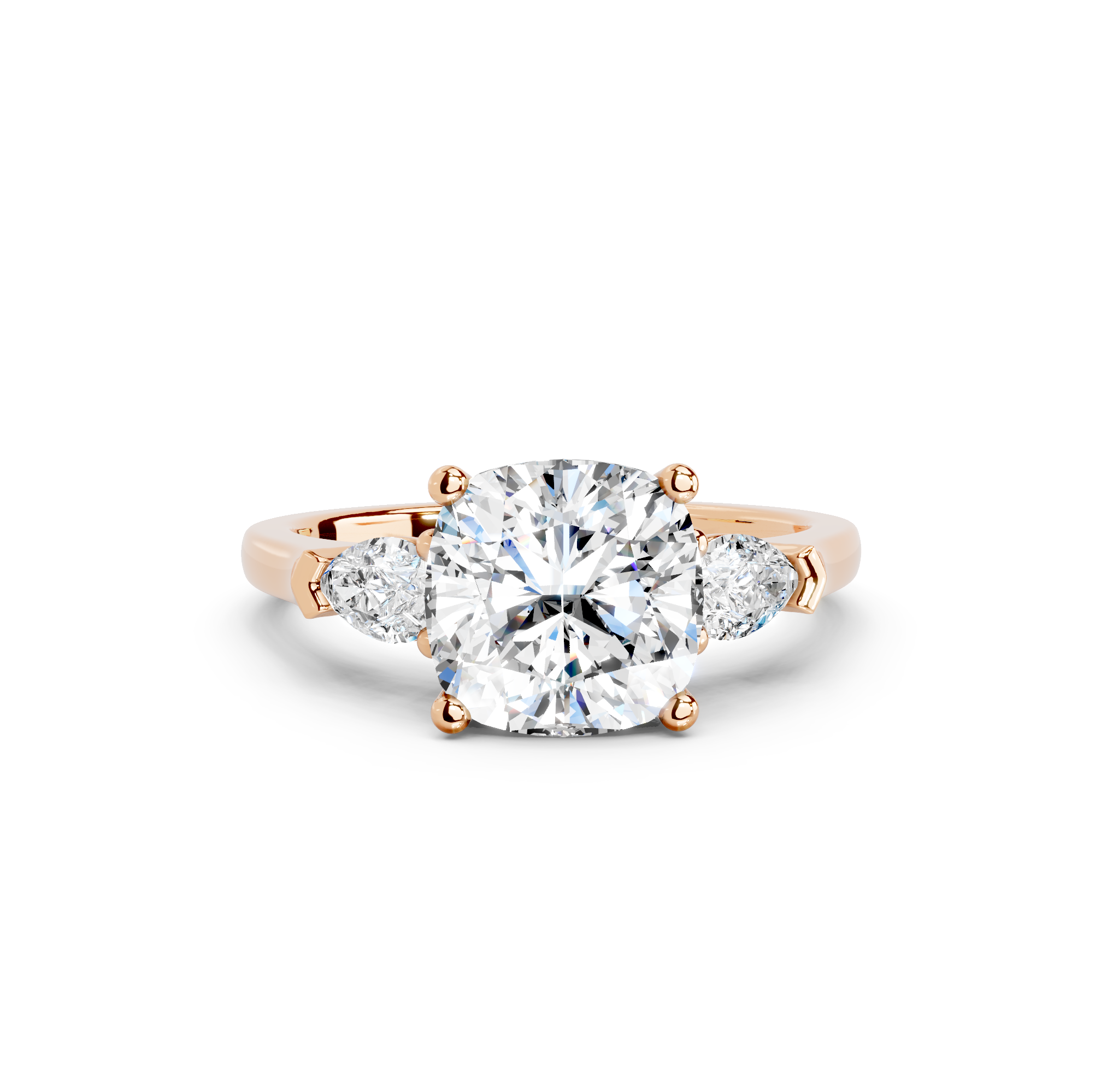 This three stone cathedral engagement ring has a center diamond flanked by two pear-cut side stones that create a symmetrical design. The cathedral setting elevates all three diamonds above the band, allowing light to shine from beneath. The raised mounting makes the ring feel larger and more exquisite.