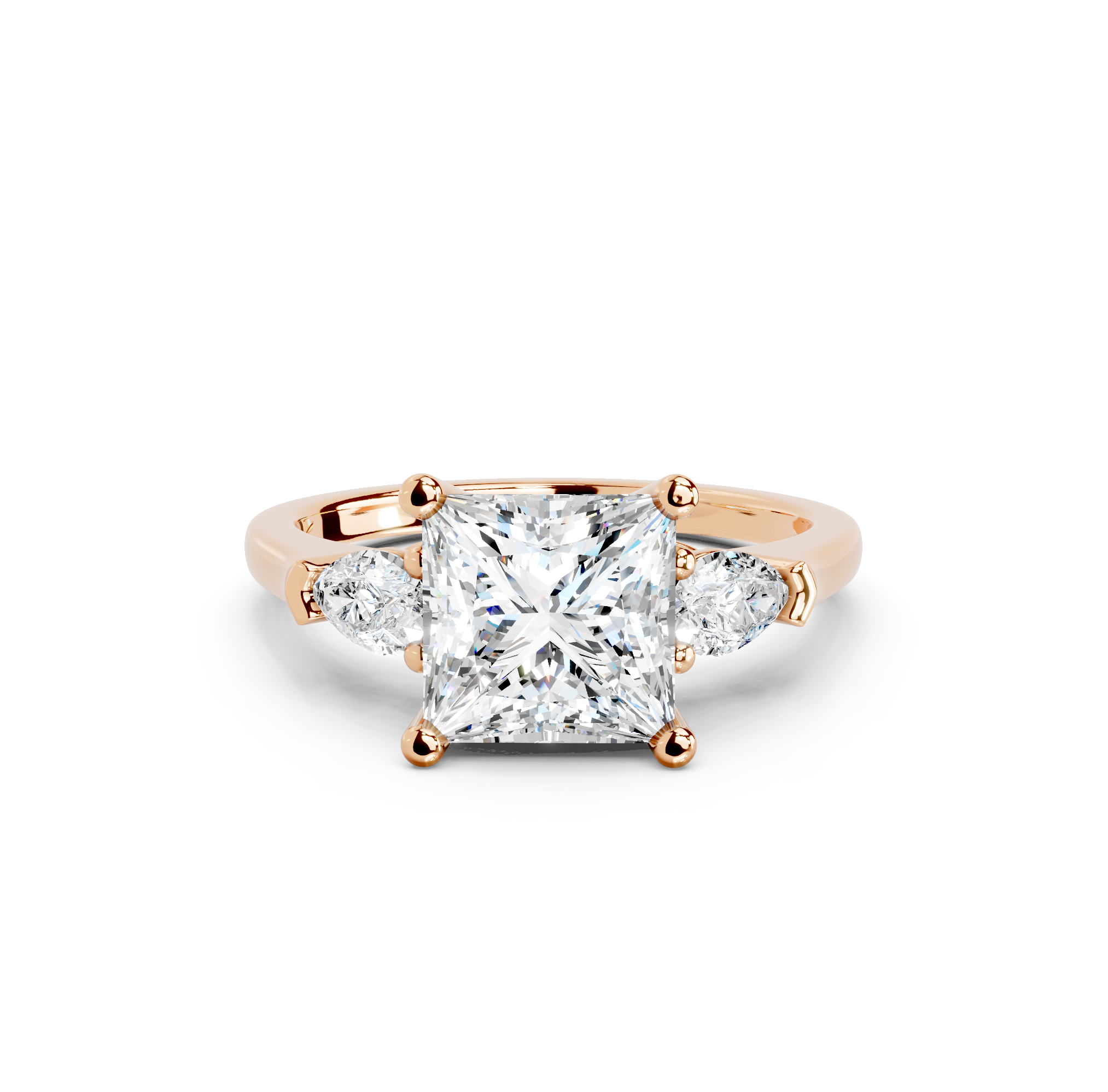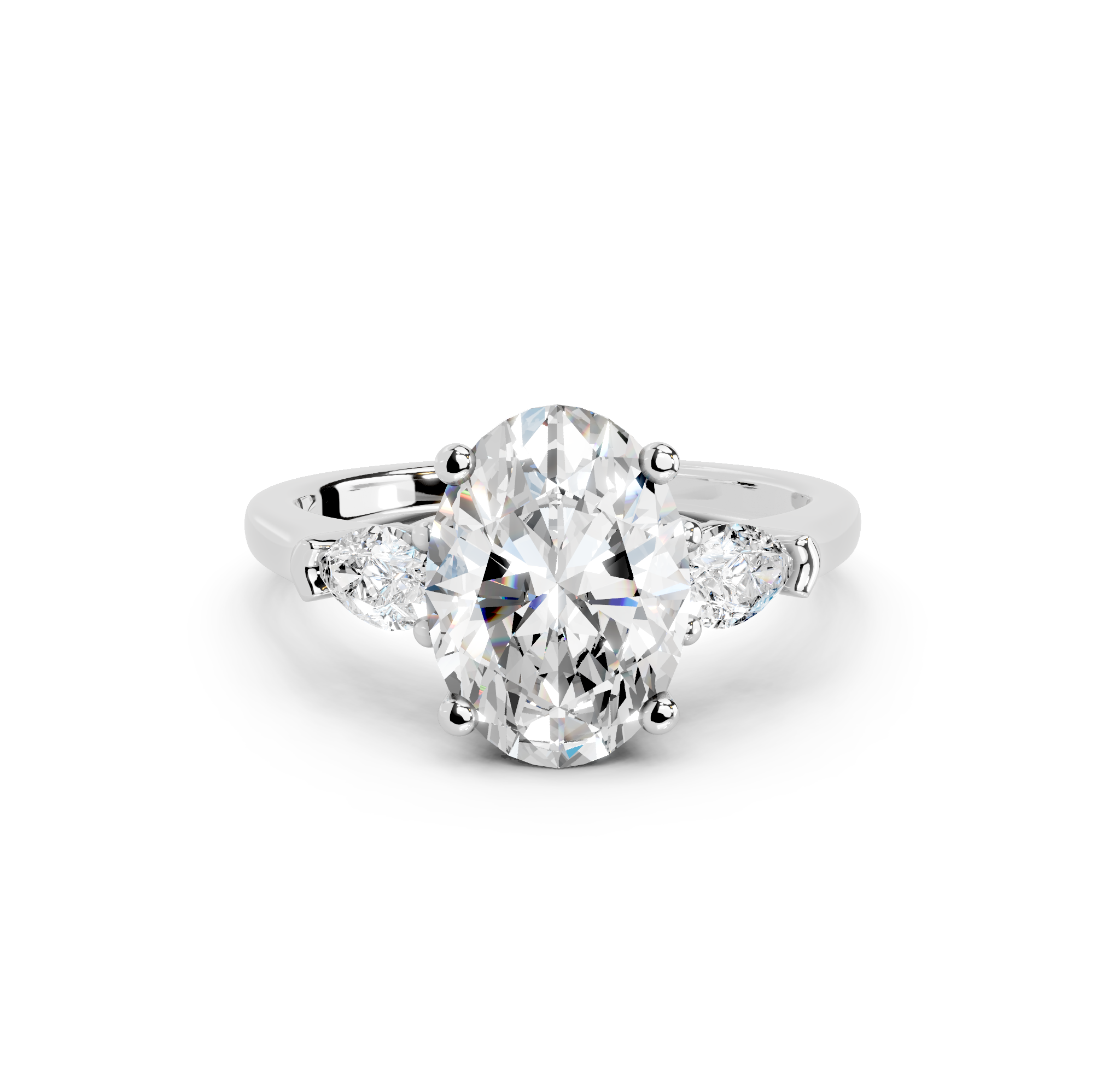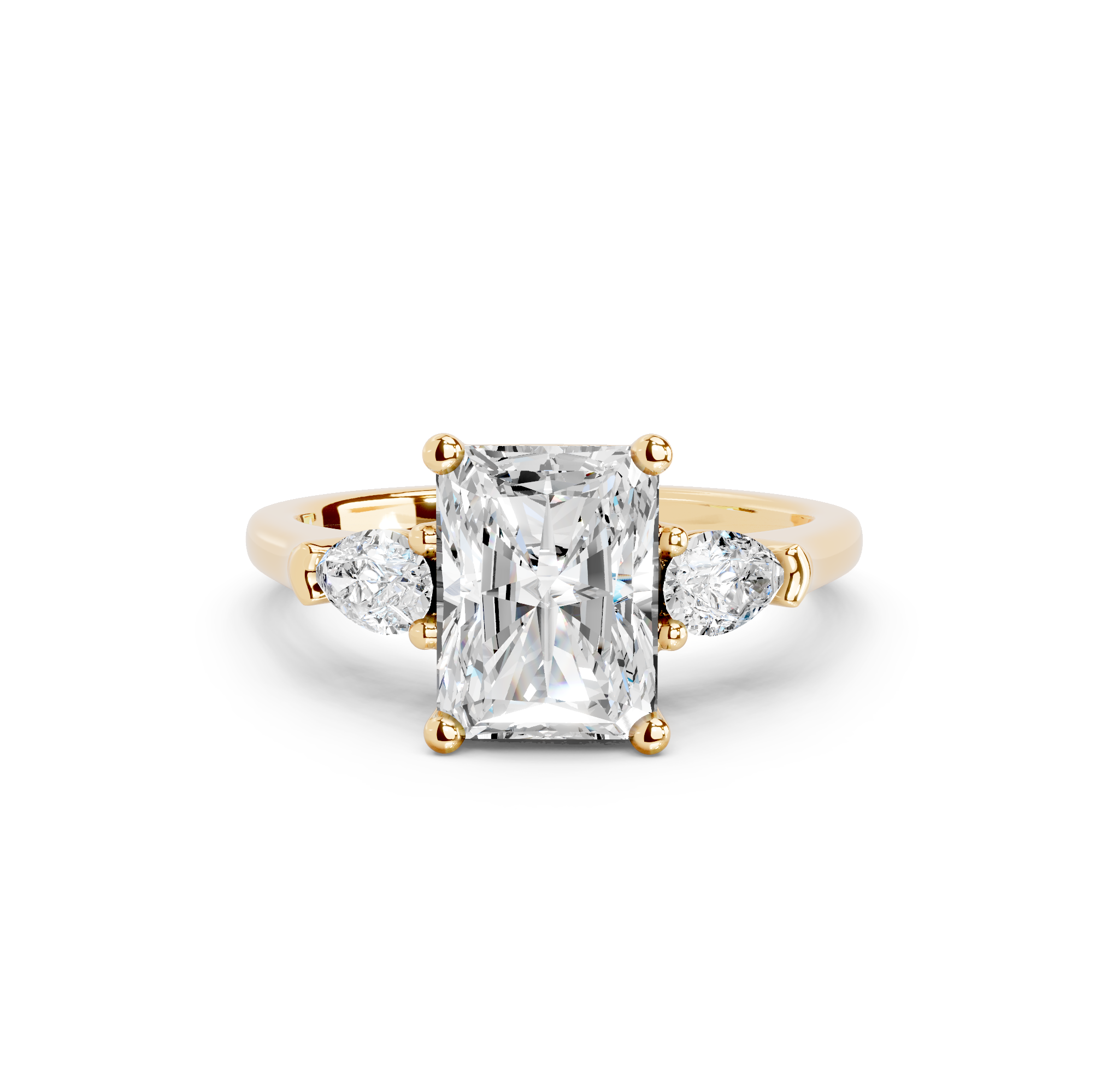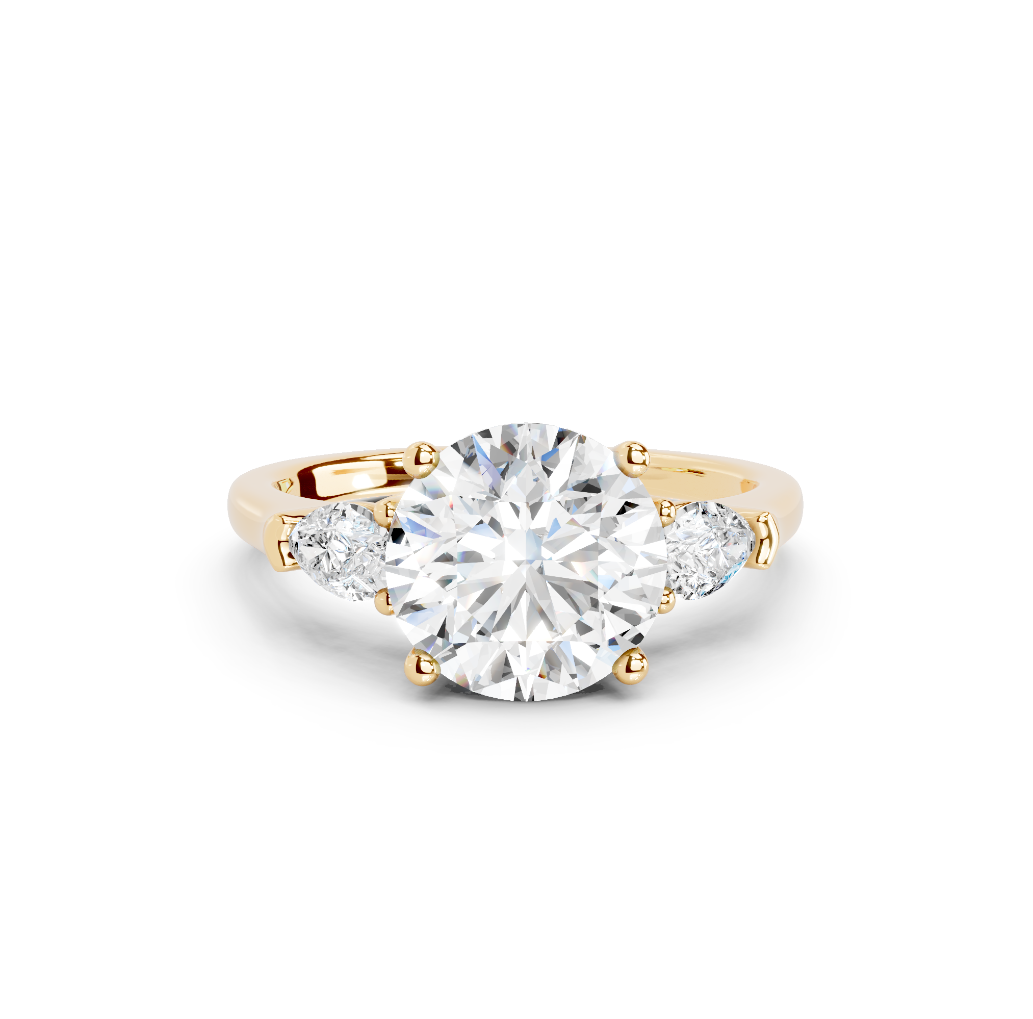 This three stone cathedral engagement ring has a center diamond flanked by two pear-cut side stones that create a symmetrical design. The cathedral setting elevates all three diamonds above the band, allowing light to shine from beneath. The raised mounting makes the ring feel larger and more exquisite.