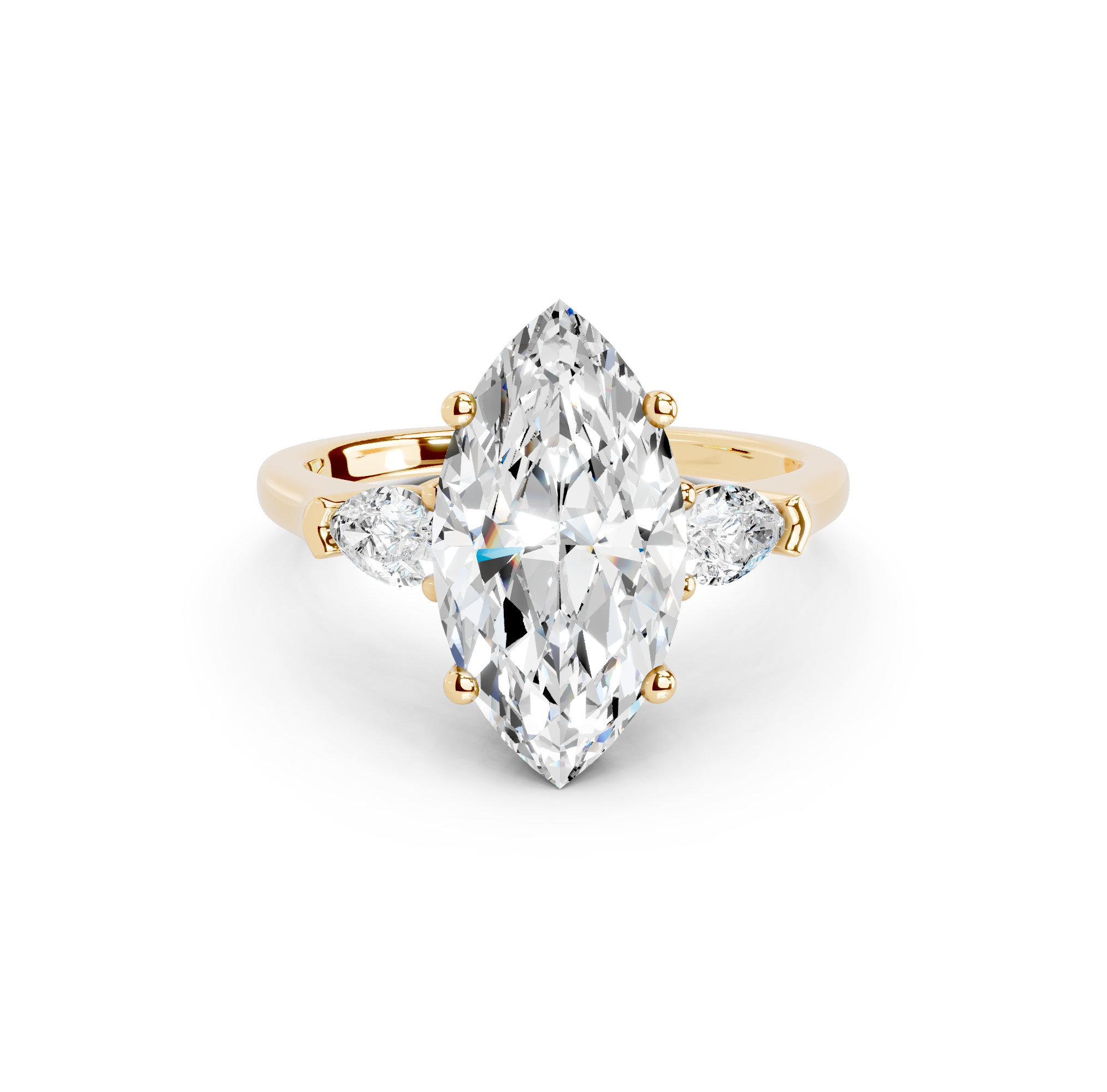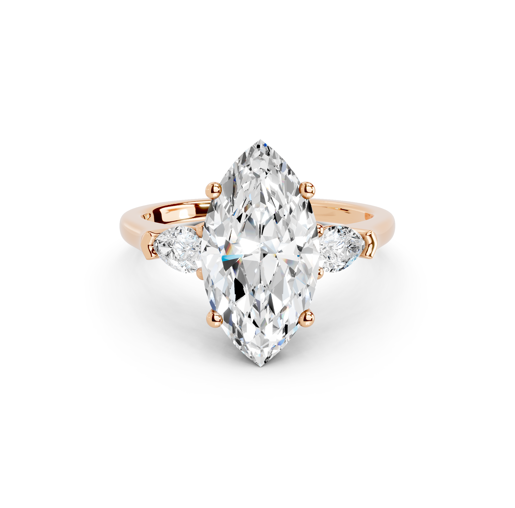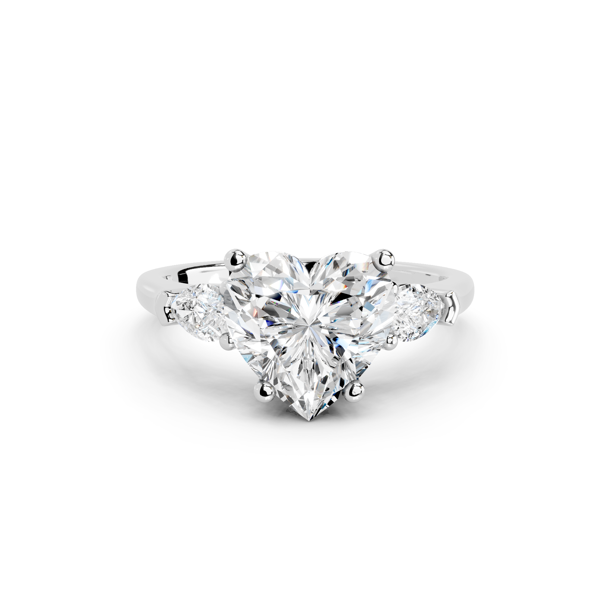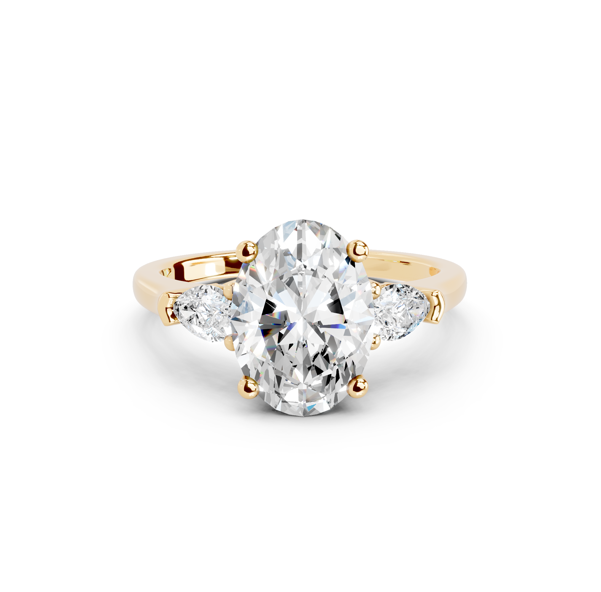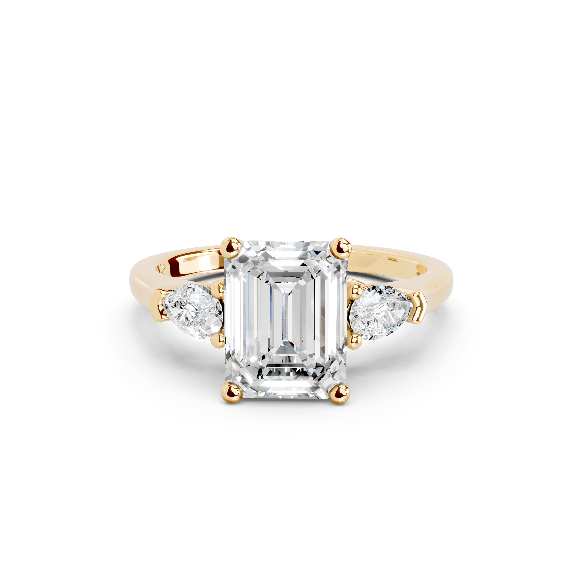 This three stone cathedral engagement ring has a center diamond flanked by two pear-cut side stones that create a symmetrical design. The cathedral setting elevates all three diamonds above the band, allowing light to shine from beneath. The raised mounting makes the ring feel larger and more exquisite.