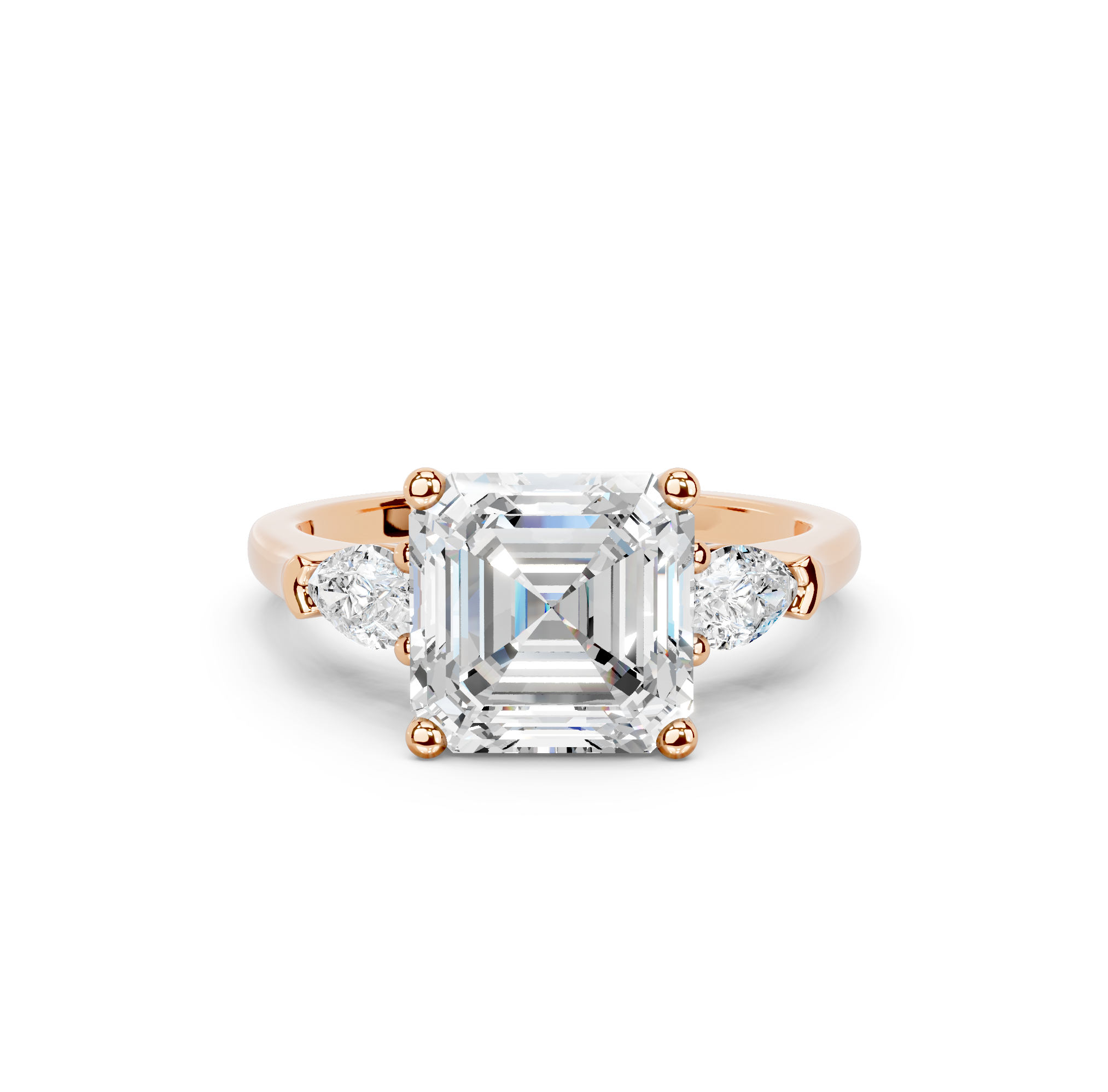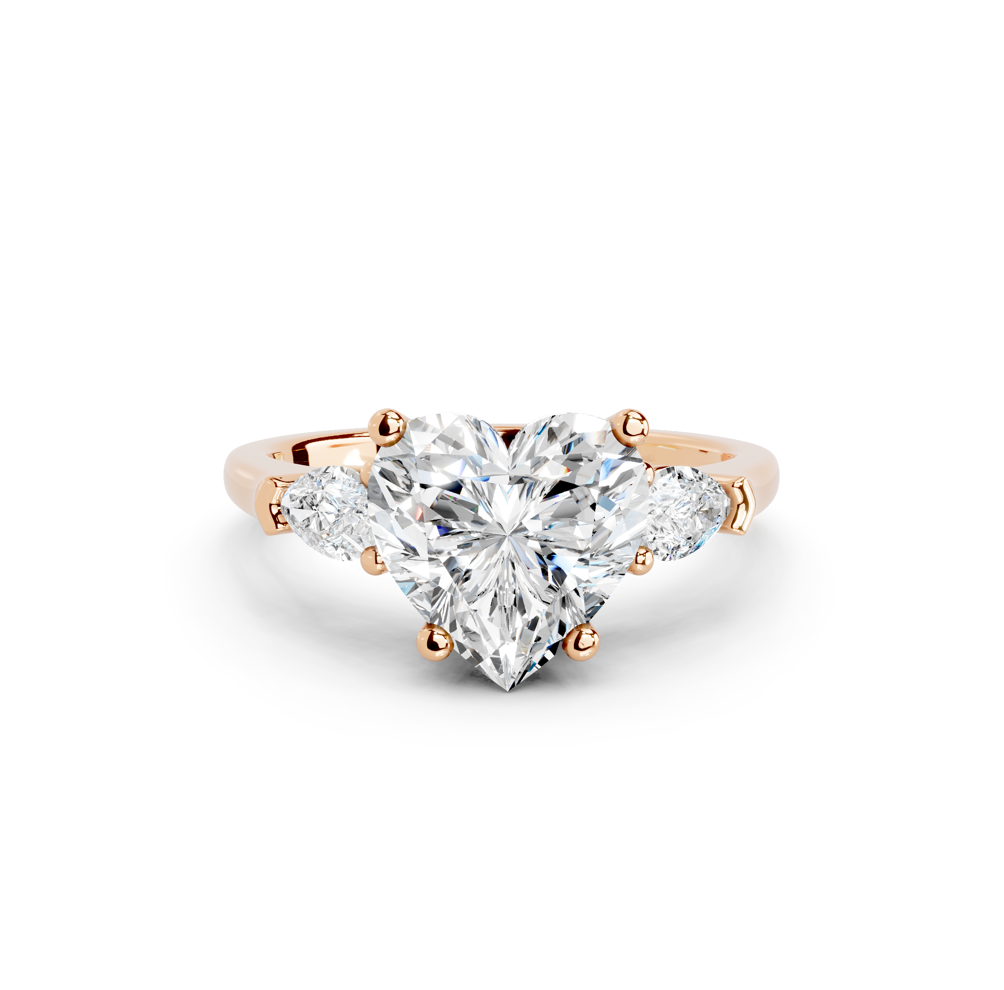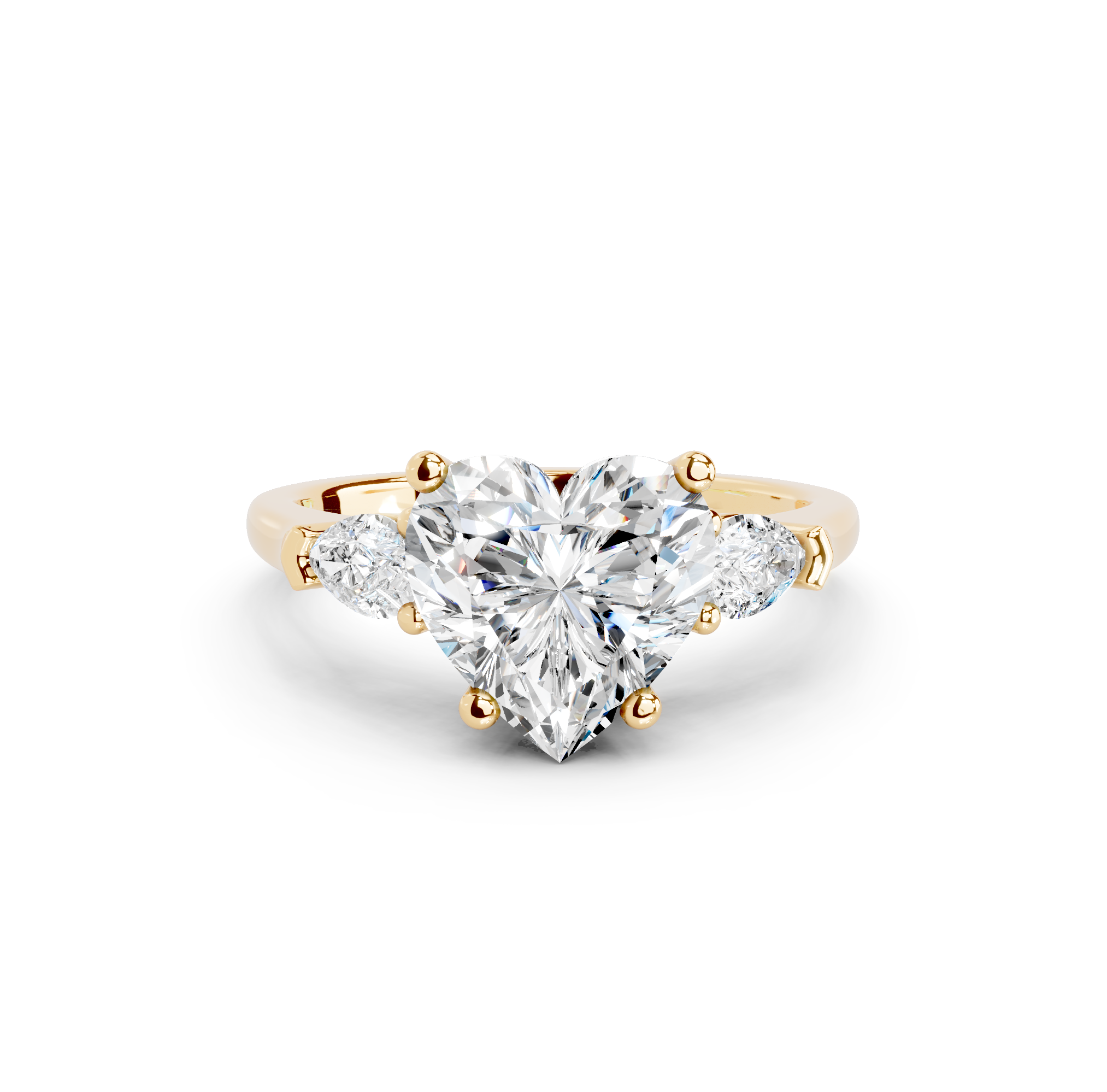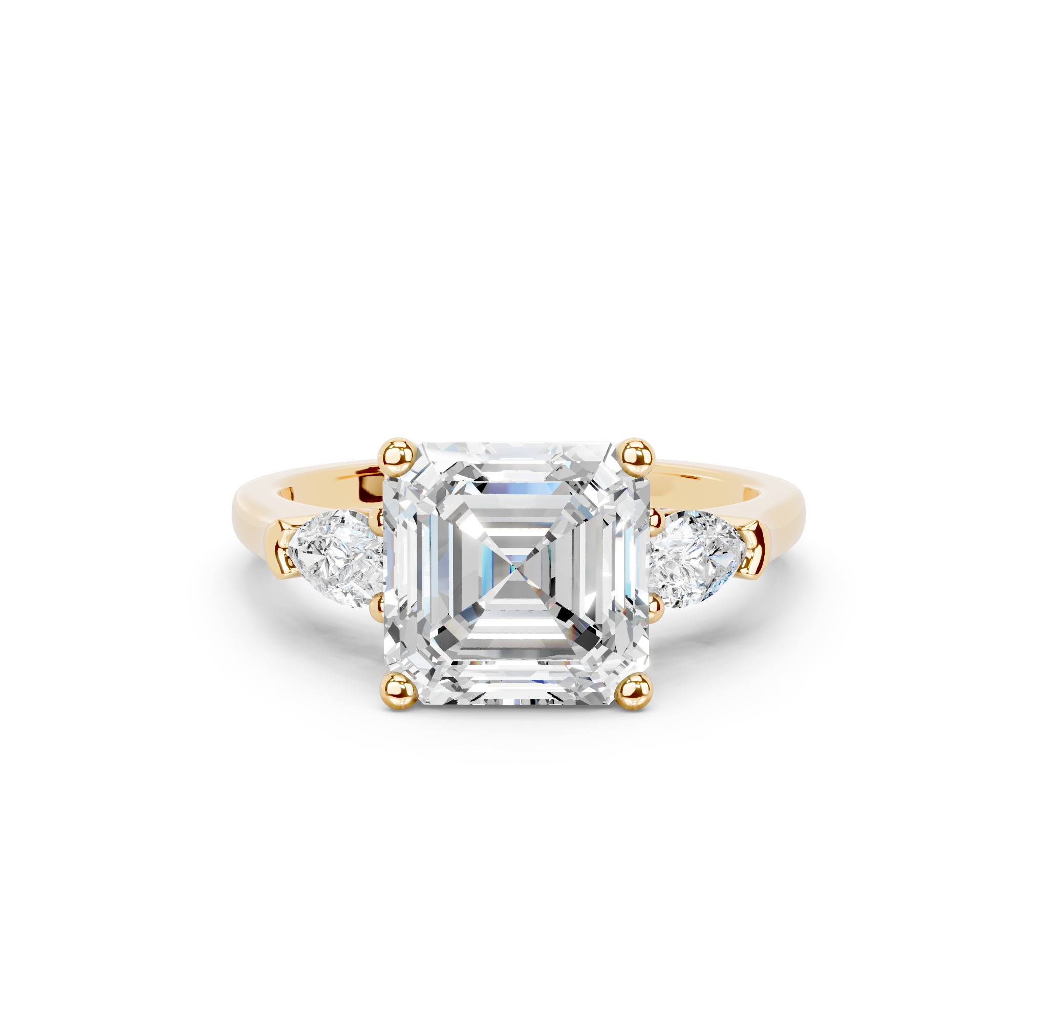 This three stone cathedral engagement ring has a center diamond flanked by two pear-cut side stones that create a symmetrical design. The cathedral setting elevates all three diamonds above the band, allowing light to shine from beneath. The raised mounting makes the ring feel larger and more exquisite.