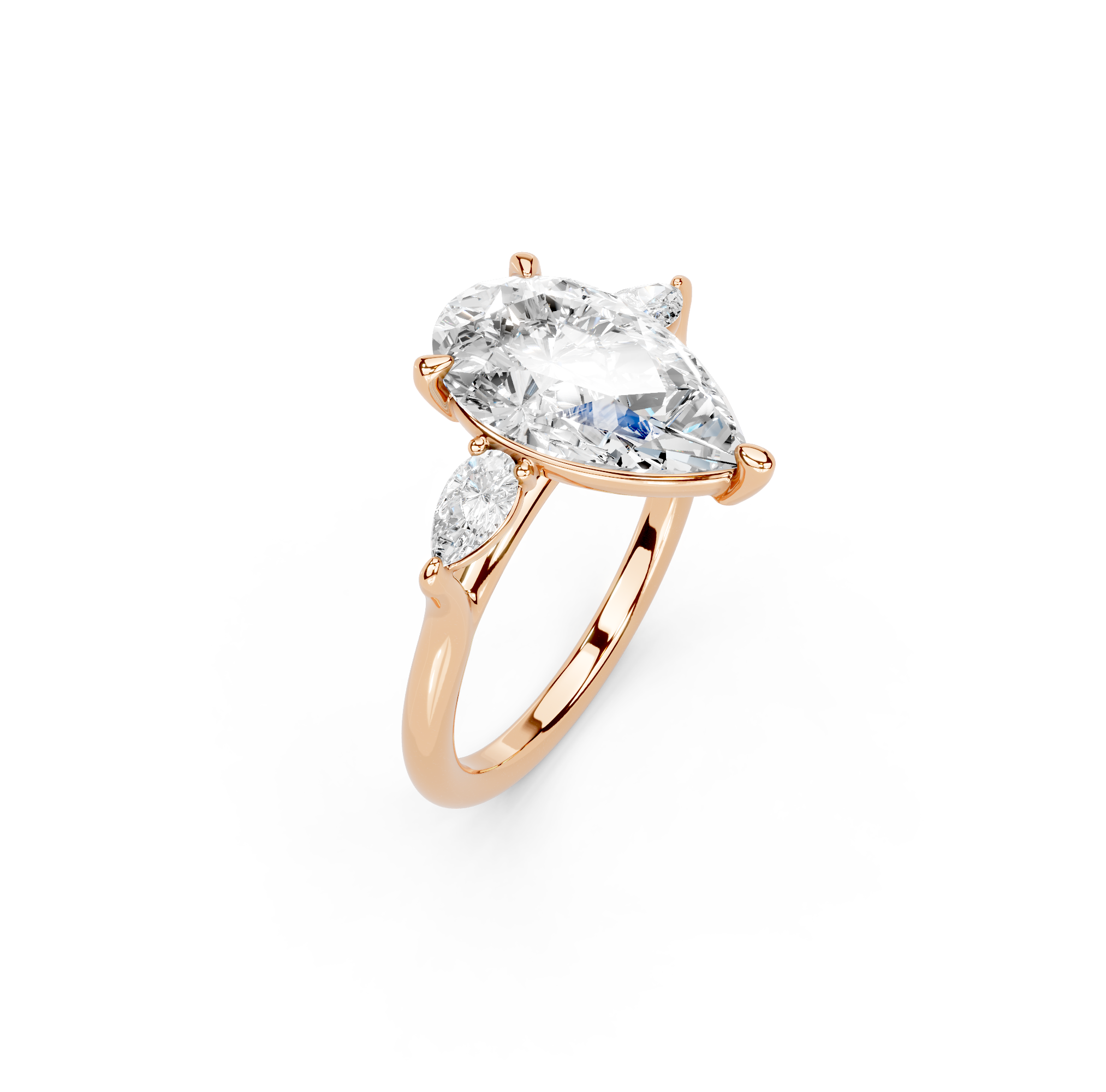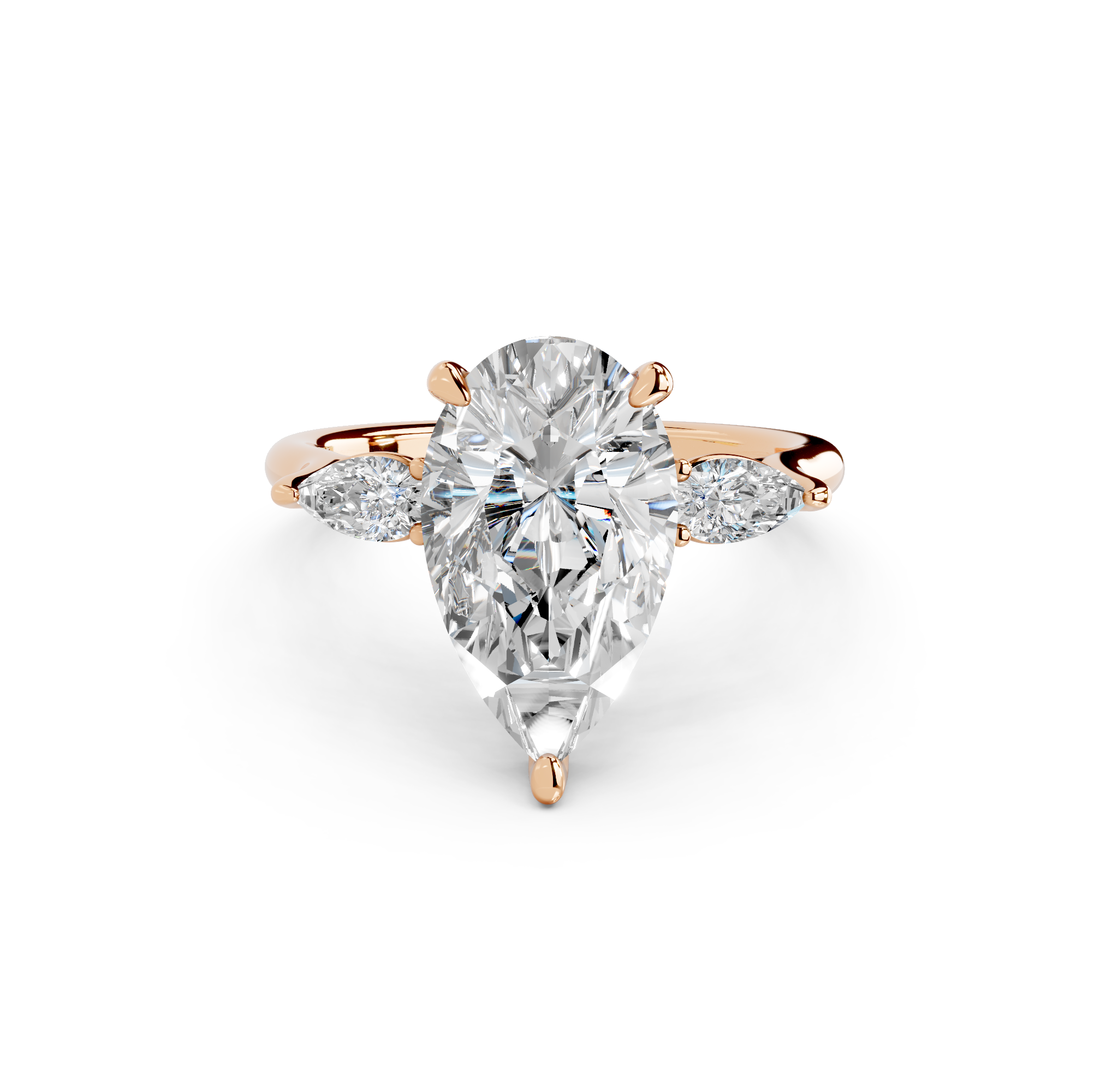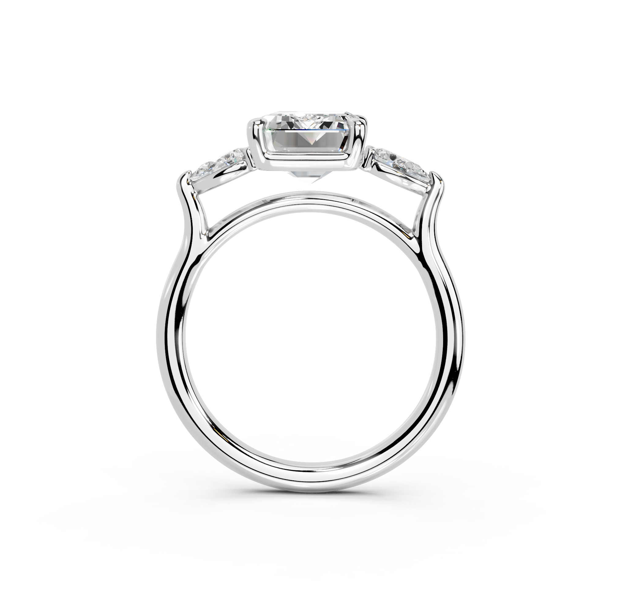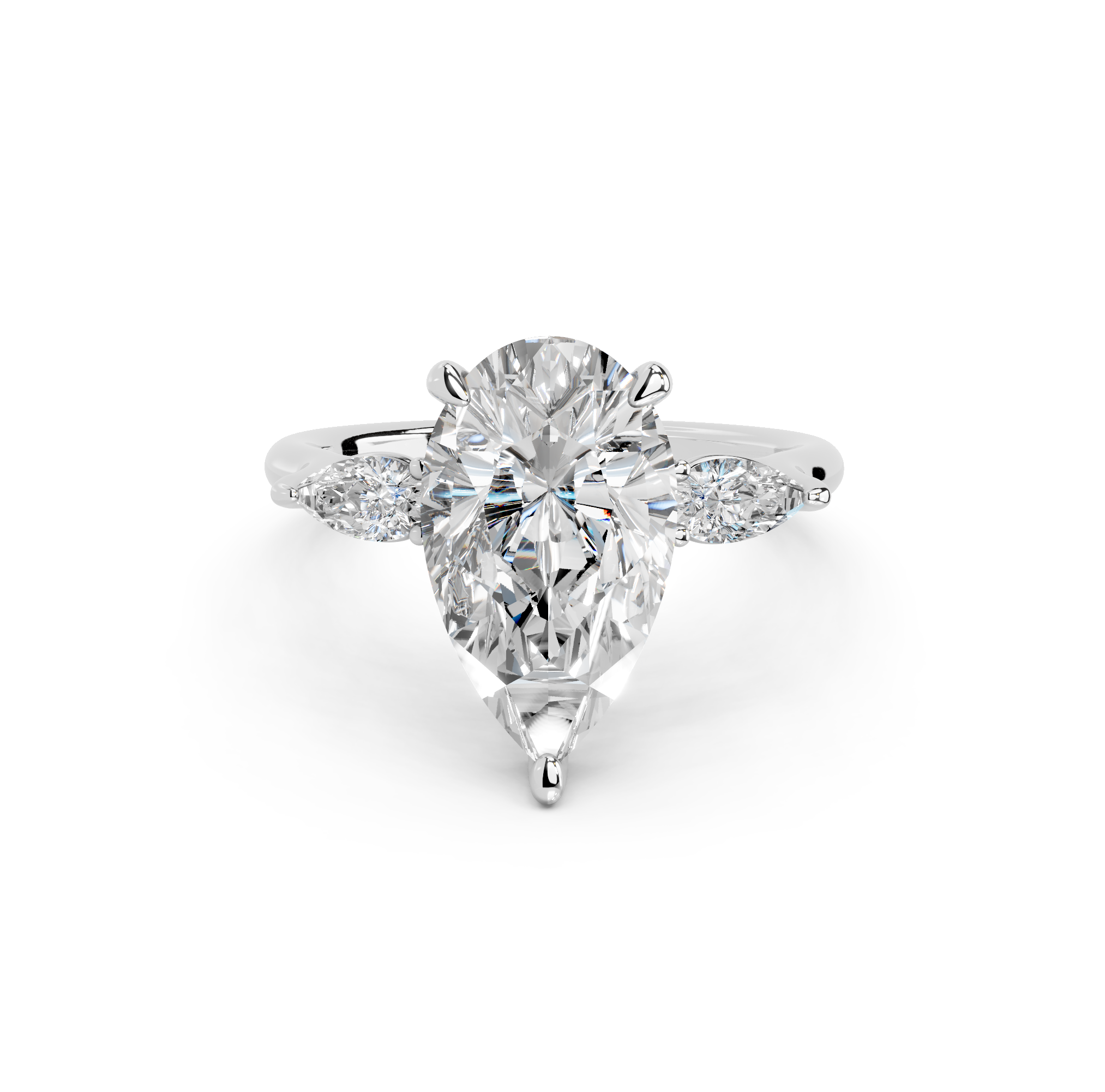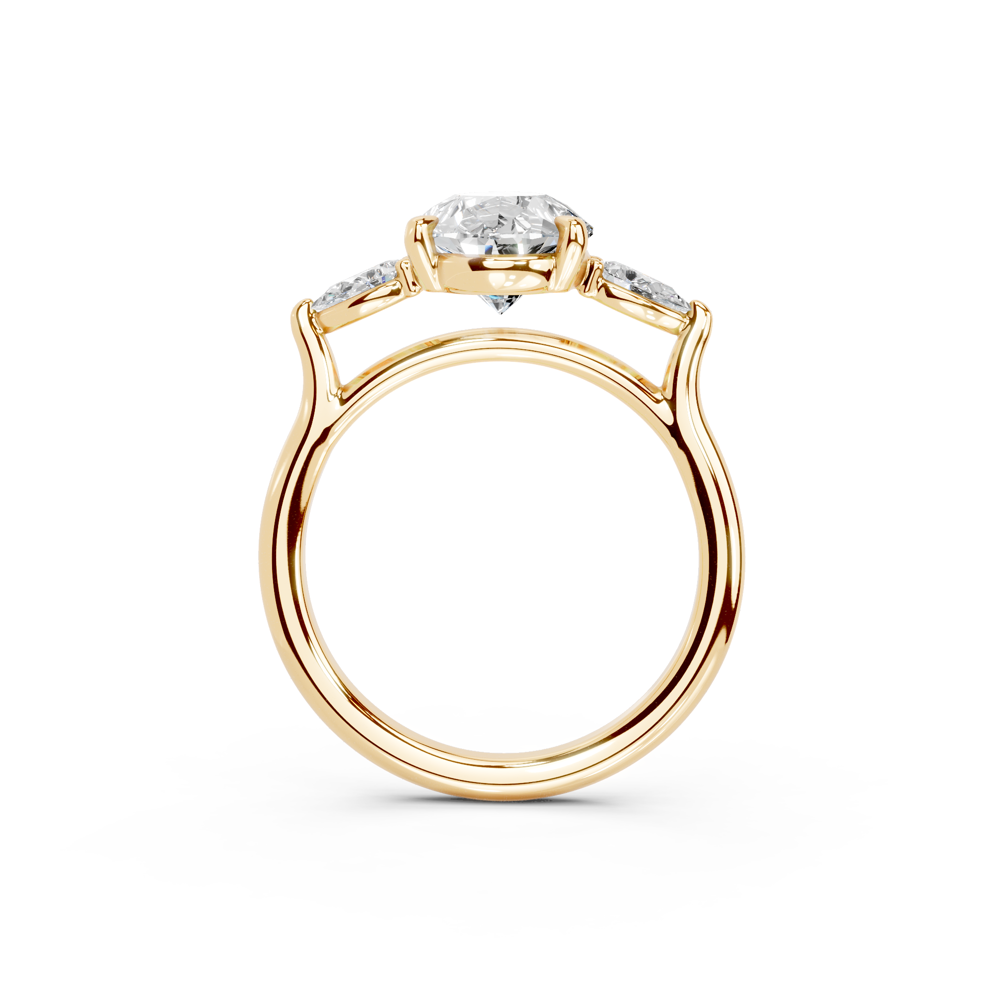 The center diamond of your choosing, plus two romantic pear-cut side stones each represent a chapter in your journey with your loved one. What makes the Bella truly unique is how these diamonds seem to float: the elegant cathedral setting holds each stone high above the band, creating that airy, suspended effect.