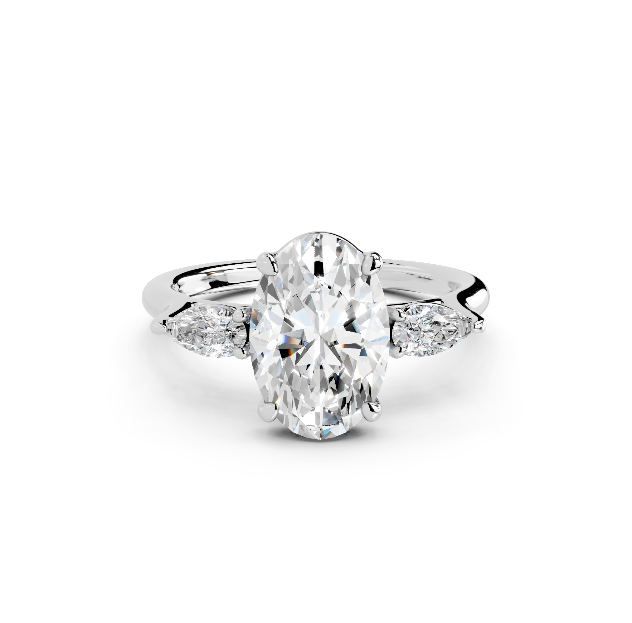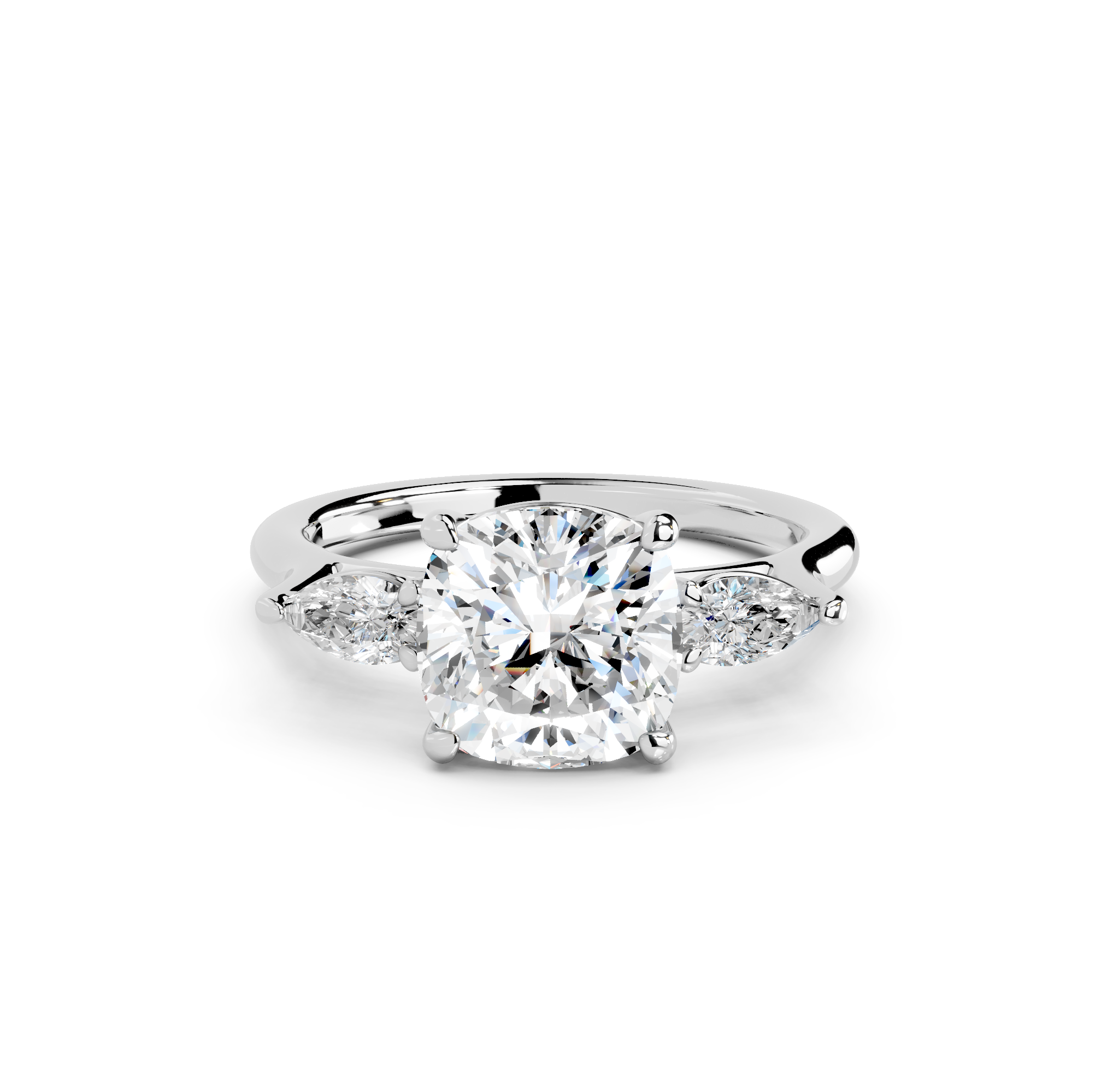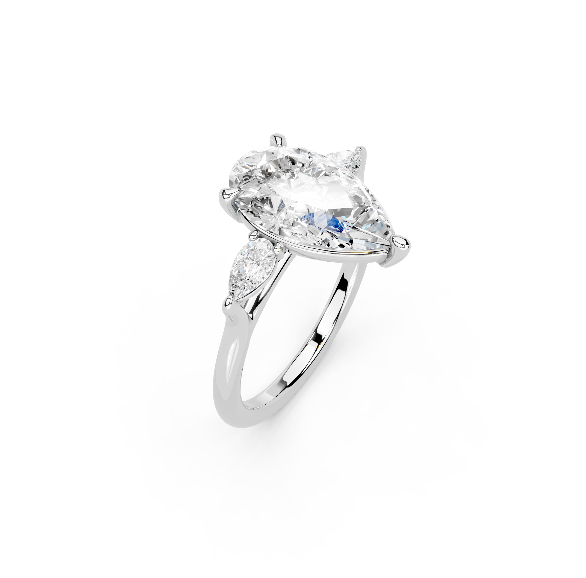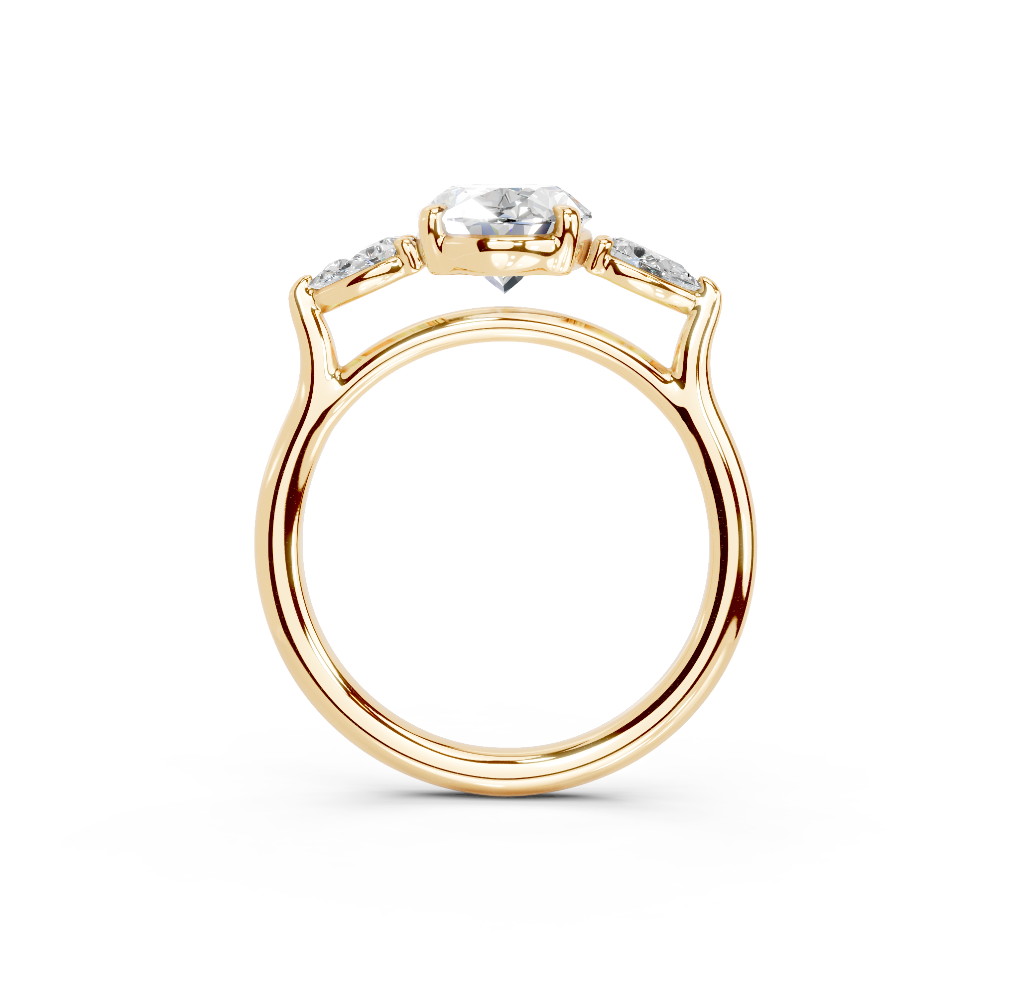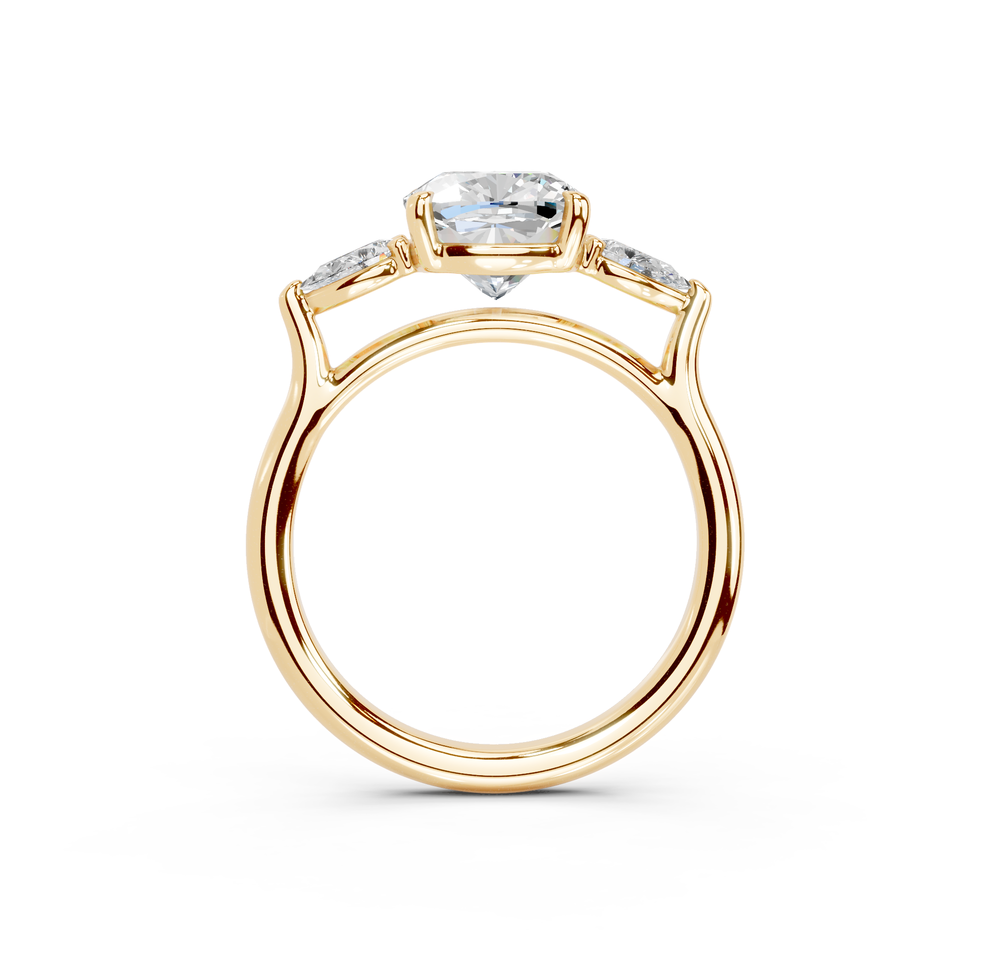 The center diamond of your choosing, plus two romantic pear-cut side stones each represent a chapter in your journey with your loved one. What makes the Bella truly unique is how these diamonds seem to float: the elegant cathedral setting holds each stone high above the band, creating that airy, suspended effect.