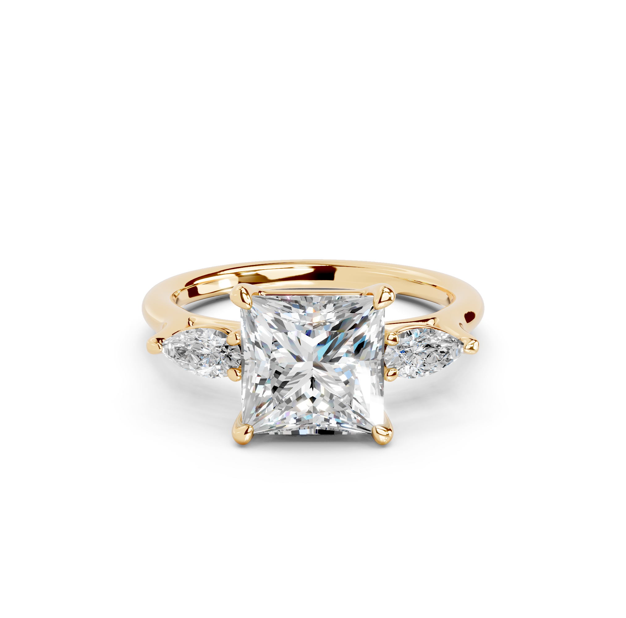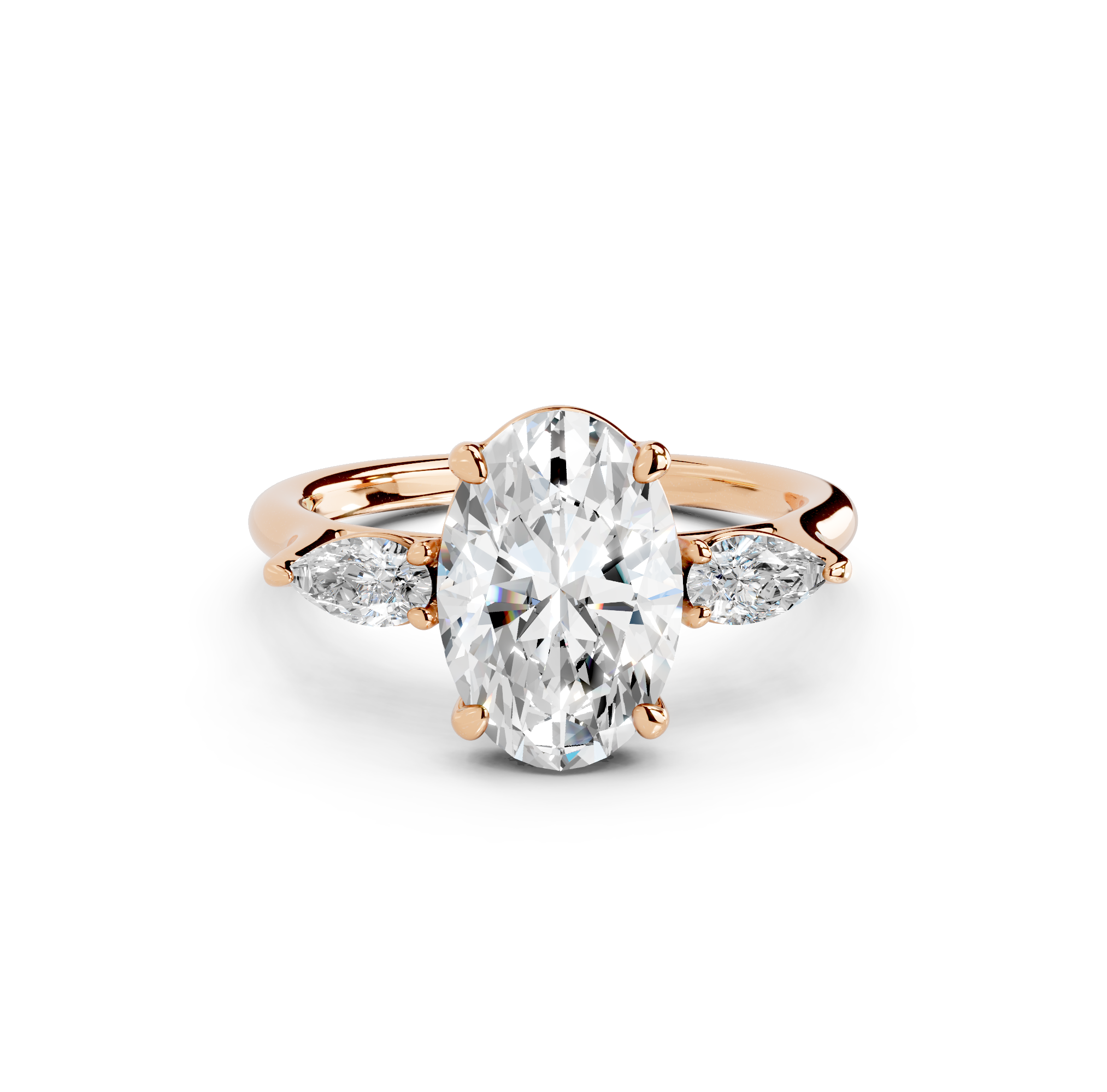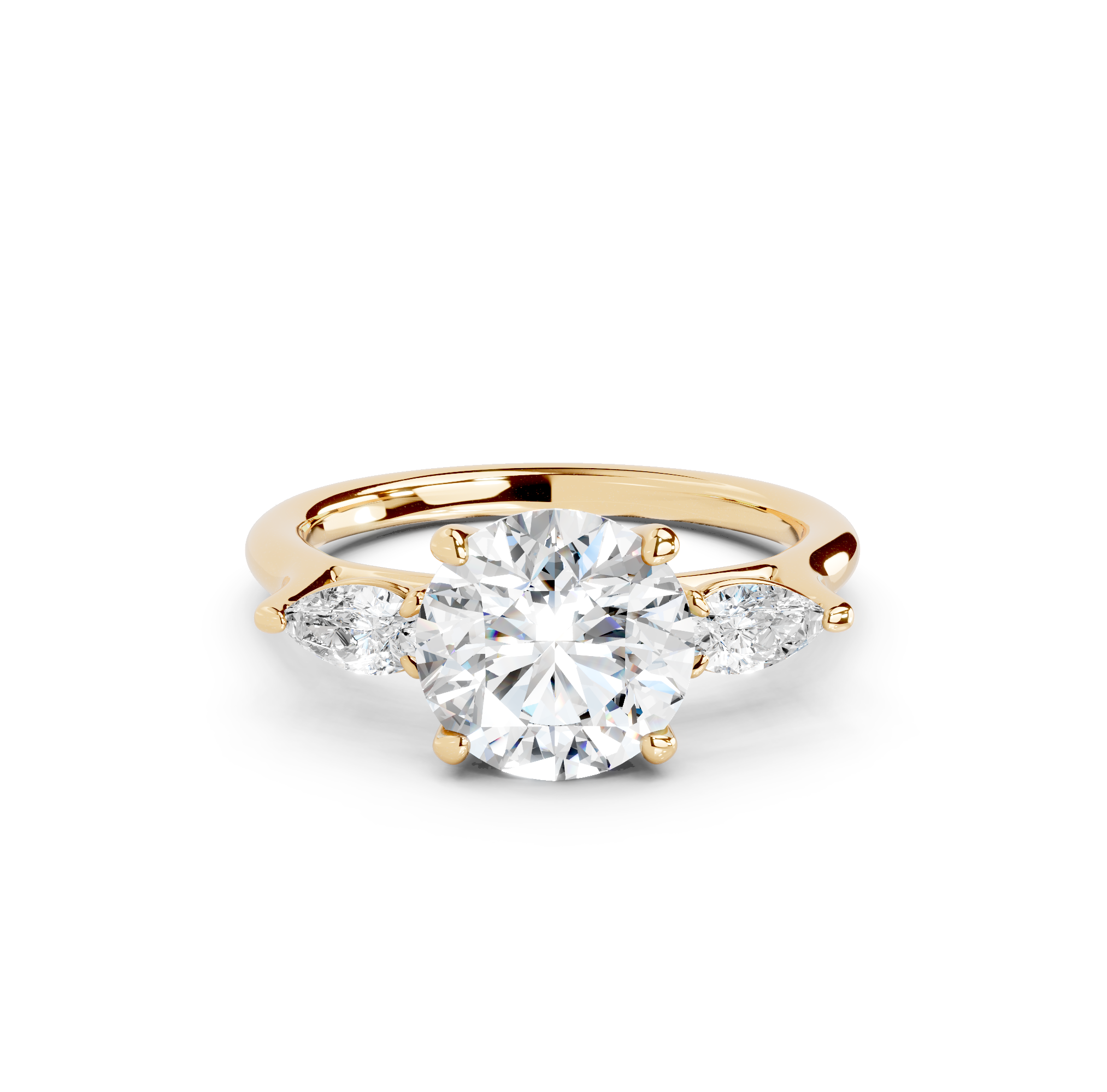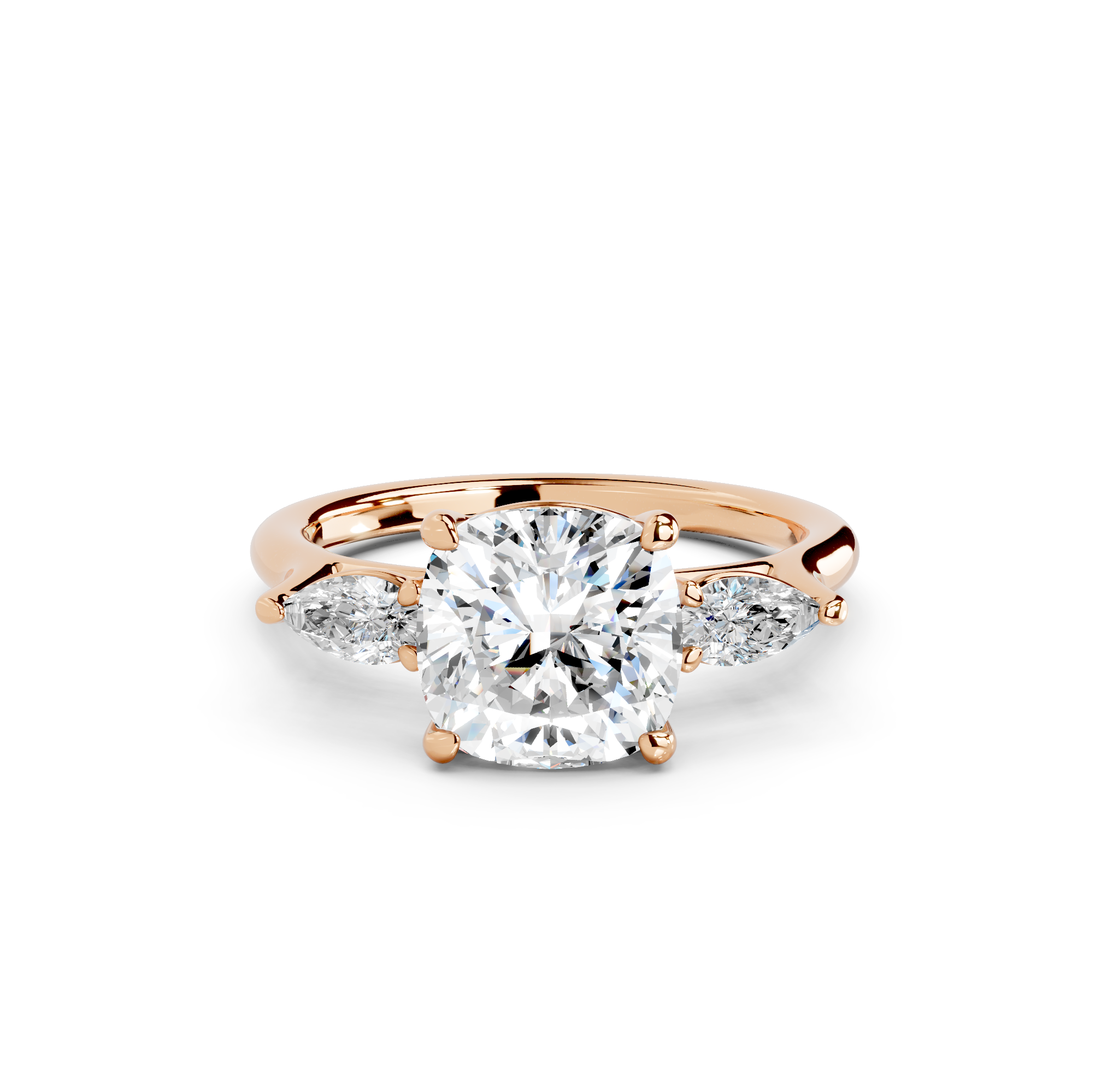The center diamond of your choosing, plus two romantic pear-cut side stones each represent a chapter in your journey with your loved one. What makes the Bella truly unique is how these diamonds seem to float: the elegant cathedral setting holds each stone high above the band, creating that airy, suspended effect.