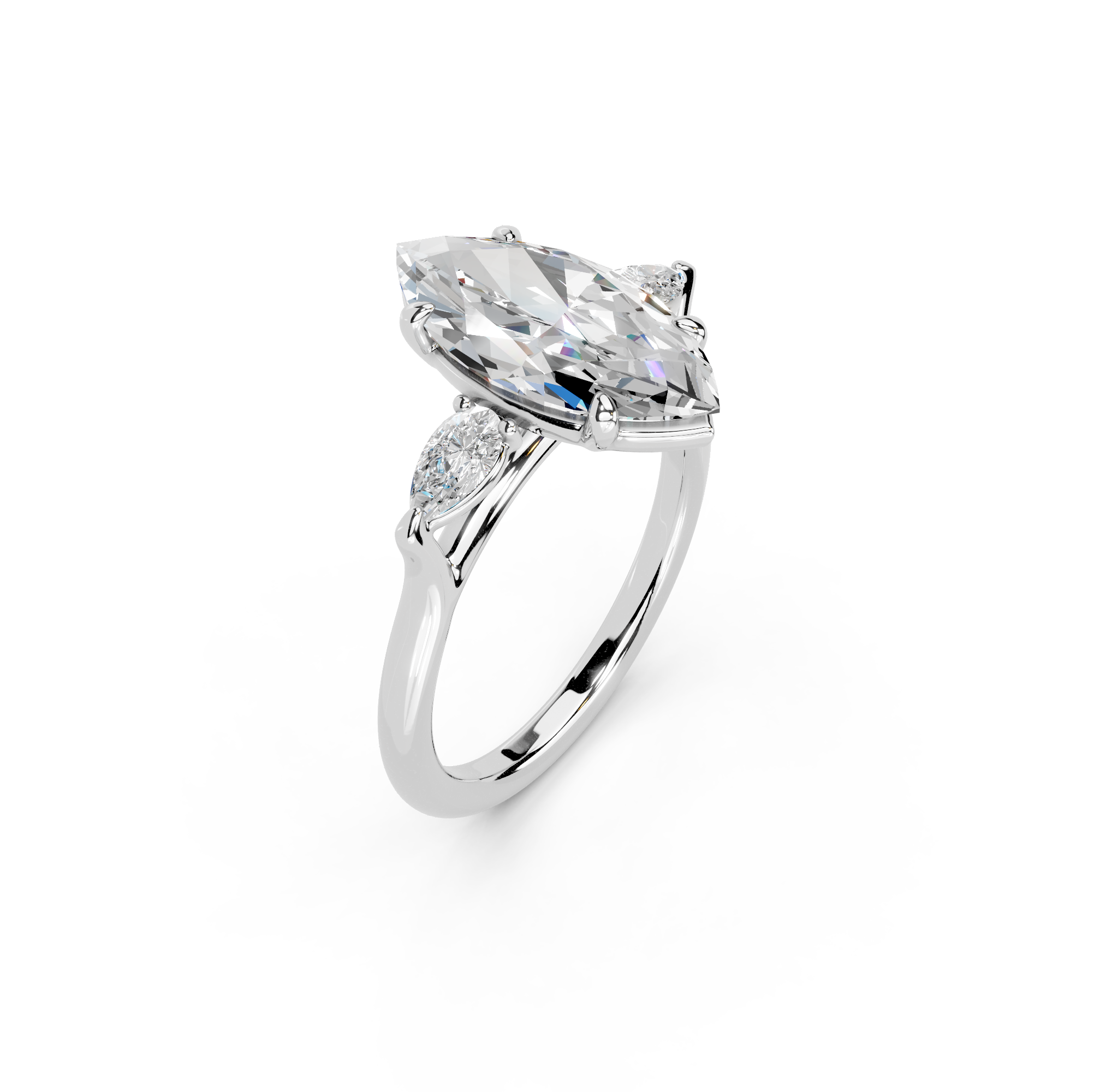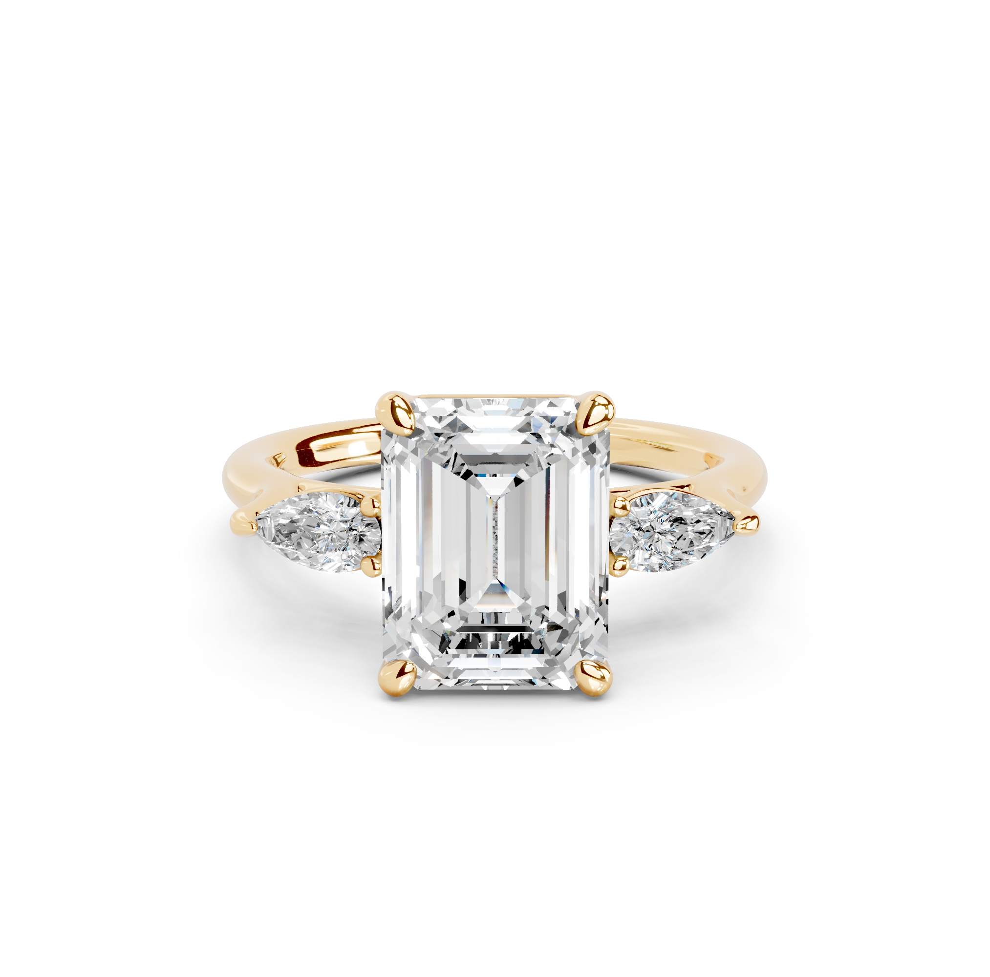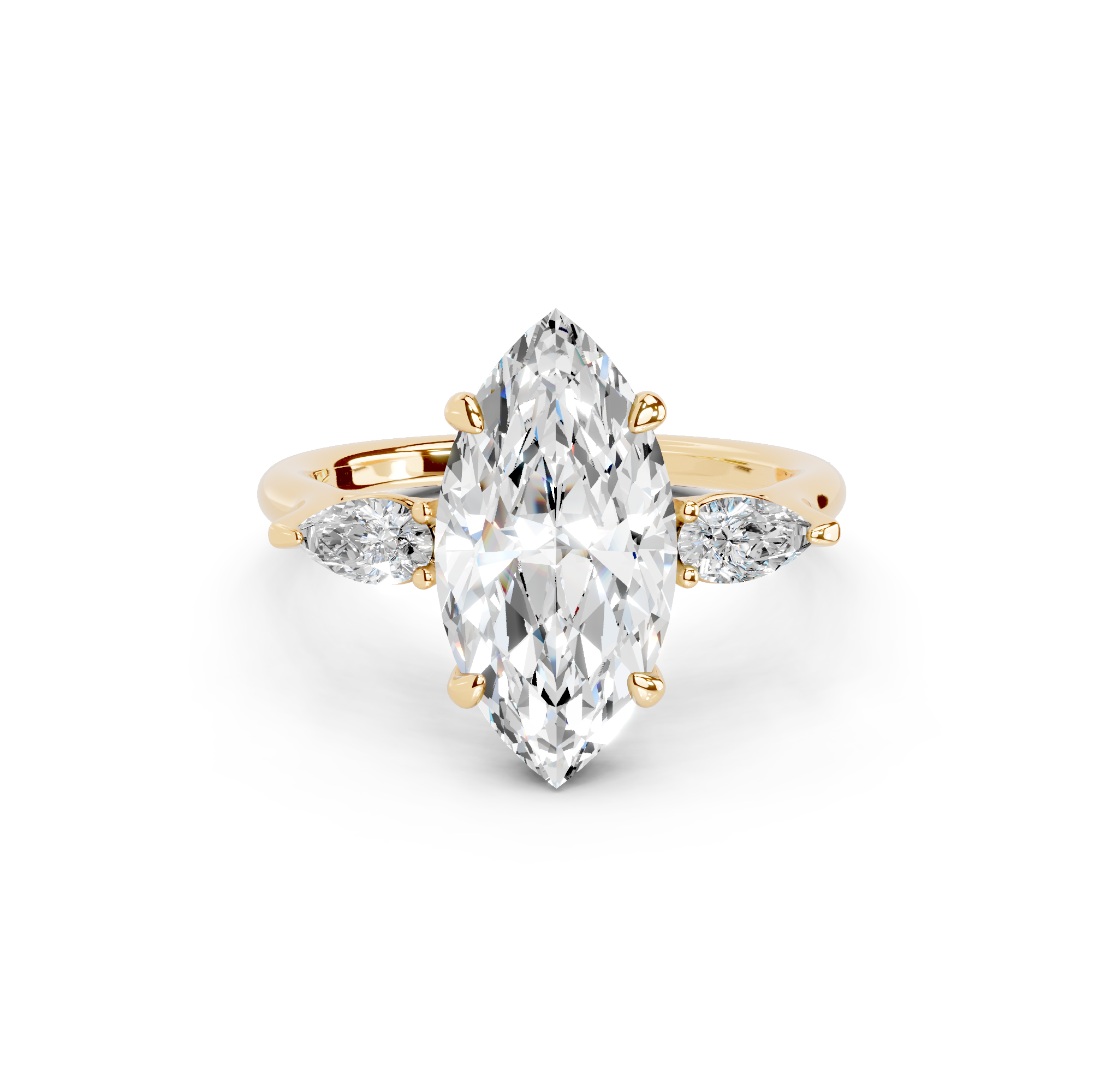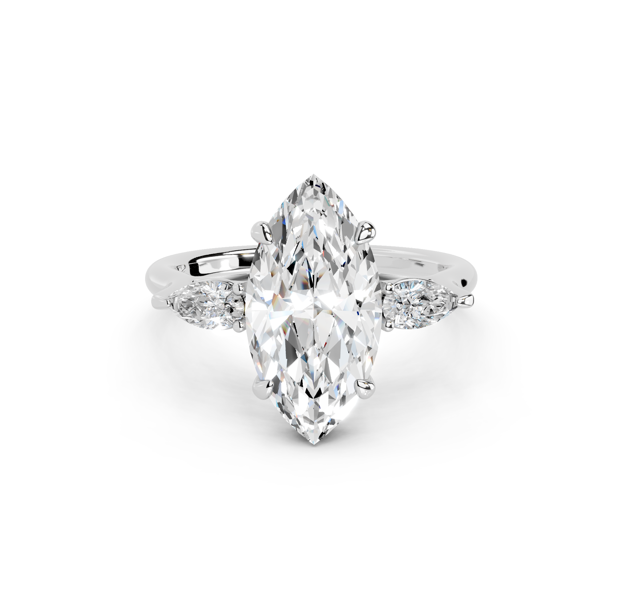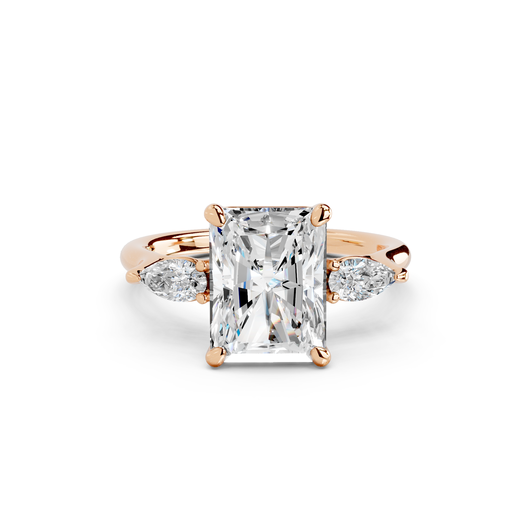 The center diamond of your choosing, plus two romantic pear-cut side stones each represent a chapter in your journey with your loved one. What makes the Bella truly unique is how these diamonds seem to float: the elegant cathedral setting holds each stone high above the band, creating that airy, suspended effect.