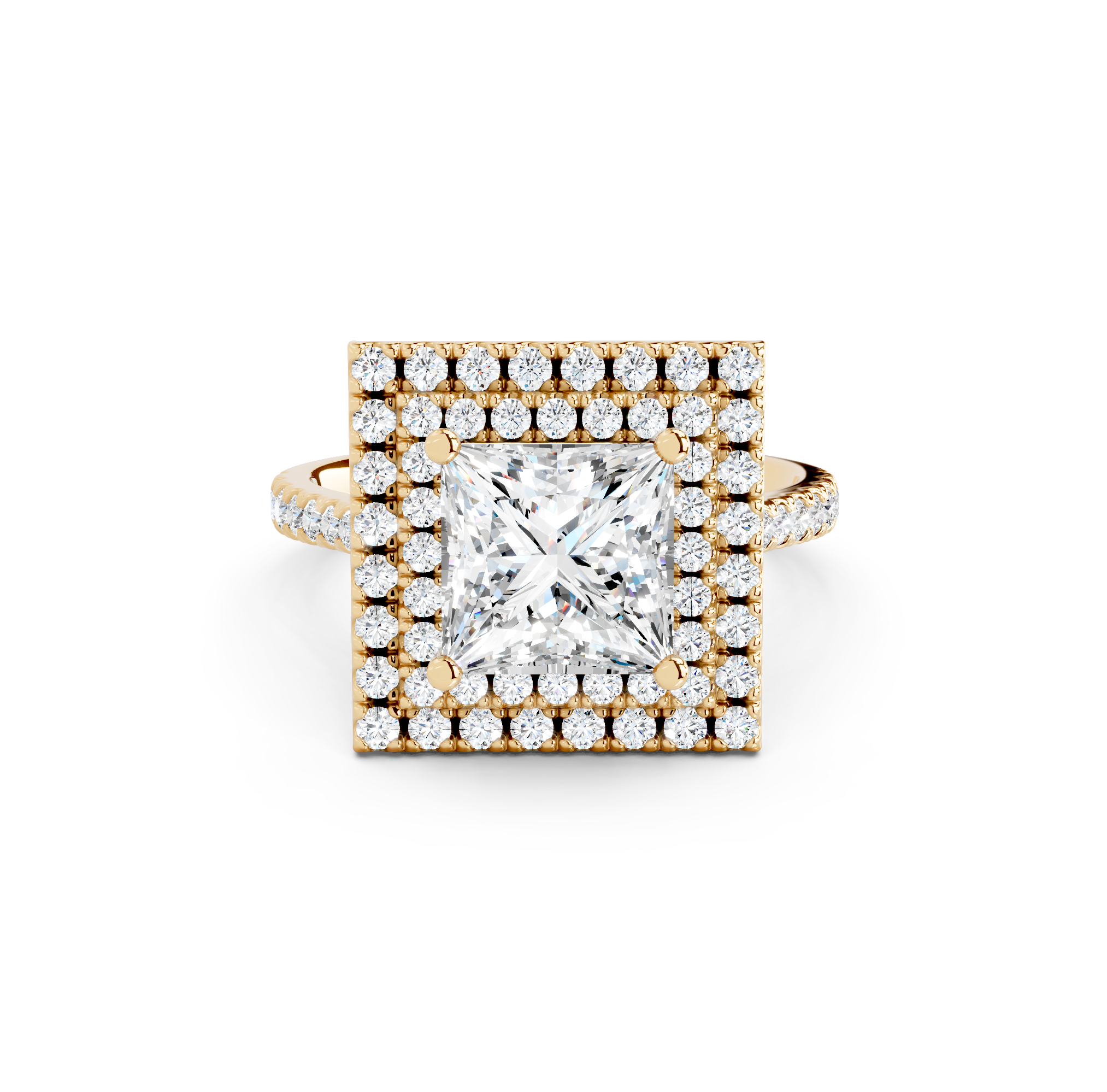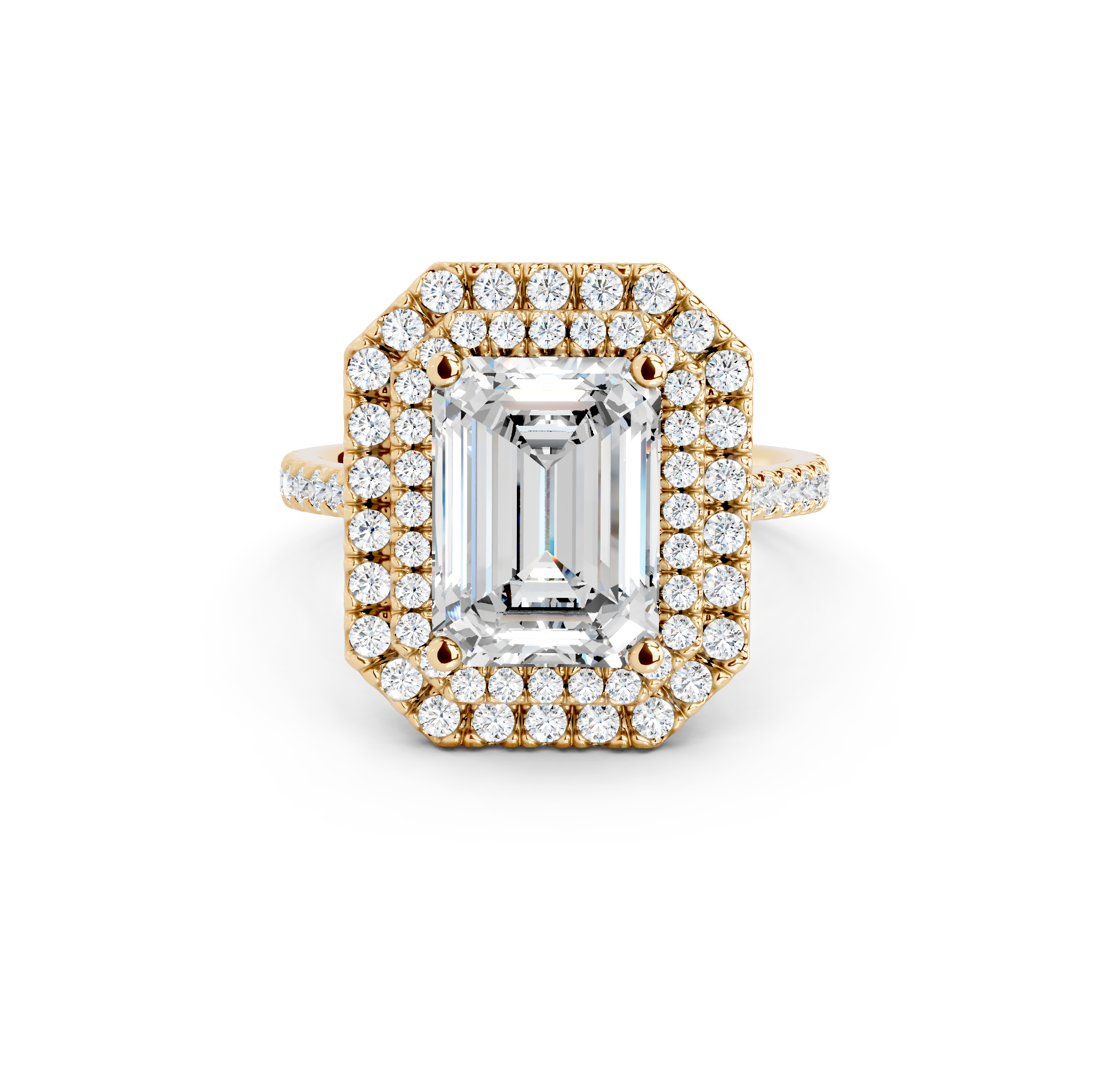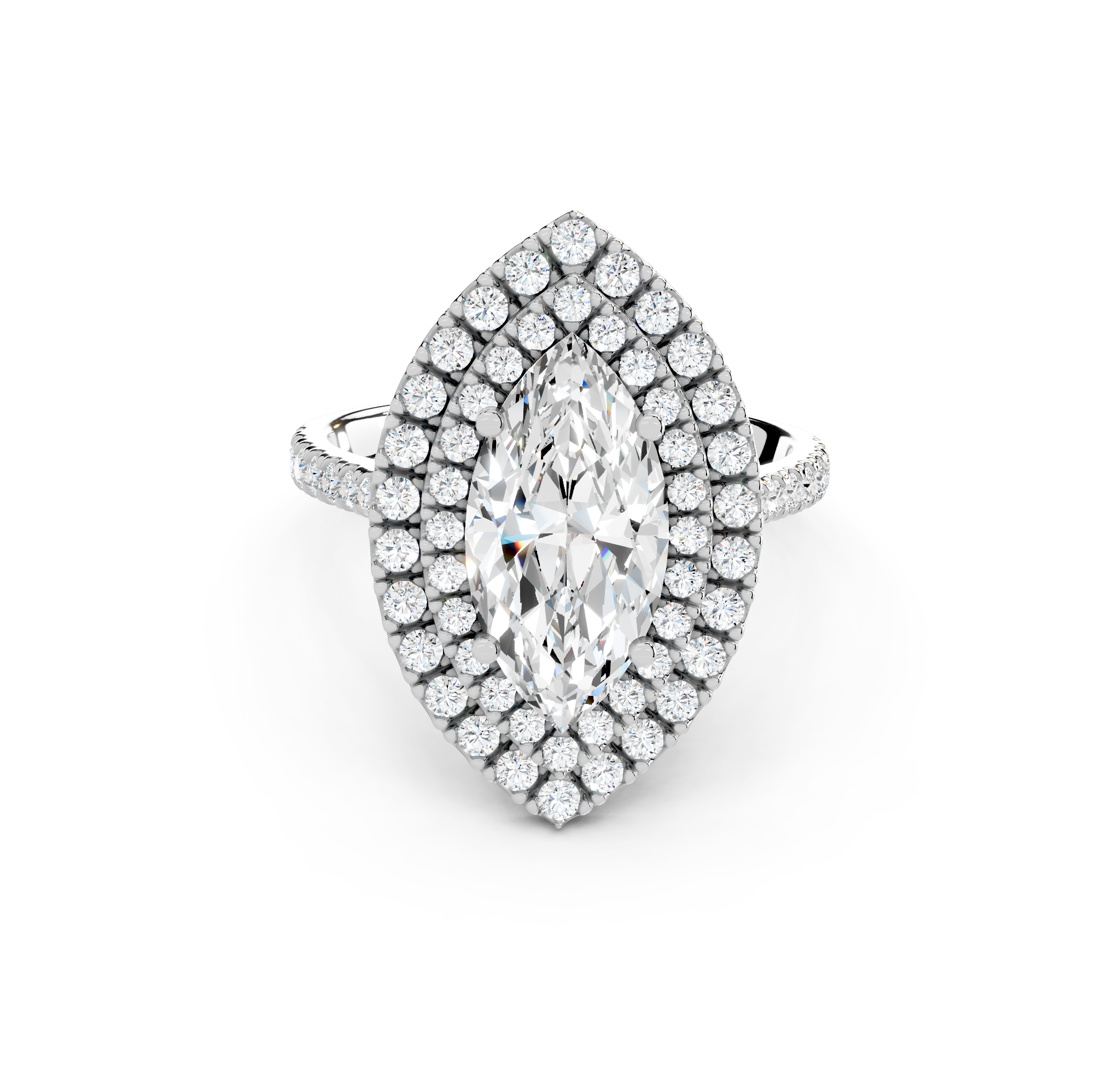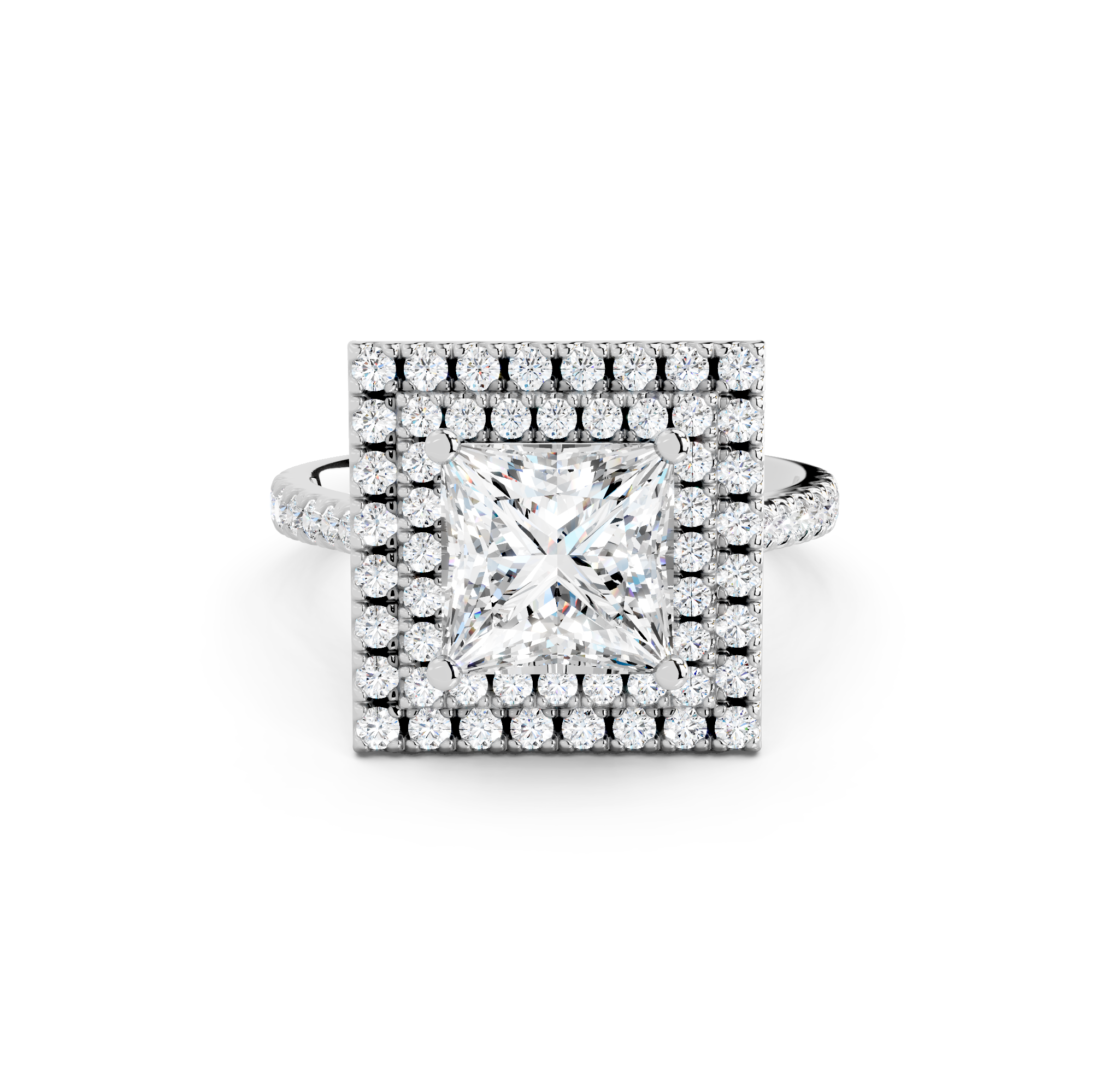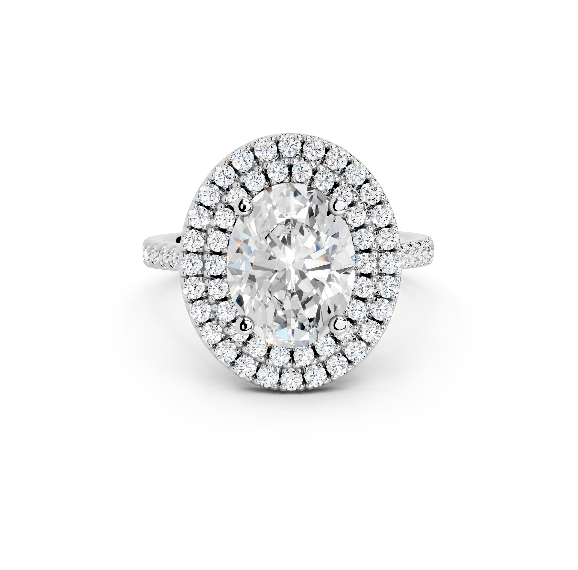 Her most captivating feature is the dazzling double halo—two circles of diamonds that embrace your chosen center stone for brilliance. Delicate pavé diamonds along the band guide the eye toward the center, while the elegant cathedral setting cradles the center diamond in a commanding yet graceful profile.