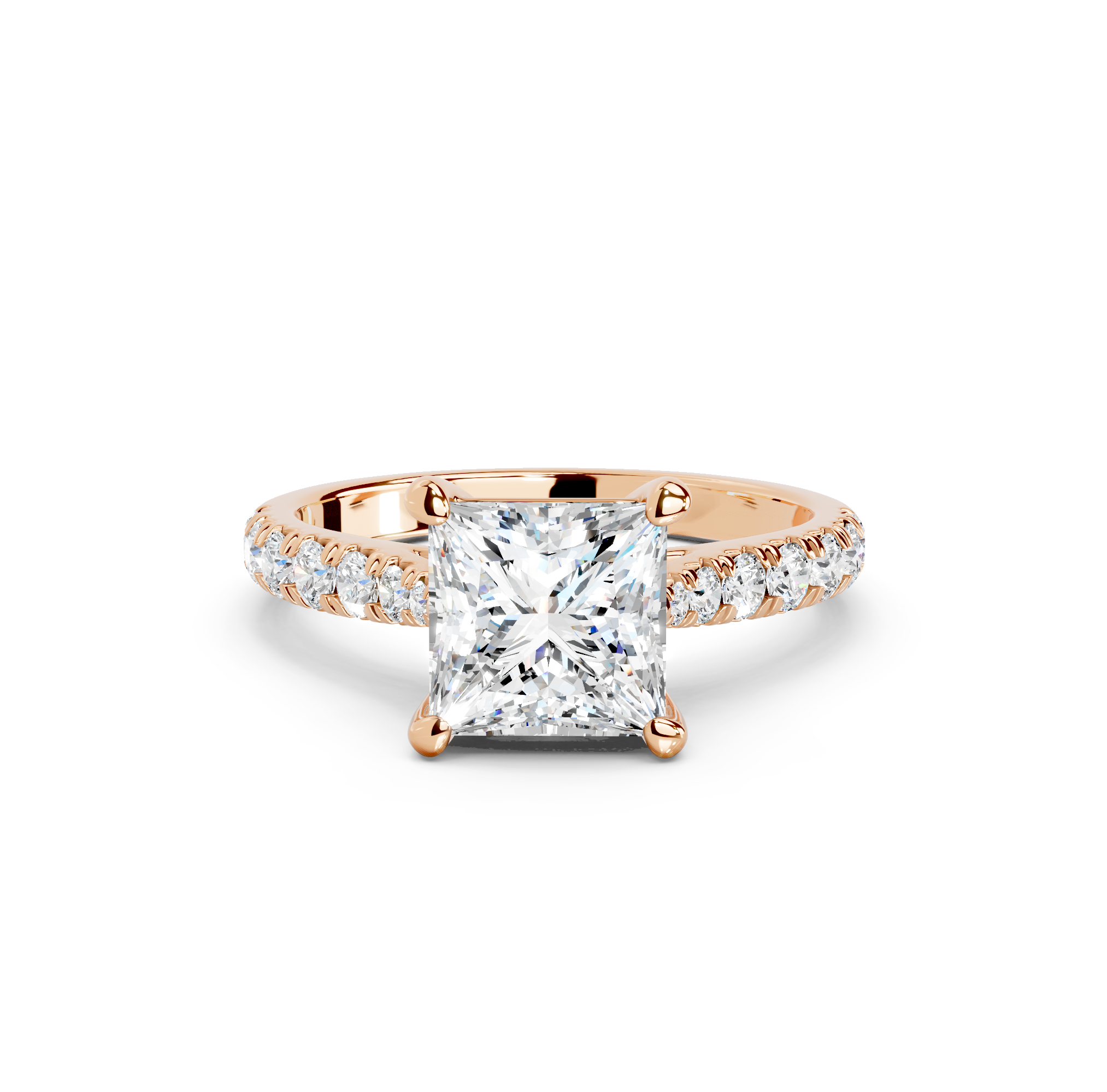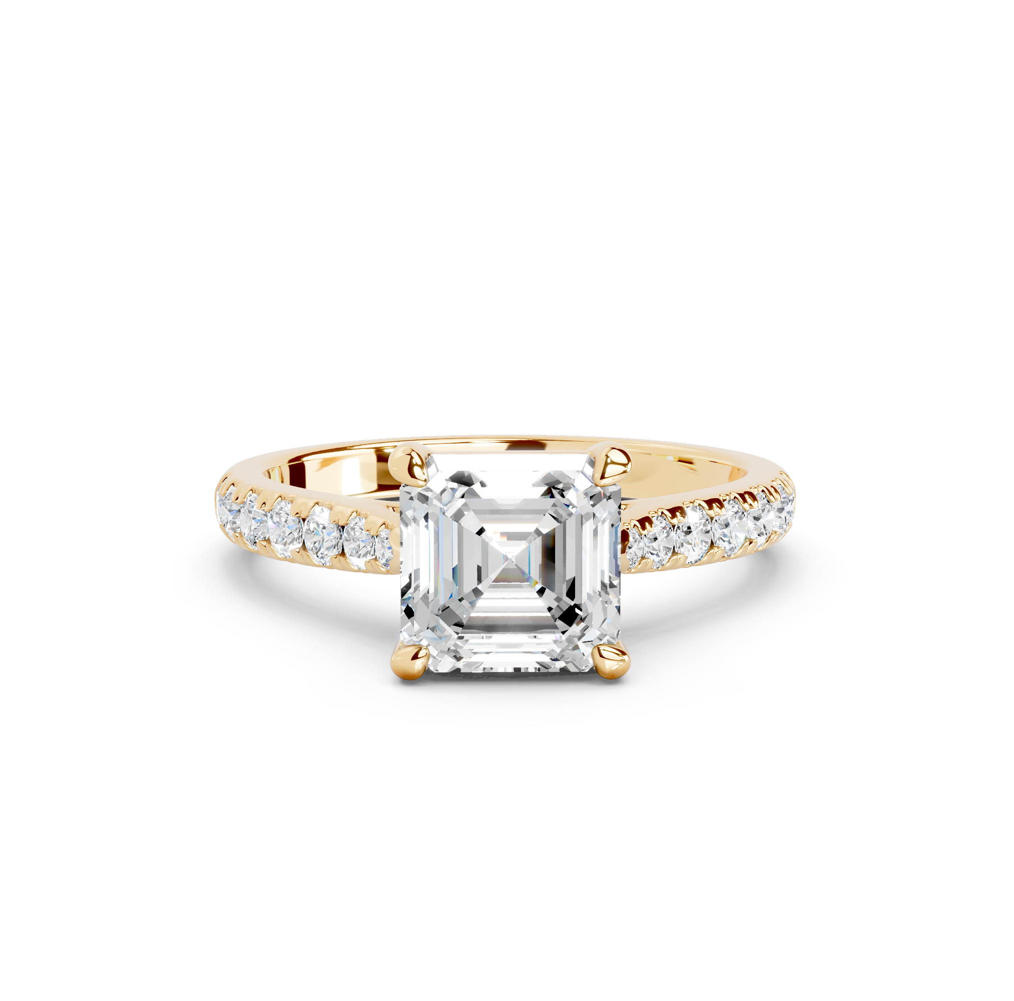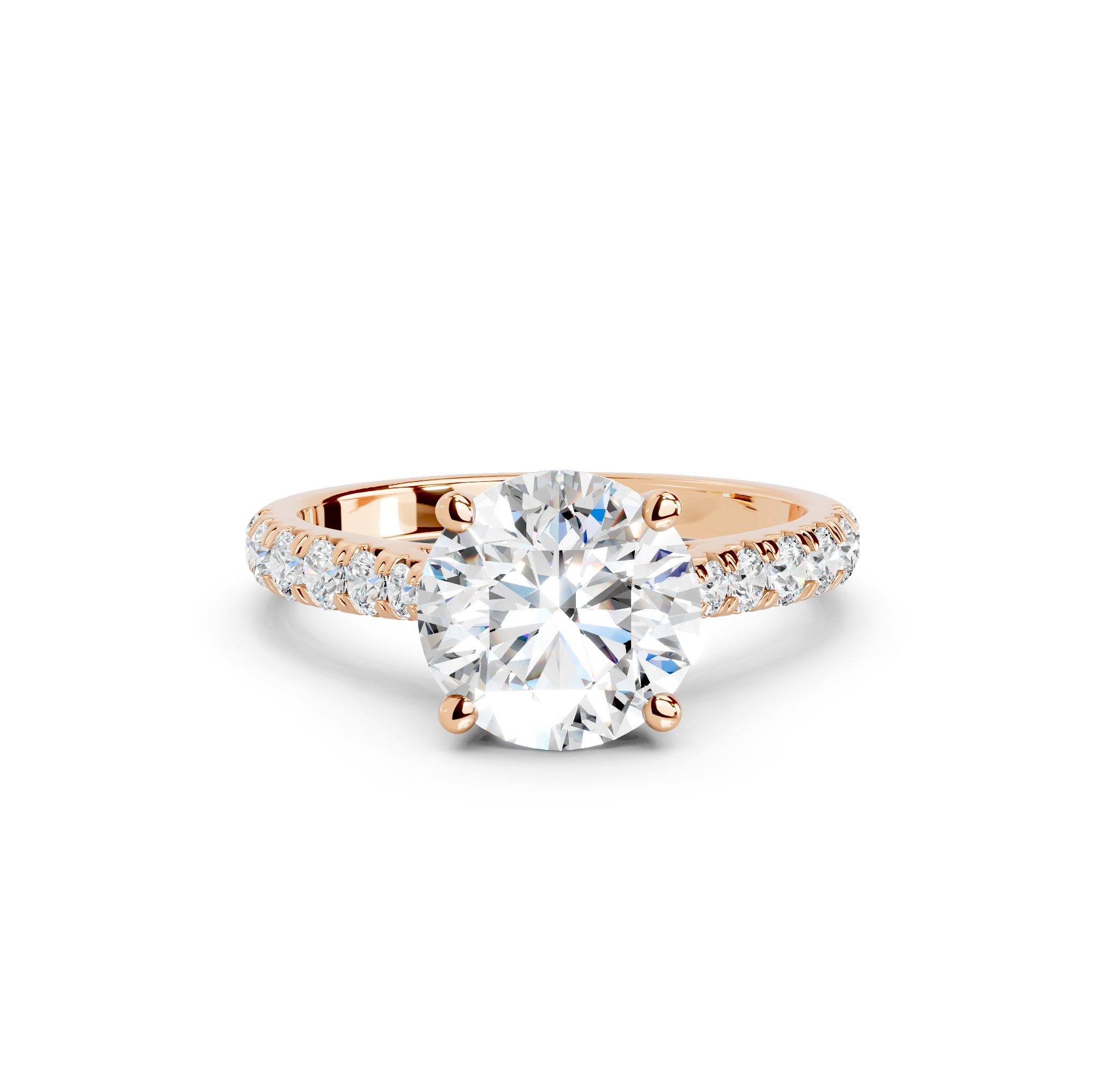 The Damaris features a classic pavé band that gracefully tapers toward the center stone, creating an elegant silhouette that draws the eye to the main diamond. The smaller diamonds set along the band catch and reflect light from every angle, adding brilliant sparkle that complements the center stone. The tapered design gives off a refined, sophisticated look that feels both contemporary and timeless.
