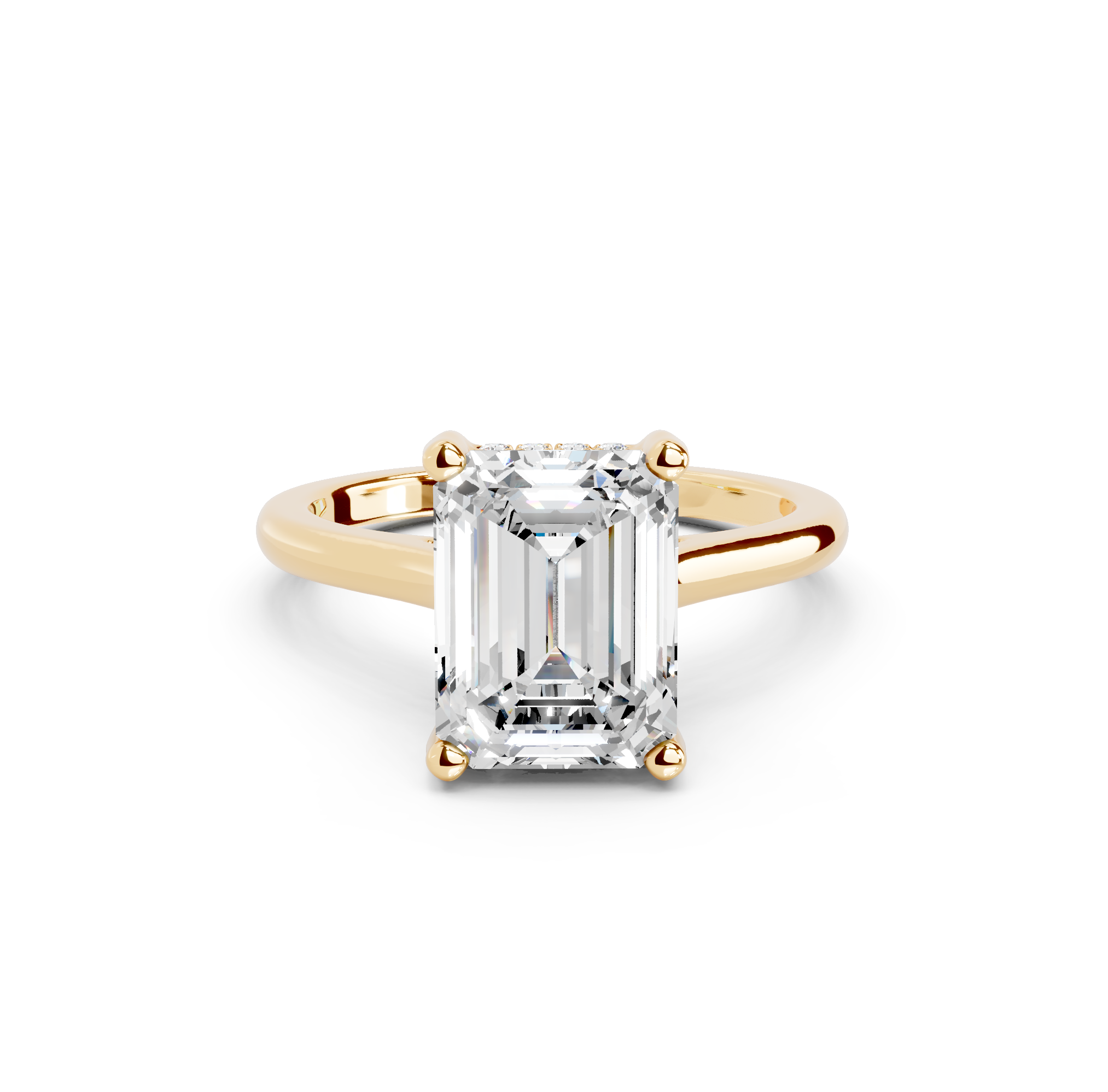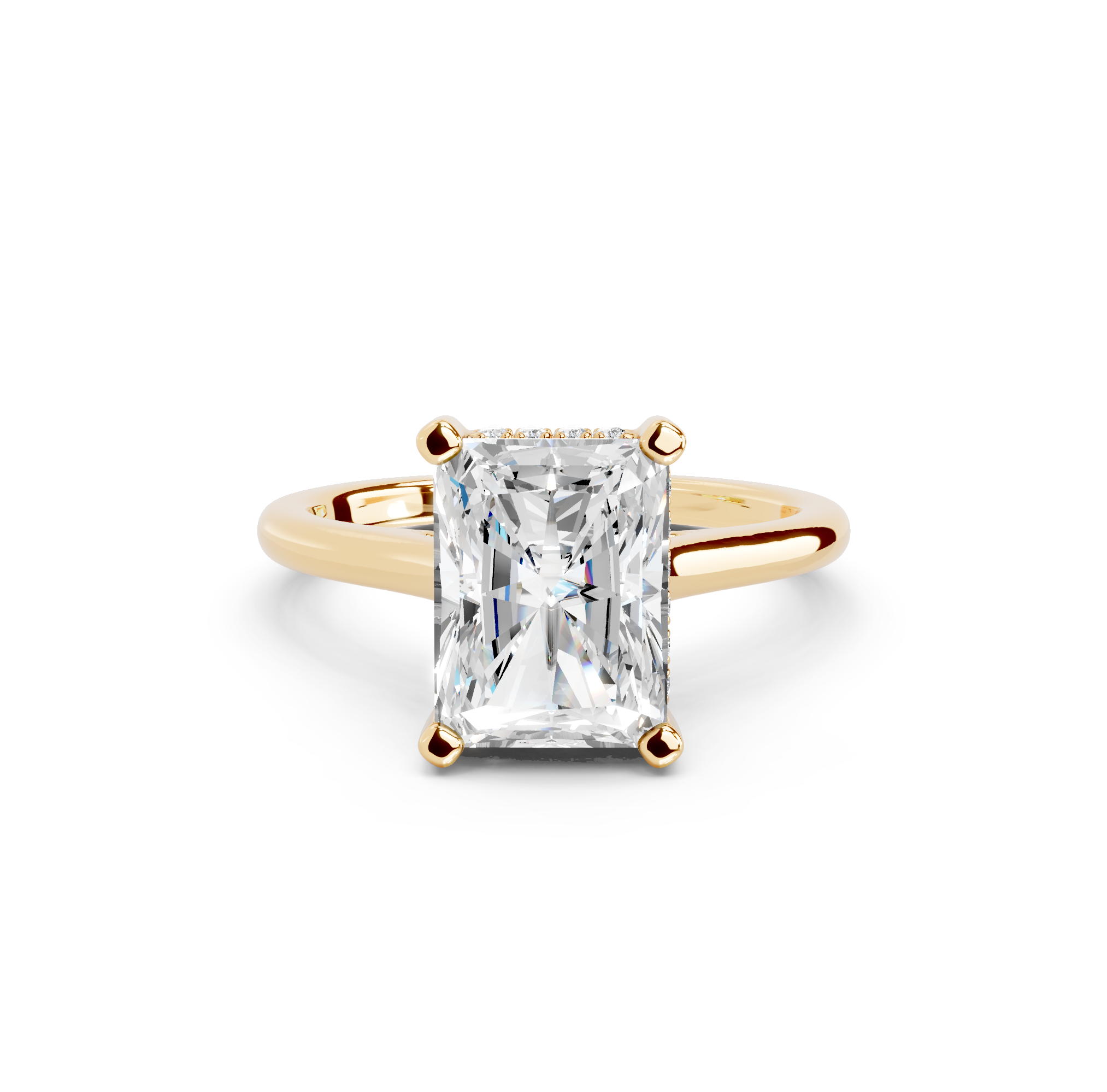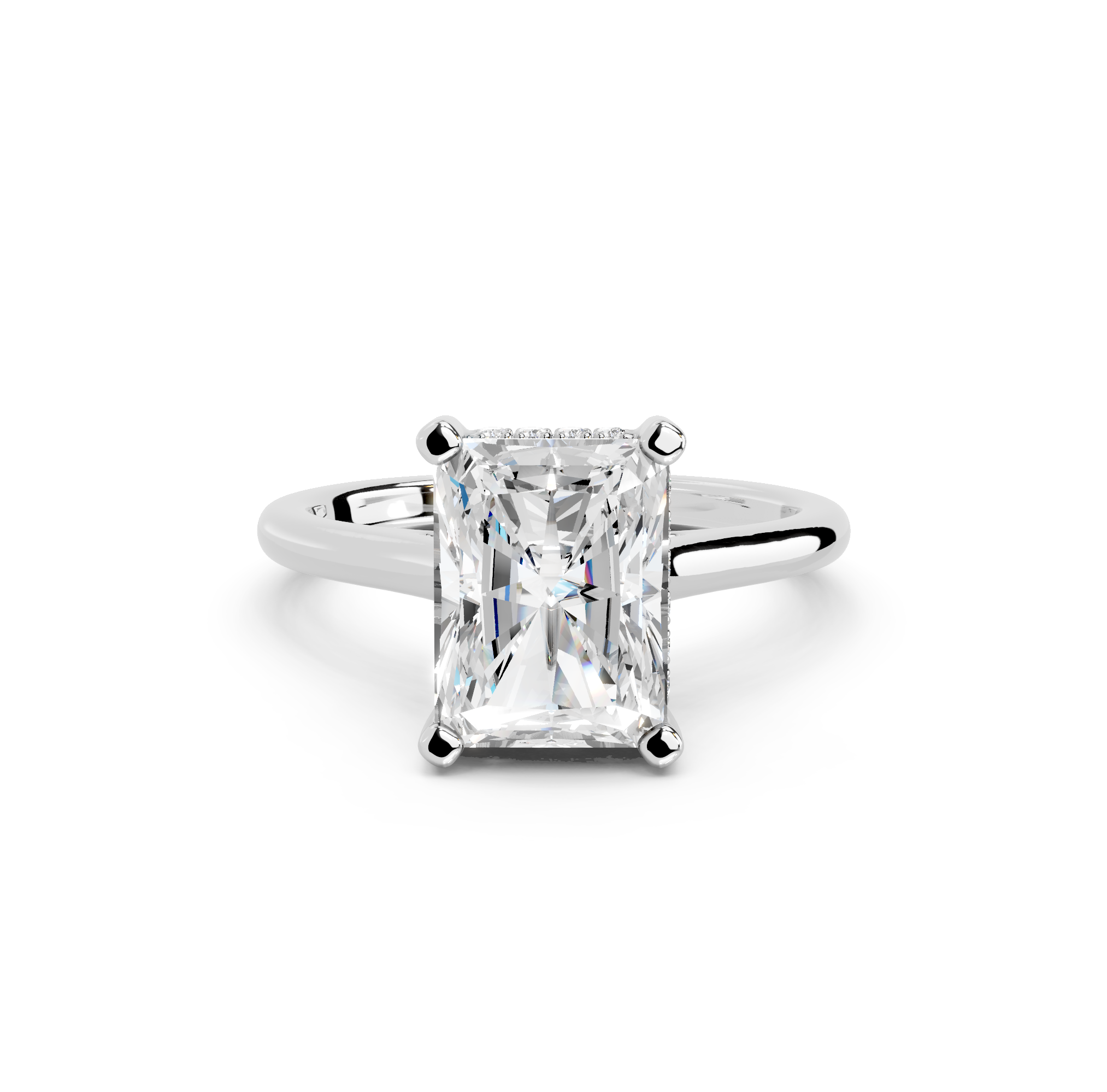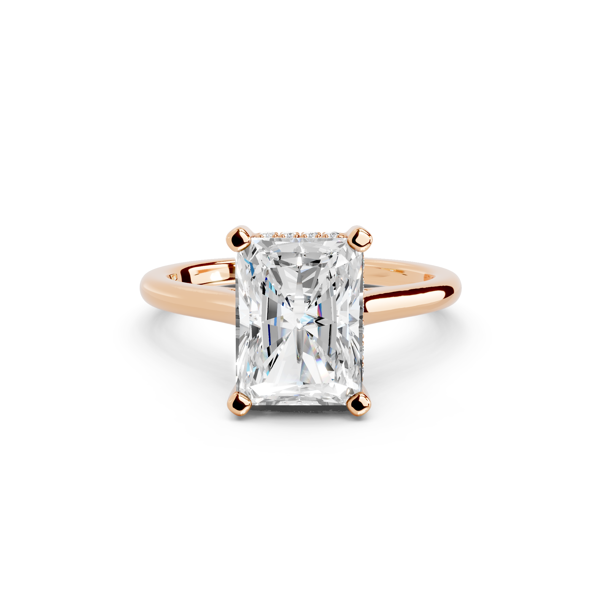 The Darya engagement ring combines the clean elegance of a solitaire with a surprise hidden halo of diamonds beneath the center stone. Its cathedral setting lifts the diamond high above the band, while the concealed halo adds extra brilliance that's visible from the side profile, creating beautiful light without overwhelming the center stone.