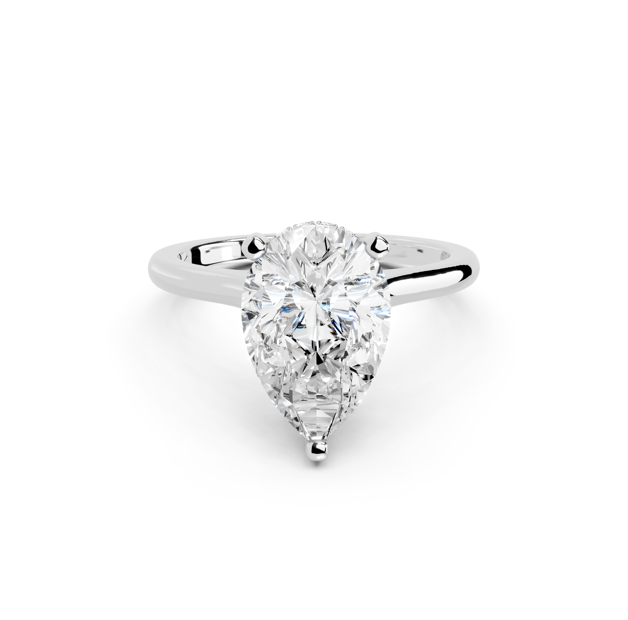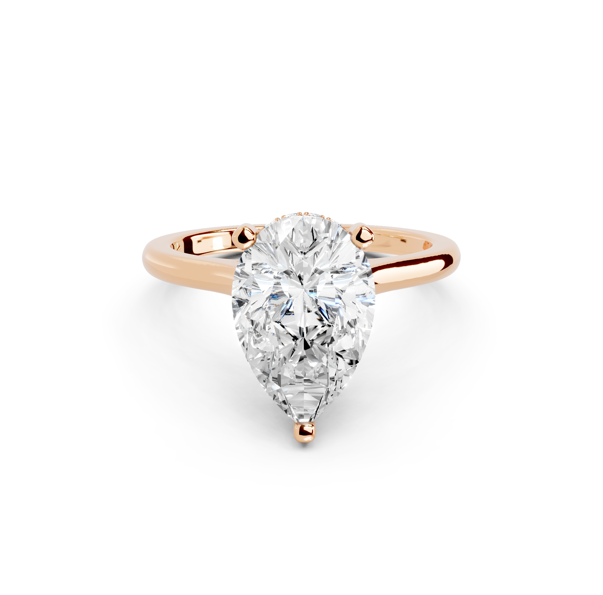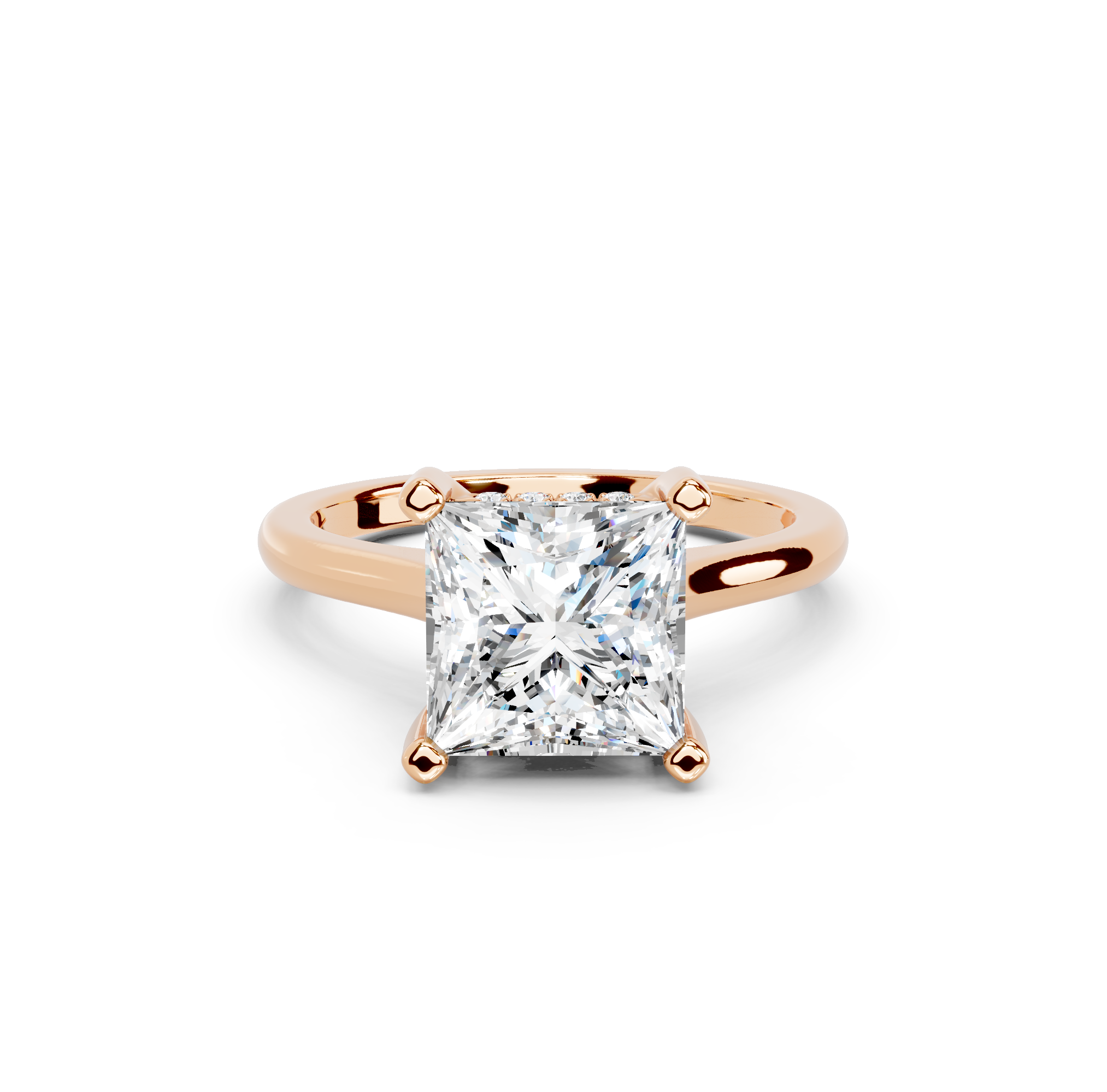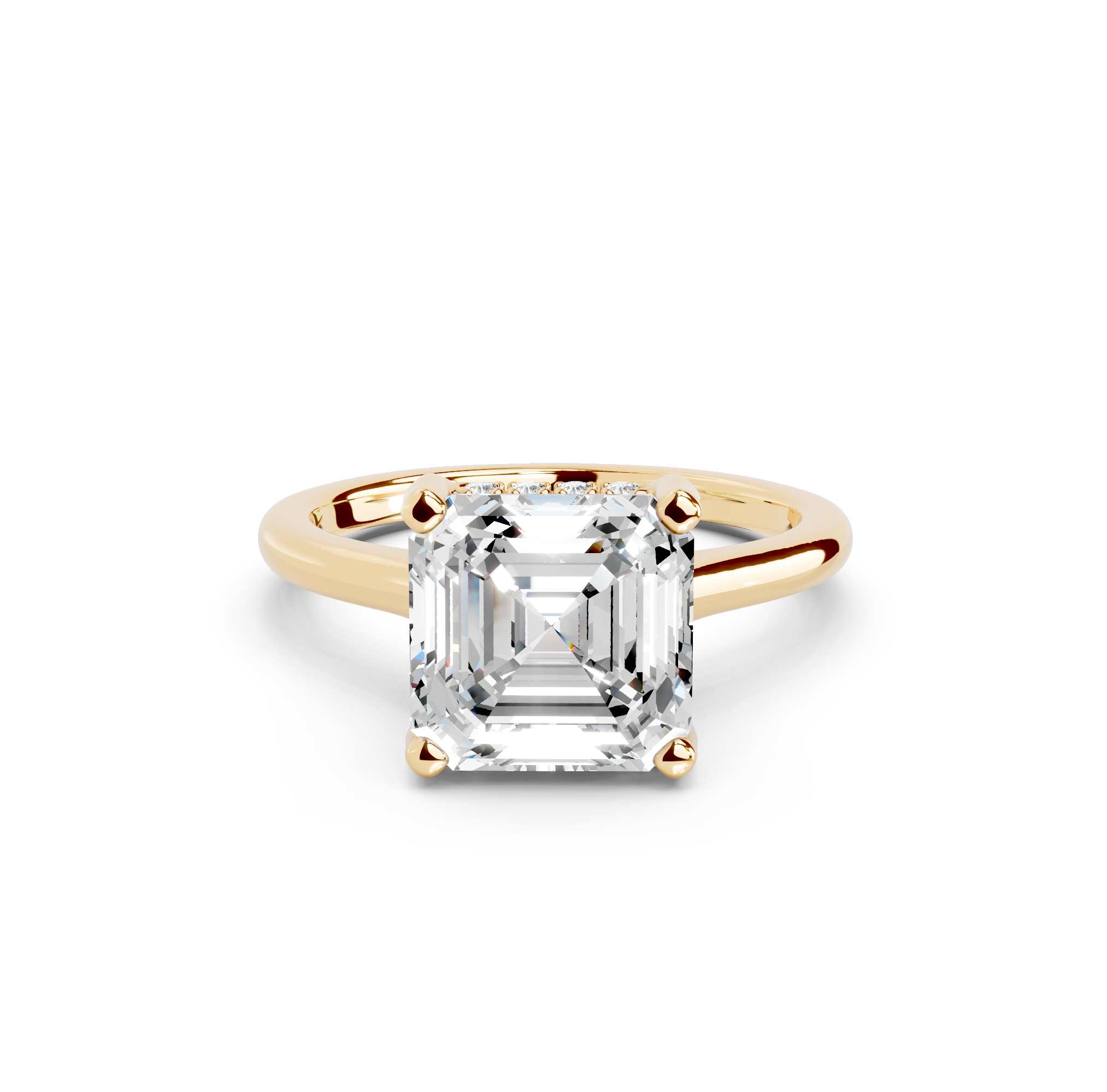The Darya engagement ring combines the clean elegance of a solitaire with a surprise hidden halo of diamonds beneath the center stone. Its cathedral setting lifts the diamond high above the band, while the concealed halo adds extra brilliance that's visible from the side profile, creating beautiful light without overwhelming the center stone.