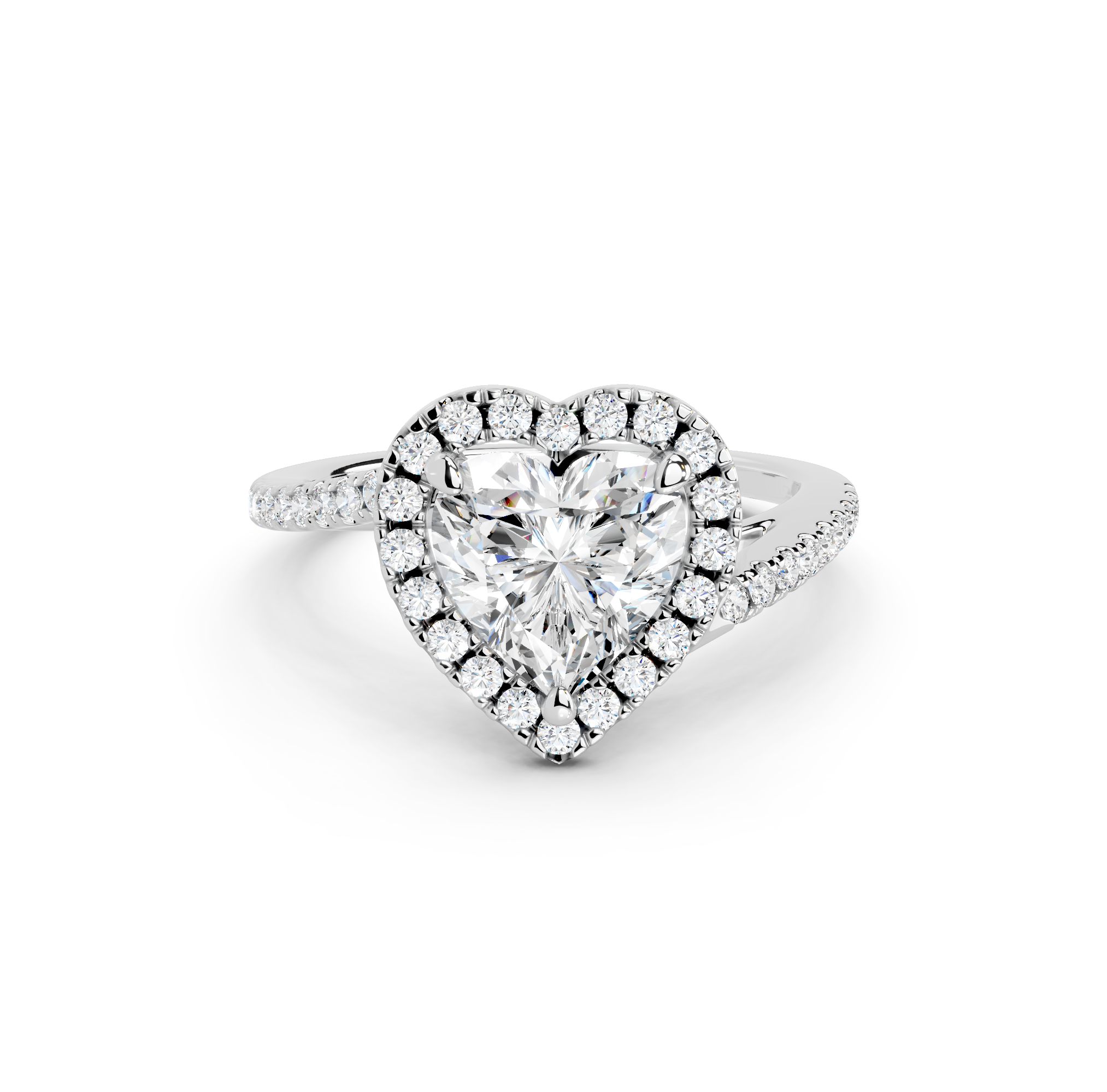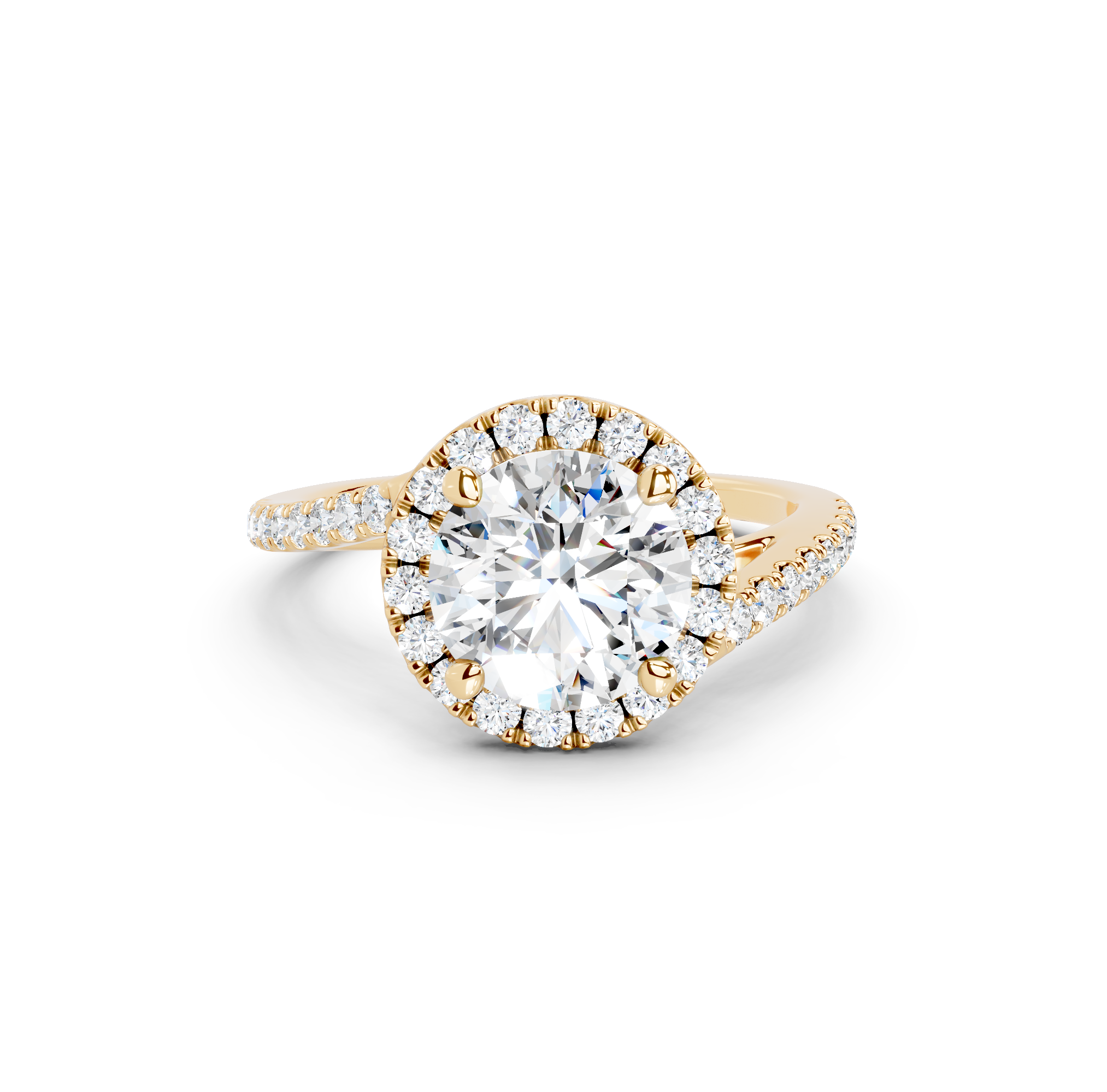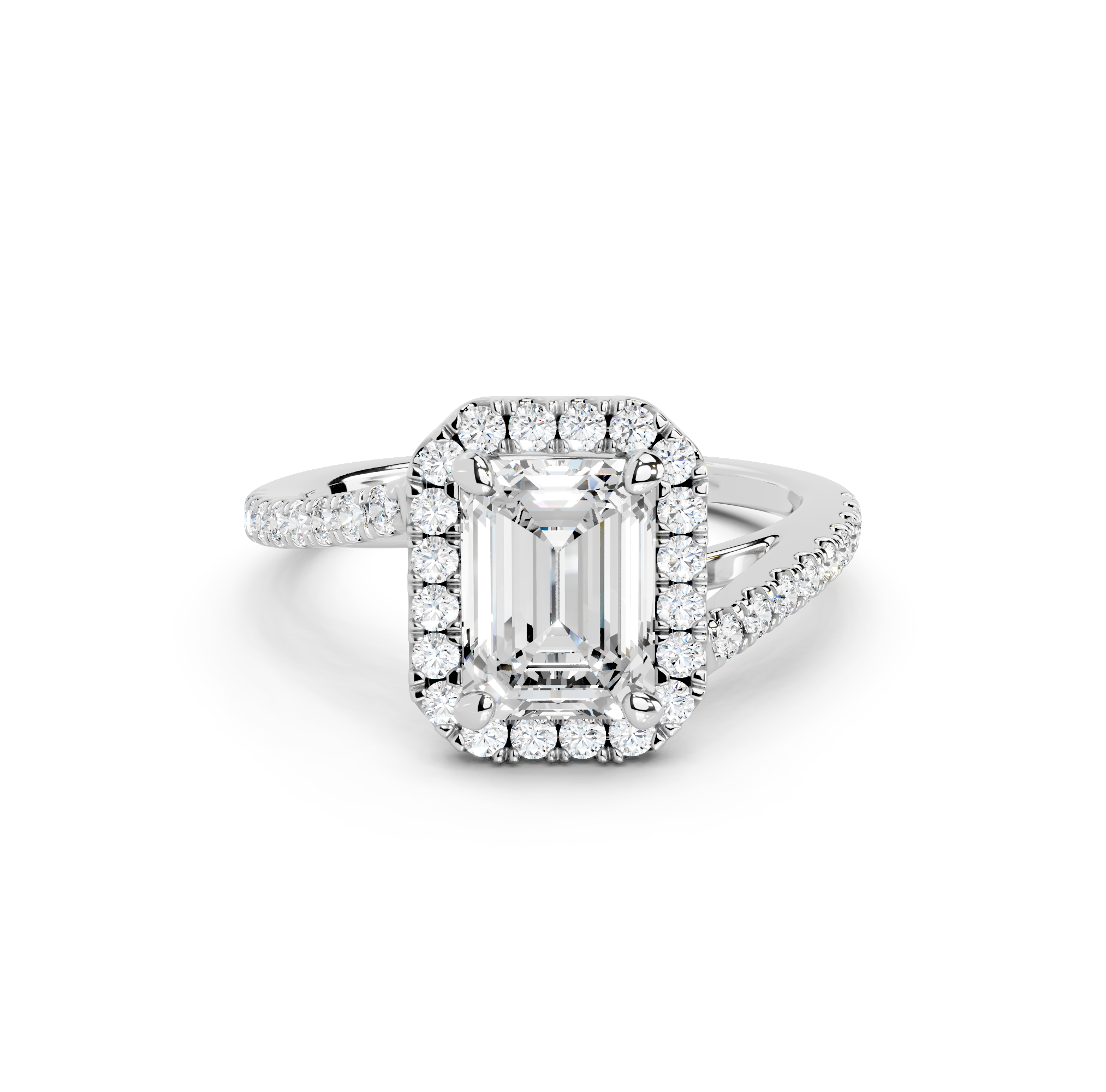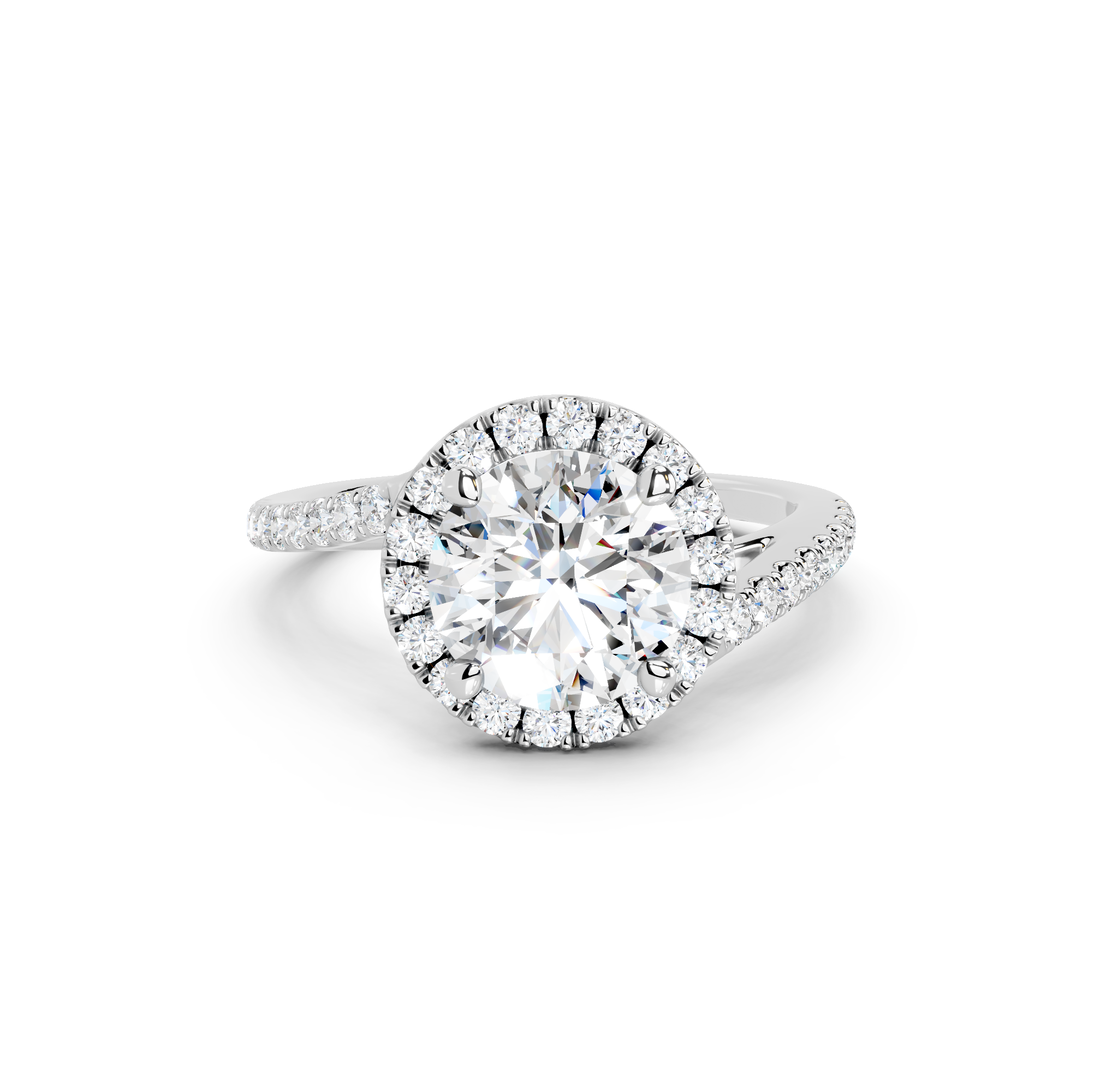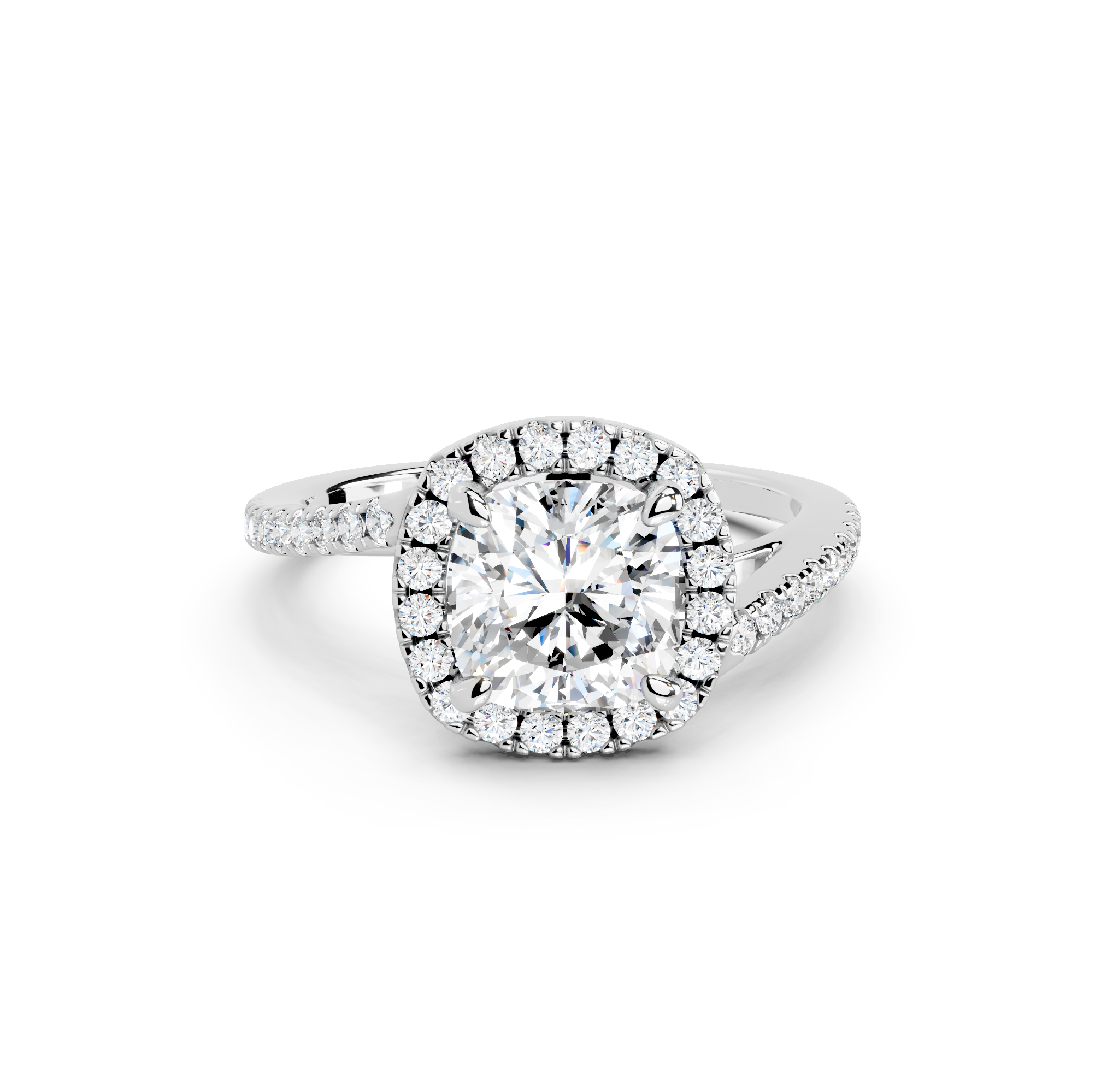 Tell your love story with the unique design of our pavé halo curved bypass cathedral engagement ring. The band features a stunning curved bypass, where two lines of precious metal elegantly sweep past each other, symbolizing your two individual paths joining into one. They curve upwards into cathedral arches that embrace the center stone. Surrounding the stone is a dazzling pavé halo that adds to the design's sparkle, making you shimmer with every move you make.