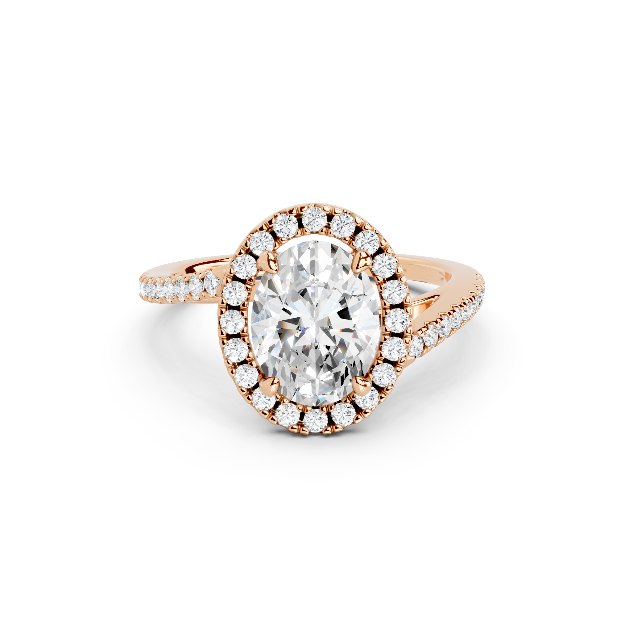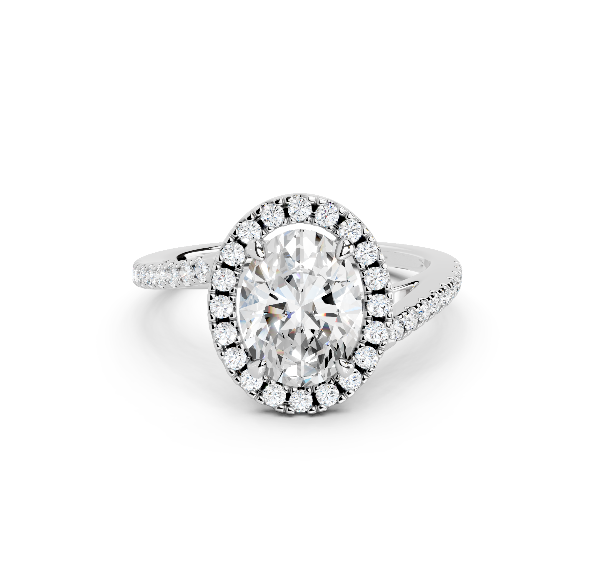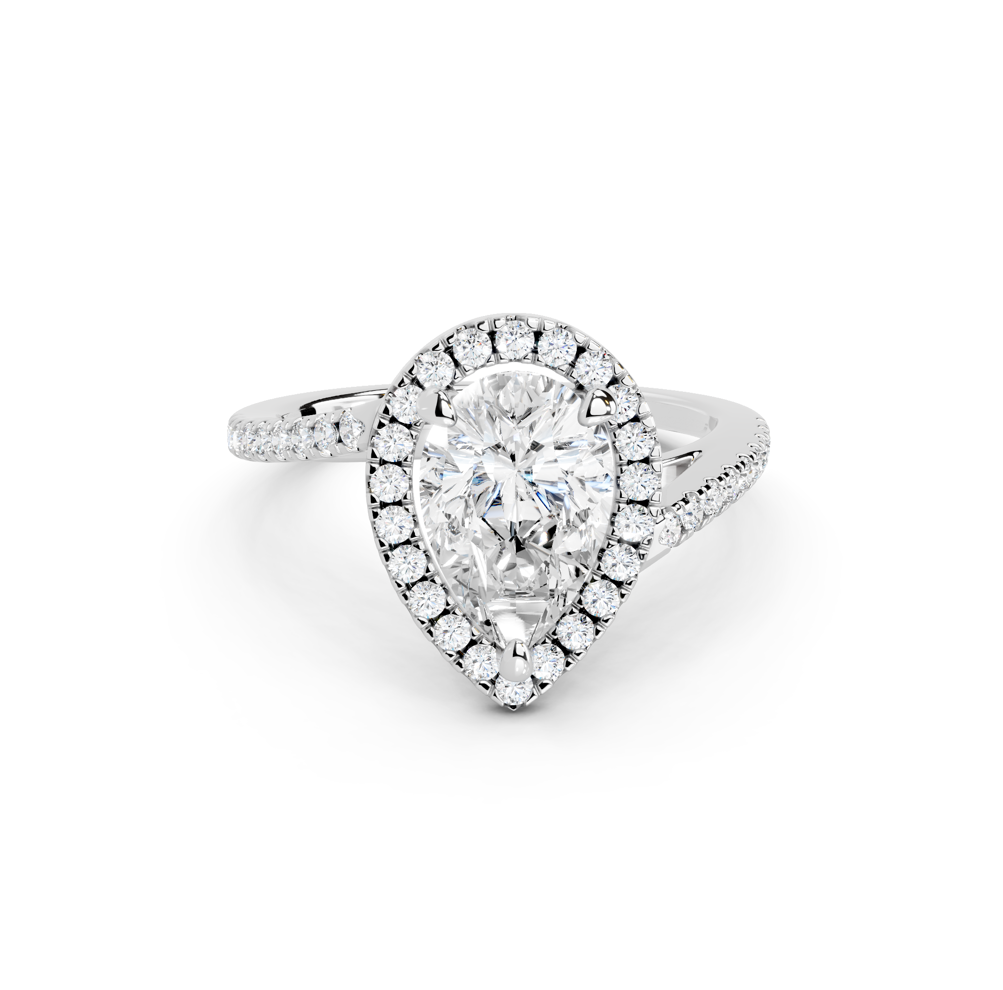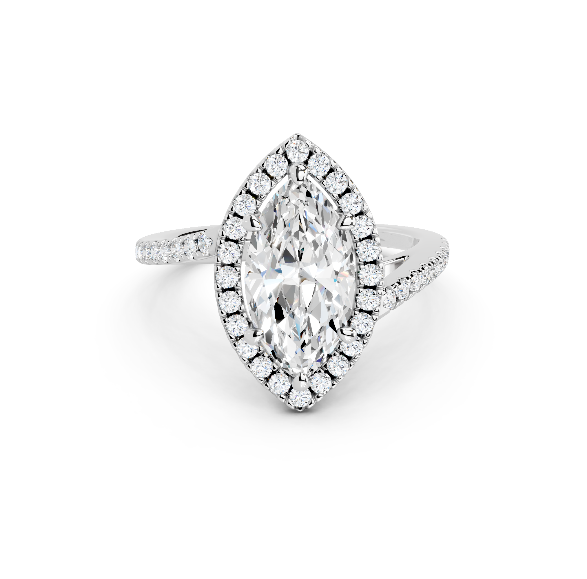 Tell your love story with the unique design of our pavé halo curved bypass cathedral engagement ring. The band features a stunning curved bypass, where two lines of precious metal elegantly sweep past each other, symbolizing your two individual paths joining into one. They curve upwards into cathedral arches that embrace the center stone. Surrounding the stone is a dazzling pavé halo that adds to the design's sparkle, making you shimmer with every move you make.