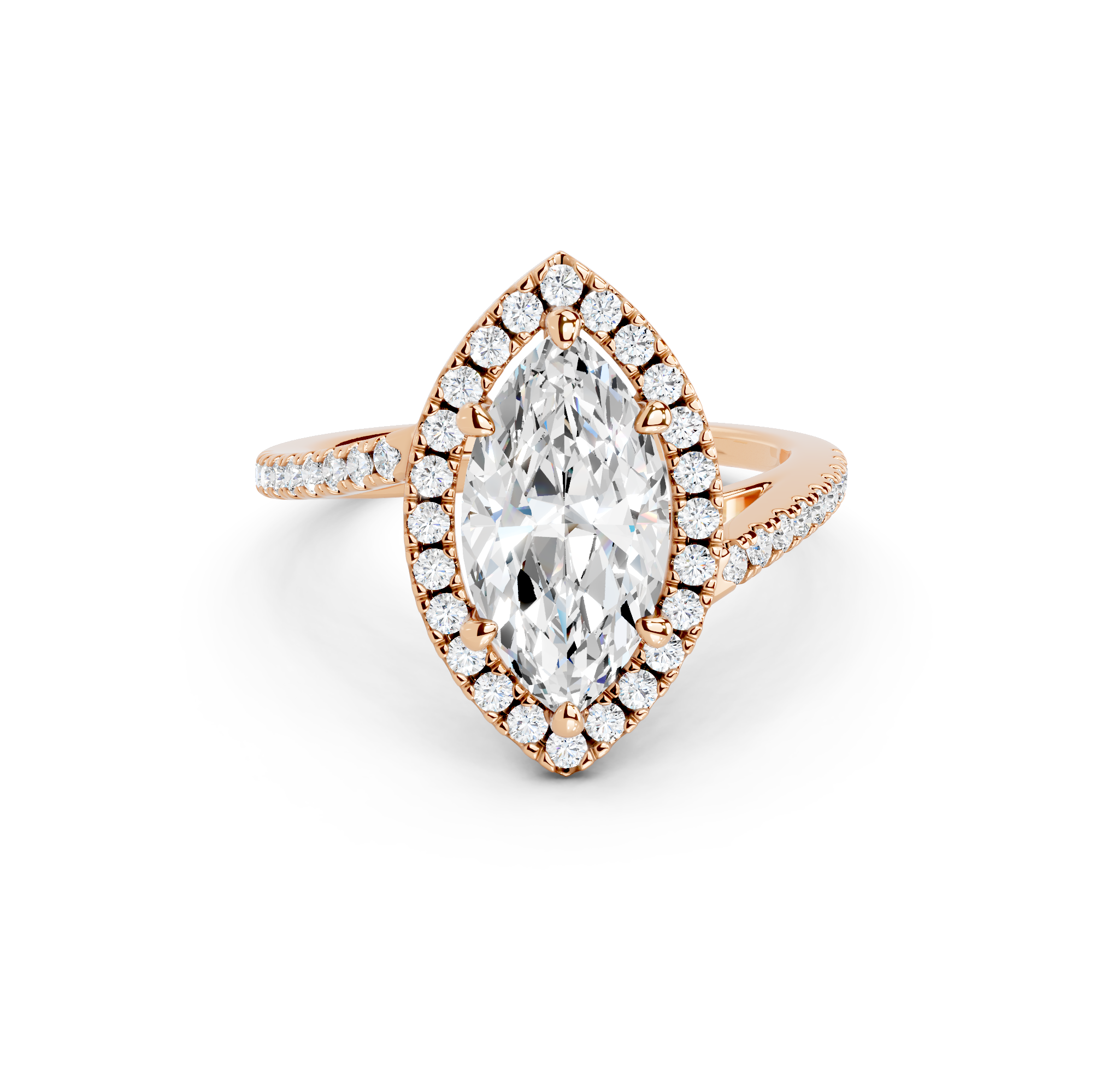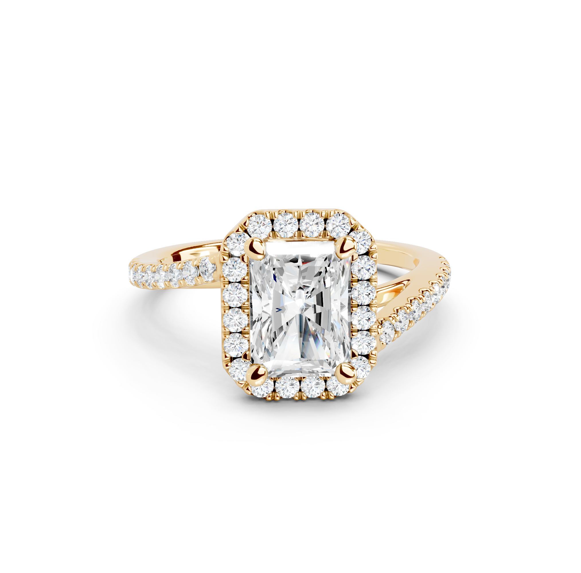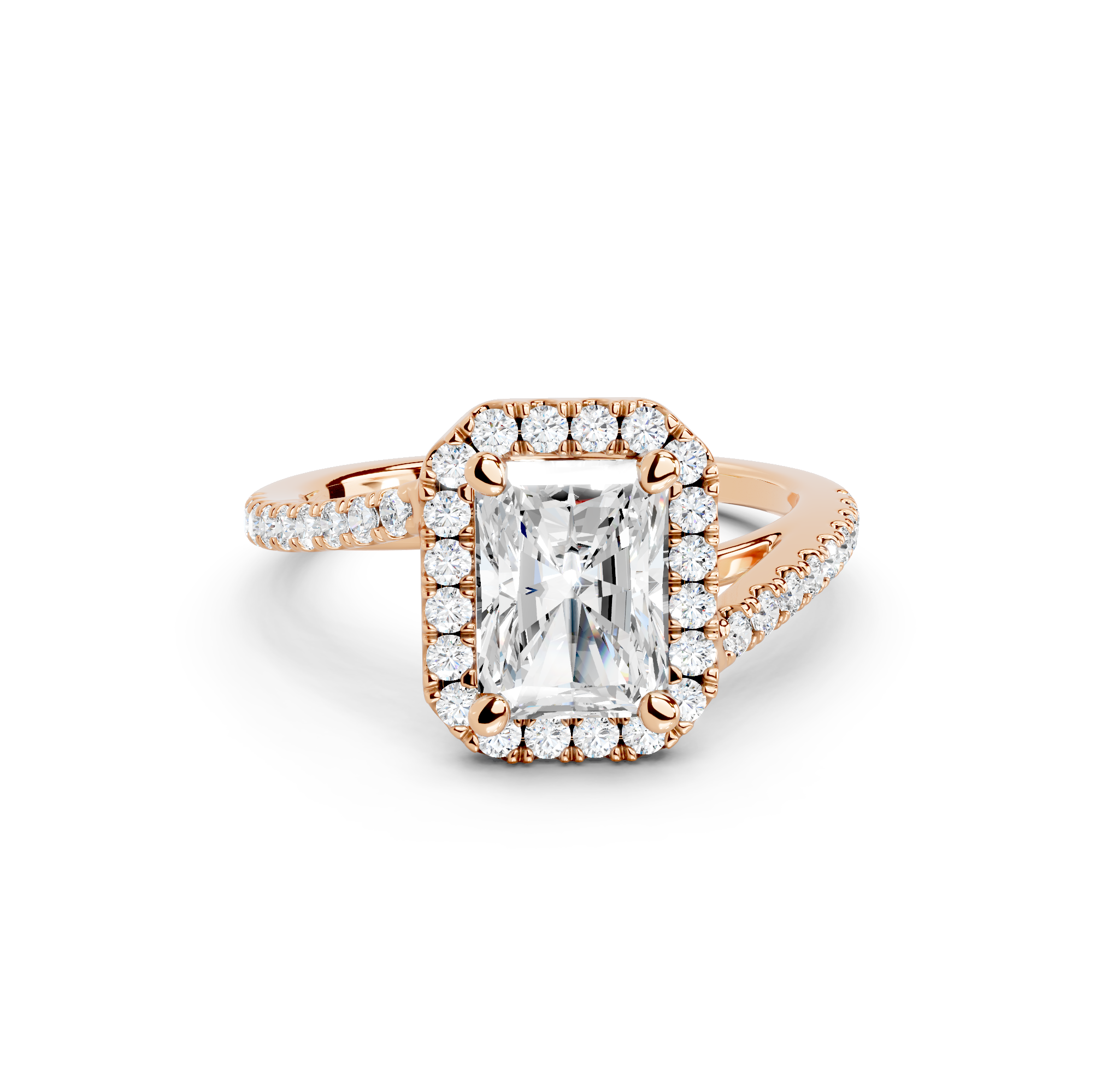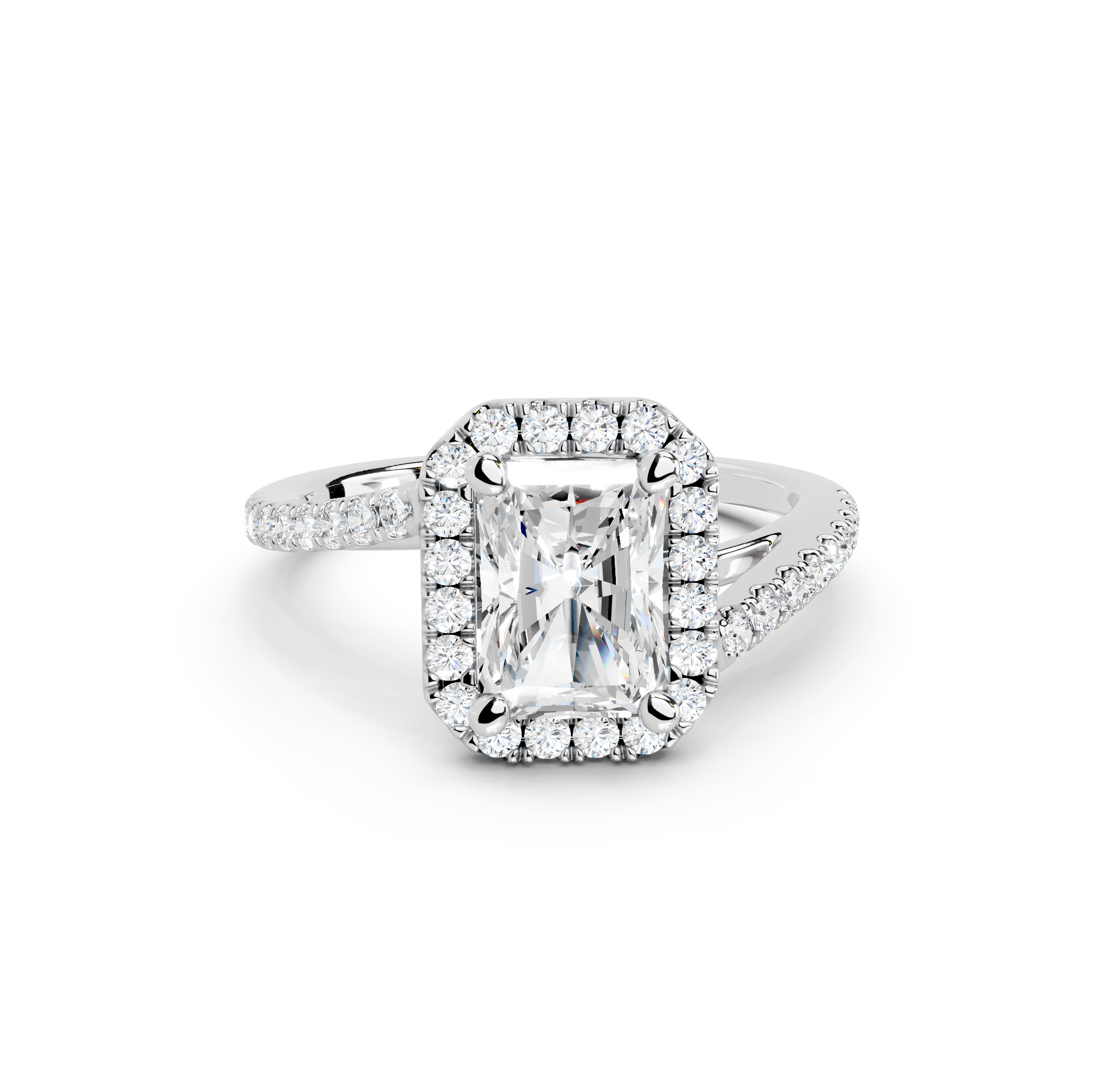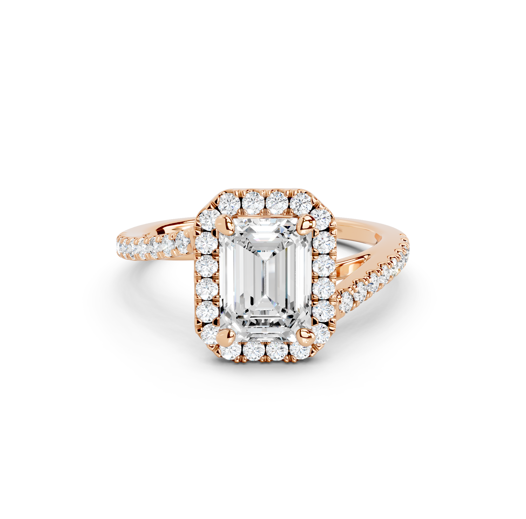 Tell your love story with the unique design of our pavé halo curved bypass cathedral engagement ring. The band features a stunning curved bypass, where two lines of precious metal elegantly sweep past each other, symbolizing your two individual paths joining into one. They curve upwards into cathedral arches that embrace the center stone. Surrounding the stone is a dazzling pavé halo that adds to the design's sparkle, making you shimmer with every move you make.