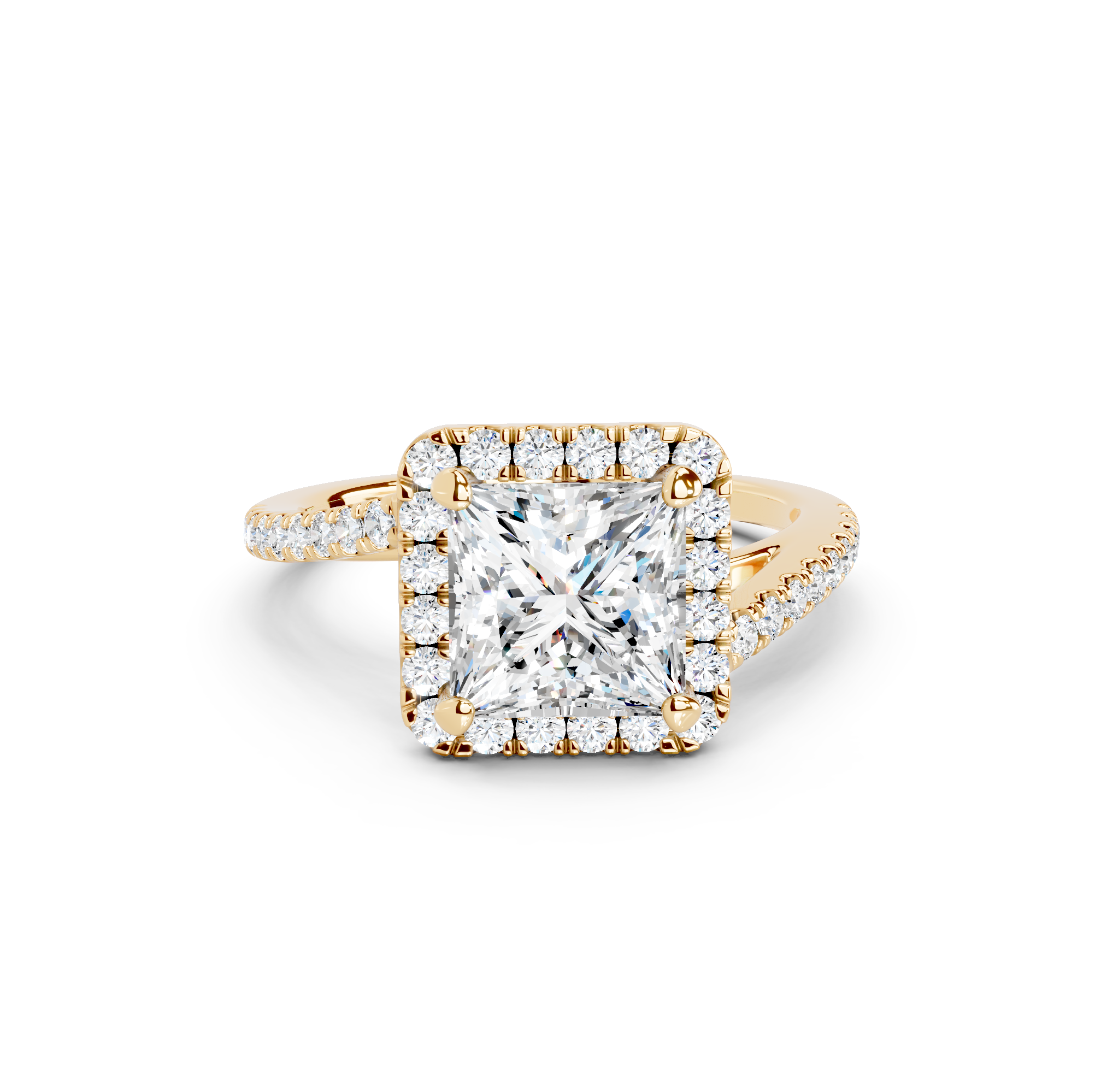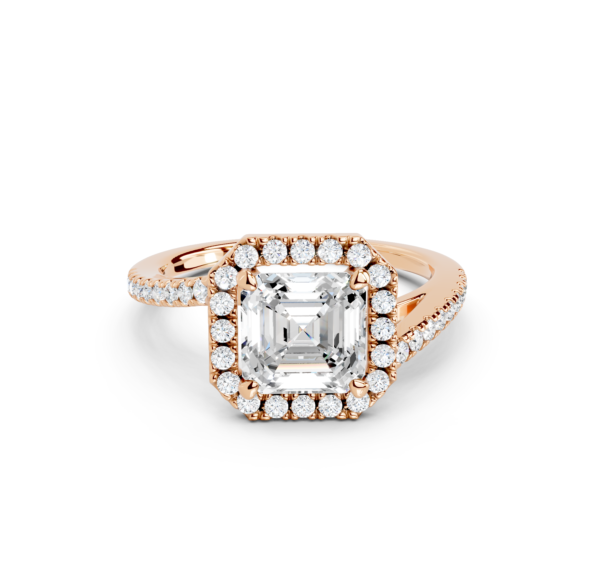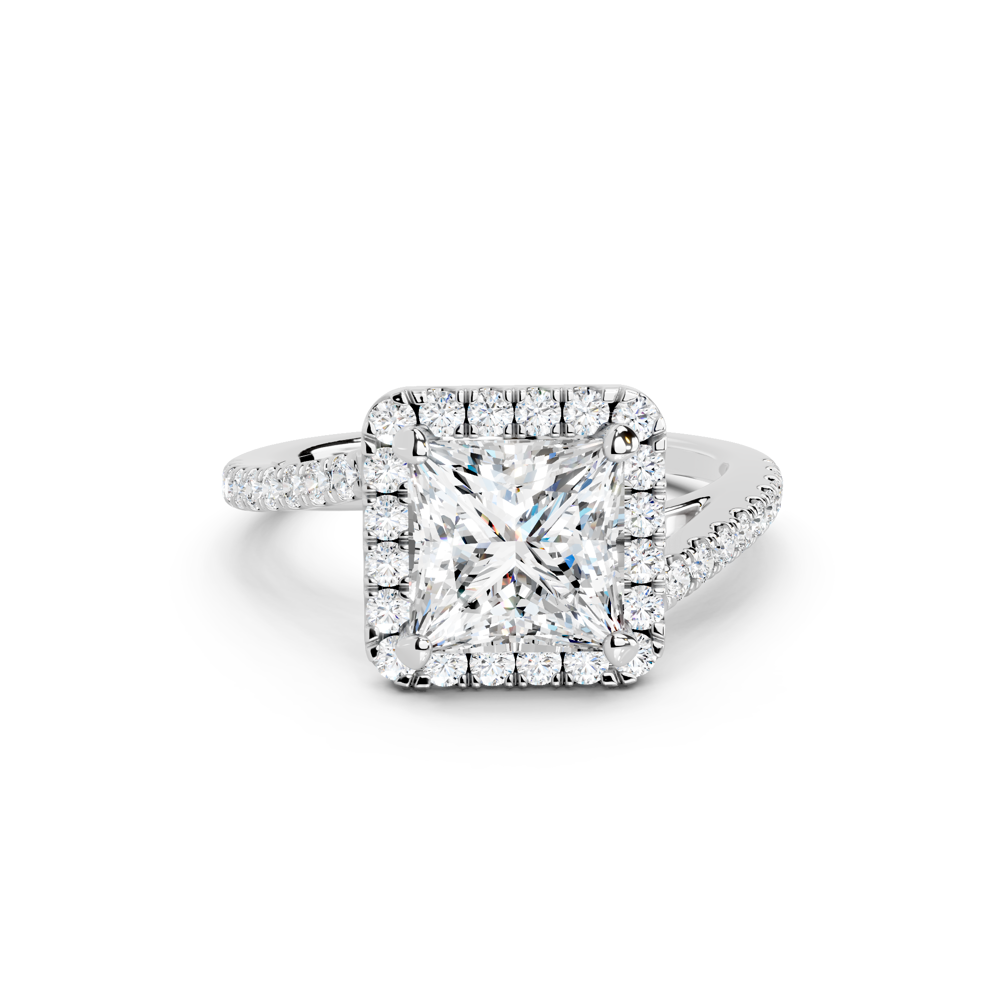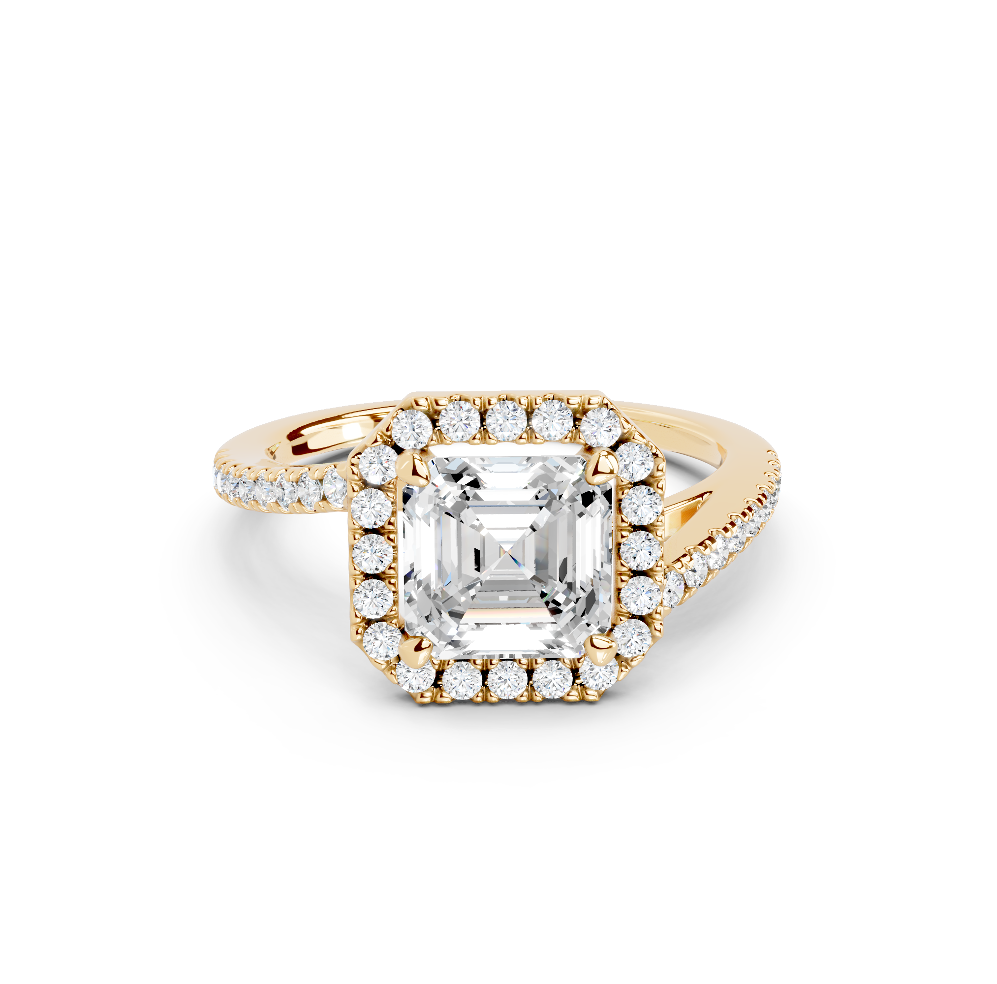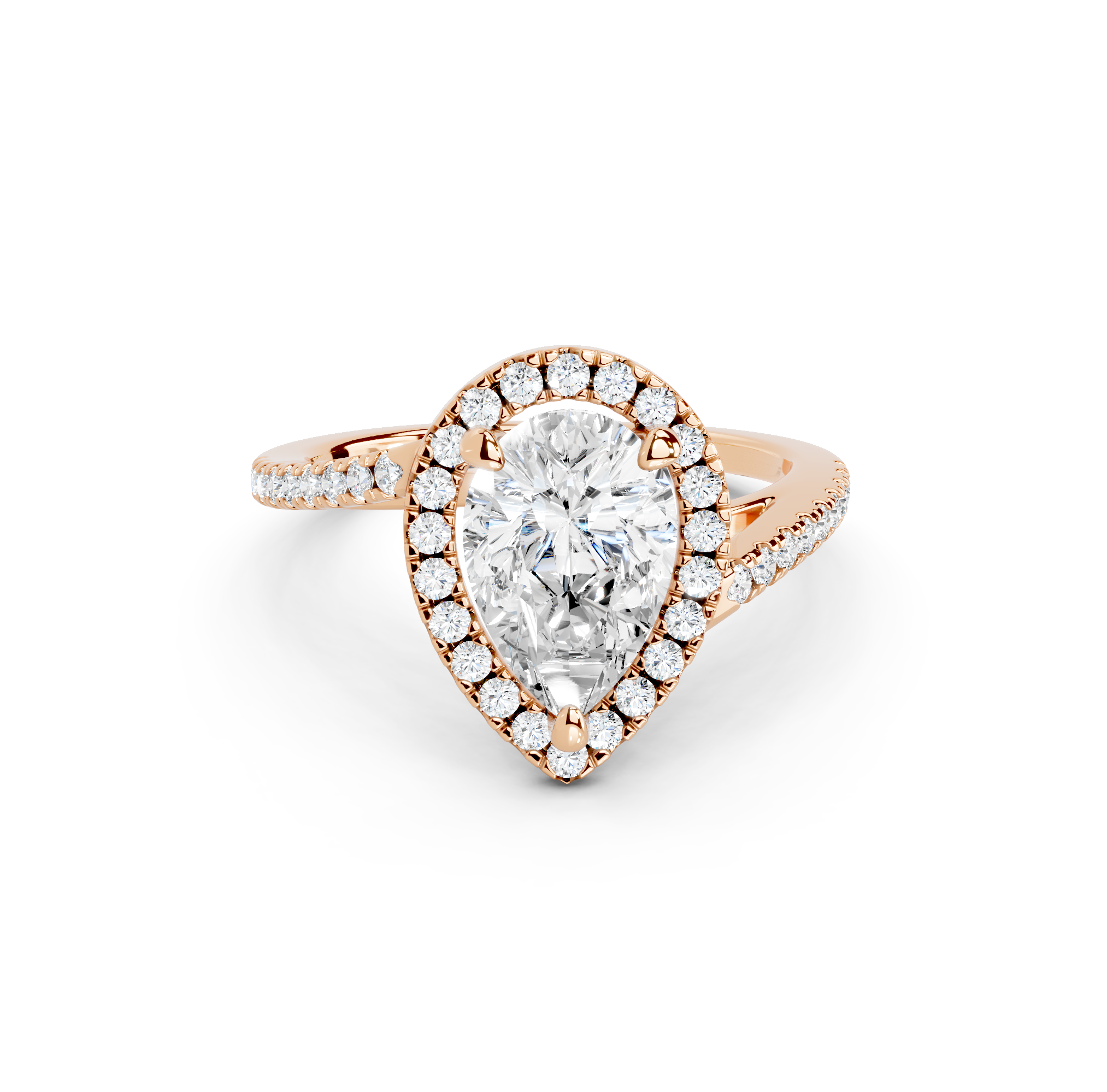 Tell your love story with the unique design of our pavé halo curved bypass cathedral engagement ring. The band features a stunning curved bypass, where two lines of precious metal elegantly sweep past each other, symbolizing your two individual paths joining into one. They curve upwards into cathedral arches that embrace the center stone. Surrounding the stone is a dazzling pavé halo that adds to the design's sparkle, making you shimmer with every move you make.