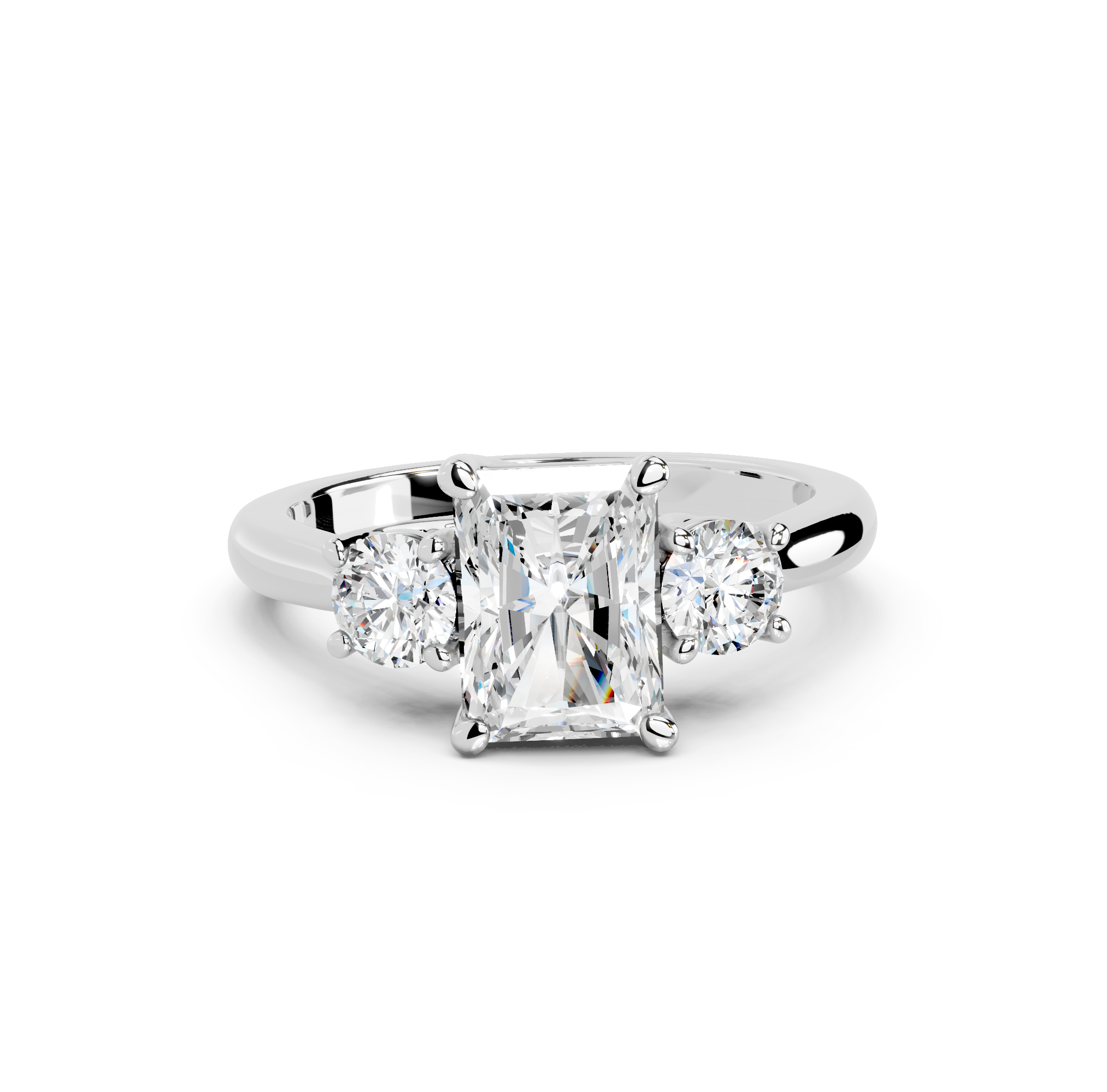 Celebrate the past, present, and future of your love story with the Fia, our Three Stone Round Cut Tapered Trellis Setting Engagement Ring. This design brings a fresh take to a beloved classic, exuding simplistic elegance.