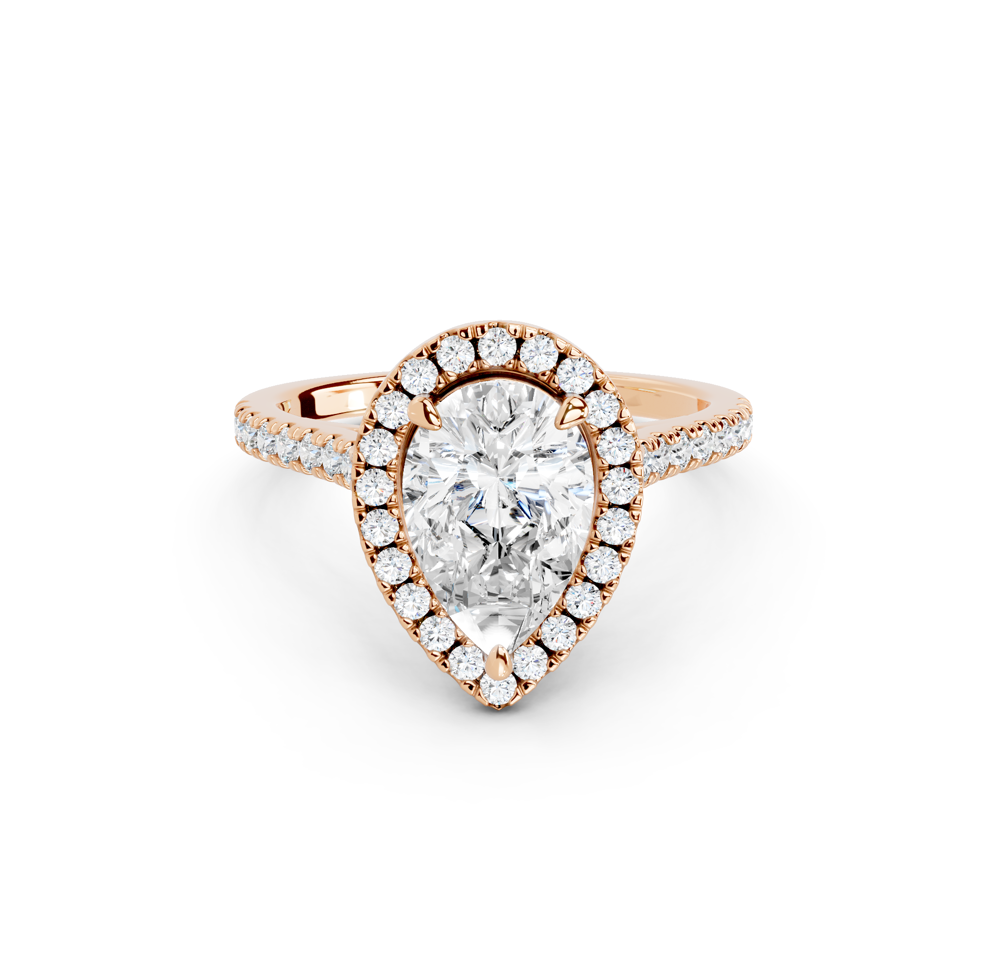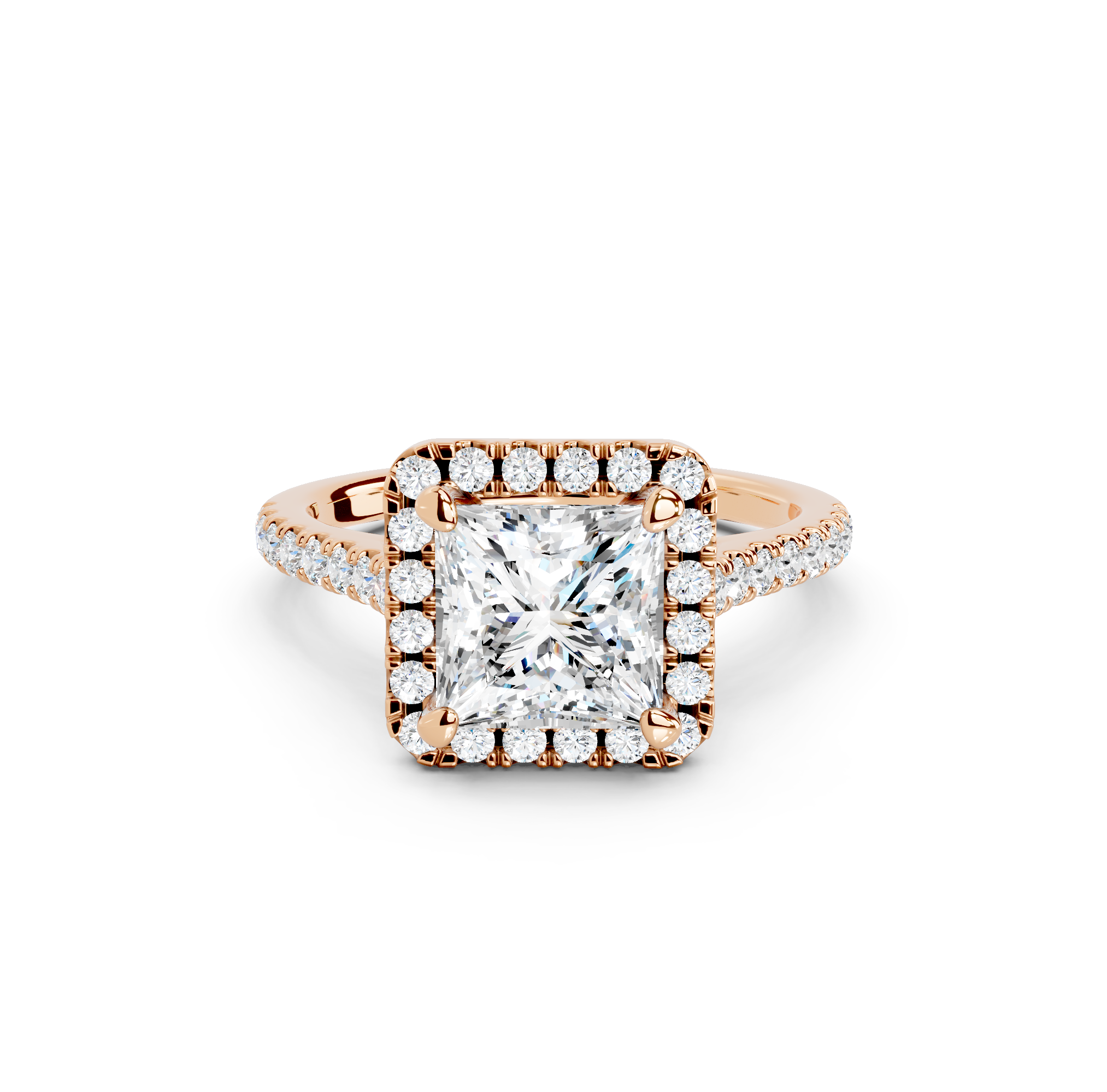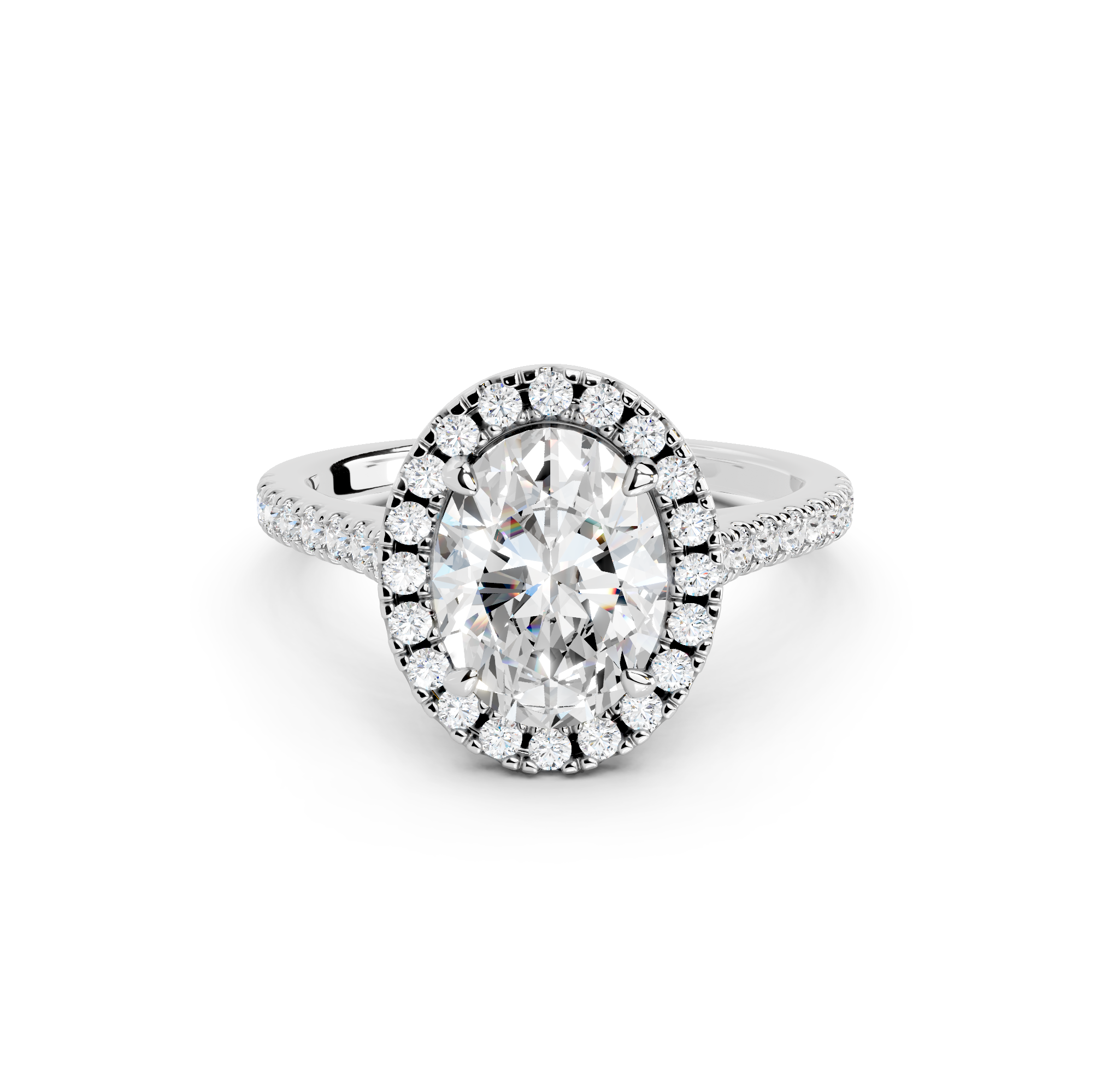 Luxurious and beautiful, this pavé halo cathedral engagement ring shimmers with every move of the hand. Delicate pavé diamonds trace upwards along the band, leading to a brilliant halo of diamonds that encircles your center stone. The cathedral setting adds characer to the piece and adds to its sparkle. The prongs are covered in pavé diamonds beneath the halo—a subtle, hidden gem that perfects this design.