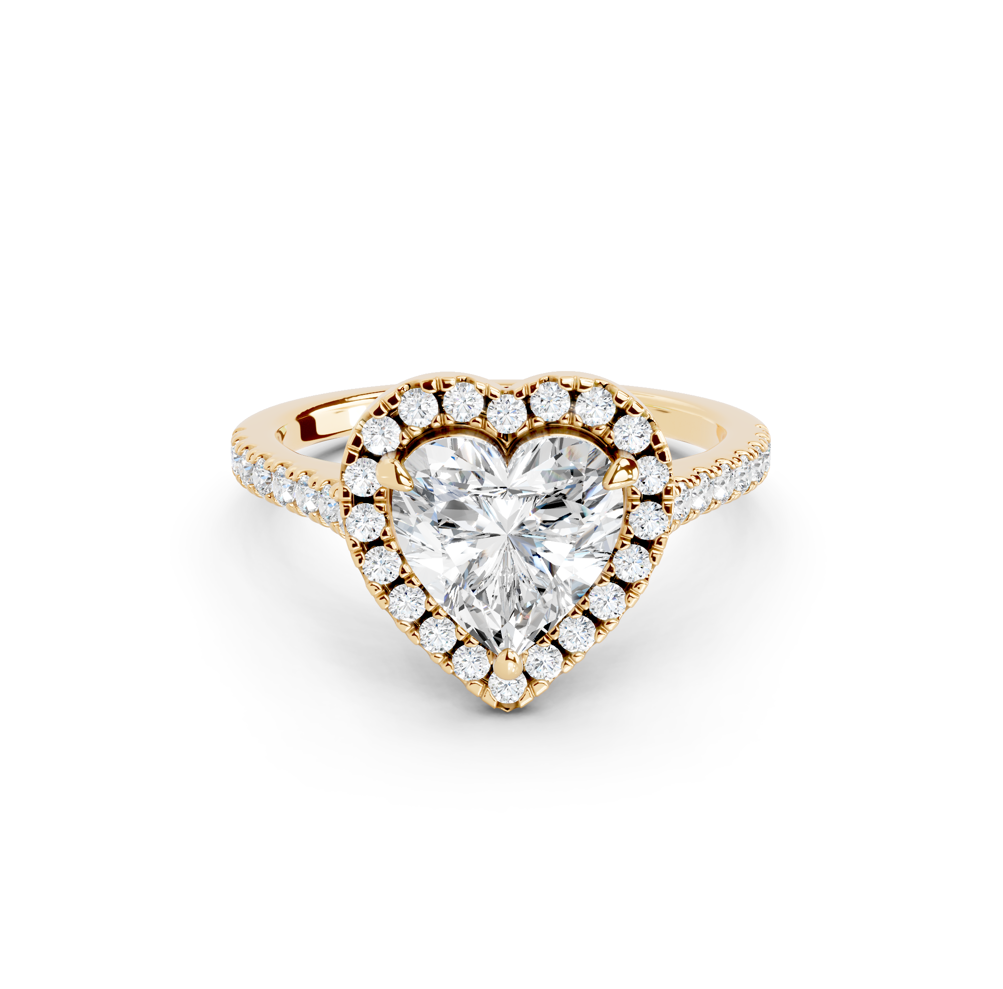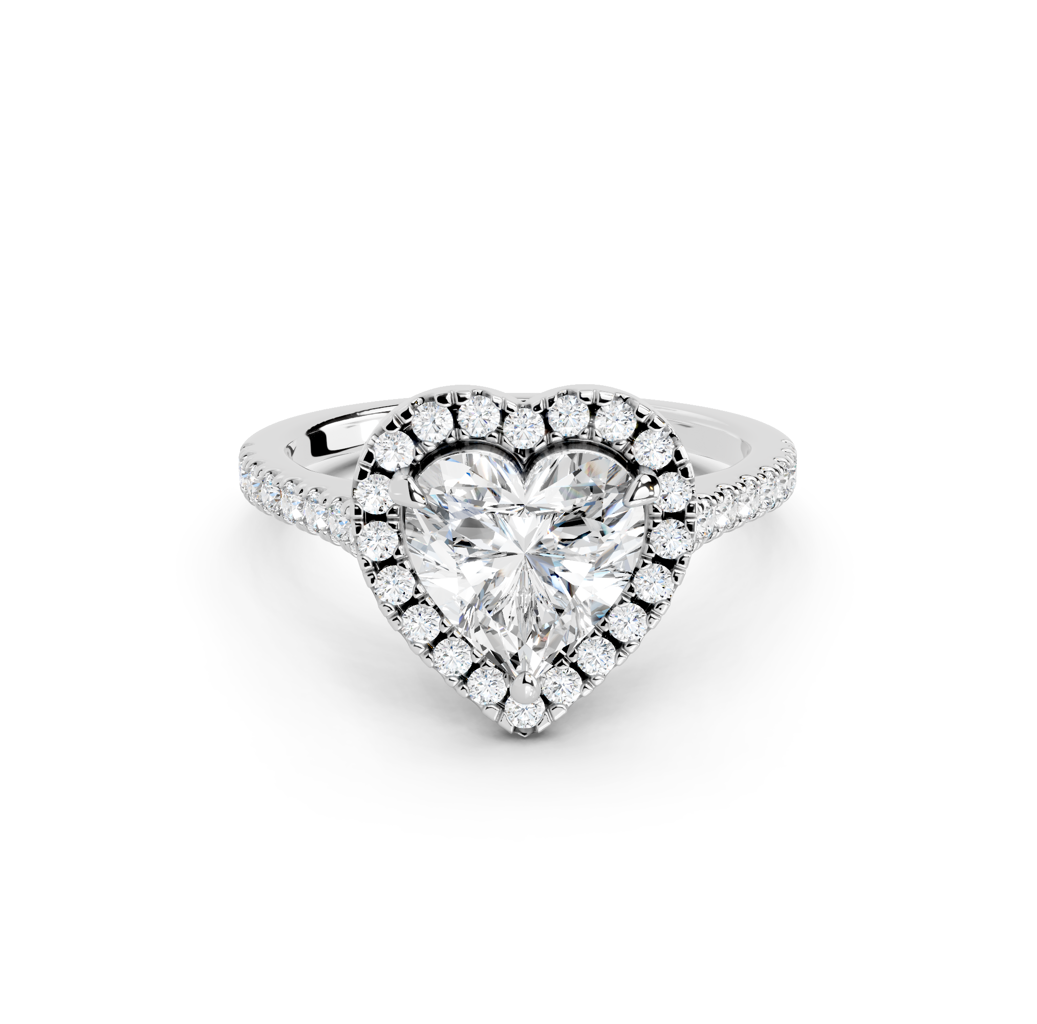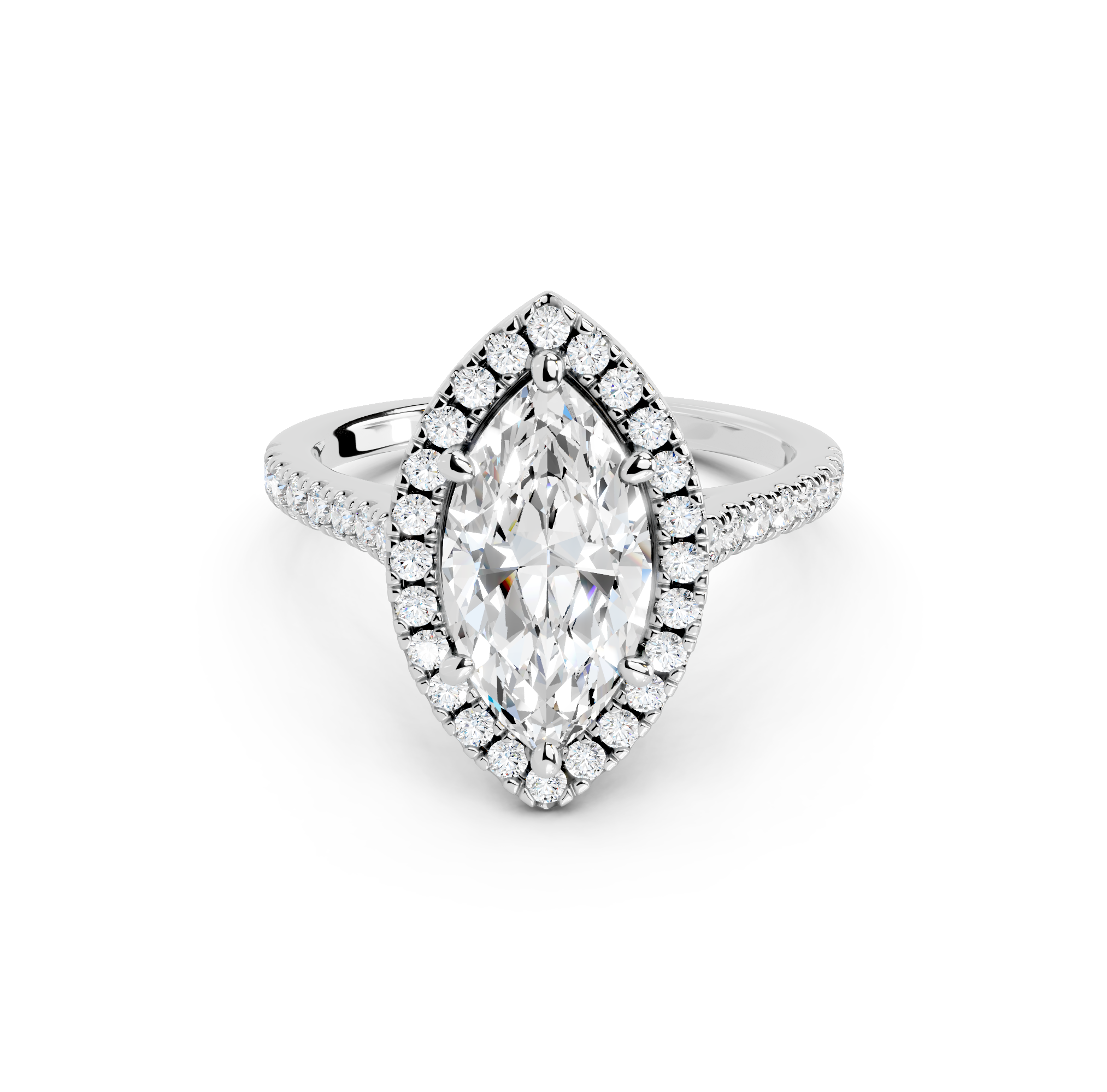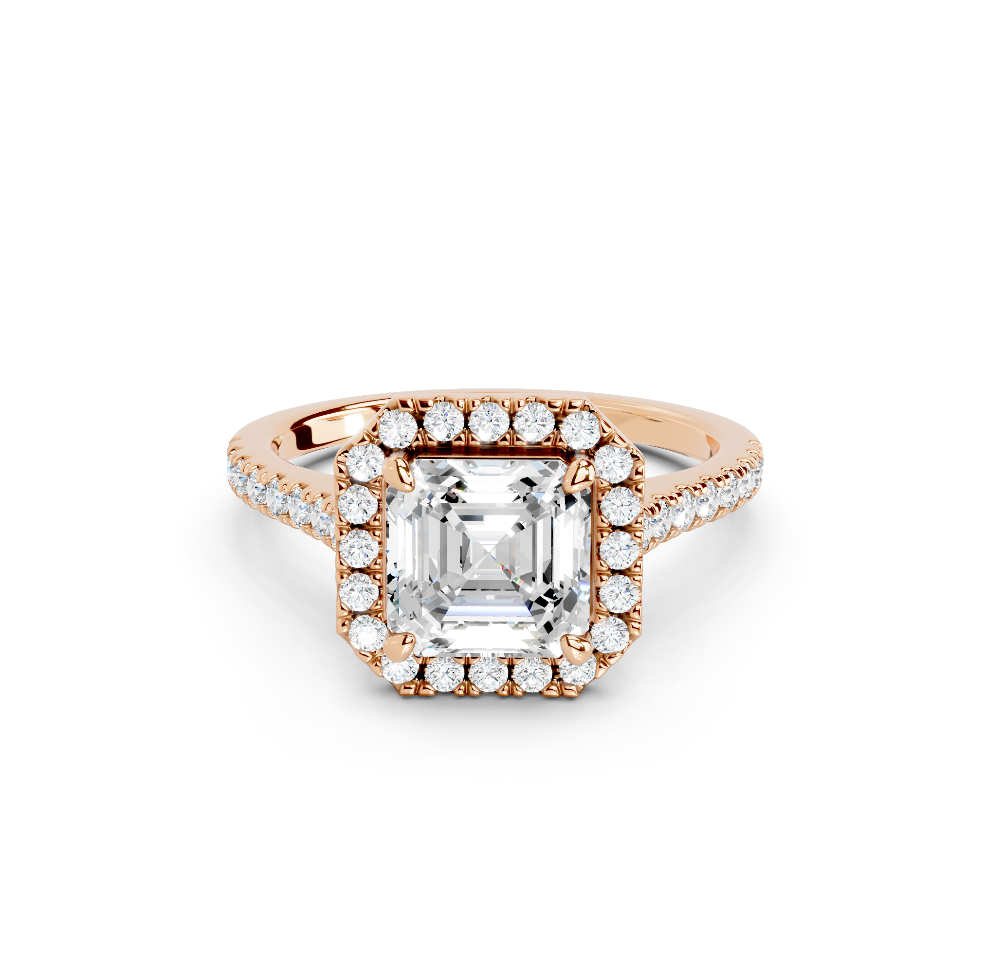 Luxurious and beautiful, this pavé halo cathedral engagement ring shimmers with every move of the hand. Delicate pavé diamonds trace upwards along the band, leading to a brilliant halo of diamonds that encircles your center stone. The cathedral setting adds characer to the piece and adds to its sparkle. The prongs are covered in pavé diamonds beneath the halo—a subtle, hidden gem that perfects this design.