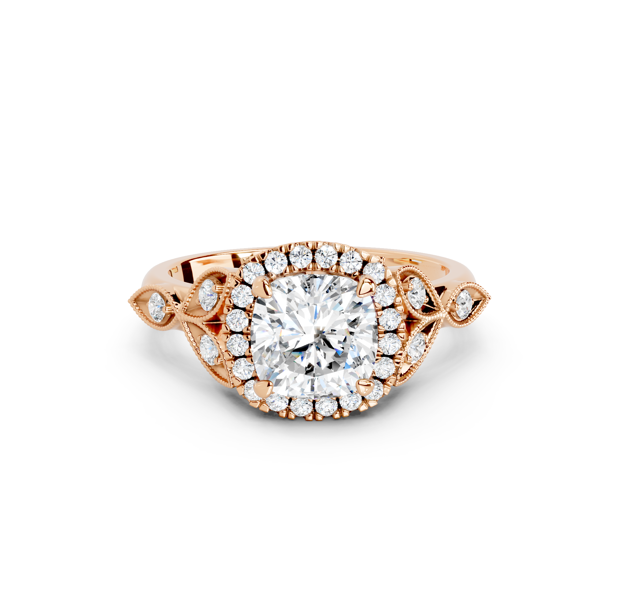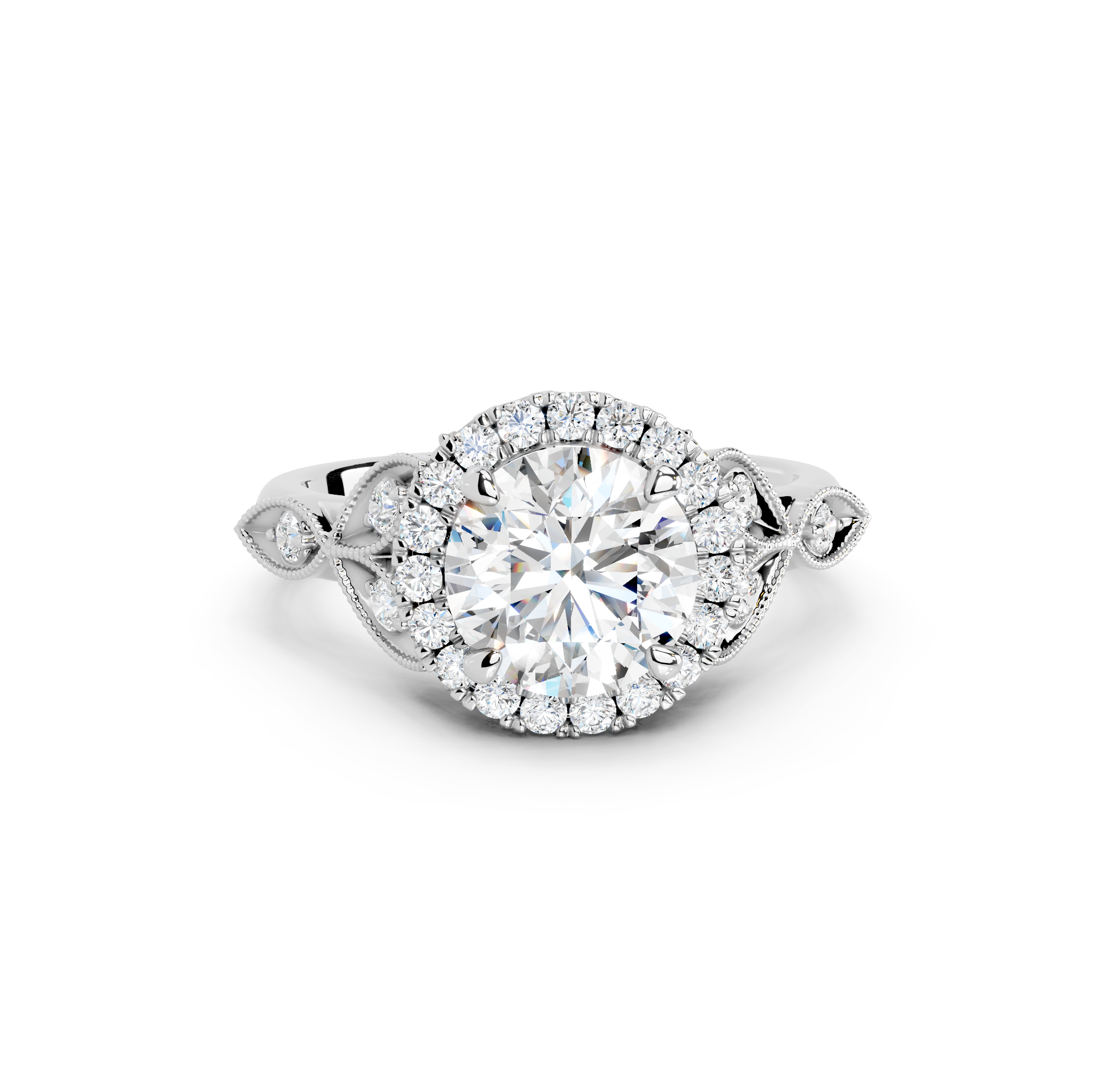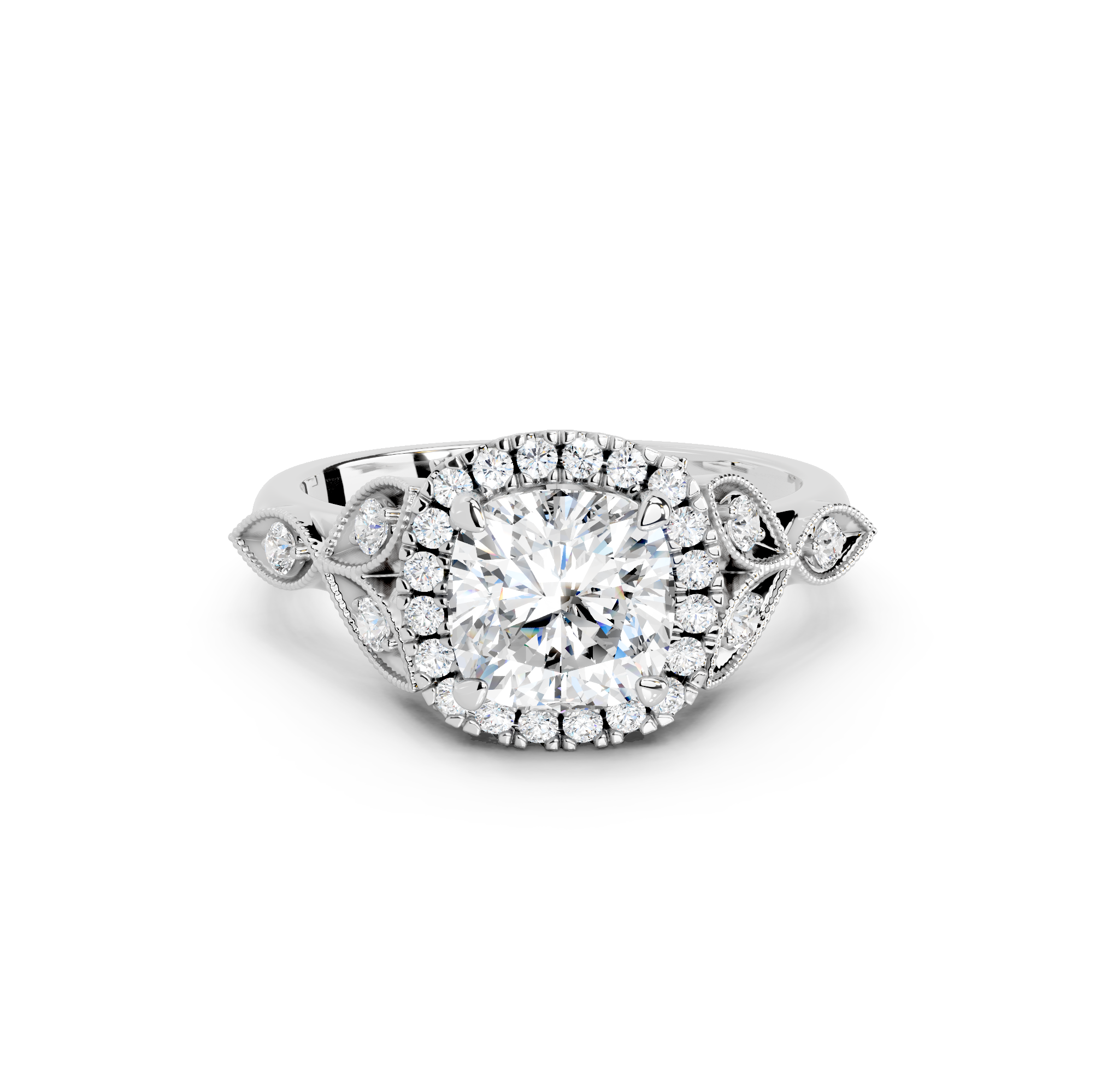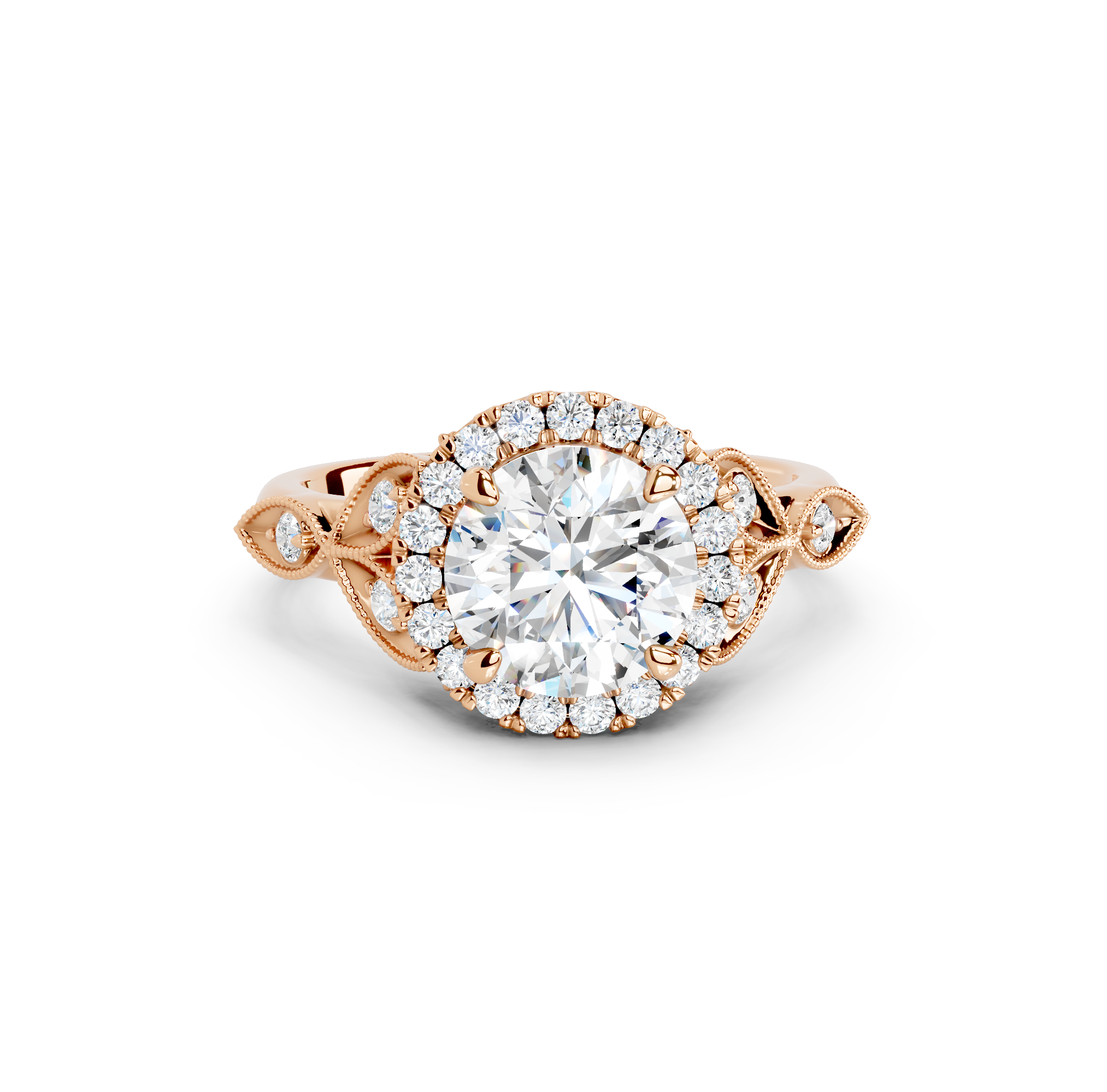 Each arch features milgrain-outlined petals, each holding a single round-cut diamond. This creates a garden-like setting that feels both timeless and romantic. Beneath the luxurious halo around the center stone, more petals are tucked away, catching the light from unexpected angles.
