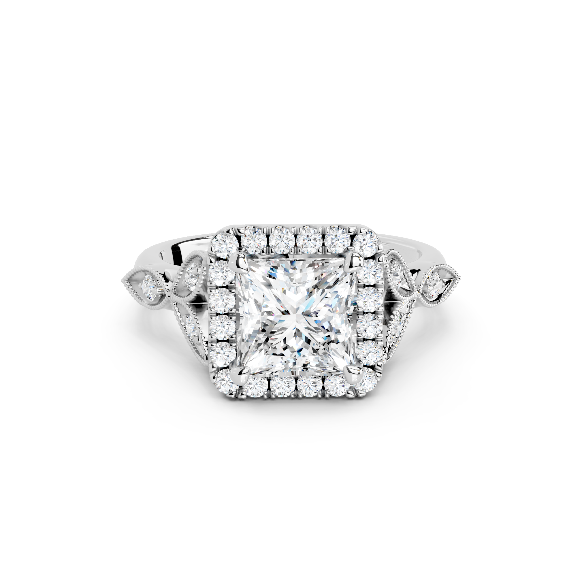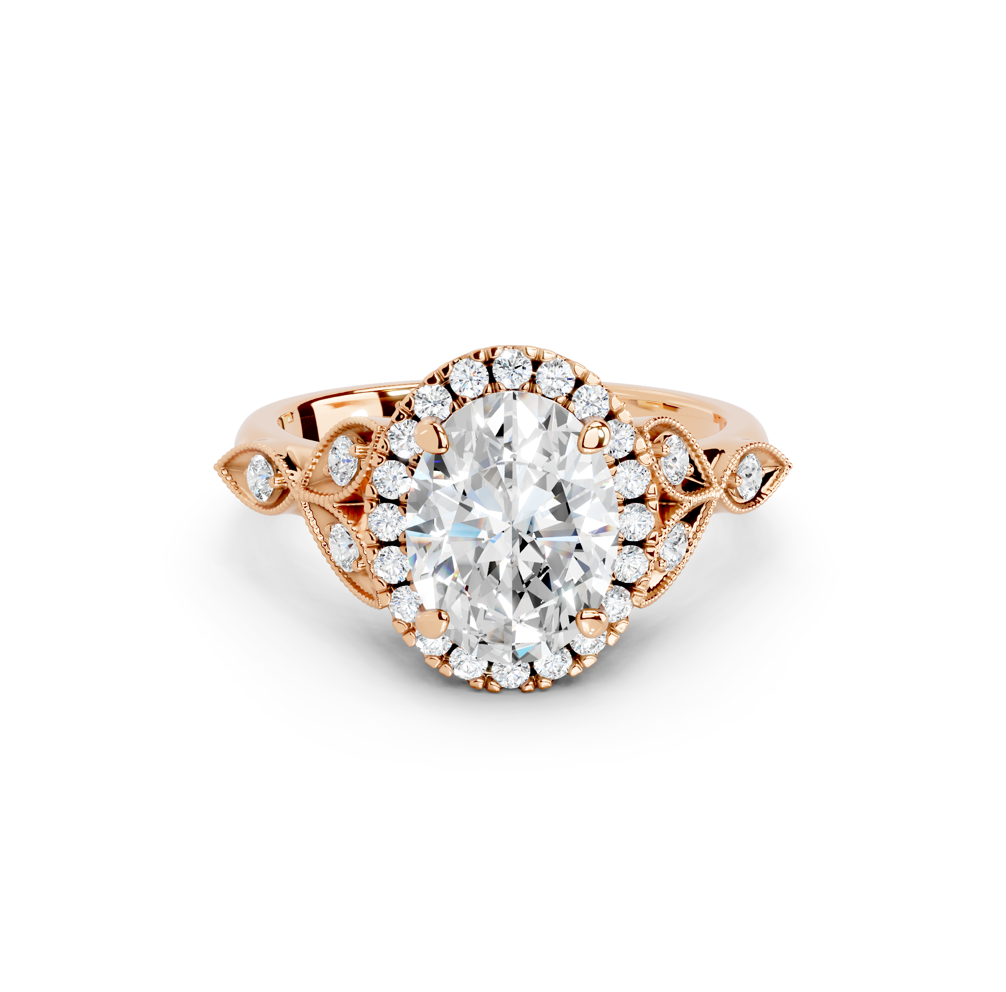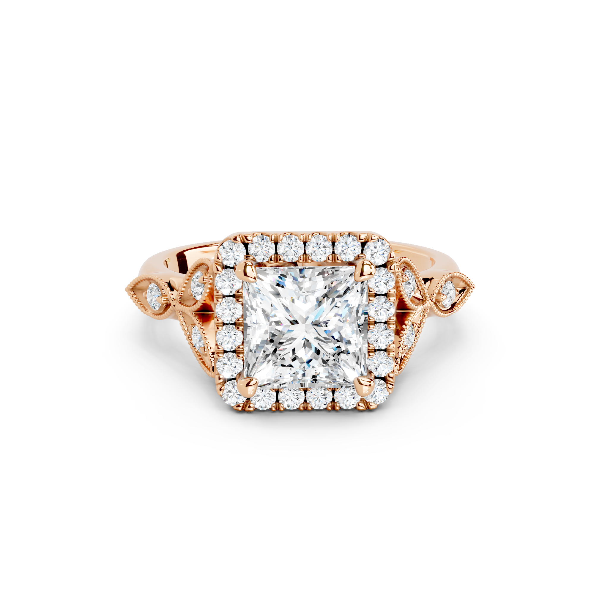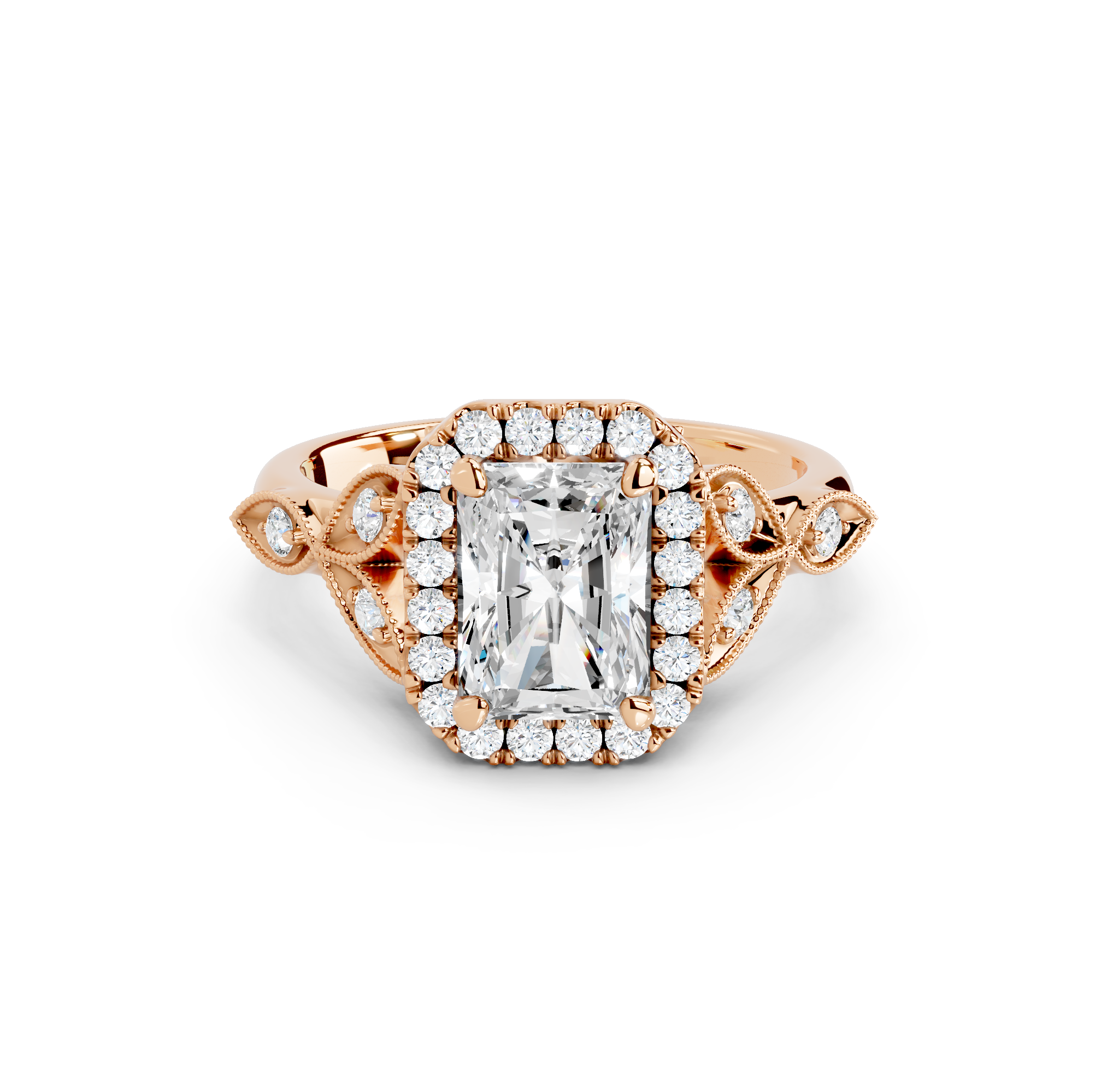 Each arch features milgrain-outlined petals, each holding a single round-cut diamond. This creates a garden-like setting that feels both timeless and romantic. Beneath the luxurious halo around the center stone, more petals are tucked away, catching the light from unexpected angles.