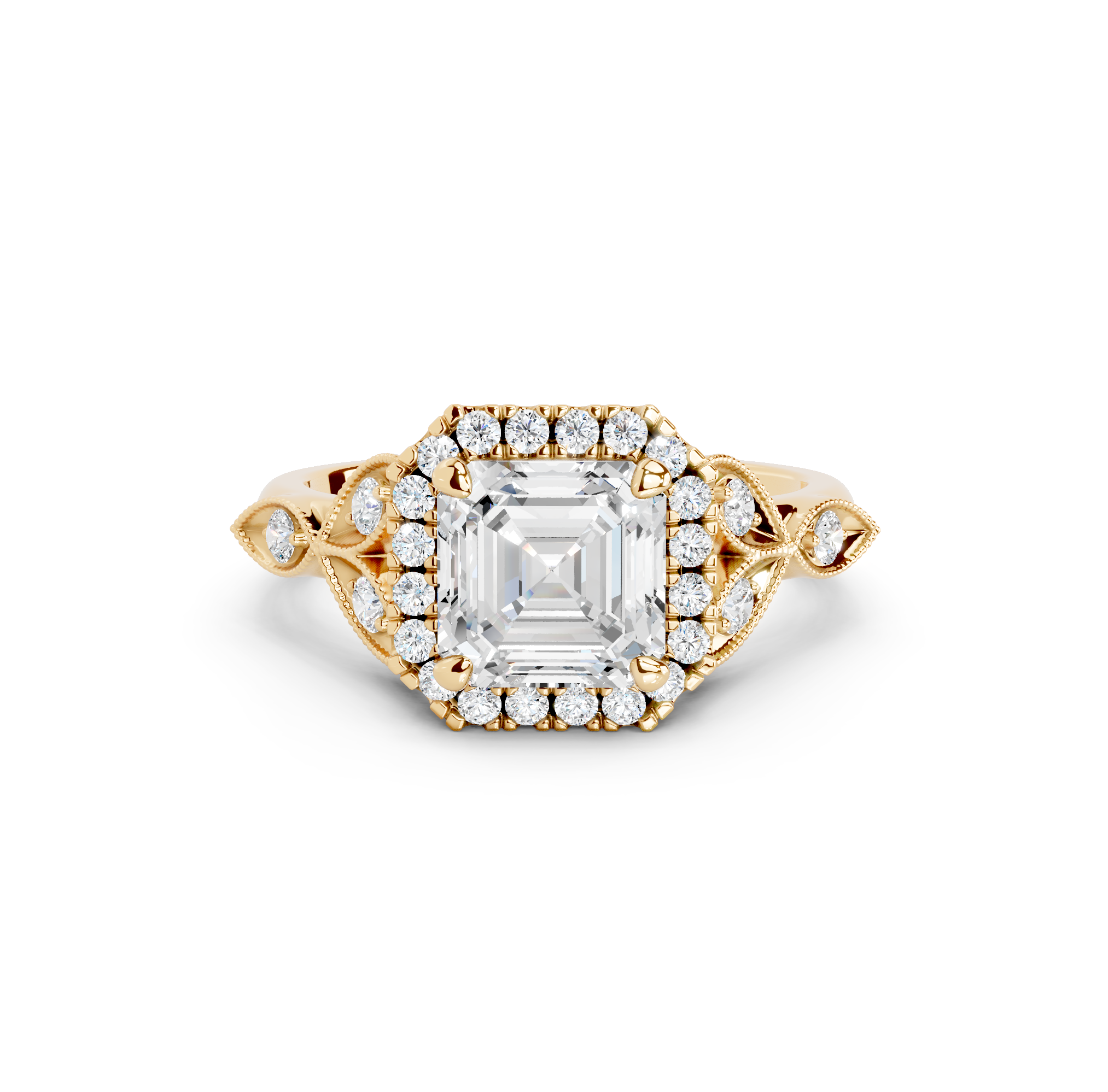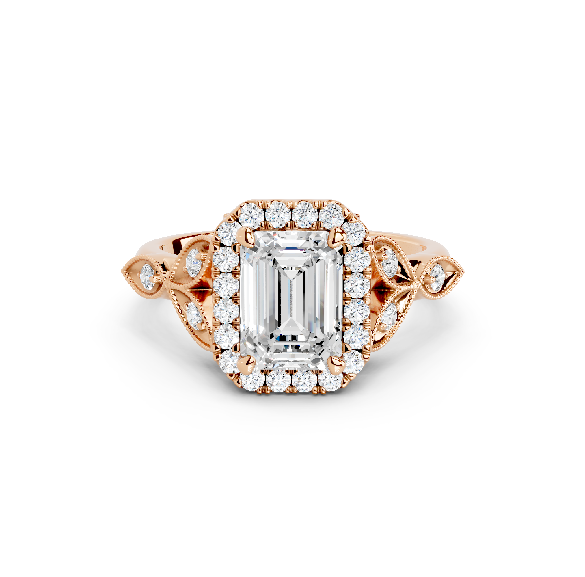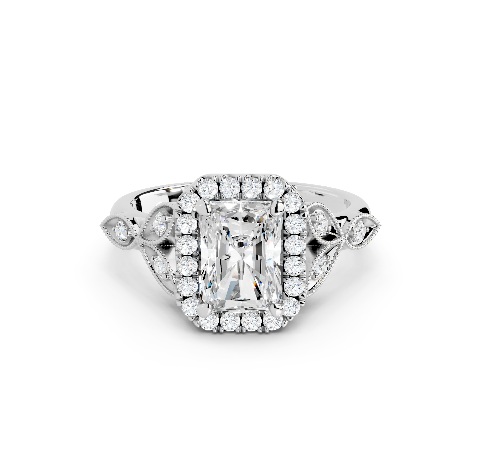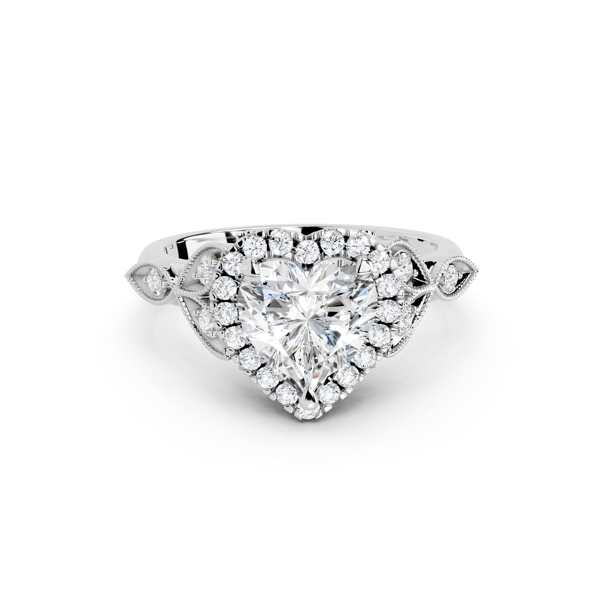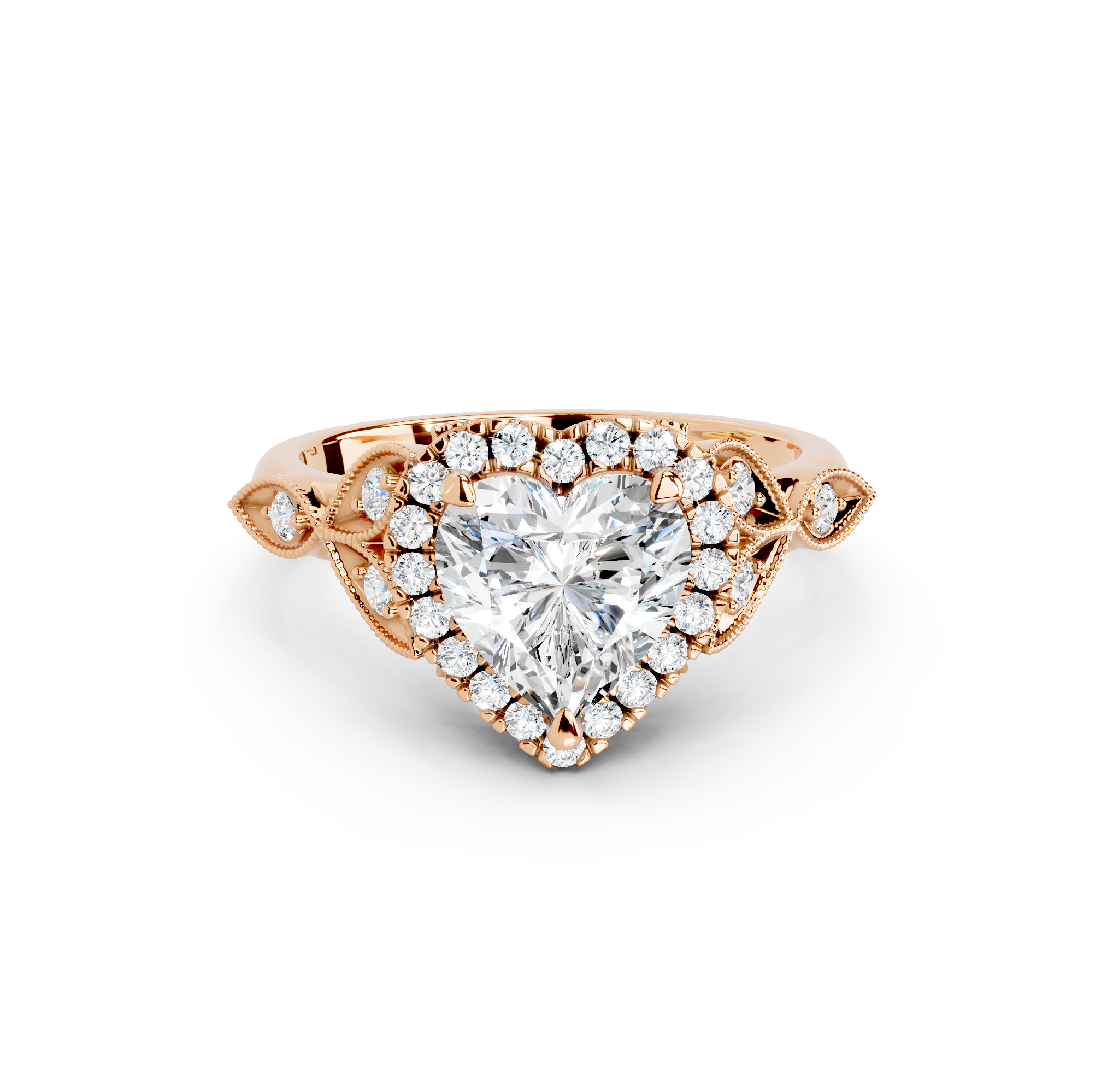 Each arch features milgrain-outlined petals, each holding a single round-cut diamond. This creates a garden-like setting that feels both timeless and romantic. Beneath the luxurious halo around the center stone, more petals are tucked away, catching the light from unexpected angles.