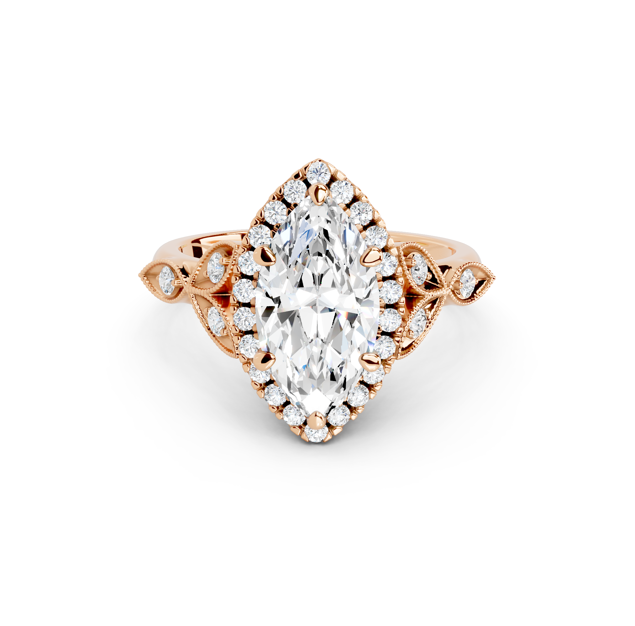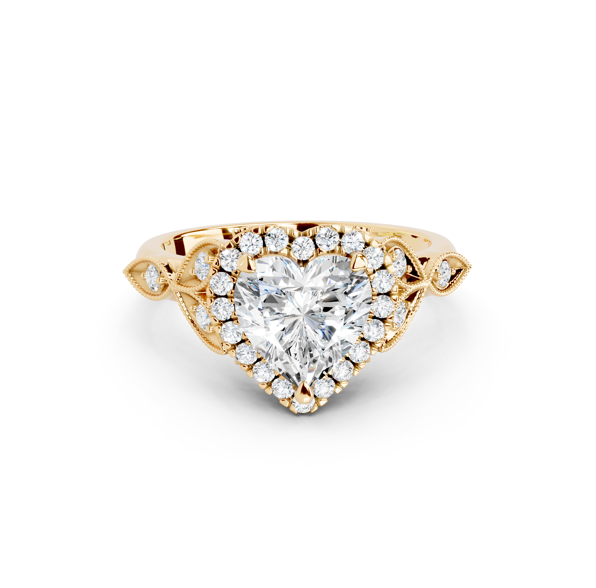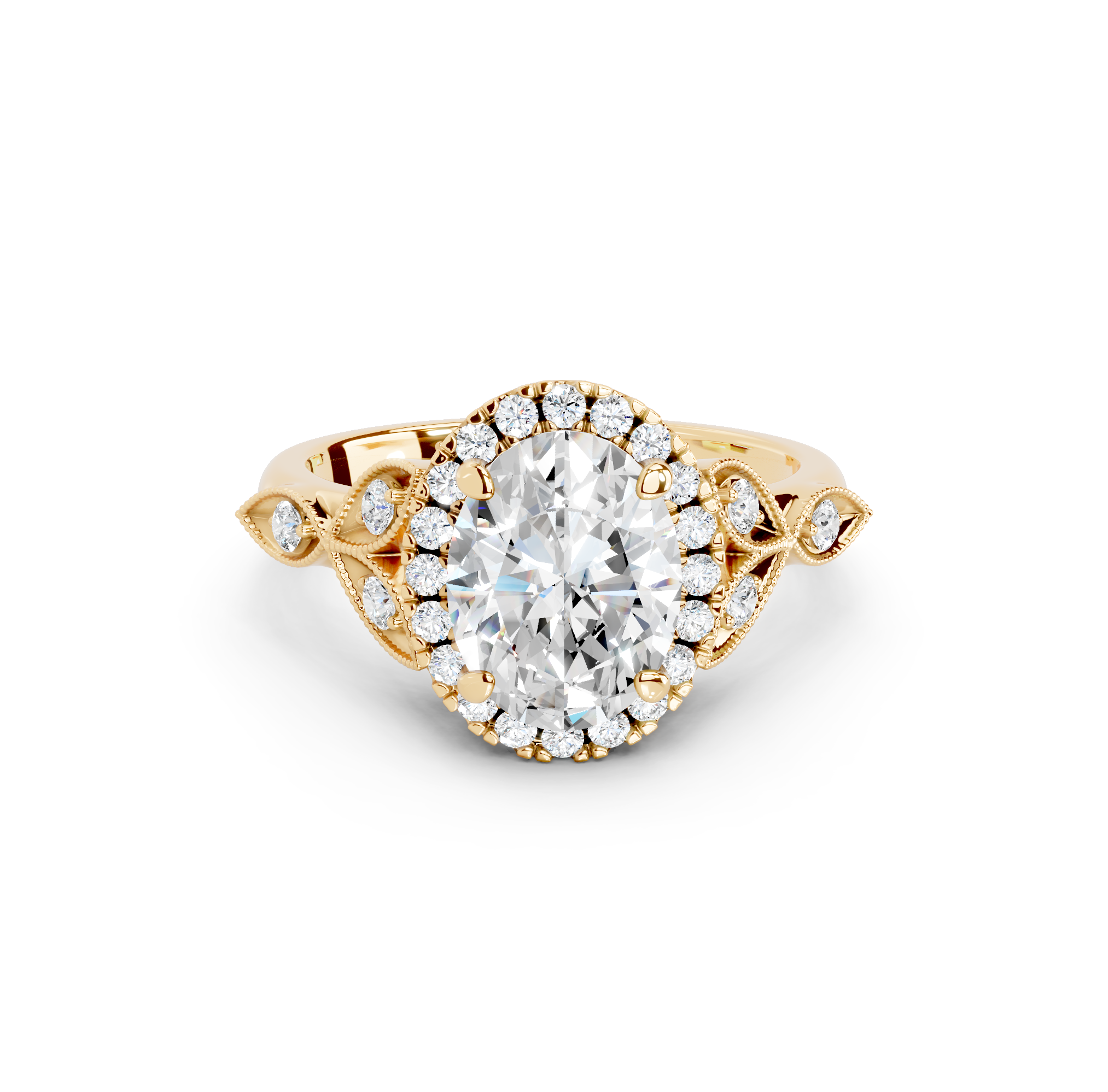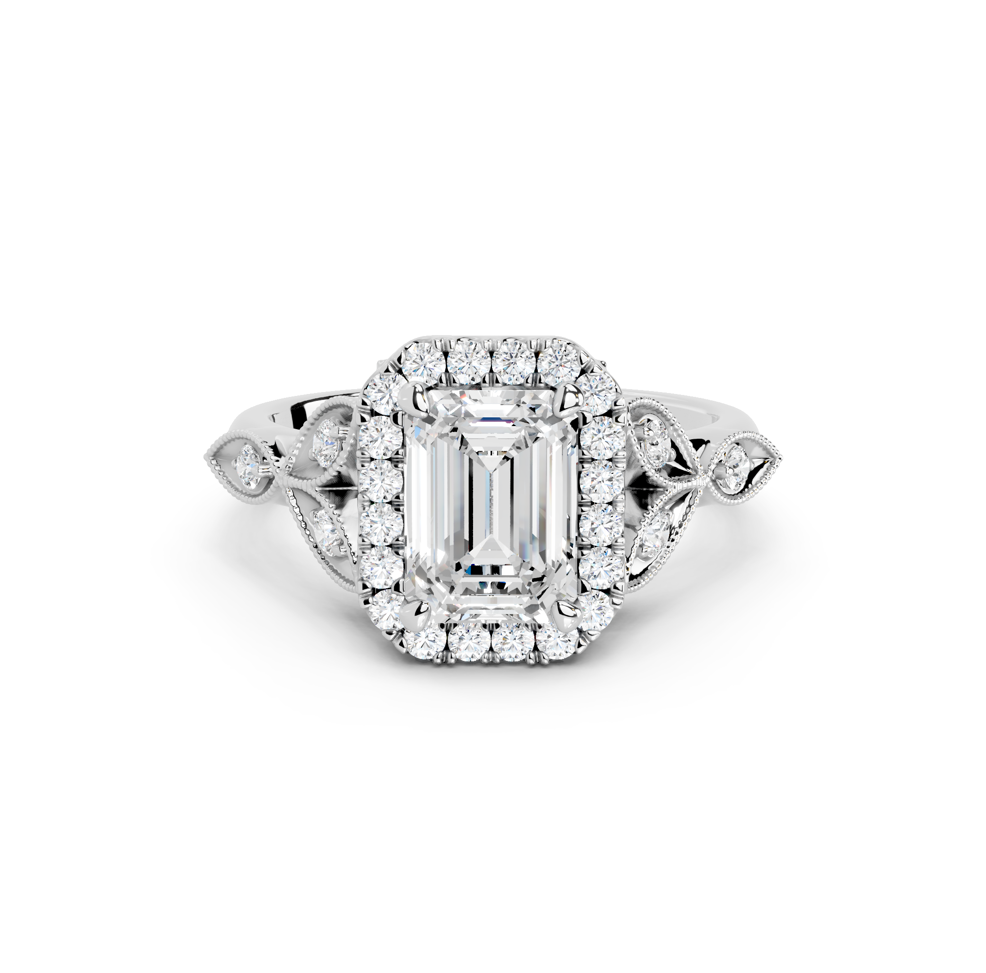 Each arch features milgrain-outlined petals, each holding a single round-cut diamond. This creates a garden-like setting that feels both timeless and romantic. Beneath the luxurious halo around the center stone, more petals are tucked away, catching the light from unexpected angles.