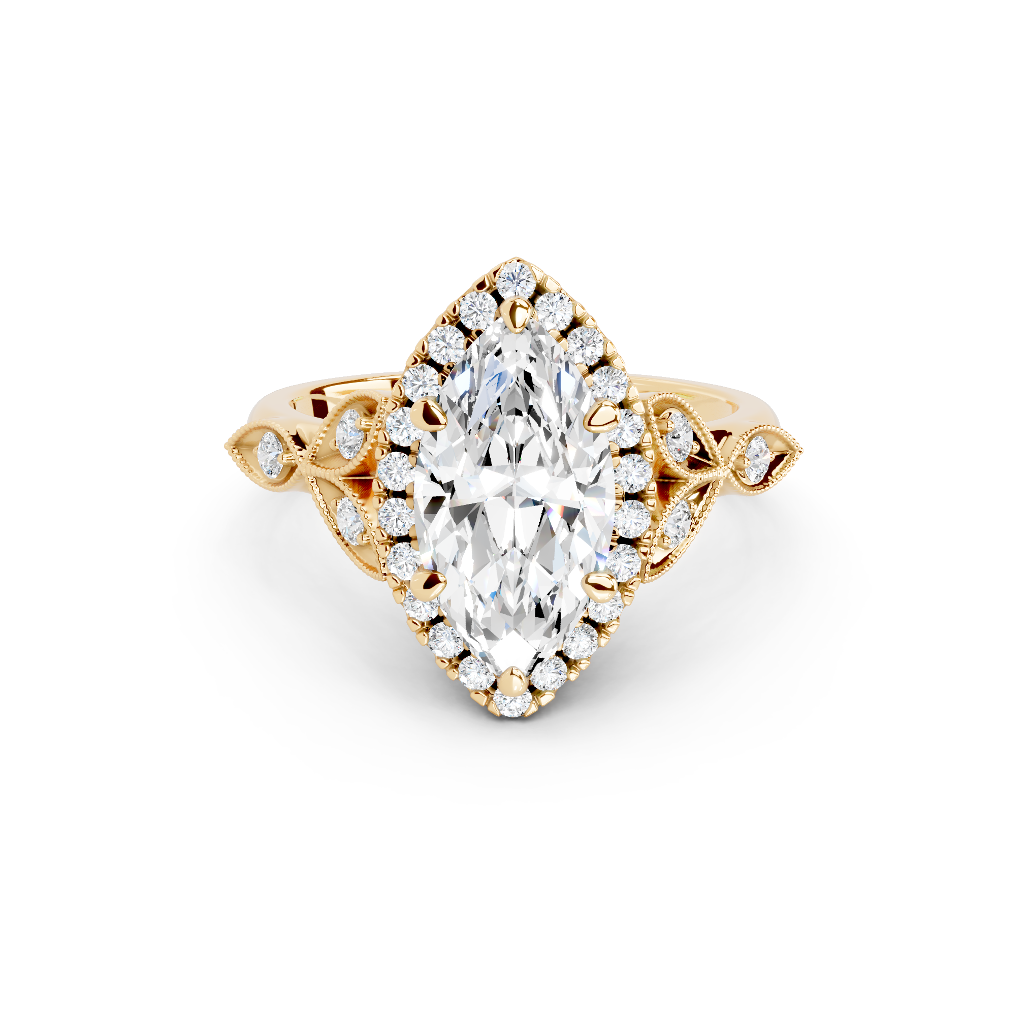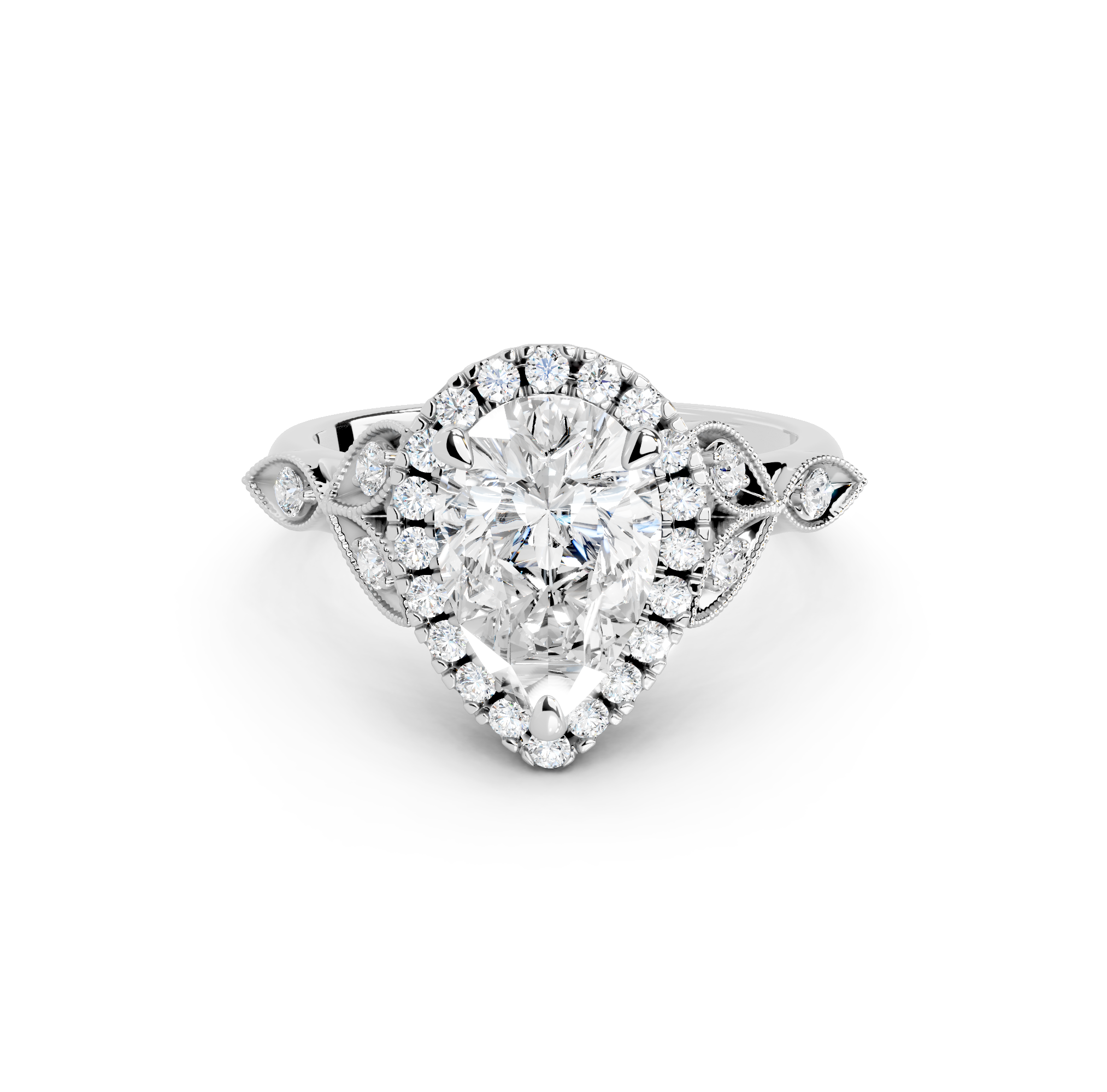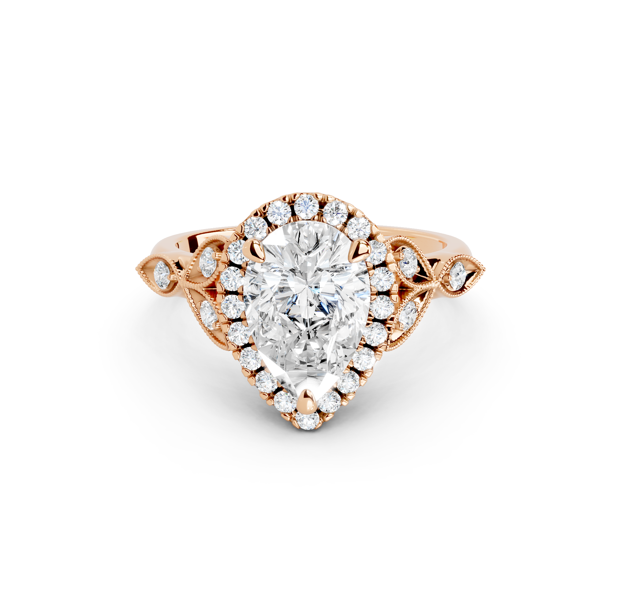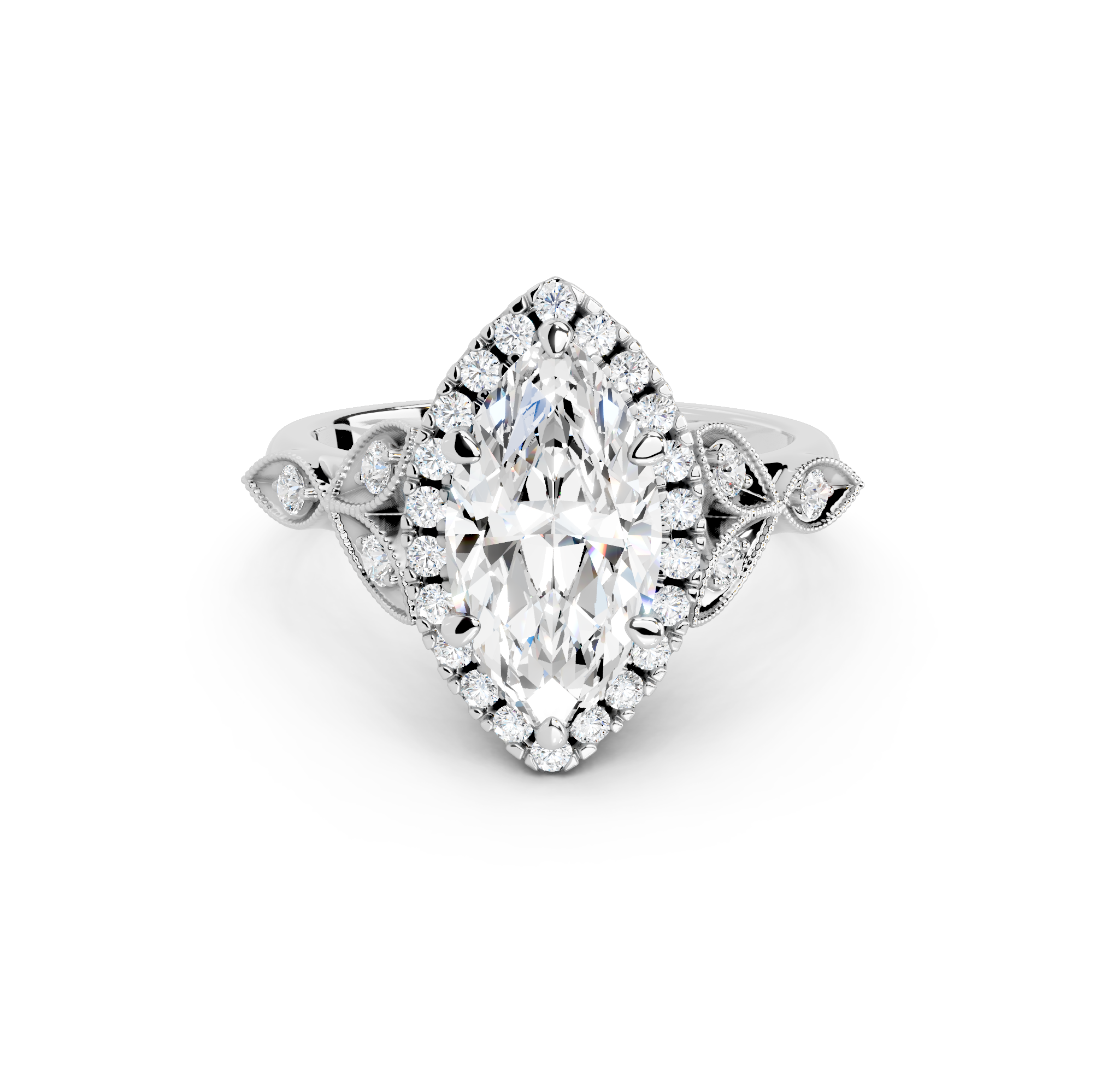 Each arch features milgrain-outlined petals, each holding a single round-cut diamond. This creates a garden-like setting that feels both timeless and romantic. Beneath the luxurious halo around the center stone, more petals are tucked away, catching the light from unexpected angles.