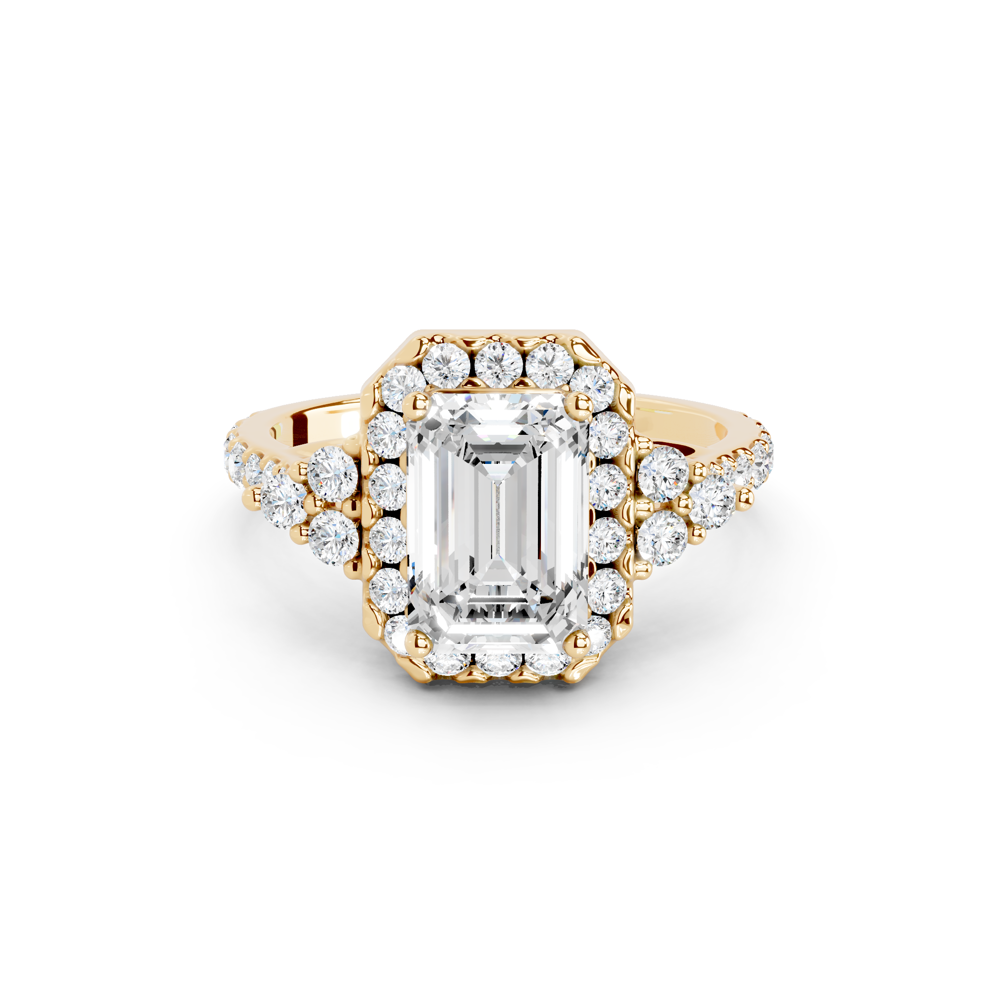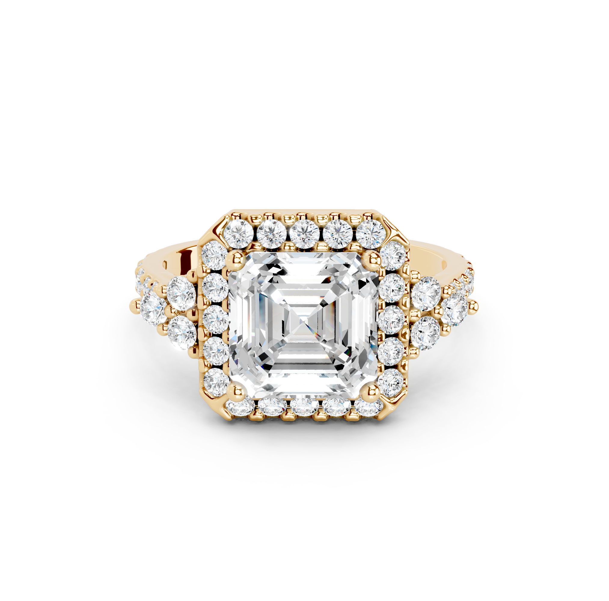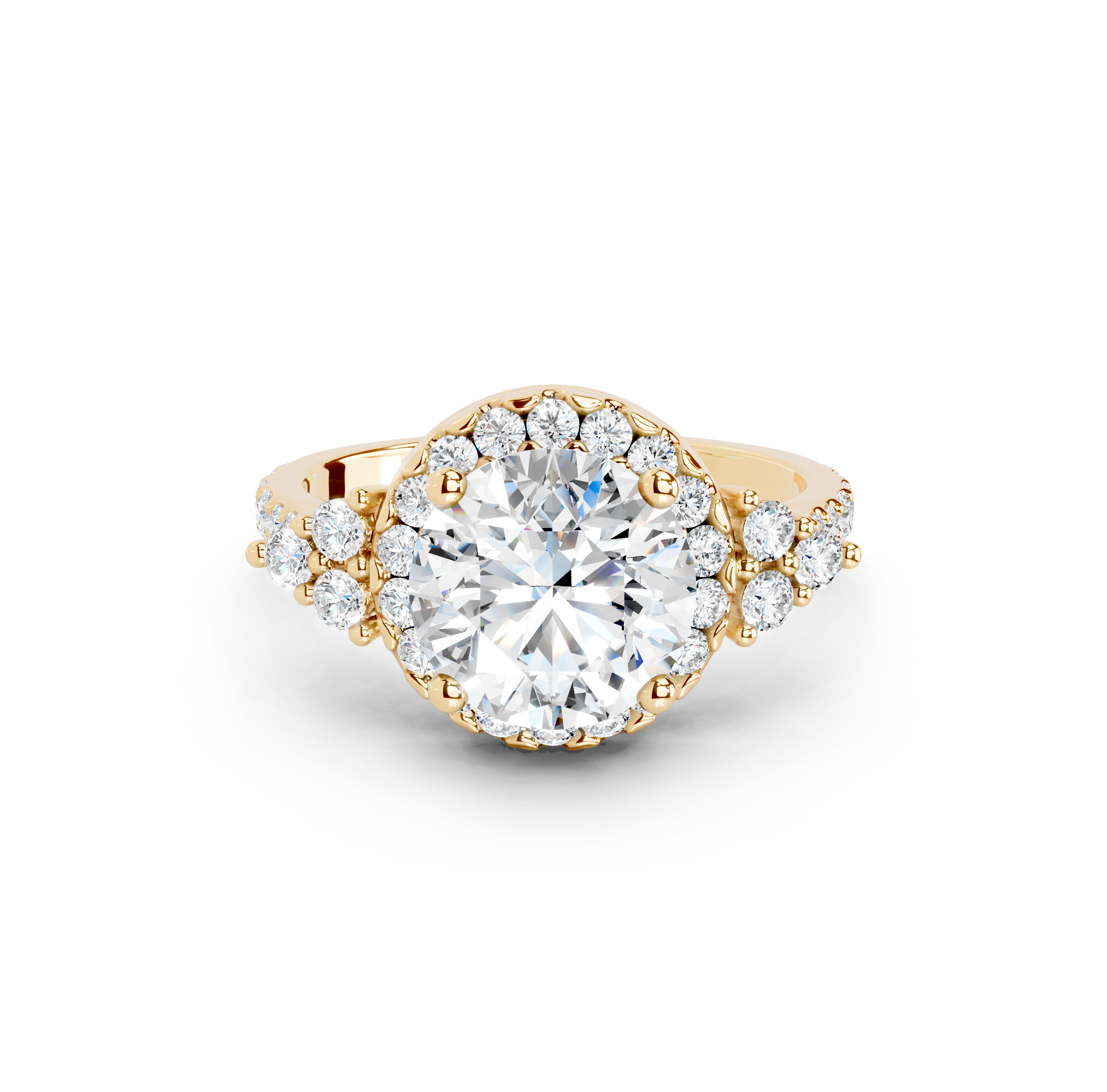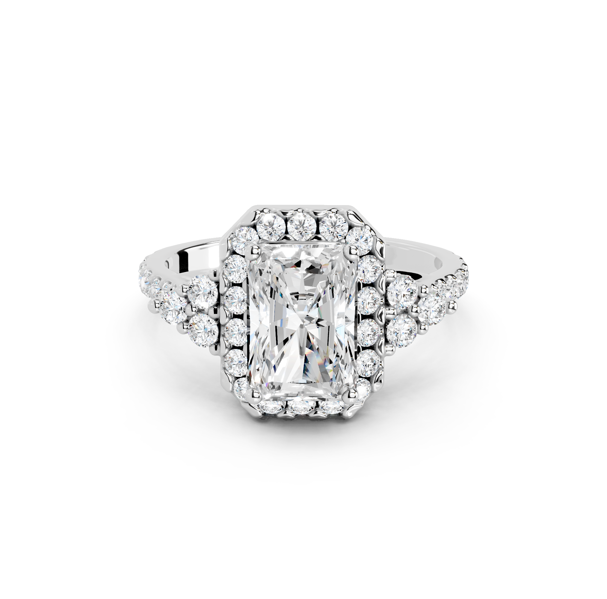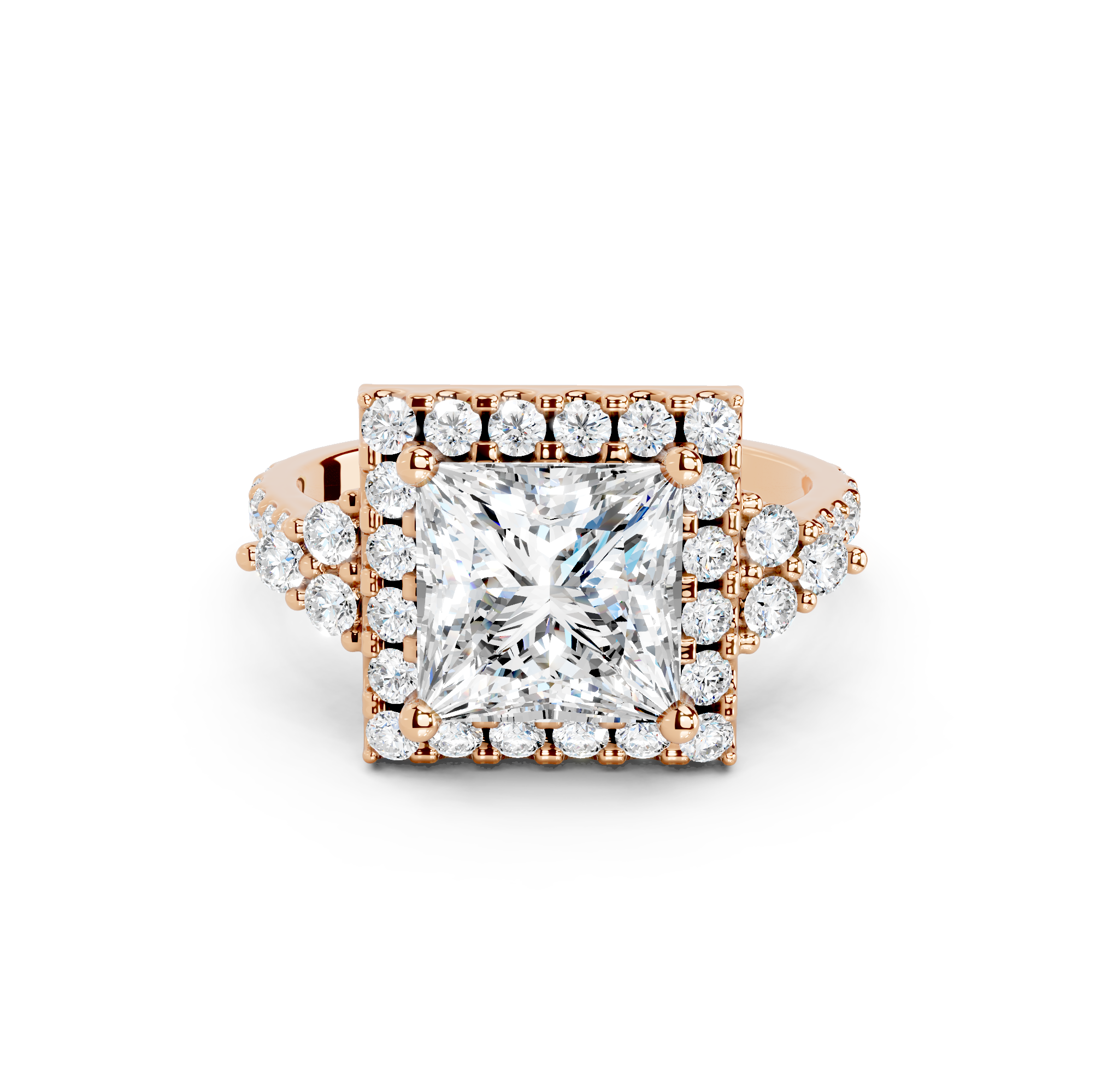 For those who love maximum sparkle and making a statement, the Valeria will command attention from across the room. Triple diamond clusters sit next to the center diamond on each side. A classic halo surrounds the center and pavé diamonds cascade along the cathedral band. Every surface catches and reflects light, creating a dazzling display that feels luxurious.